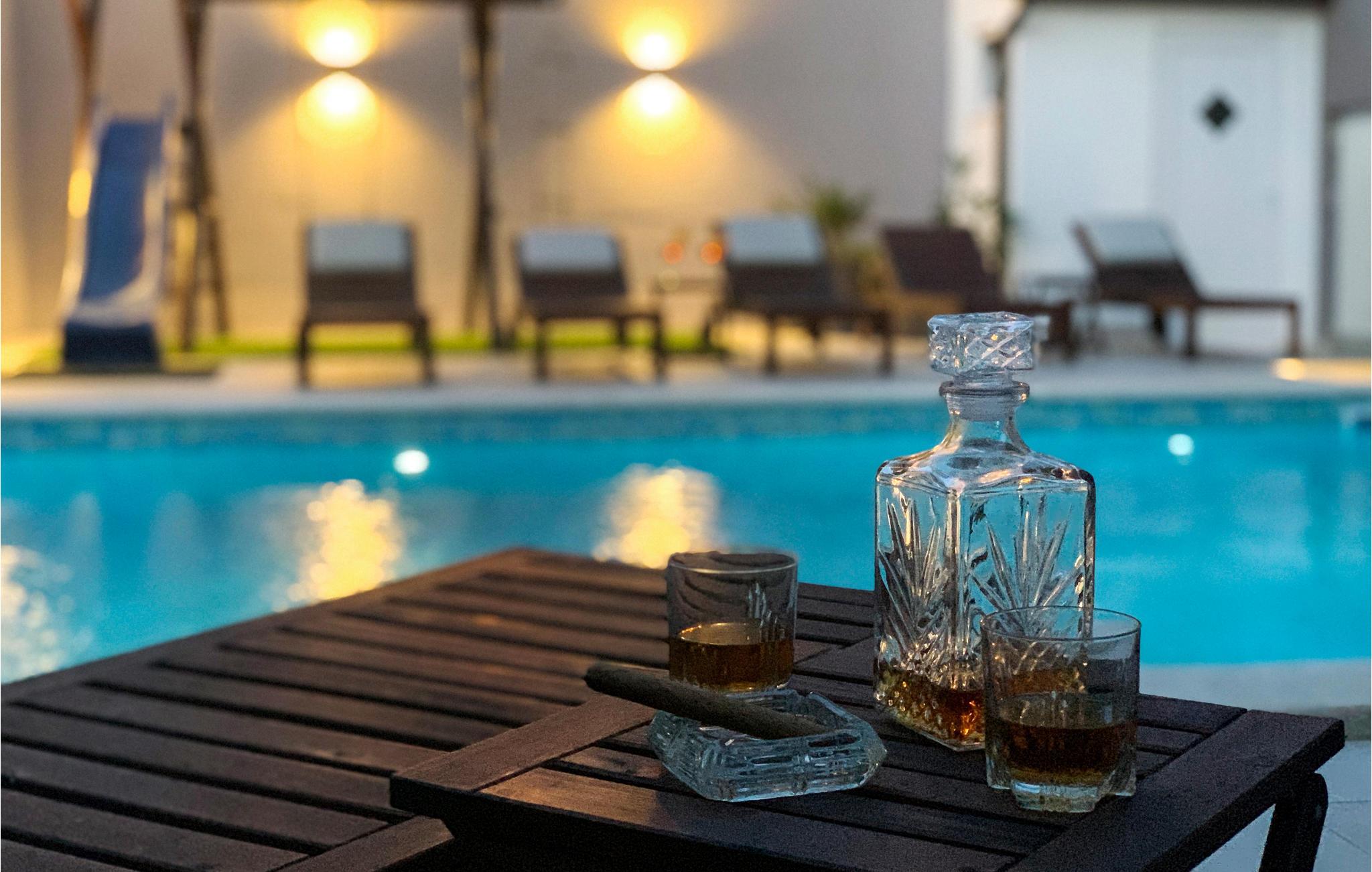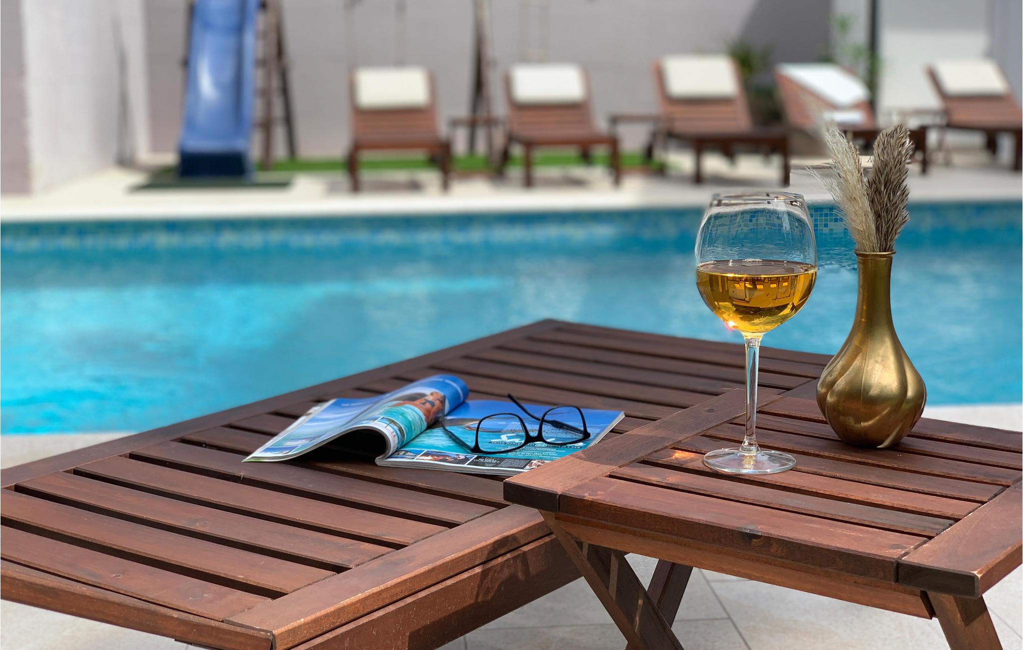 Uden for venter poolen (kan benyttes mellem april og november), hvor der også er komfortable liggestole og et klatrestativ til børn, her får alle familiemedlemmer mange gode oplevelser.