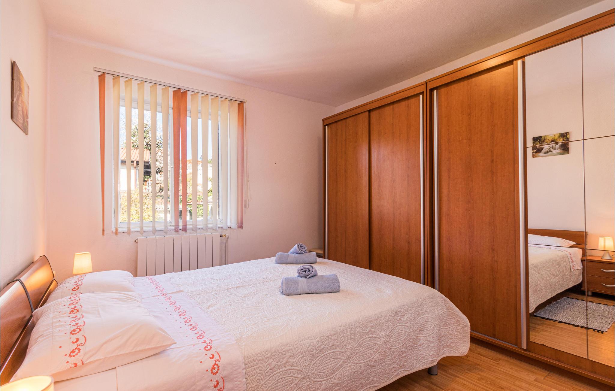 Denne rummelige ferielejlighed venter sine gæster på 1. sal i en beboelsesbygning. Der er plads til 5 personer, der er en dobbeltseng i det ene soveværelse, 2 enkeltsenge i det andet soveværelse og et andet soveværelse i stuen. Møblerne er funktionelle og attraktive, Her vil hele familien finde sig godt til rette.