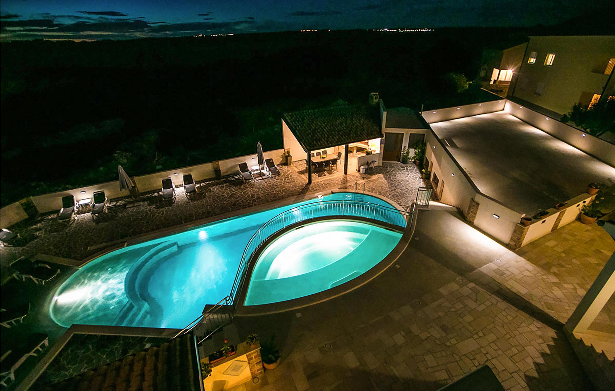 Om morgenen kan I nyde solens første stråler på terrassen med en friskbrygget kop kaffe i hånden og bare lade blikket vandre ud over de billedskønne omgivelser, inden I slår jer ned i en liggestol på poolterrassen. Her kan I svømme en bane eller to, og så kan I også slappe helt af i det udendørs spabad.