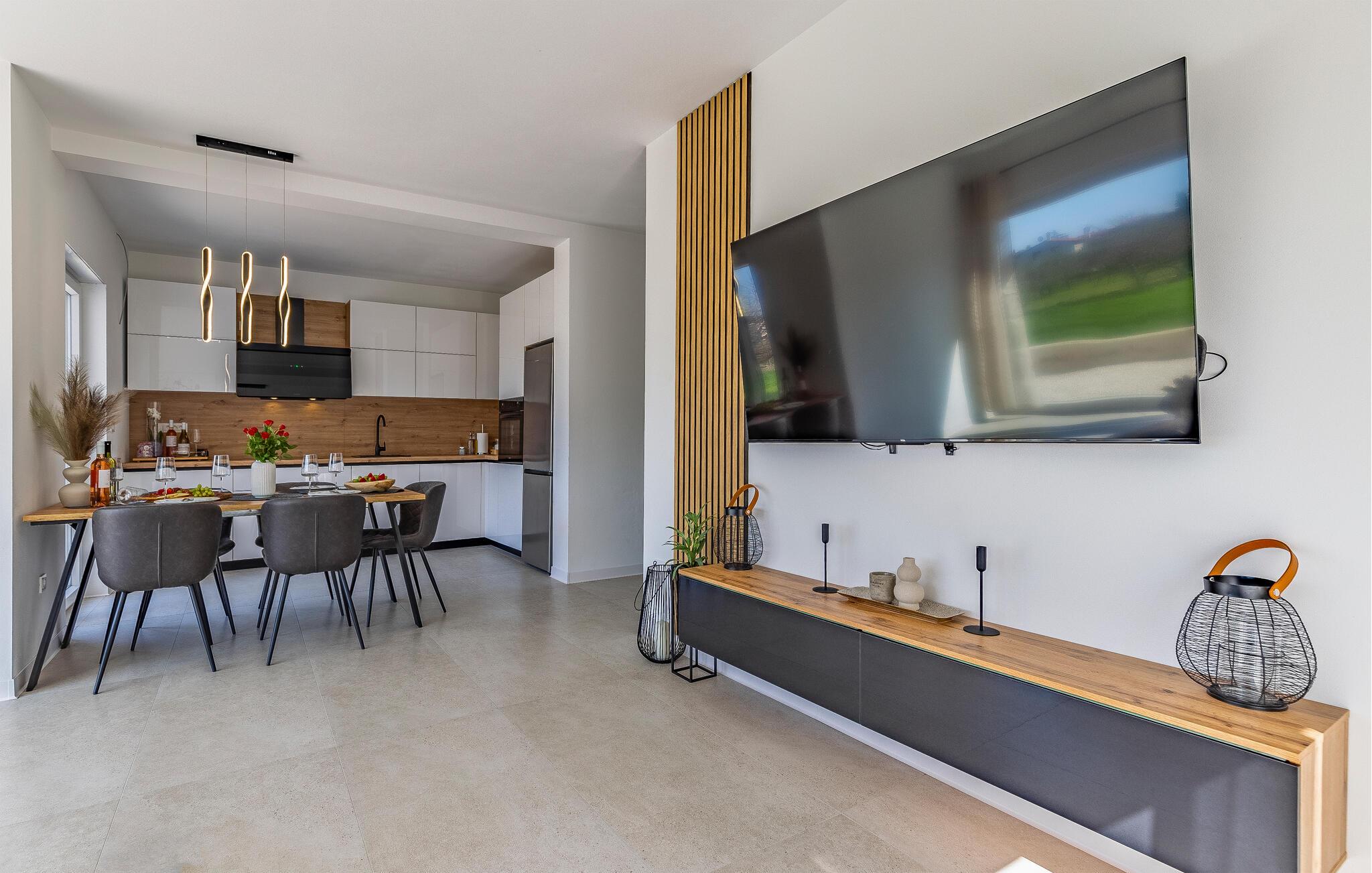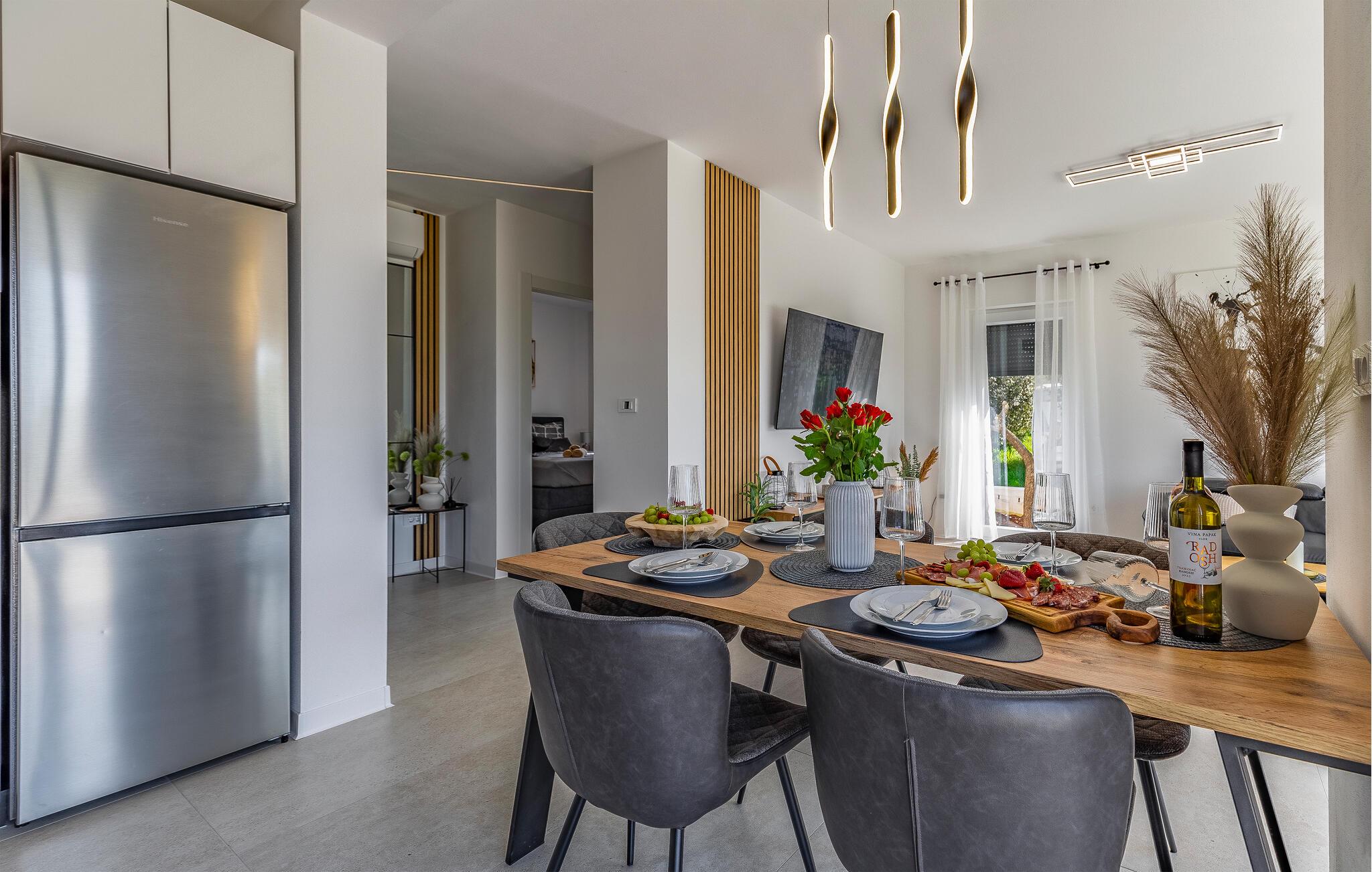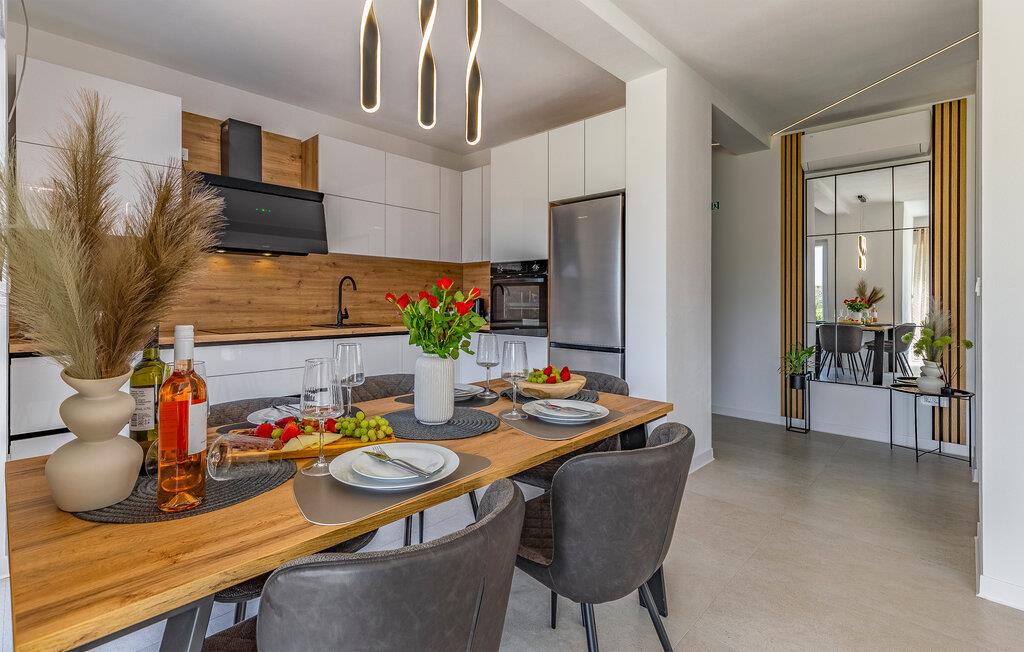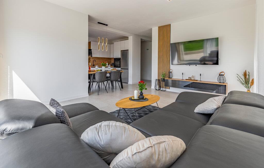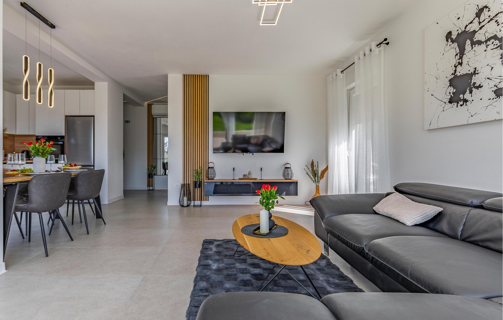 I denne stilfulde lejlighed begynder jeres ferie med et smil. Nyd afslappende timer på den store designersofa, se film på fladskærmen, eller skål for ferien med et glas vin. Det elegante spisebord giver plads til, at alle kan dele måltider og derefter nyde spilleaftener.
