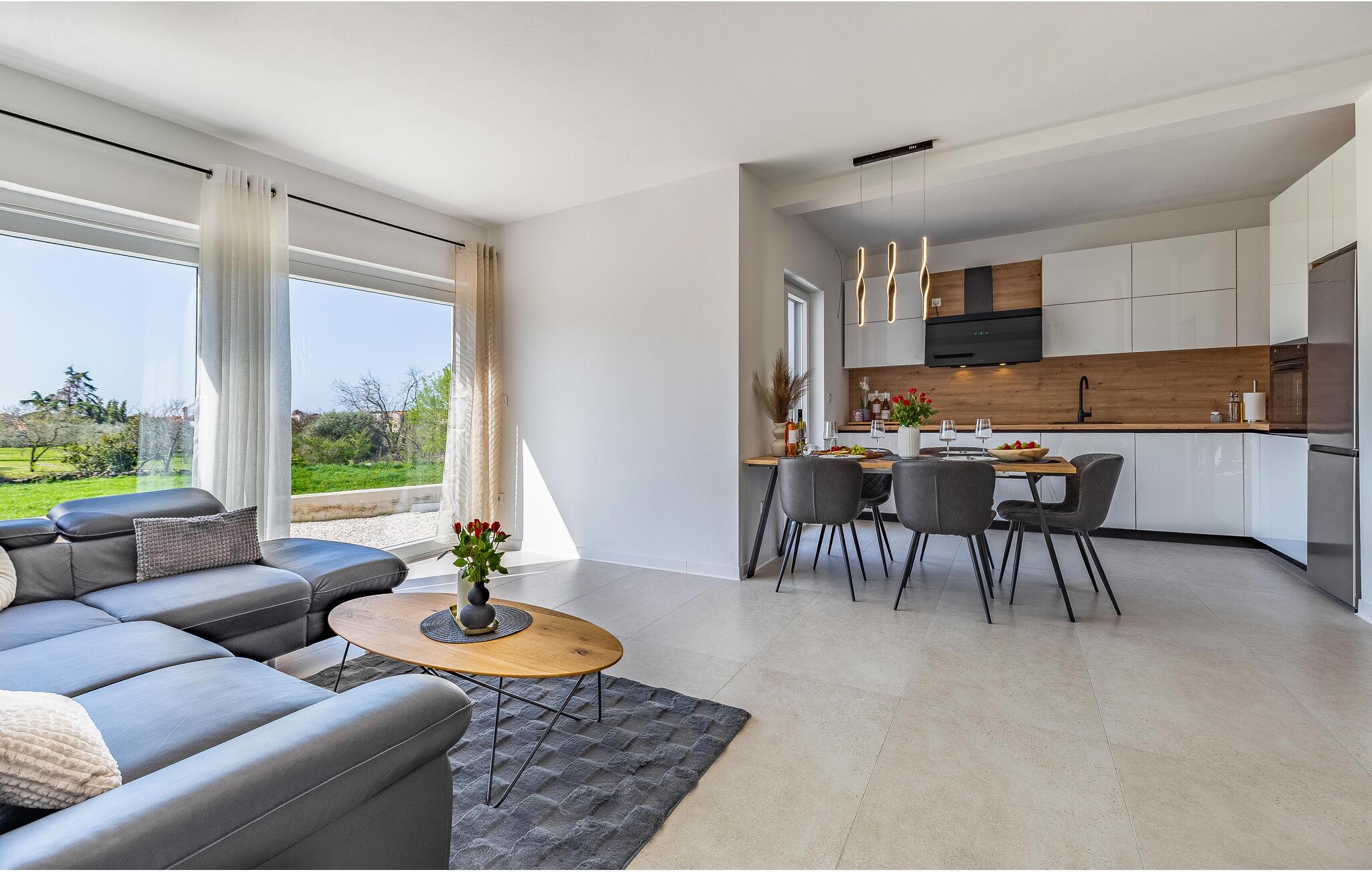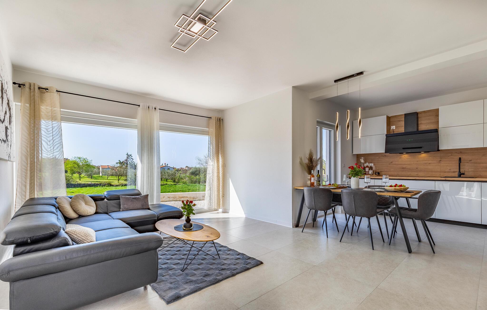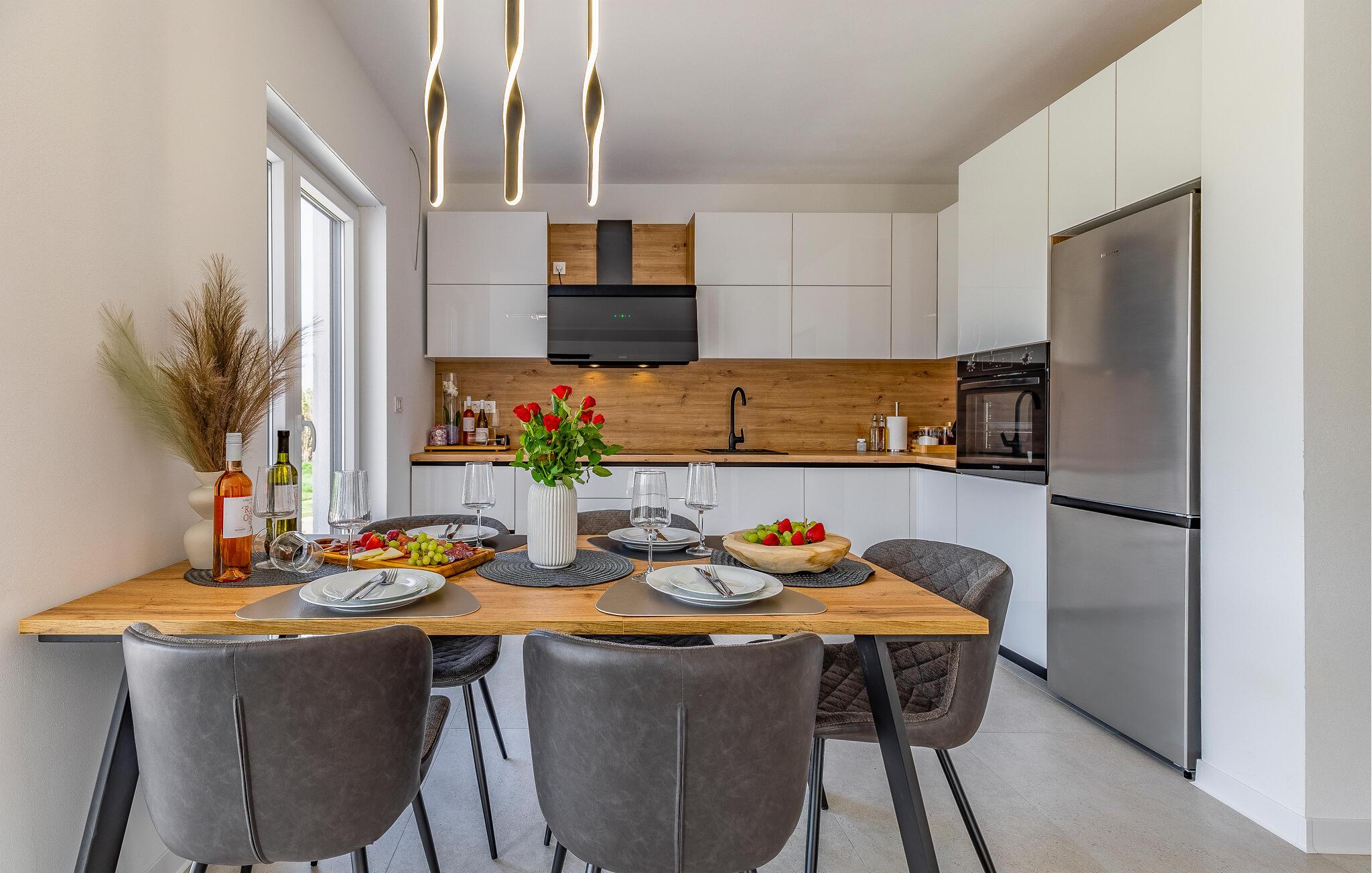 I denne stilfulde lejlighed begynder jeres ferie med et smil. Nyd afslappende timer på den store designersofa, se film på fladskærmen, eller skål for ferien med et glas vin. Det elegante spisebord giver plads til, at alle kan dele måltider og derefter nyde spilleaftener.