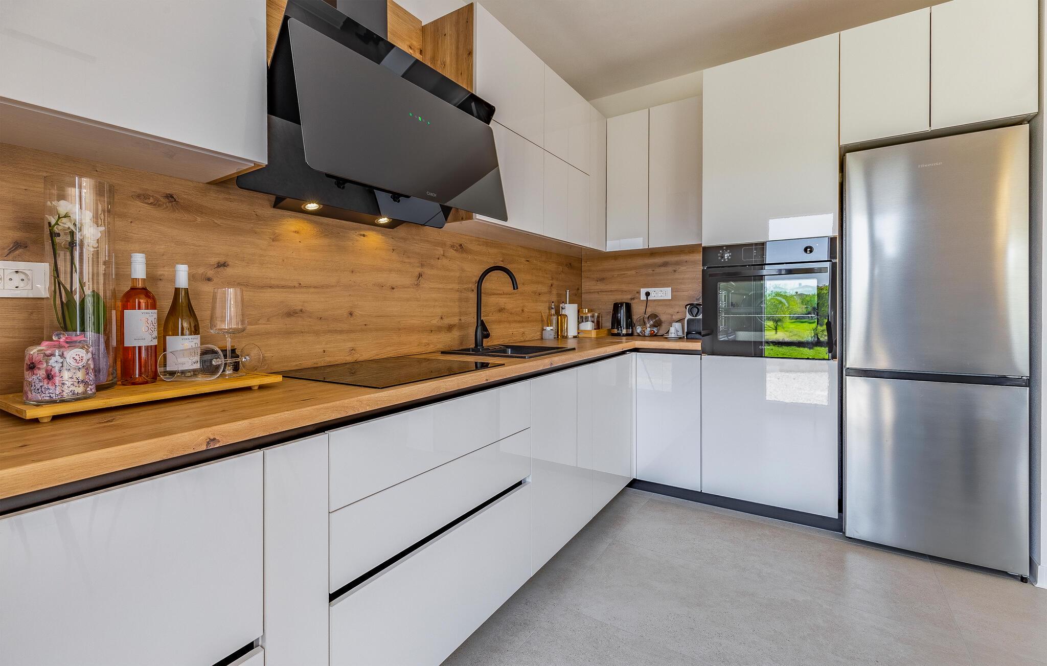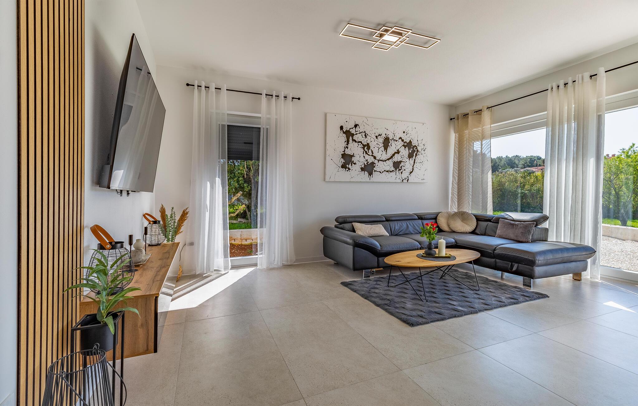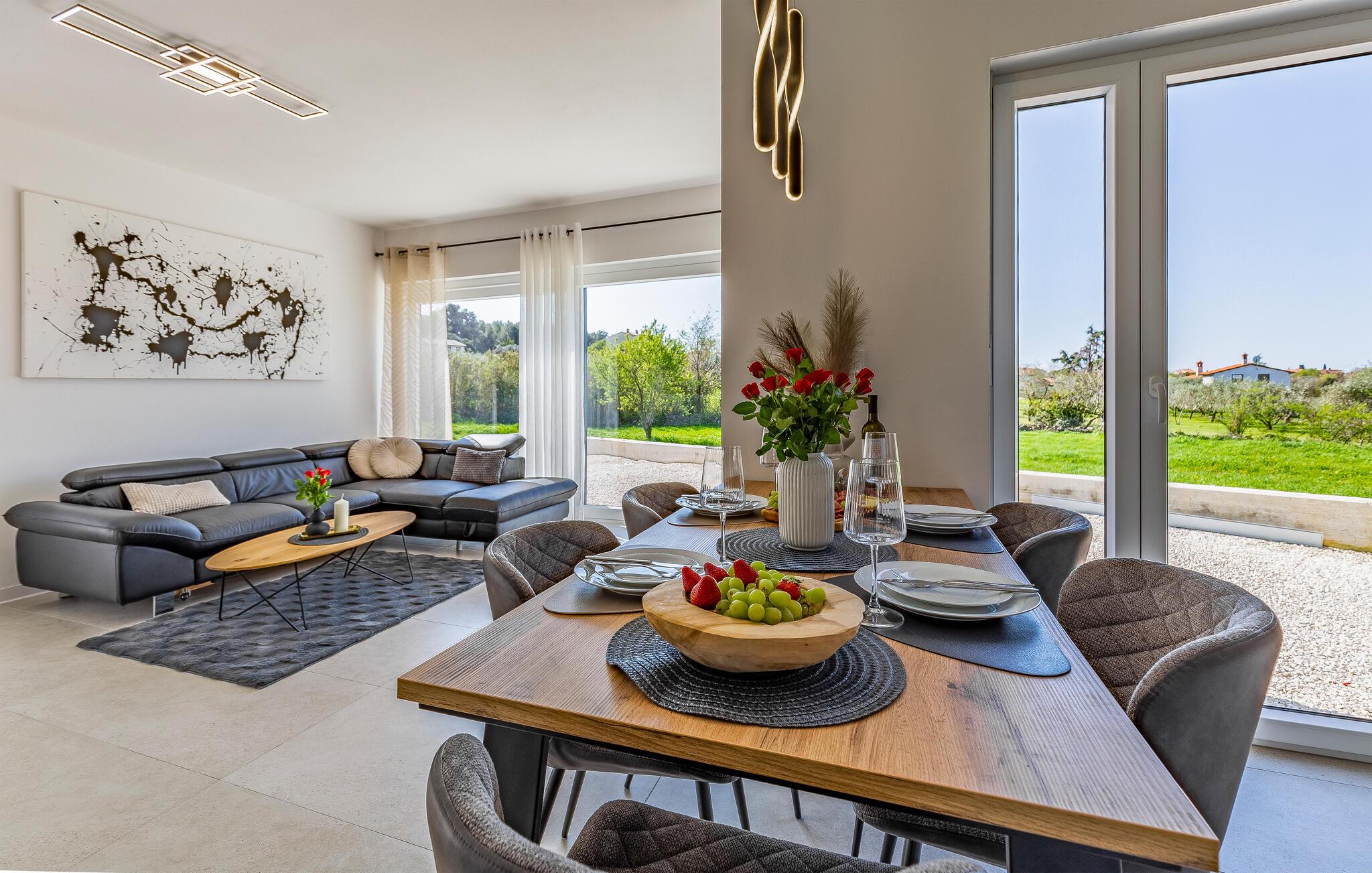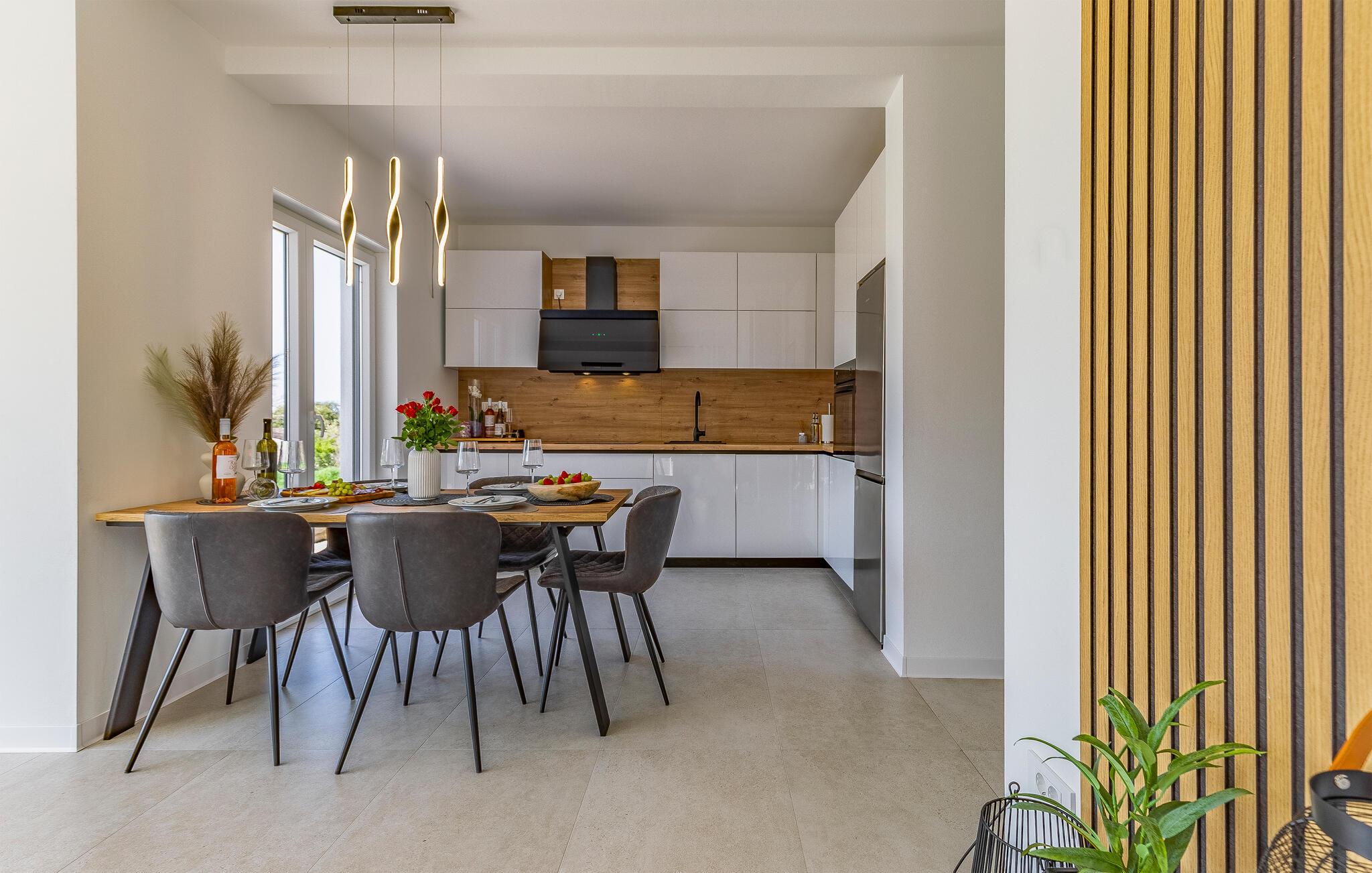 I denne stilfulde lejlighed begynder jeres ferie med et smil. Nyd afslappende timer på den store designersofa, se film på fladskærmen, eller skål for ferien med et glas vin. Det elegante spisebord giver plads til, at alle kan dele måltider og derefter nyde spilleaftener.