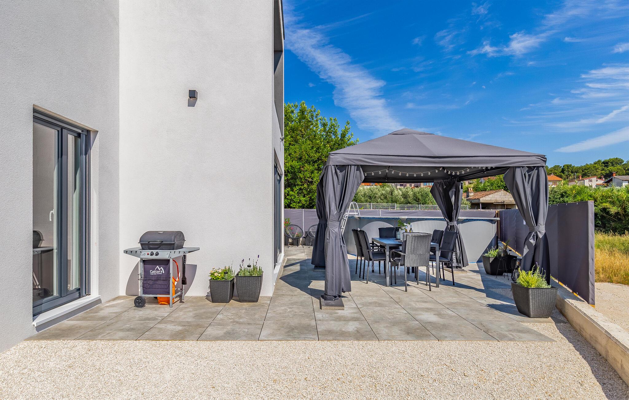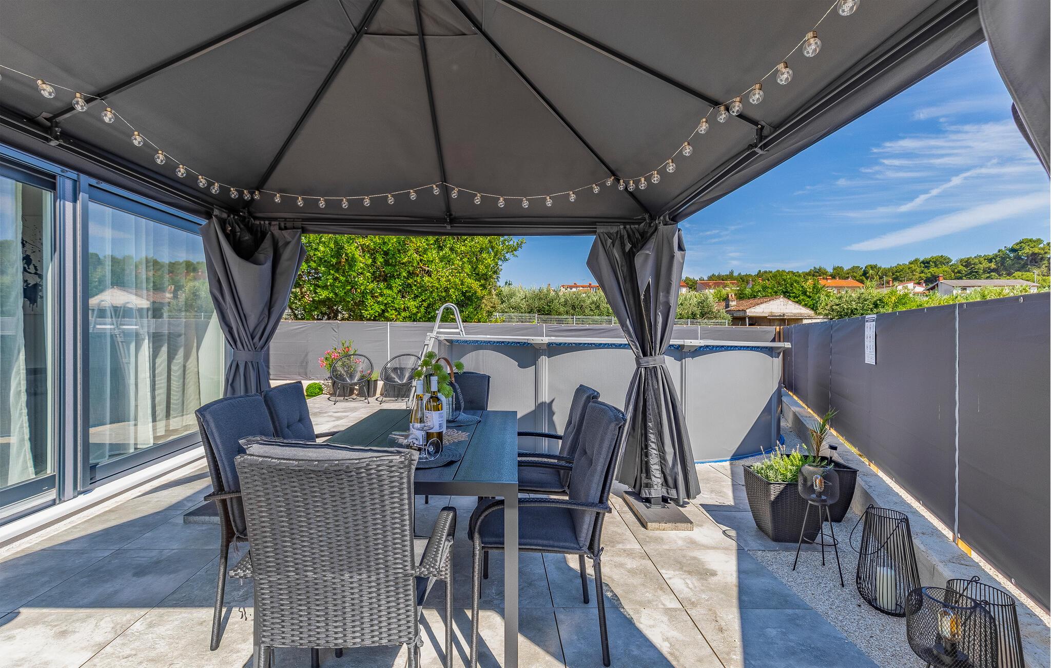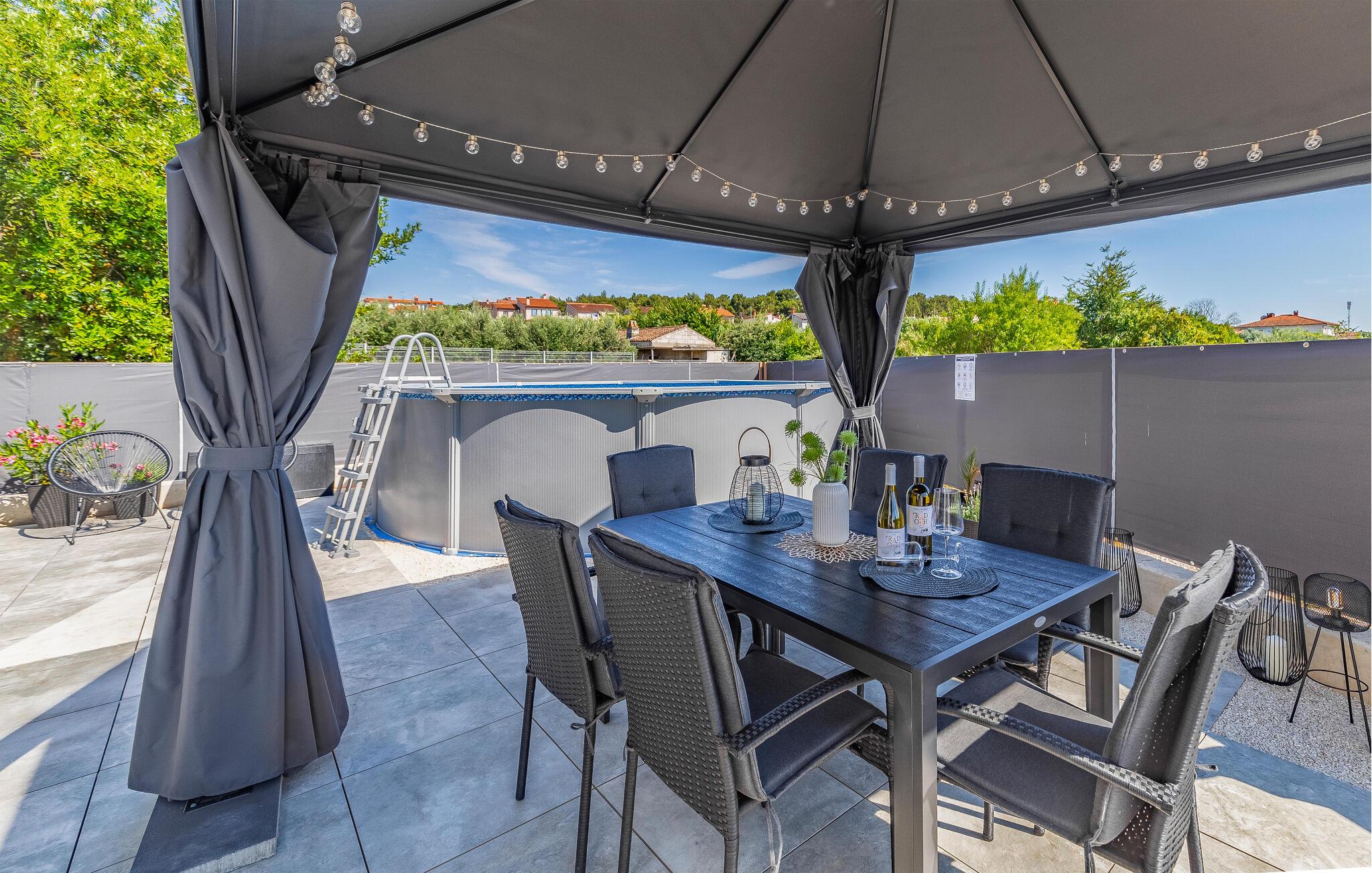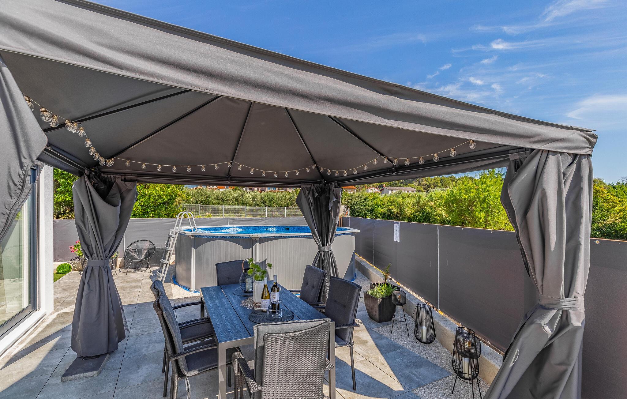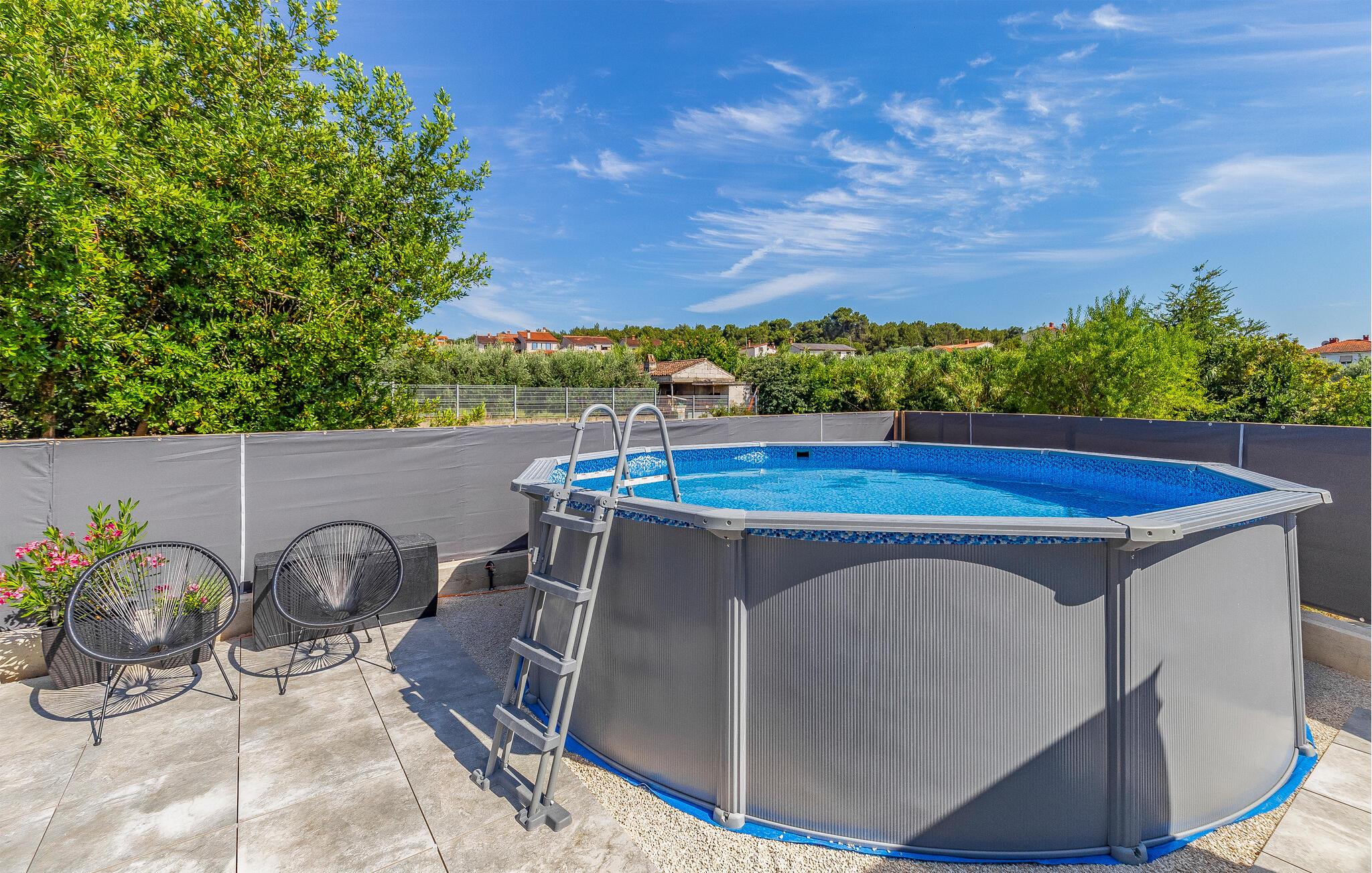 Udenfor venter en solrig have på jer med plads til at slappe af, spille spil eller blot tage en dyb indånding. Den forfriskende pool inviterer jer til at tage en dukkert i det kølige vand - ideelt til varme sommerdage eller en hurtig pause. Uanset om I læser en bog på en liggestol eller plasker rundt med børnene - føles ferien her let og ubekymret.