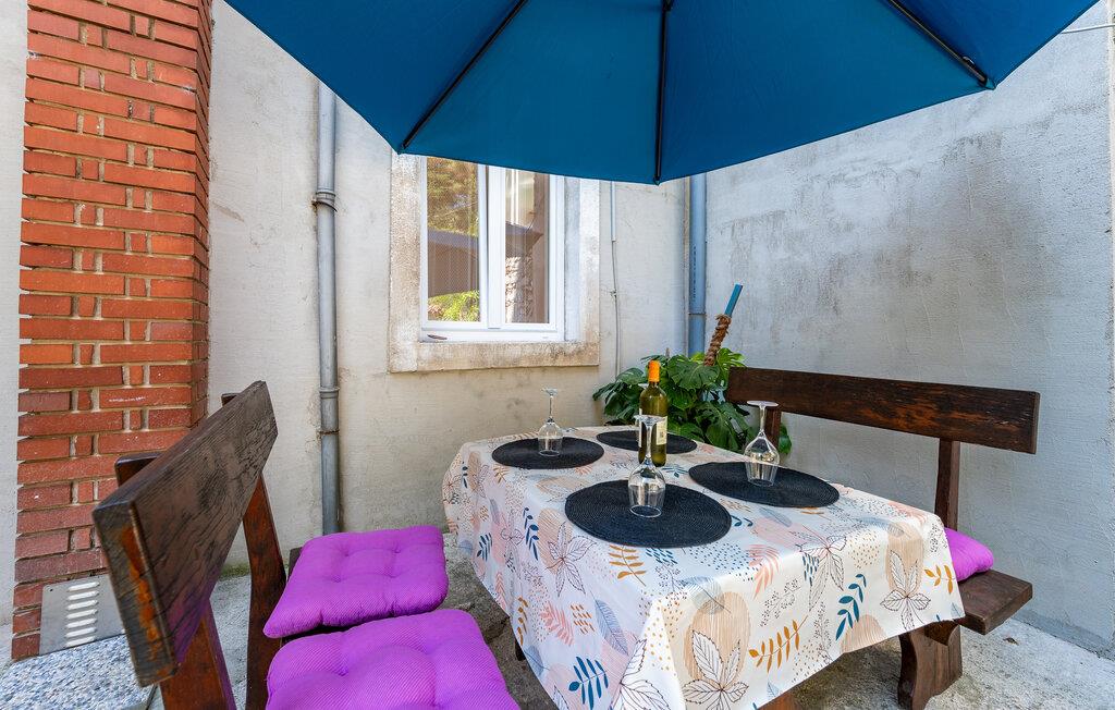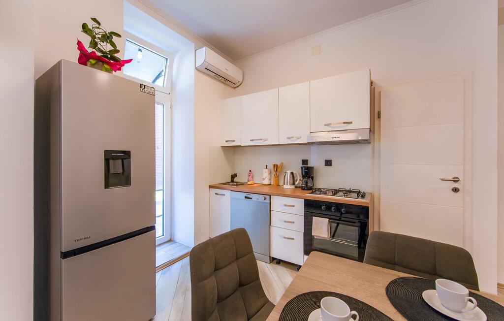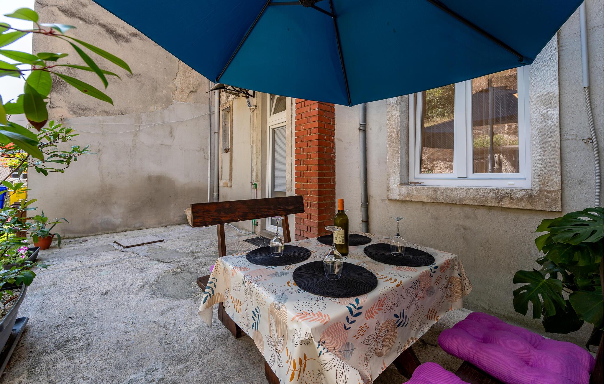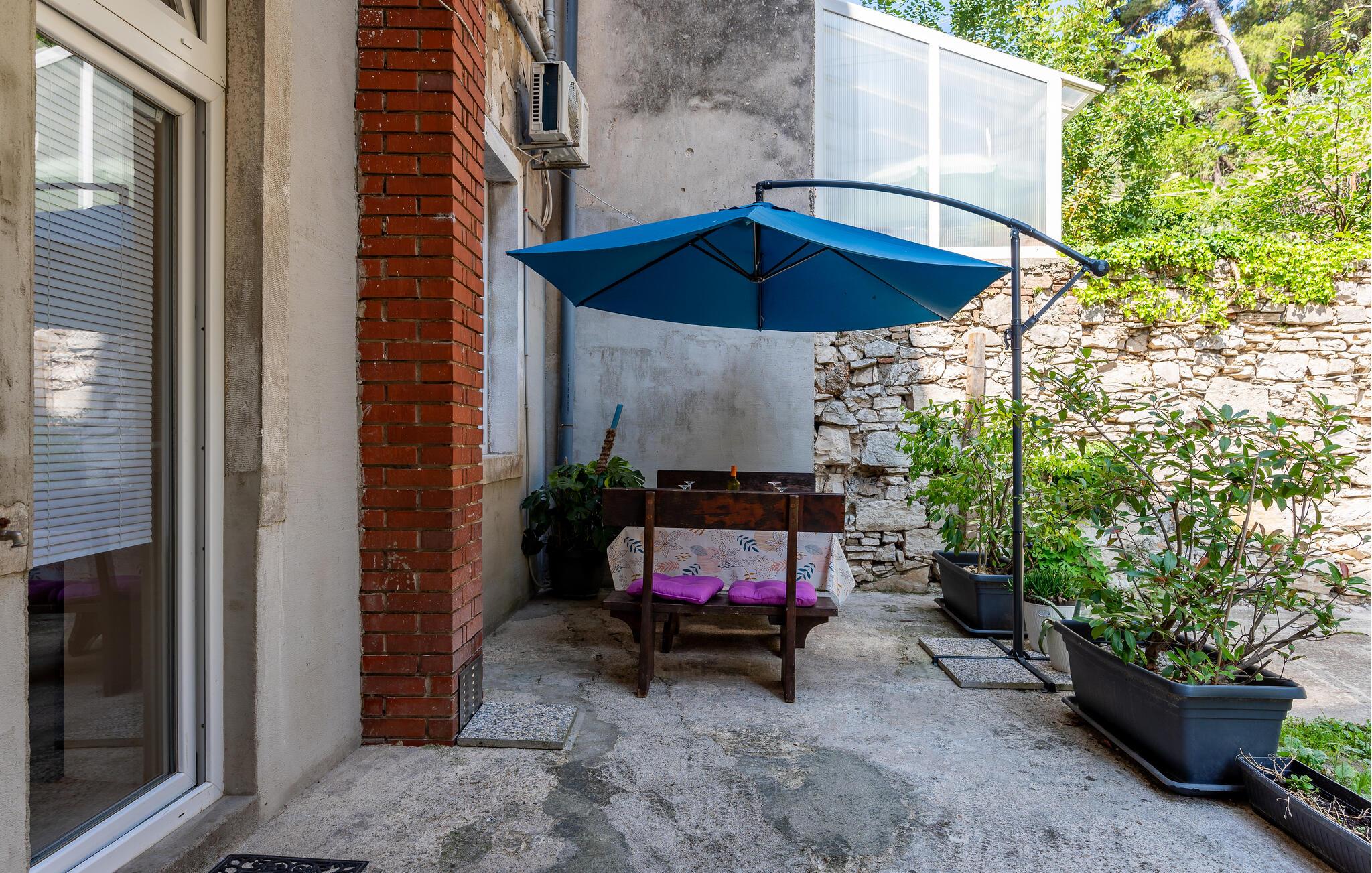 Nyd et problemfrit ophold i denne ferielejlighed nær havet. Denne hyggelige lejlighed har alt, hvad I behøver for en afslappende ferie: en lys stue med et varmt trælook og et spisebord, en behagelig sofa og et moderne køkken. Læs en god bog, lyt til jeres yndlingsmusik, eller slap af, mens I tilbereder måltider sammen. Gå ud på den lille terrasse om morgenen, som er komfortabelt placeret i gården og omgivet af middelhavsplanter. Drik jeres kaffe og spis en let morgenmad her. Nyd den autentiske atmosfære, og planlæg de næste aktiviteter til jeres næste feriedag. Tag en kort tur til stranden og nyd solen, havet og Adriaterhavets krystalklare vand. Jeres lejlighed ligger i hjertet af Pula – kun fem minutters gang fra den livlige havnepromenade, hvor restauranter, caféer og butikker inviterer jer til at blive hængende. Oplev det imponerende romerske amfiteater i nærheden, og fordyb jer i byens fascinerende historie. Uanset om det er kultur, gastronomi eller havet – her vil I opleve en varieret ferie lige uden for døren.