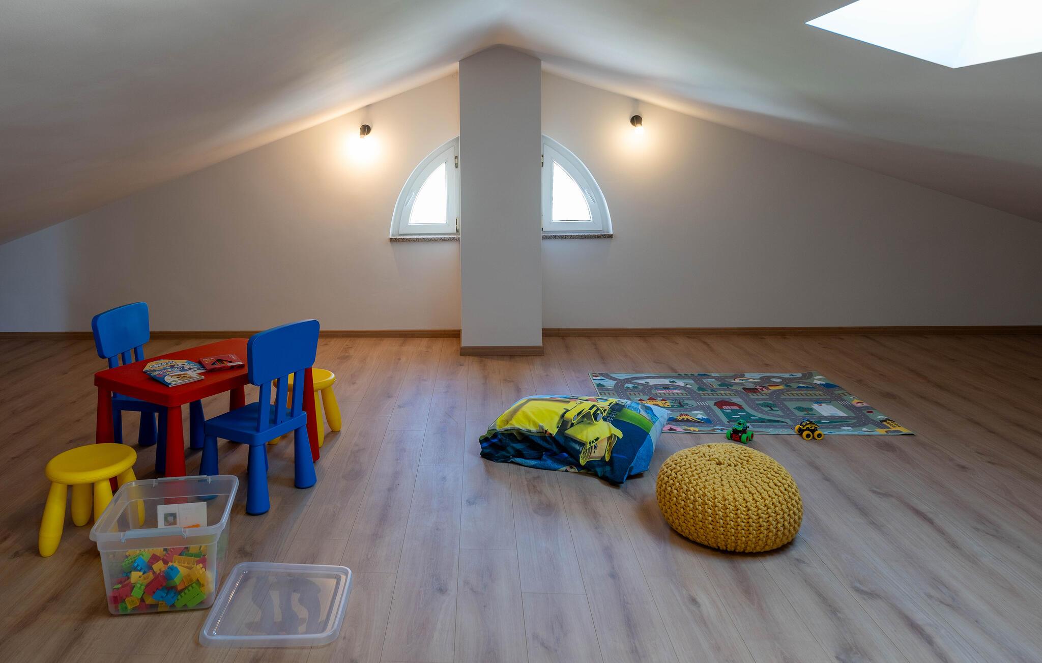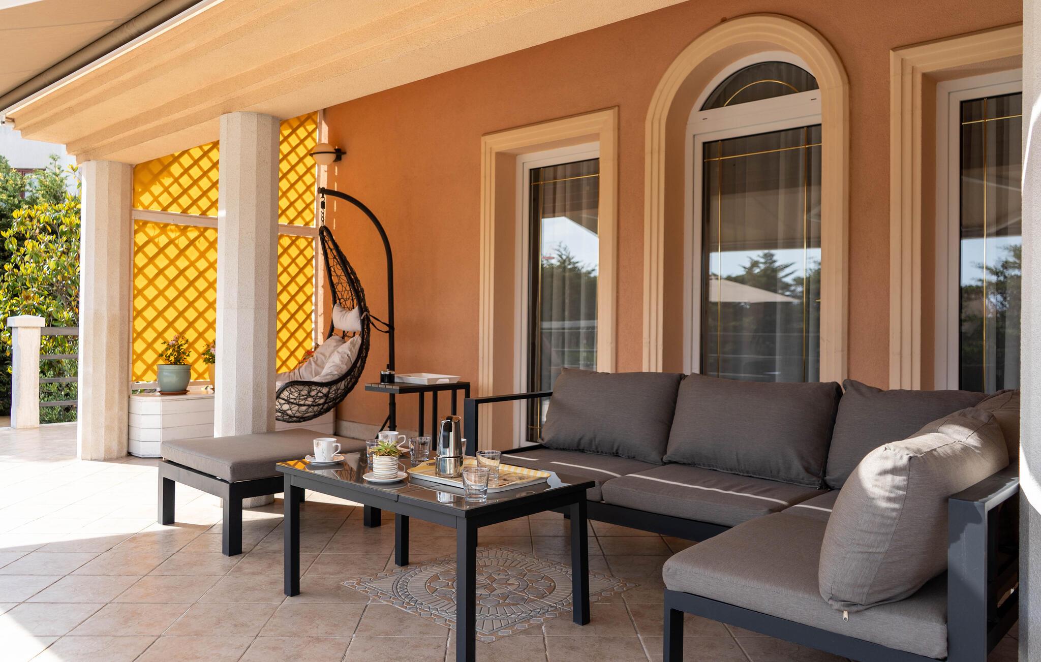 Tag ud om morgenen som det første og tag en forfriskende dukkert i poolen. Bagefter inviterer liggestolene jer til at tilbringe en afslappet formiddag med en kølig drink. Der er en rutsjebane og en gynge til børnene. Om aftenen kan I tænde op i grillen og samles til et måltid i det dejlige loungeområde på terrassen.