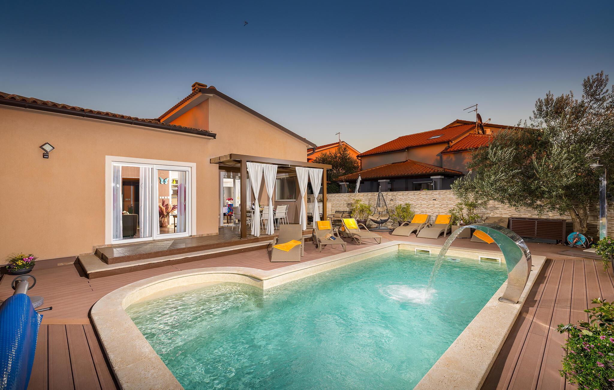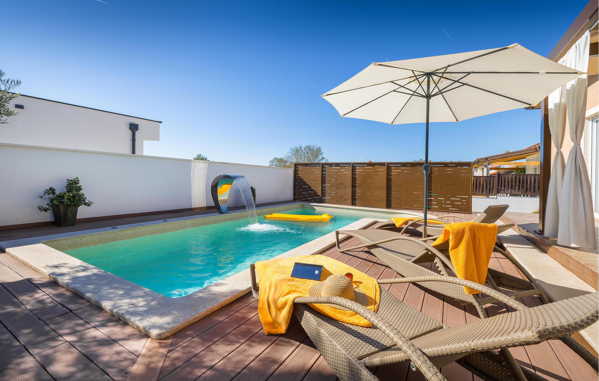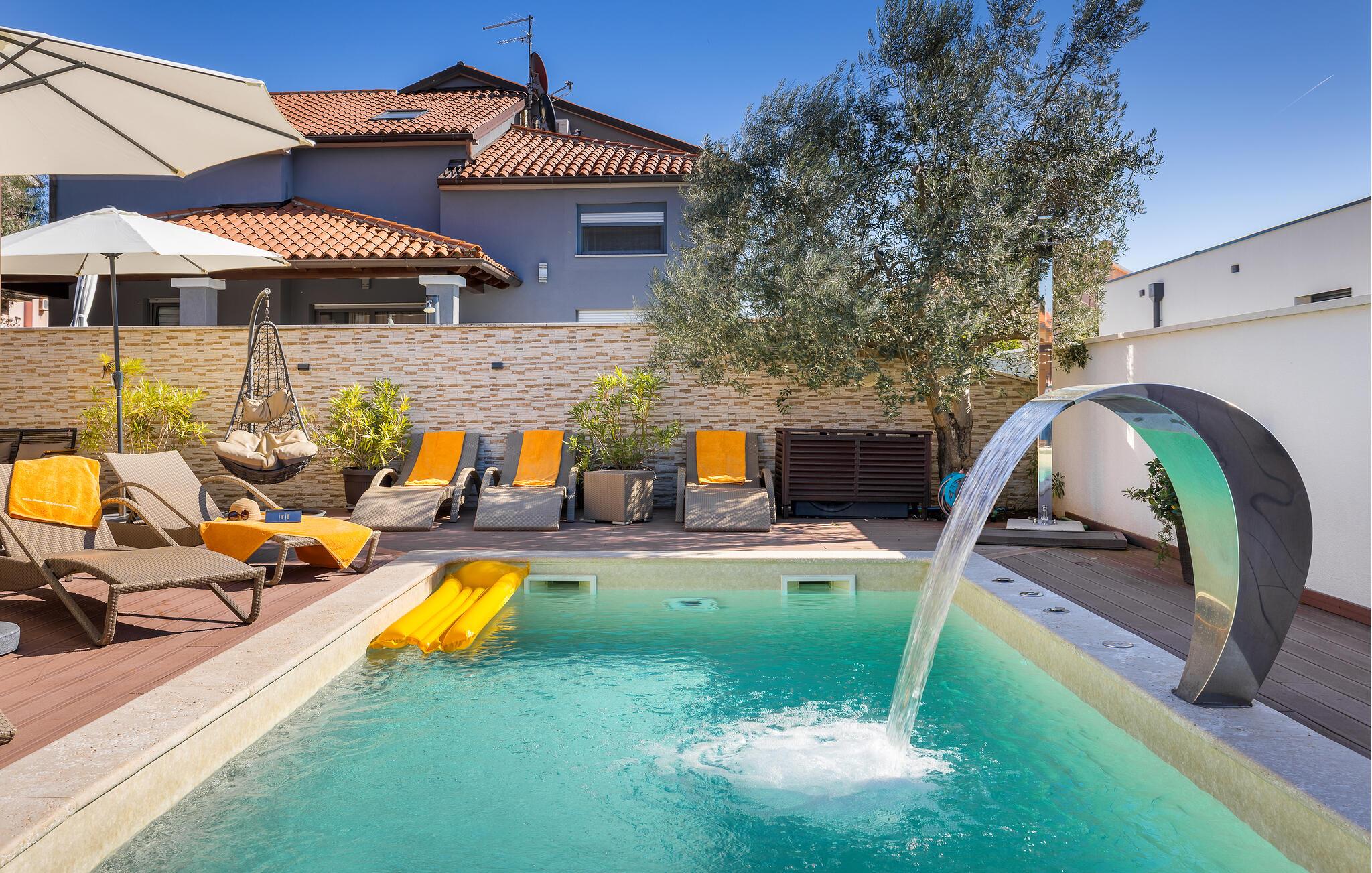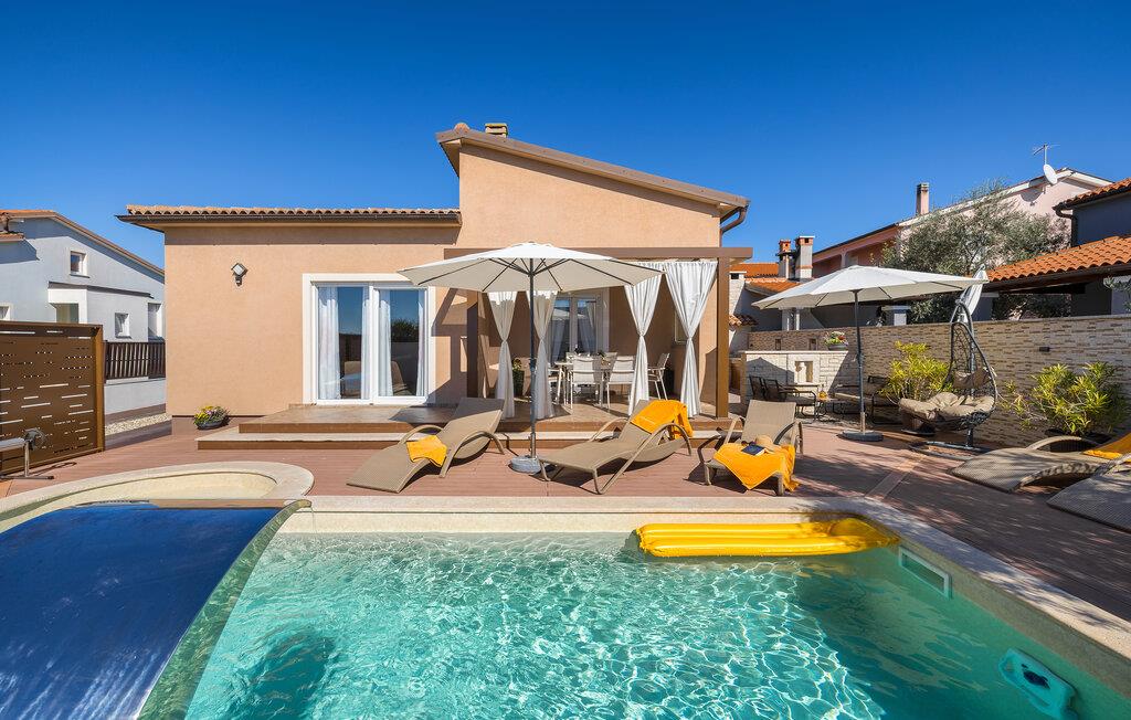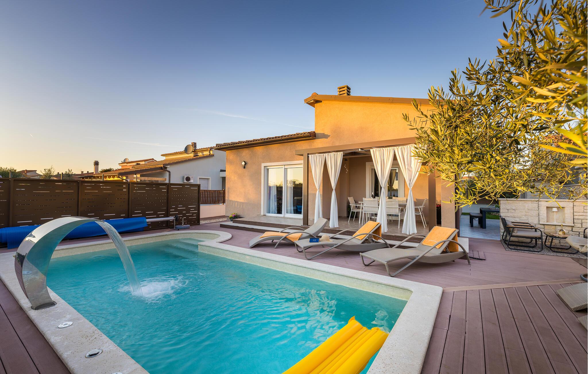 Den charmerende Villa Magnolia ligger i udkanten af Pula og er det helt rigtige feriemål for familier, der leder efter ro og afslapning og alligevel ikke ønsker at være for langt væk fra handlingen. Villaens højdepunkt er den forfriskende pool med modstrøm og vandmassagedyser. Hele familien vil have det sjovt her og sandsynligvis have den bedste tid på deres ferie. Slap af på en af liggestolene og nyd den kroatiske sol. Samles ved spisebordet på den overdækkede terrasse for at nyde frisklavede måltider på kulgrillen på milde sommeraftener. Et fodboldbord, et bordtennisbord og en trampolin til børn er også tilgængelige på udendørsområdet. Kommer du ind i det indre fra terrassen, finder du en åben stue. Alt er kærligt møbleret og dekoreret. Et komfortabelt opholdsområde og et fuldt udstyret køkken med spisebord er ideelle til, at din familie kan føle sig hjemme. 3 farverige soveværelser med komfortable dobbeltsenge kan rumme op til 6 personer. Den fuldt klimatiserede villa har også et smukt badeværelse med badekar. Pula og Brijuni National Park og mange smukke strande er inden for rækkevidde. Villa Magnolia ligger i den sydvestlige del af Istrien, kun 6 km fra regionens turistcenter Pula. Vi anbefaler det til familier med børn og til gæster, der foretrækker ro frem for travlhed i storbyer. Udover at bade og solbade, kan du også bruge din tid på at cykle, fordi mange istriske cykelstier passerer gennem eller i nærheden af Sisan. Kun en kort køretur fra villaen finder du Pula. Pula er den største by på halvøen Istrien og byder på en mangfoldighed af attraktioner til kulturelskere. Den rige rejseplan for dens tre tusinde år gamle historie, hvor hvert skridt du tager gennem den gamle bydel er et vartegn, begynder og slutter med det romerske amfiteater. En af de tæt ved skal se steder er absolut Rt Kamenjak. Her finder du krystalklart hav og strande, der passer til alles behov: glatte og jævne stenoverflader eller småsten til alle generationer, især familier med børn eller "afsondret" strande skjult af uberørt grønne områder for dem, der ønsker en smule privatliv. Book Villa Magnolia og tilbring en uforglemmelig ferie på den sydlige spids af Istrien. Temperaturen i den opvarmede swimmingpool er afhængig af eksterne faktorer, herunder vejrforhold, og som sådan kan temperaturen på vandet ikke garanteres.