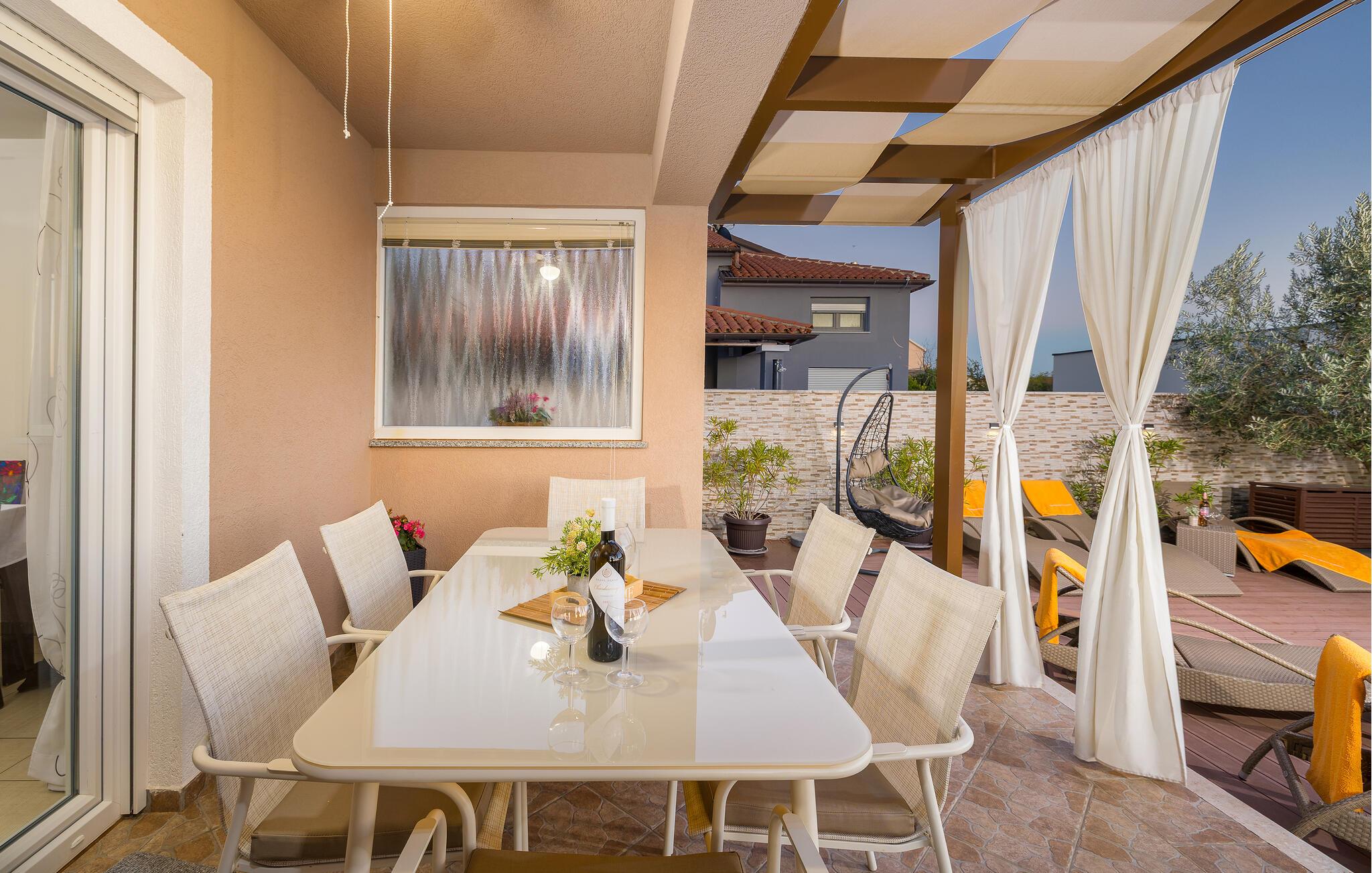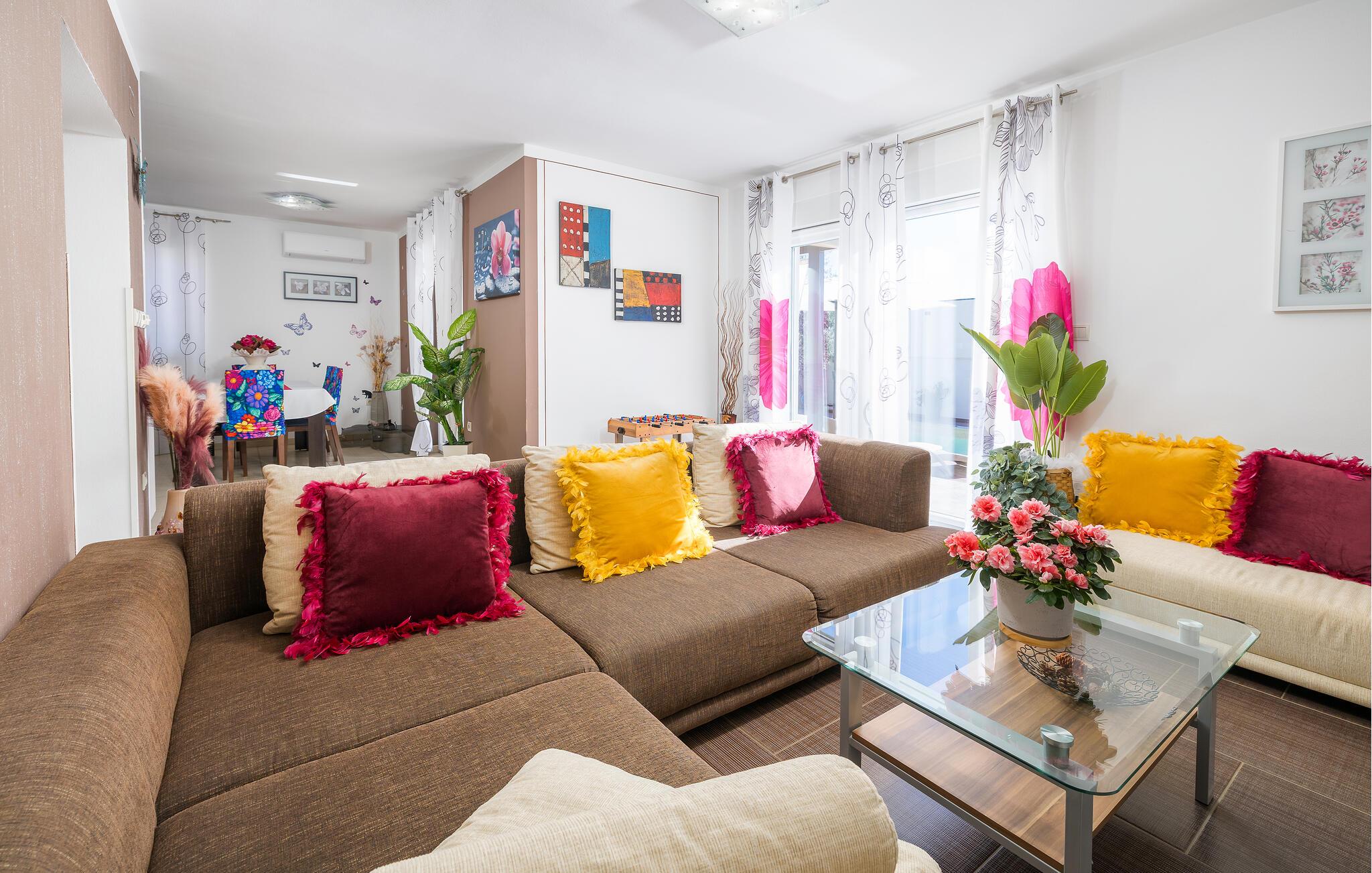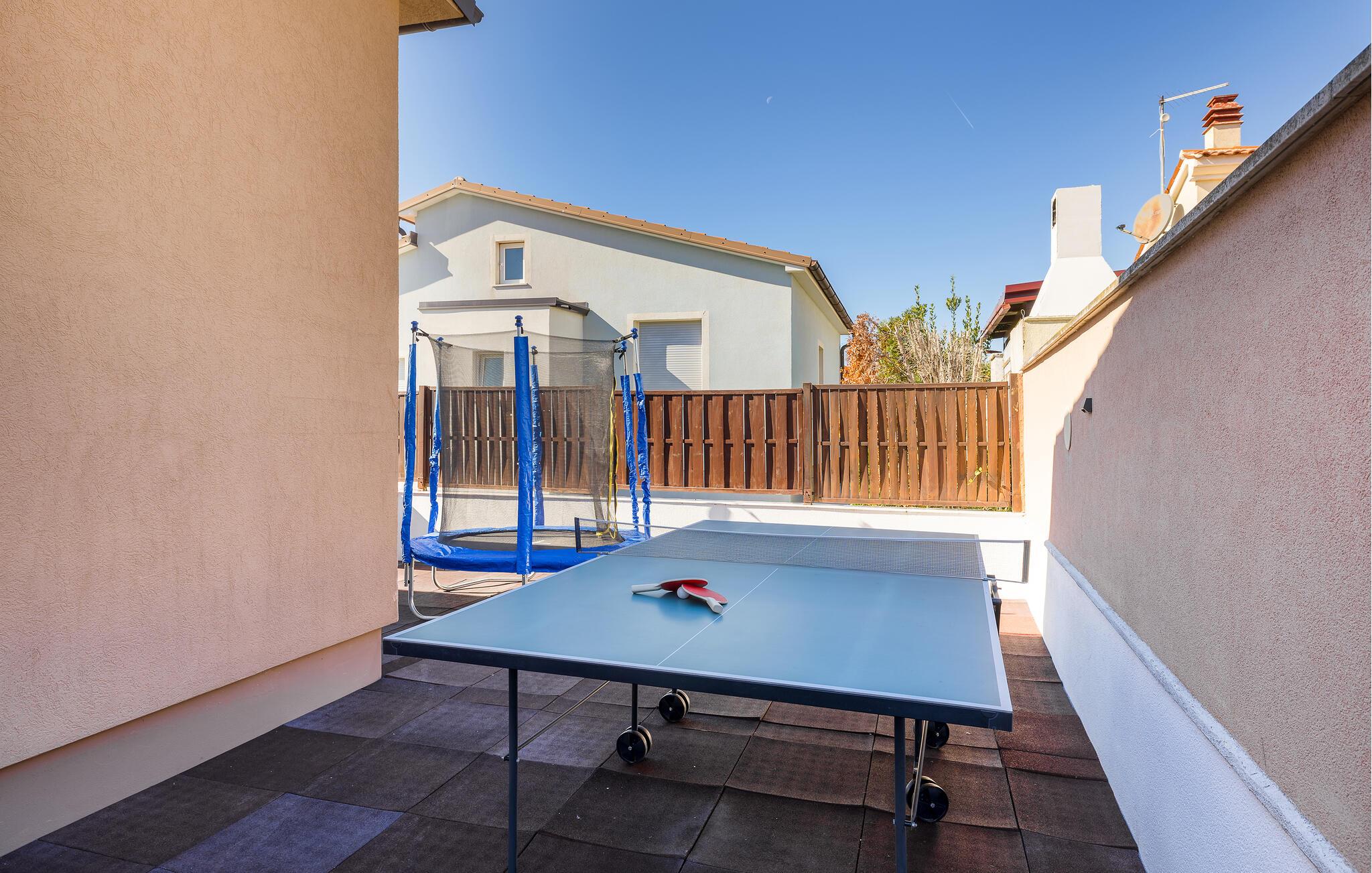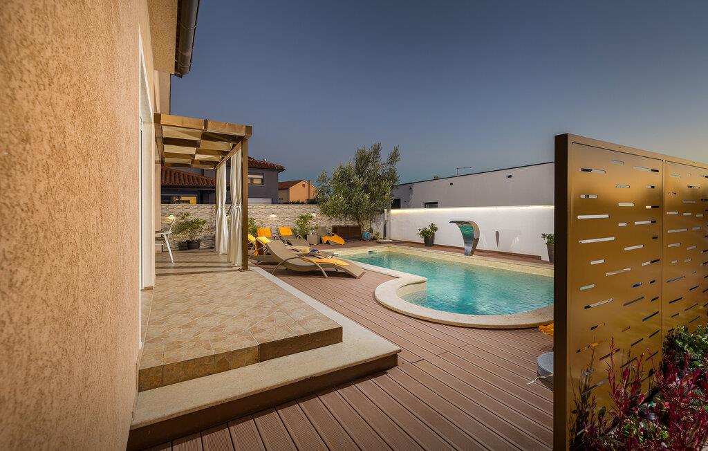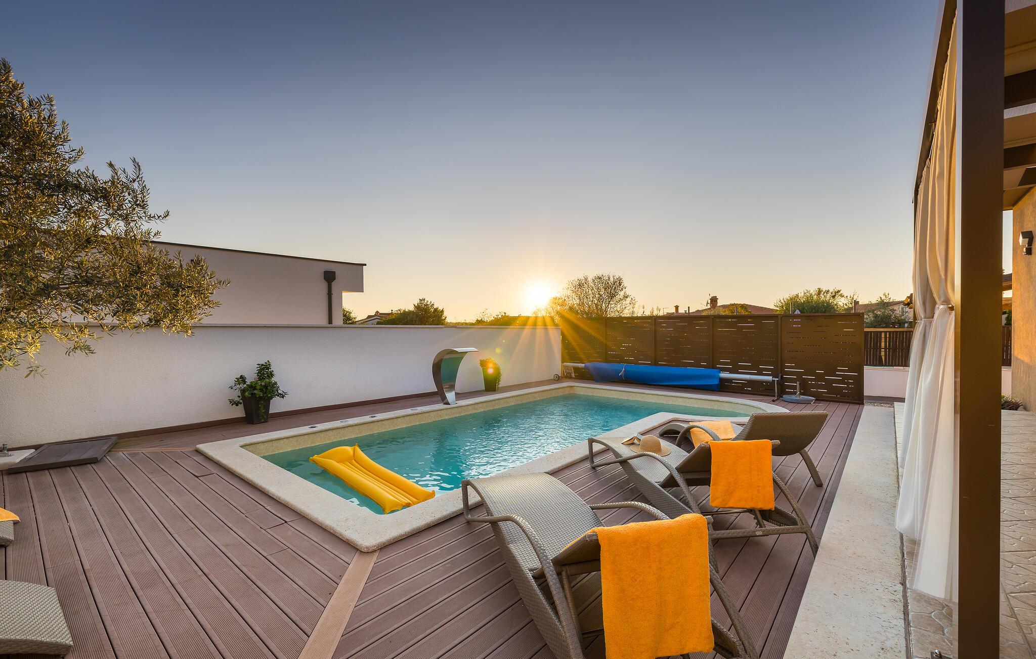 Den charmerende Villa Magnolia ligger i udkanten af Pula og er det helt rigtige feriemål for familier, der leder efter ro og afslapning og alligevel ikke ønsker at være for langt væk fra handlingen. Villaens højdepunkt er den forfriskende pool med modstrøm og vandmassagedyser. Hele familien vil have det sjovt her og sandsynligvis have den bedste tid på deres ferie. Slap af på en af liggestolene og nyd den kroatiske sol. Samles ved spisebordet på den overdækkede terrasse for at nyde frisklavede måltider på kulgrillen på milde sommeraftener. Et fodboldbord, et bordtennisbord og en trampolin til børn er også tilgængelige på udendørsområdet. Kommer du ind i det indre fra terrassen, finder du en åben stue. Alt er kærligt møbleret og dekoreret. Et komfortabelt opholdsområde og et fuldt udstyret køkken med spisebord er ideelle til, at din familie kan føle sig hjemme. 3 farverige soveværelser med komfortable dobbeltsenge kan rumme op til 6 personer. Den fuldt klimatiserede villa har også et smukt badeværelse med badekar. Pula og Brijuni National Park og mange smukke strande er inden for rækkevidde. Villa Magnolia ligger i den sydvestlige del af Istrien, kun 6 km fra regionens turistcenter Pula. Vi anbefaler det til familier med børn og til gæster, der foretrækker ro frem for travlhed i storbyer. Udover at bade og solbade, kan du også bruge din tid på at cykle, fordi mange istriske cykelstier passerer gennem eller i nærheden af Sisan. Kun en kort køretur fra villaen finder du Pula. Pula er den største by på halvøen Istrien og byder på en mangfoldighed af attraktioner til kulturelskere. Den rige rejseplan for dens tre tusinde år gamle historie, hvor hvert skridt du tager gennem den gamle bydel er et vartegn, begynder og slutter med det romerske amfiteater. En af de tæt ved skal se steder er absolut Rt Kamenjak. Her finder du krystalklart hav og strande, der passer til alles behov: glatte og jævne stenoverflader eller småsten til alle generationer, især familier med børn eller "afsondret" strande skjult af uberørt grønne områder for dem, der ønsker en smule privatliv. Book Villa Magnolia og tilbring en uforglemmelig ferie på den sydlige spids af Istrien. Temperaturen i den opvarmede swimmingpool er afhængig af eksterne faktorer, herunder vejrforhold, og som sådan kan temperaturen på vandet ikke garanteres.