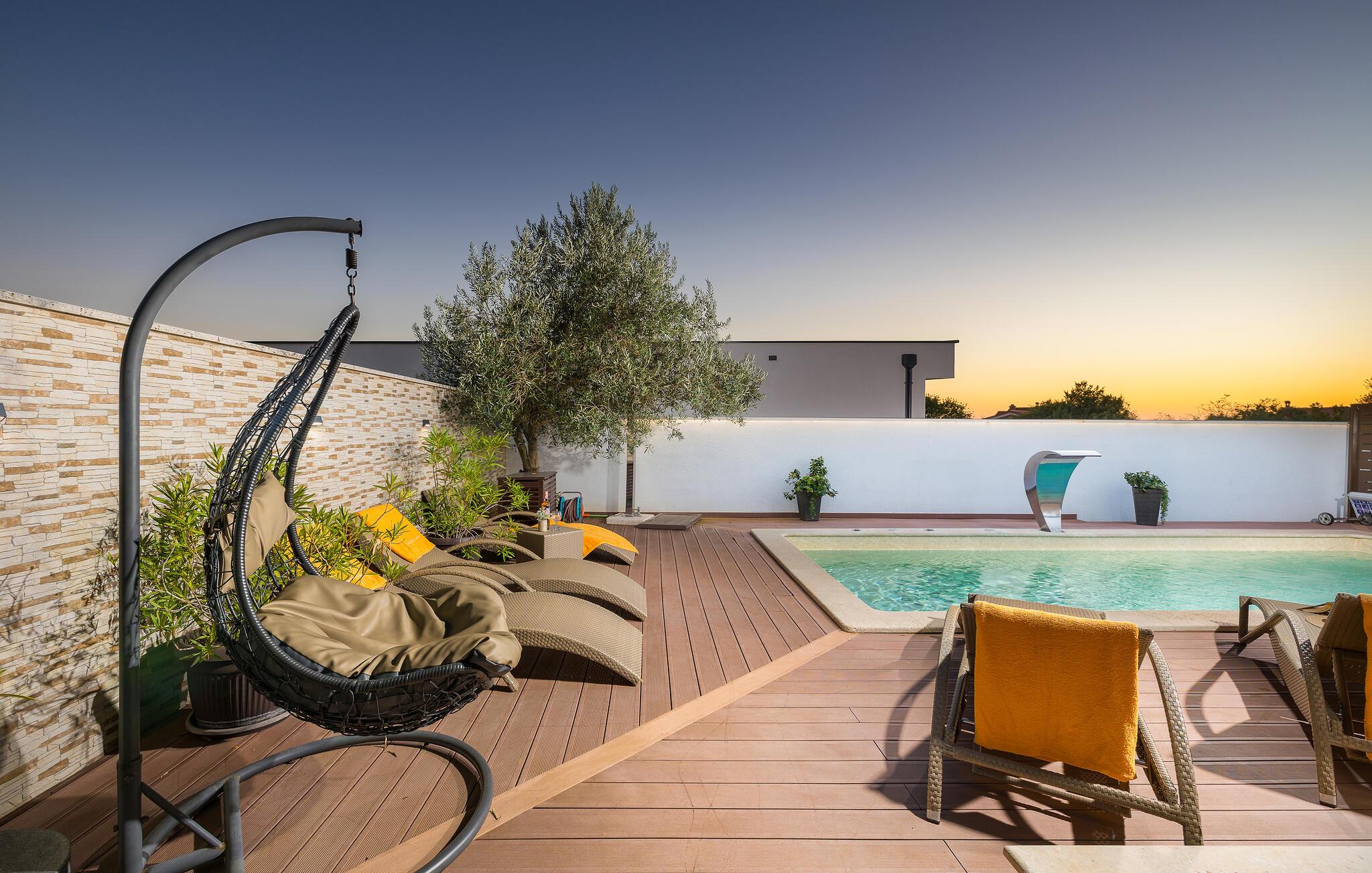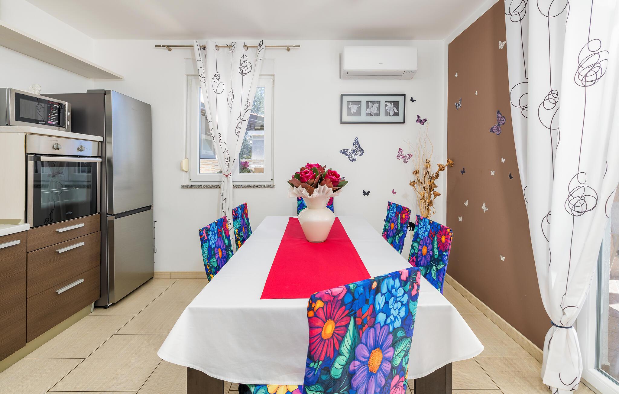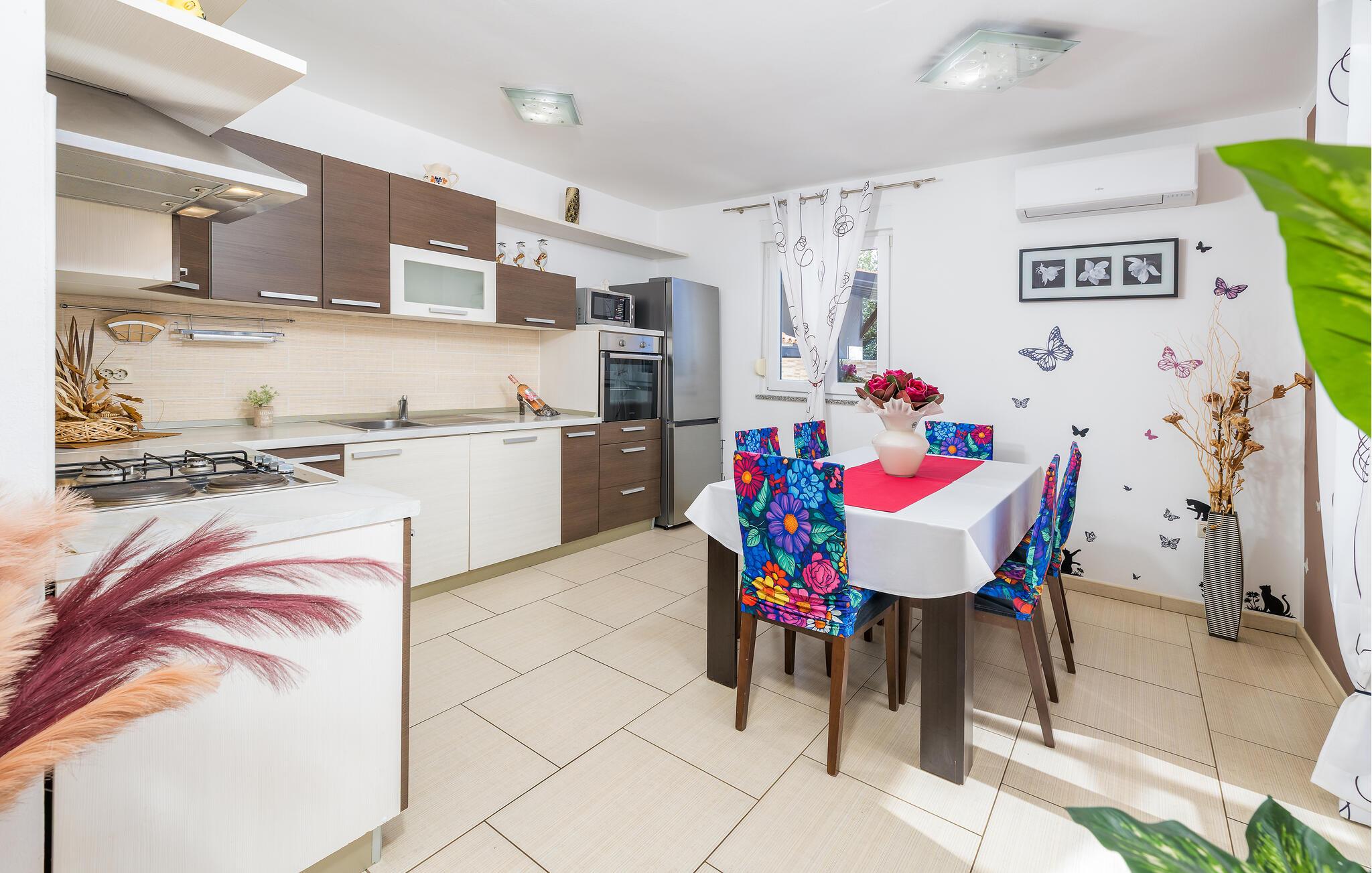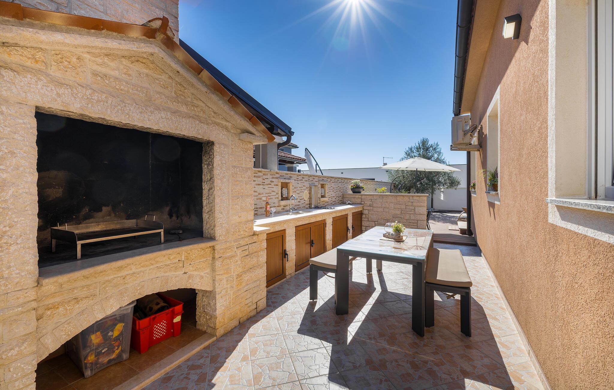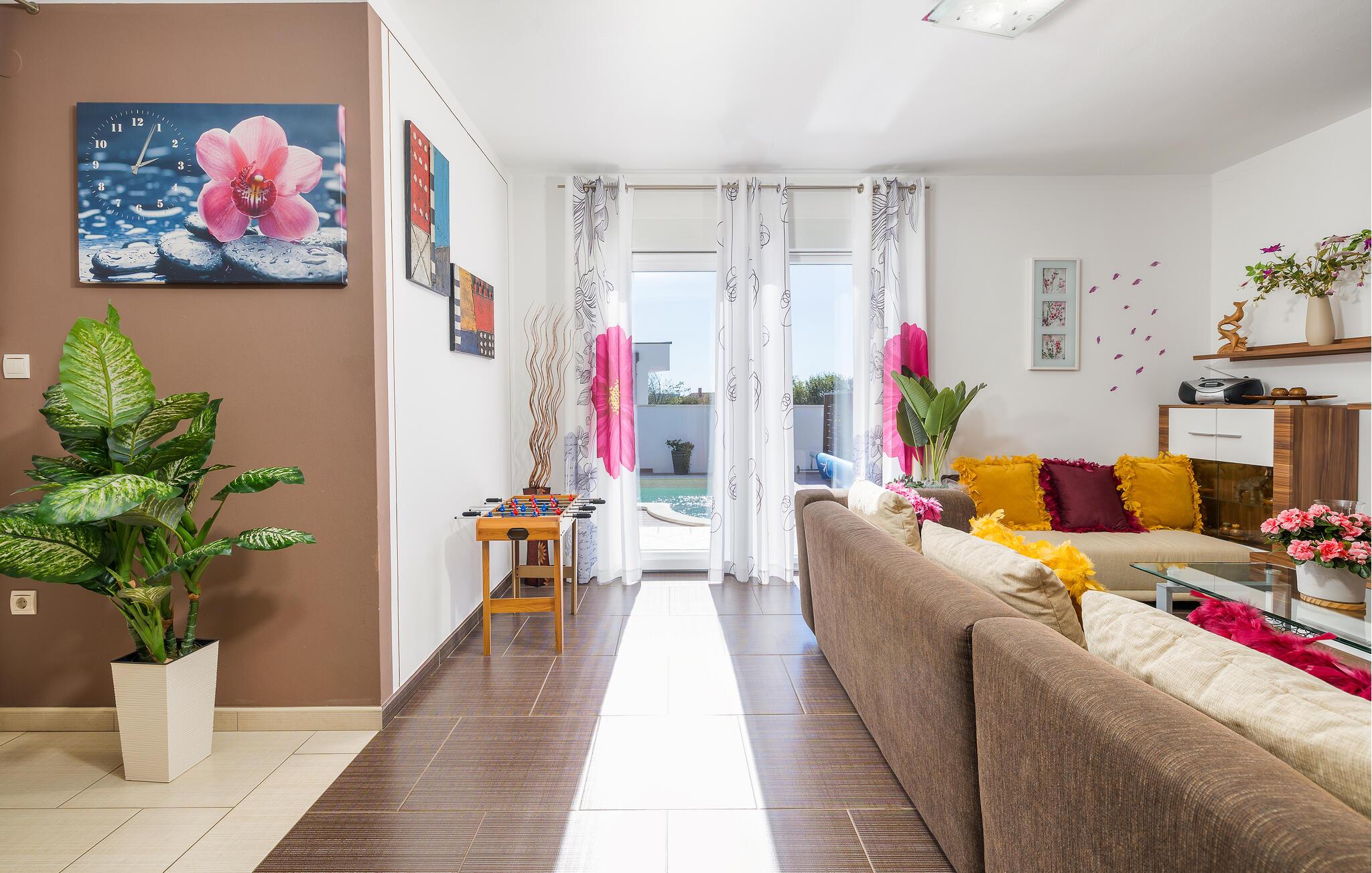 Den charmerende Villa Magnolia ligger i udkanten af Pula og er det helt rigtige feriemål for familier, der leder efter ro og afslapning og alligevel ikke ønsker at være for langt væk fra handlingen. Villaens højdepunkt er den forfriskende pool med modstrøm og vandmassagedyser. Hele familien vil have det sjovt her og sandsynligvis have den bedste tid på deres ferie. Slap af på en af liggestolene og nyd den kroatiske sol. Samles ved spisebordet på den overdækkede terrasse for at nyde frisklavede måltider på kulgrillen på milde sommeraftener. Et fodboldbord, et bordtennisbord og en trampolin til børn er også tilgængelige på udendørsområdet. Kommer du ind i det indre fra terrassen, finder du en åben stue. Alt er kærligt møbleret og dekoreret. Et komfortabelt opholdsområde og et fuldt udstyret køkken med spisebord er ideelle til, at din familie kan føle sig hjemme. 3 farverige soveværelser med komfortable dobbeltsenge kan rumme op til 6 personer. Den fuldt klimatiserede villa har også et smukt badeværelse med badekar. Pula og Brijuni National Park og mange smukke strande er inden for rækkevidde. Villa Magnolia ligger i den sydvestlige del af Istrien, kun 6 km fra regionens turistcenter Pula. Vi anbefaler det til familier med børn og til gæster, der foretrækker ro frem for travlhed i storbyer. Udover at bade og solbade, kan du også bruge din tid på at cykle, fordi mange istriske cykelstier passerer gennem eller i nærheden af Sisan. Kun en kort køretur fra villaen finder du Pula. Pula er den største by på halvøen Istrien og byder på en mangfoldighed af attraktioner til kulturelskere. Den rige rejseplan for dens tre tusinde år gamle historie, hvor hvert skridt du tager gennem den gamle bydel er et vartegn, begynder og slutter med det romerske amfiteater. En af de tæt ved skal se steder er absolut Rt Kamenjak. Her finder du krystalklart hav og strande, der passer til alles behov: glatte og jævne stenoverflader eller småsten til alle generationer, især familier med børn eller "afsondret" strande skjult af uberørt grønne områder for dem, der ønsker en smule privatliv. Book Villa Magnolia og tilbring en uforglemmelig ferie på den sydlige spids af Istrien. Temperaturen i den opvarmede swimmingpool er afhængig af eksterne faktorer, herunder vejrforhold, og som sådan kan temperaturen på vandet ikke garanteres.