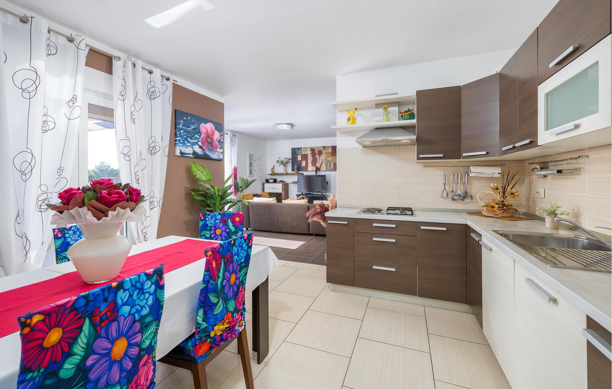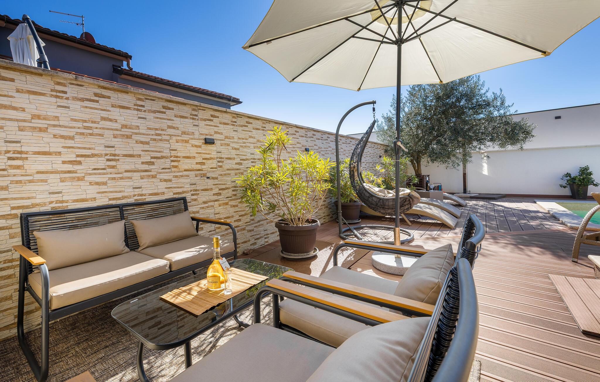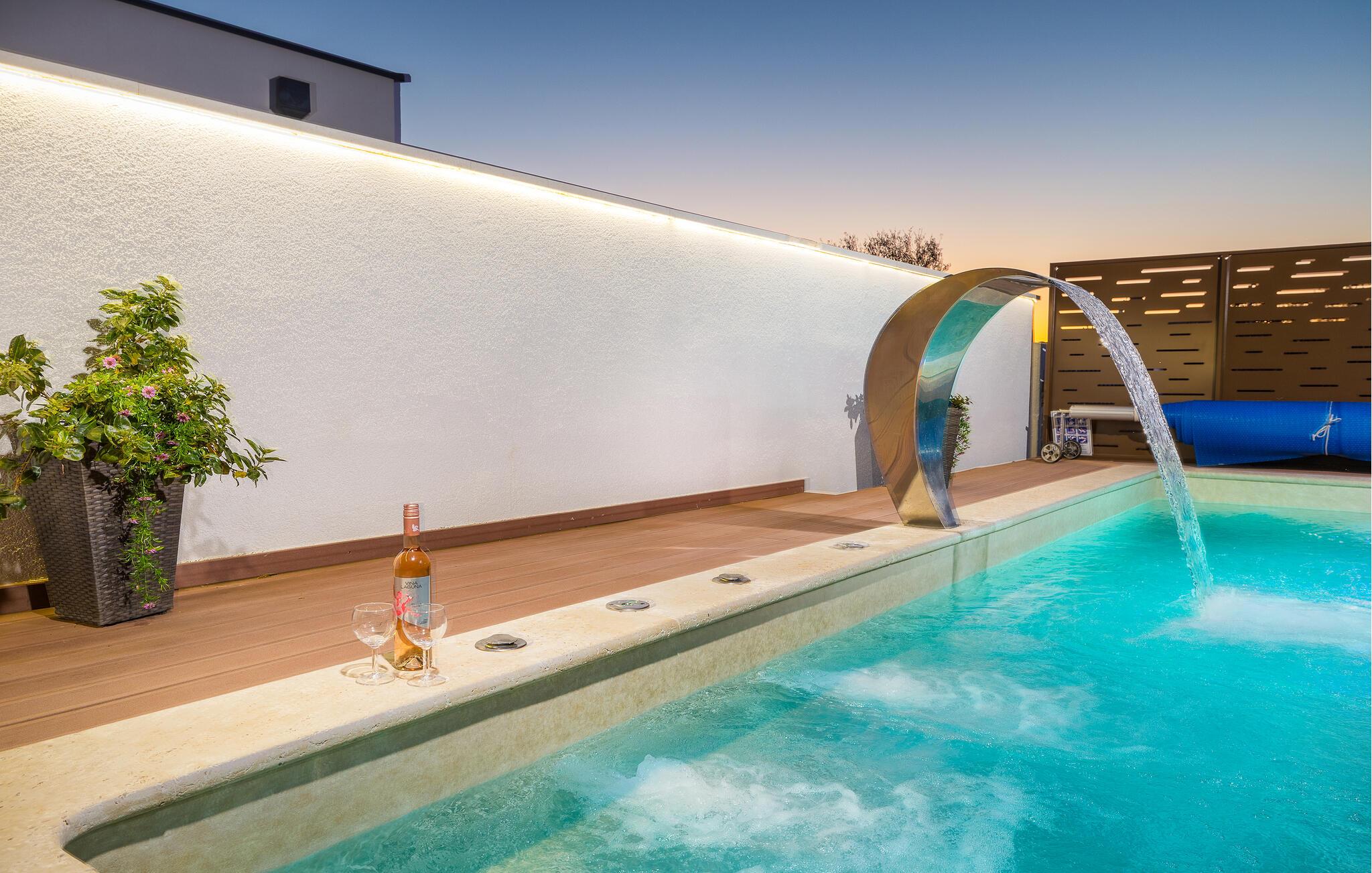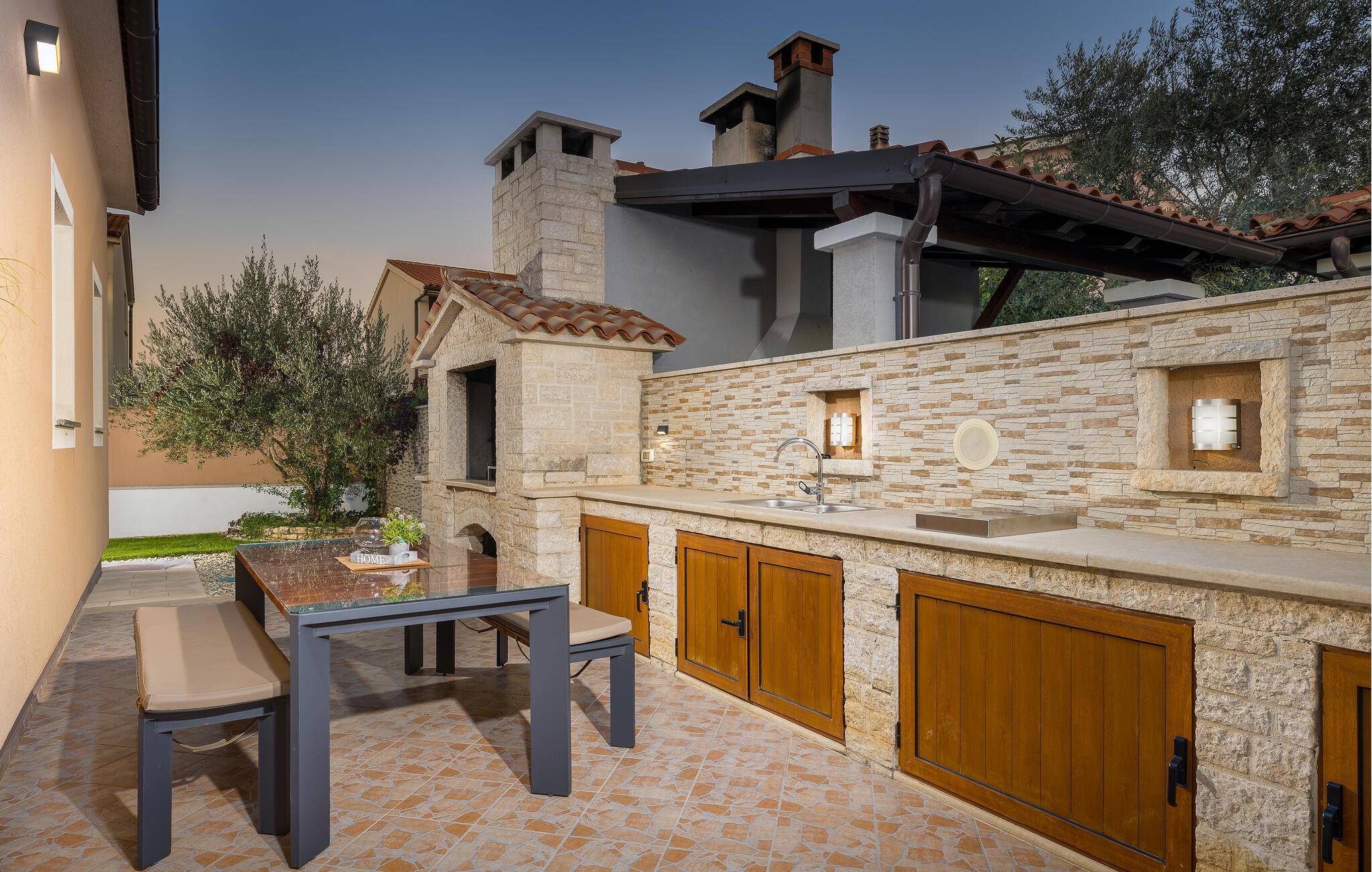 Den charmerende Villa Magnolia ligger i udkanten af Pula og er det helt rigtige feriemål for familier, der leder efter ro og afslapning og alligevel ikke ønsker at være for langt væk fra handlingen. Villaens højdepunkt er den forfriskende pool med modstrøm og vandmassagedyser. Hele familien vil have det sjovt her og sandsynligvis have den bedste tid på deres ferie. Slap af på en af liggestolene og nyd den kroatiske sol. Samles ved spisebordet på den overdækkede terrasse for at nyde frisklavede måltider på kulgrillen på milde sommeraftener. Et fodboldbord, et bordtennisbord og en trampolin til børn er også tilgængelige på udendørsområdet. Kommer du ind i det indre fra terrassen, finder du en åben stue. Alt er kærligt møbleret og dekoreret. Et komfortabelt opholdsområde og et fuldt udstyret køkken med spisebord er ideelle til, at din familie kan føle sig hjemme. 3 farverige soveværelser med komfortable dobbeltsenge kan rumme op til 6 personer. Den fuldt klimatiserede villa har også et smukt badeværelse med badekar. Pula og Brijuni National Park og mange smukke strande er inden for rækkevidde. Villa Magnolia ligger i den sydvestlige del af Istrien, kun 6 km fra regionens turistcenter Pula. Vi anbefaler det til familier med børn og til gæster, der foretrækker ro frem for travlhed i storbyer. Udover at bade og solbade, kan du også bruge din tid på at cykle, fordi mange istriske cykelstier passerer gennem eller i nærheden af Sisan. Kun en kort køretur fra villaen finder du Pula. Pula er den største by på halvøen Istrien og byder på en mangfoldighed af attraktioner til kulturelskere. Den rige rejseplan for dens tre tusinde år gamle historie, hvor hvert skridt du tager gennem den gamle bydel er et vartegn, begynder og slutter med det romerske amfiteater. En af de tæt ved skal se steder er absolut Rt Kamenjak. Her finder du krystalklart hav og strande, der passer til alles behov: glatte og jævne stenoverflader eller småsten til alle generationer, især familier med børn eller "afsondret" strande skjult af uberørt grønne områder for dem, der ønsker en smule privatliv. Book Villa Magnolia og tilbring en uforglemmelig ferie på den sydlige spids af Istrien. Temperaturen i den opvarmede swimmingpool er afhængig af eksterne faktorer, herunder vejrforhold, og som sådan kan temperaturen på vandet ikke garanteres.