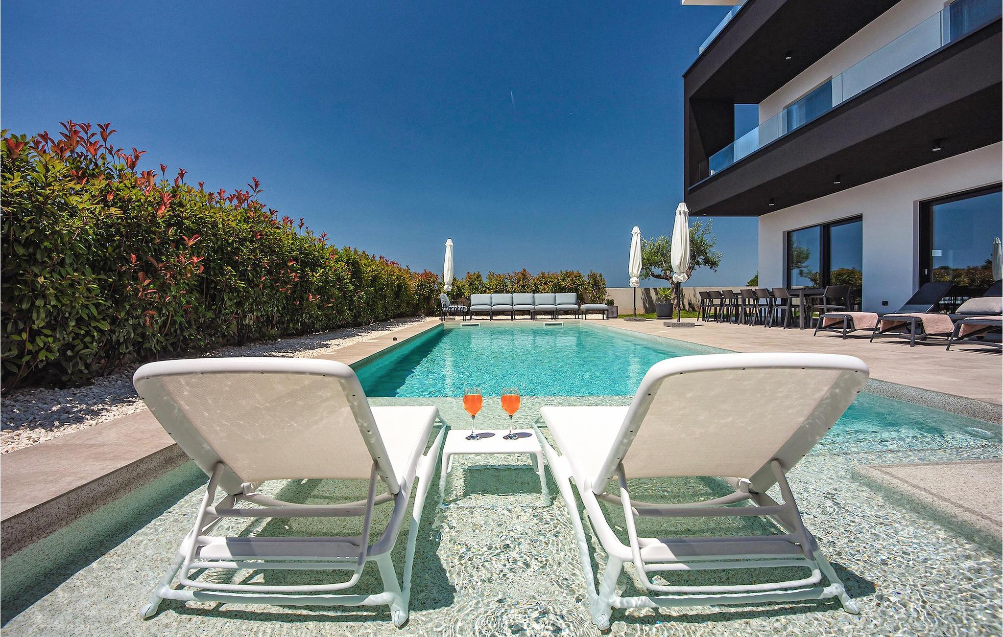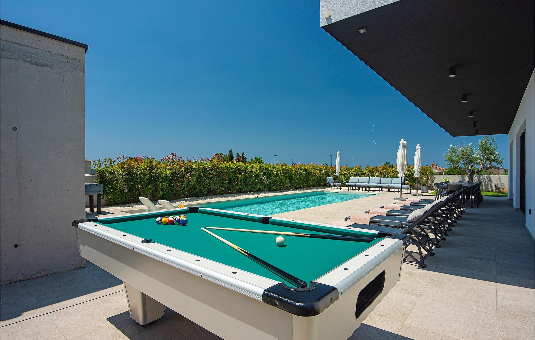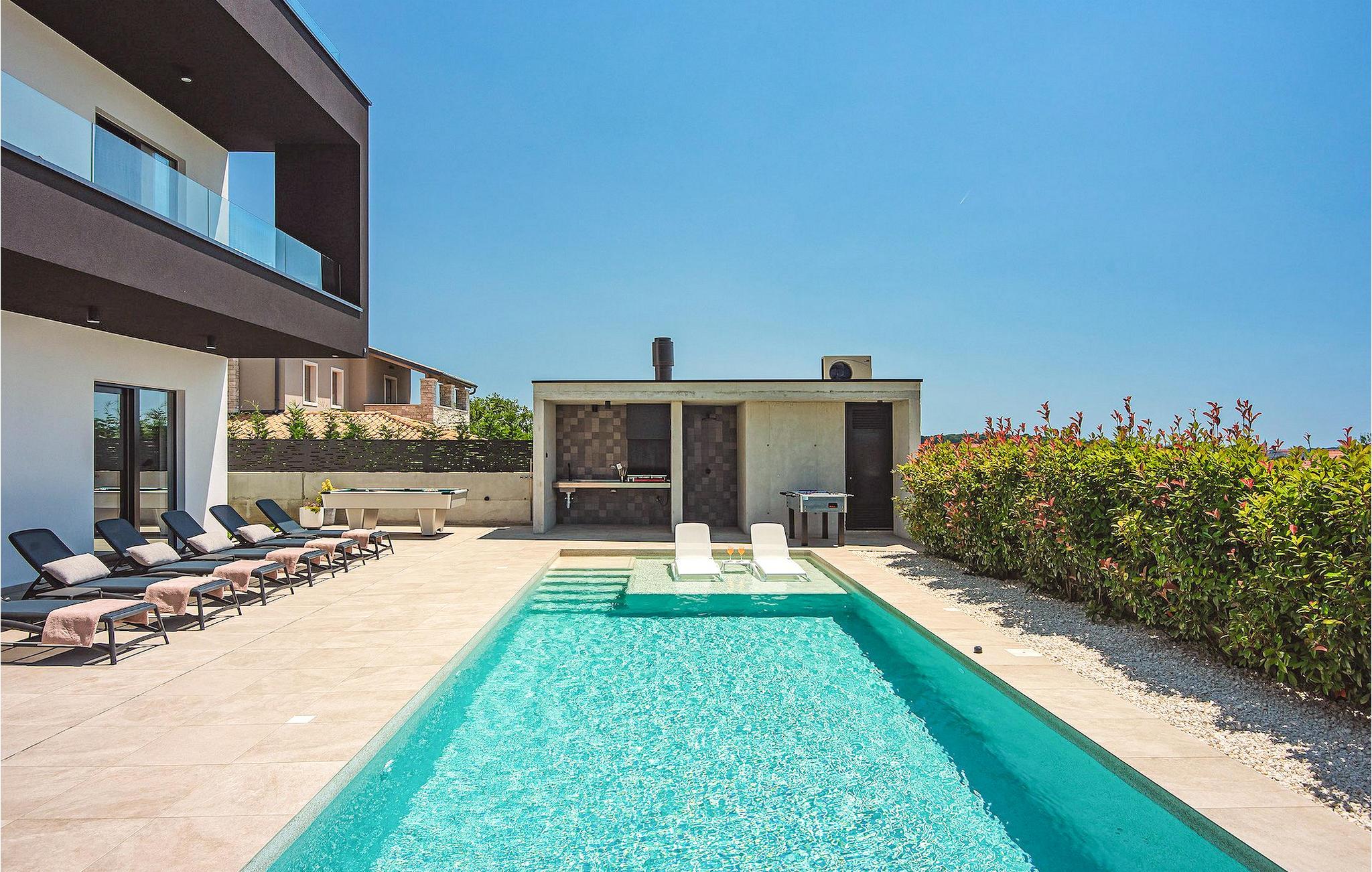 Vil du slappe af i en moderne villa nær havet? Så er Villa Aquarius det ideelle sted at opfylde dine ønsker. Villaen kan rumme fjorten personer og byder på syv soveværelser med private badeværelser, en privat pool og en smuk havudsigt. Villaens første sal har en entré, et veludstyret køkken med spiseplads, en stue og et soveværelse med separat badeværelse og separat toilet. På anden sal er der tre soveværelser med separate badeværelser, et soveværelse med to senge og et separat badeværelse samt en terrasse med en smuk havudsigt. Vågn op hver morgen og nyd din kaffe med panoramaudsigt. Nyd din ferie med familie og venner ved det kroatiske Adriaterhav og Villa Aquarius, som vil give dig en uforglemmelig ferie. Villa Aquarius er ikke et festhus, og ungdomsgrupper er ikke tilladt. Placeringen af Villa Aquarius er simpelthen perfekt: det er kun 2 km fra de første strande, det er tæt på centrum af Pula og det er kun en kort køretur fra Fazana , hvorfra du kan leje en båd og besøge Brijuni-øerne, en fabelagtig nationalpark.