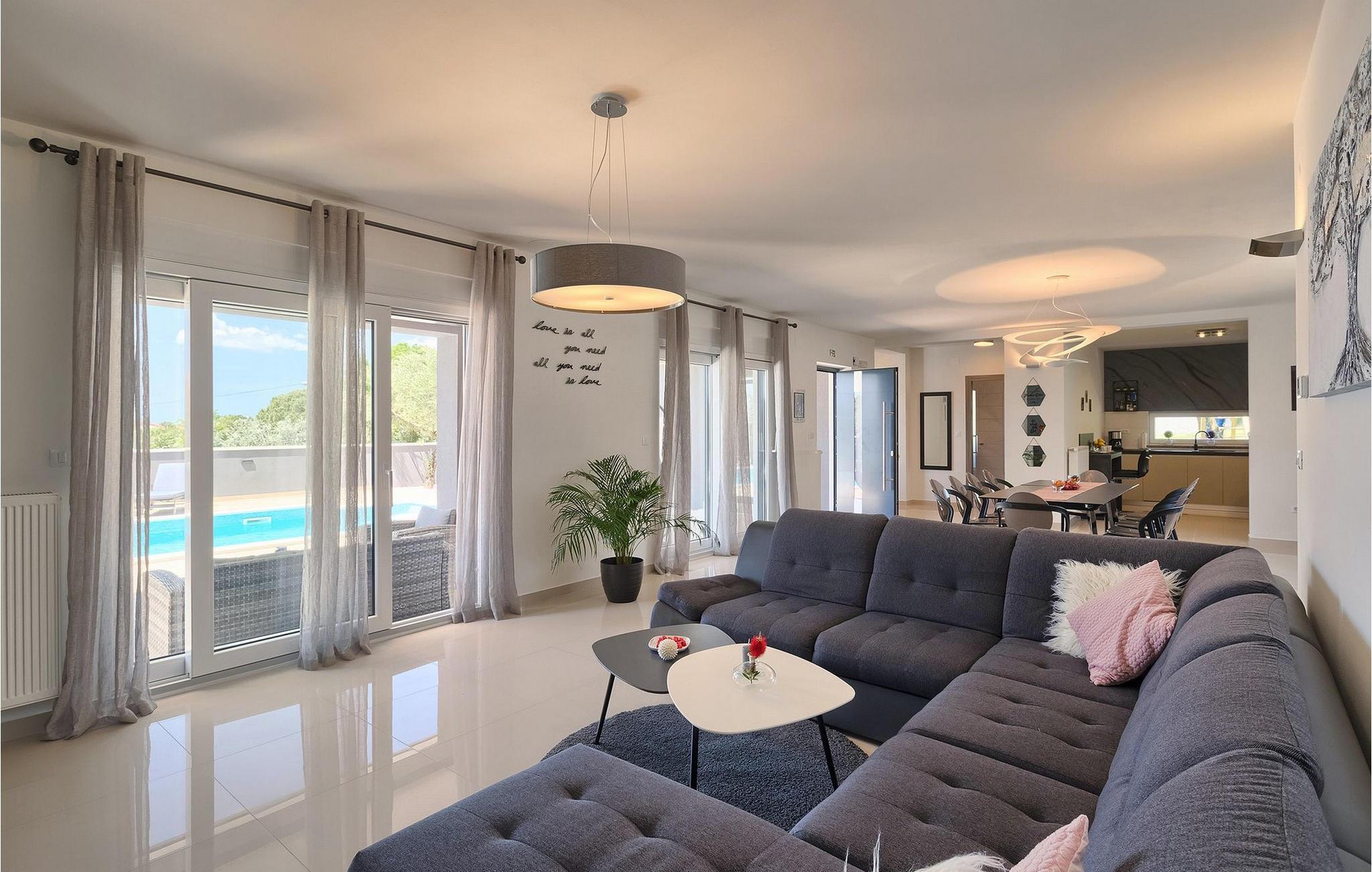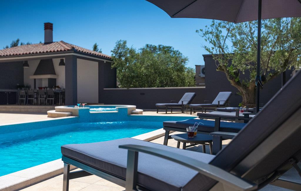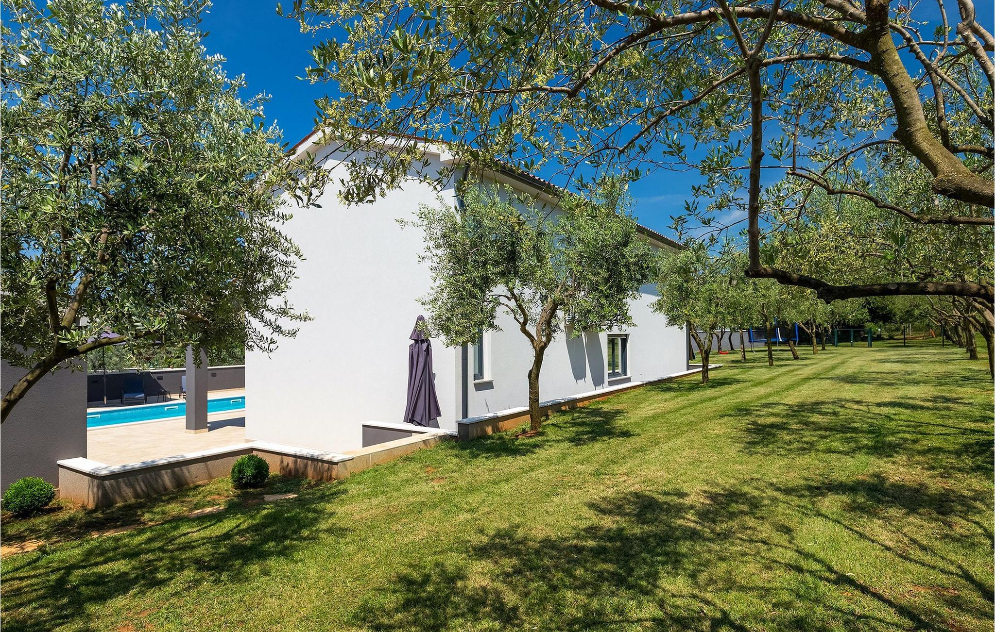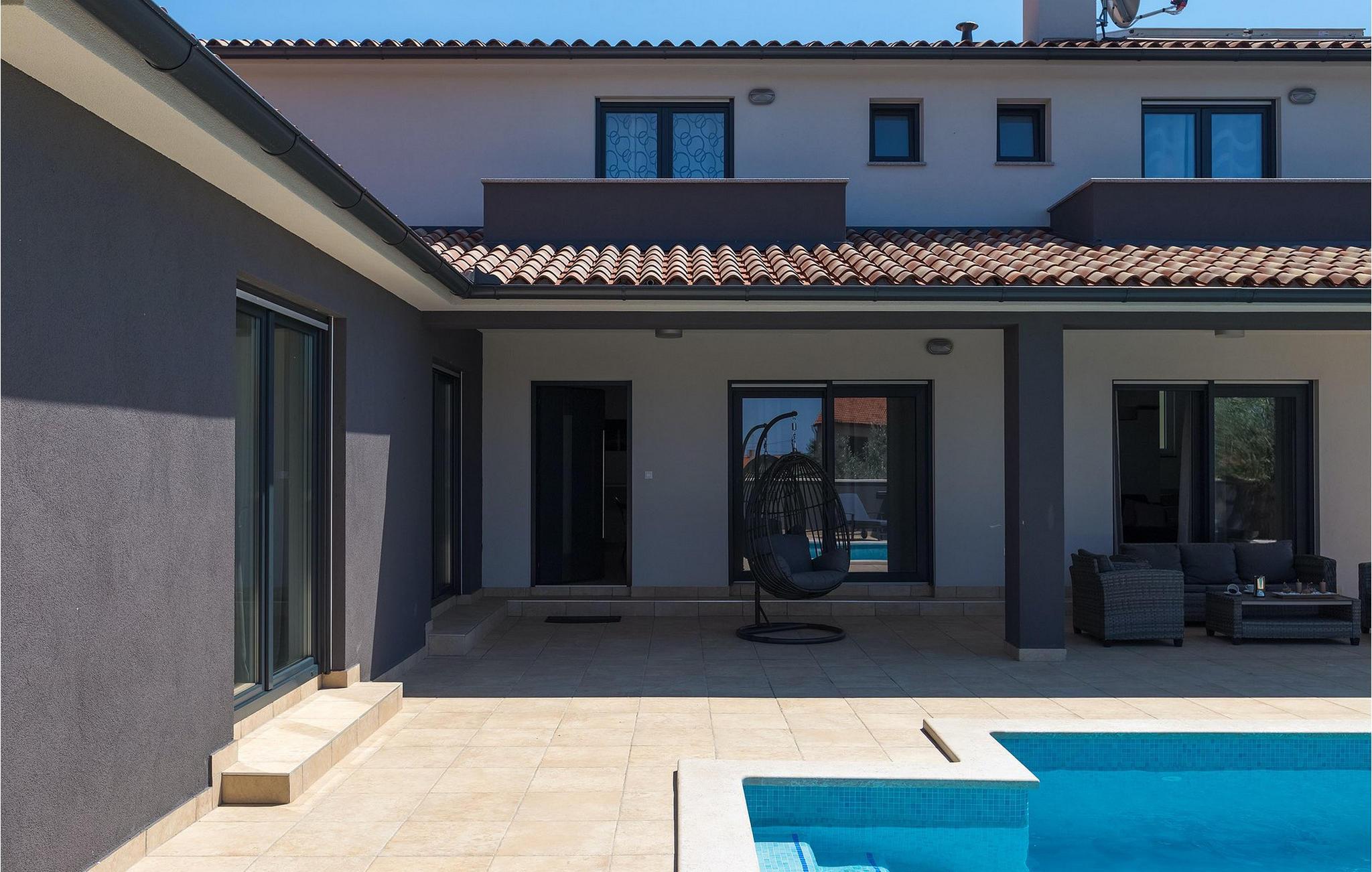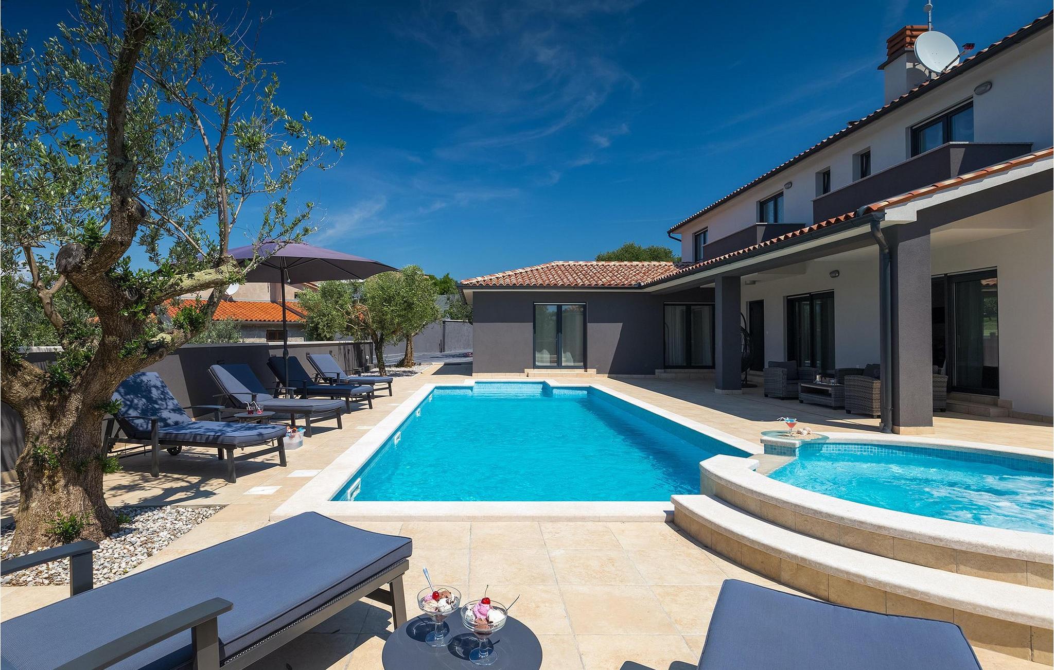 Det er beliggende på et ret rummeligt stykke jord - omkring 1600 m2, med en stor have, udendørs spiseplads, hydromassage ring og en 60m2 stor pool . Det indendørs område er stort nok til at rumme op til 10 gæster. Det har 5 soveværelser, hver med king-size senge, tv, aircondition og eget badeværelse. Der er også et sjette badeværelse. Opholdsområdet omfatter et fuldt udstyret moderne køkken, en stilfuld spiseplads og komfortabel stue. Det er her sovesofaen til to gæster er placeret. Fra opholdsområdet har du direkte adgang til poolområdet og haven, hvor du kan tilbringe uforglemmelige sommerdage - enten i poolen, mens du køler af, på børnenes legeplads, mens du tilbringer uforglemmelige stunder med dine børn, eller bare i skyggen i udekøkkenet, mens du læser din yndlingssommerroman eller spiser et lækkert måltid. Det er op til dig!