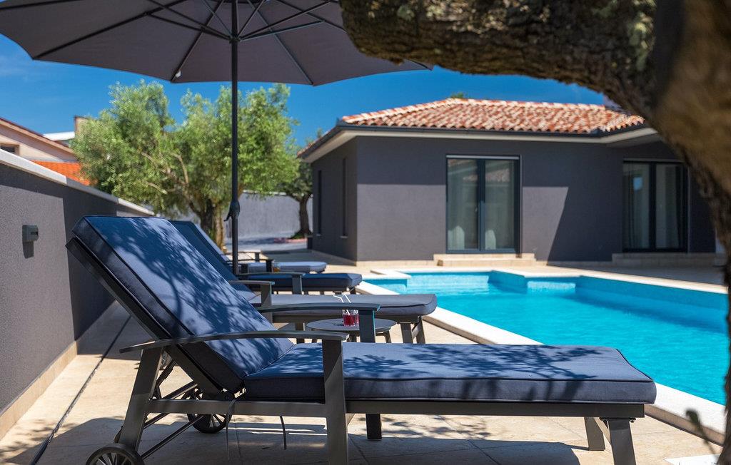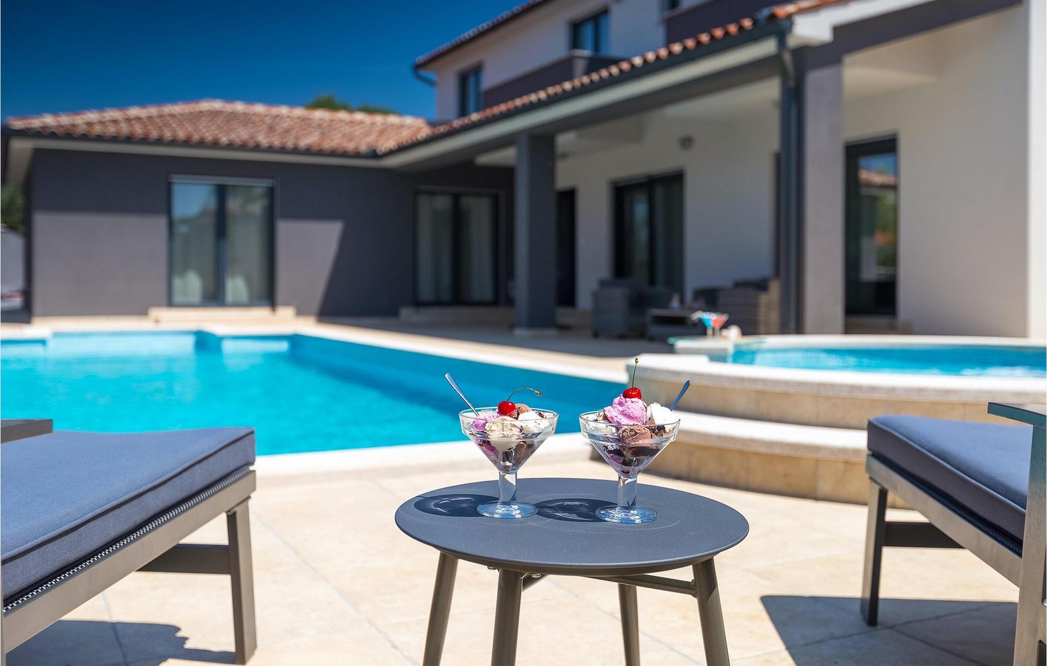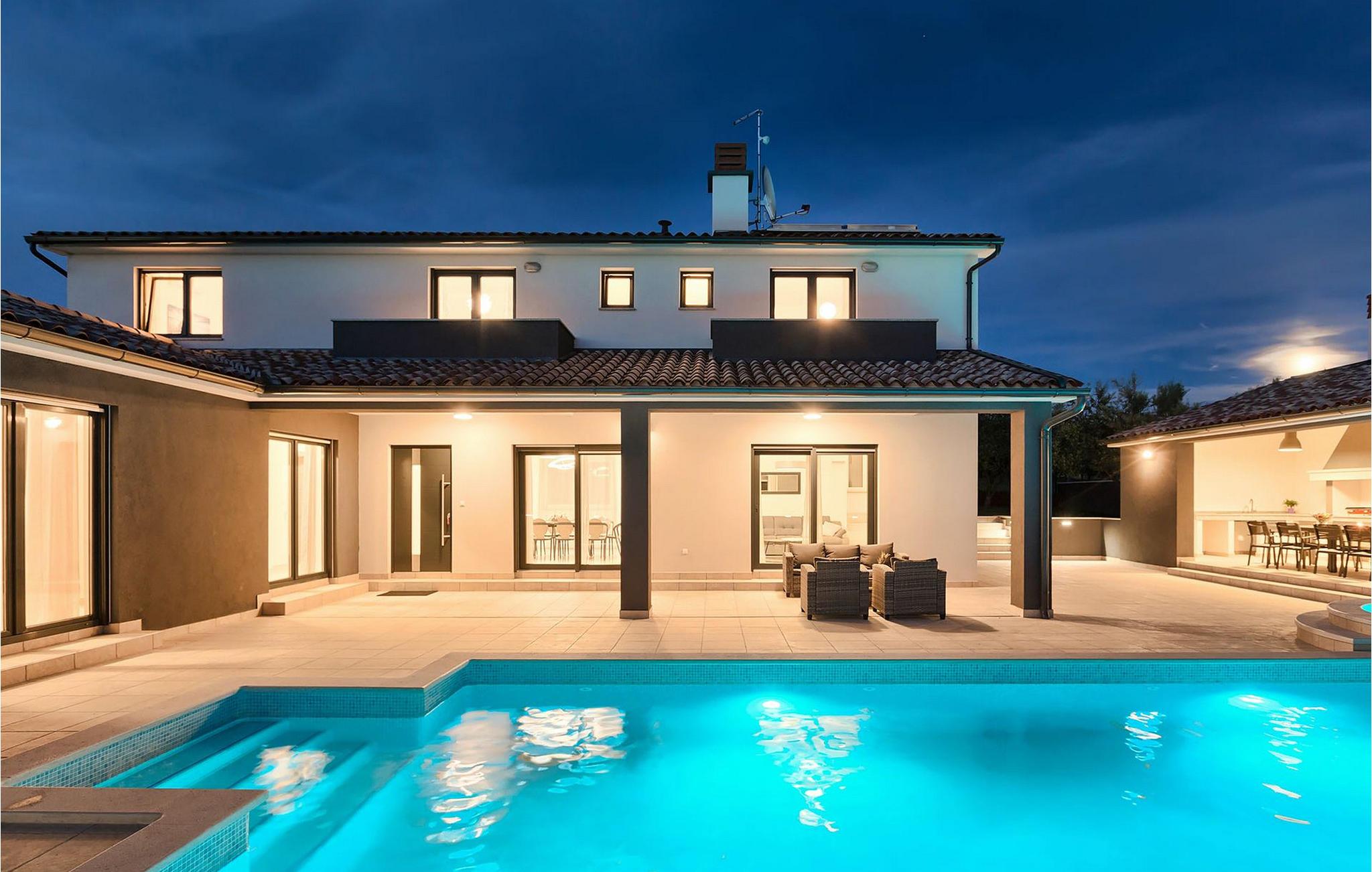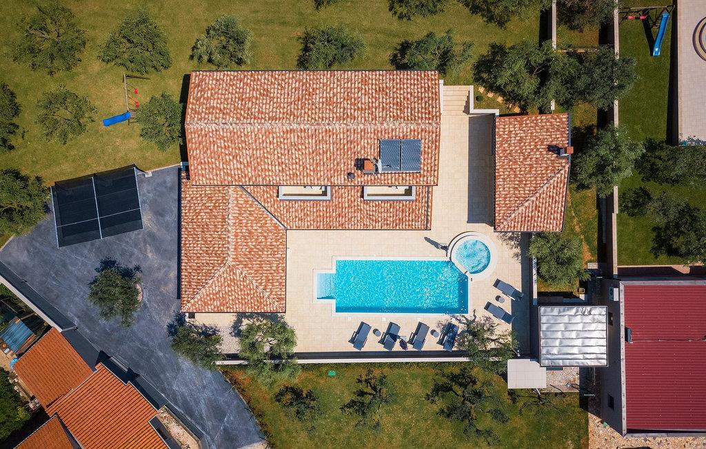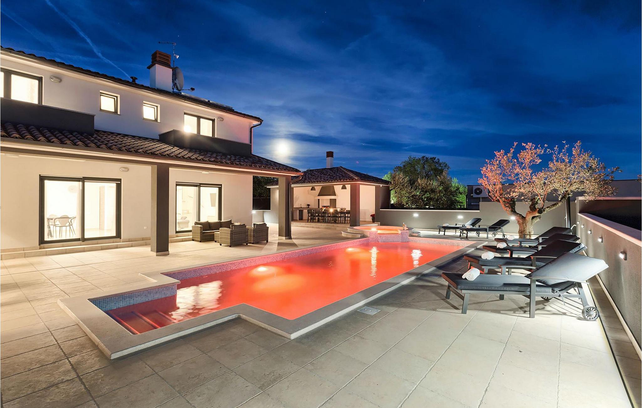 Det er beliggende på et ret rummeligt stykke jord - omkring 1600 m2, med en stor have, udendørs spiseplads, hydromassage ring og en 60m2 stor pool . Det indendørs område er stort nok til at rumme op til 10 gæster. Det har 5 soveværelser, hver med king-size senge, tv, aircondition og eget badeværelse. Der er også et sjette badeværelse. Opholdsområdet omfatter et fuldt udstyret moderne køkken, en stilfuld spiseplads og komfortabel stue. Det er her sovesofaen til to gæster er placeret. Fra opholdsområdet har du direkte adgang til poolområdet og haven, hvor du kan tilbringe uforglemmelige sommerdage - enten i poolen, mens du køler af, på børnenes legeplads, mens du tilbringer uforglemmelige stunder med dine børn, eller bare i skyggen i udekøkkenet, mens du læser din yndlingssommerroman eller spiser et lækkert måltid. Det er op til dig!