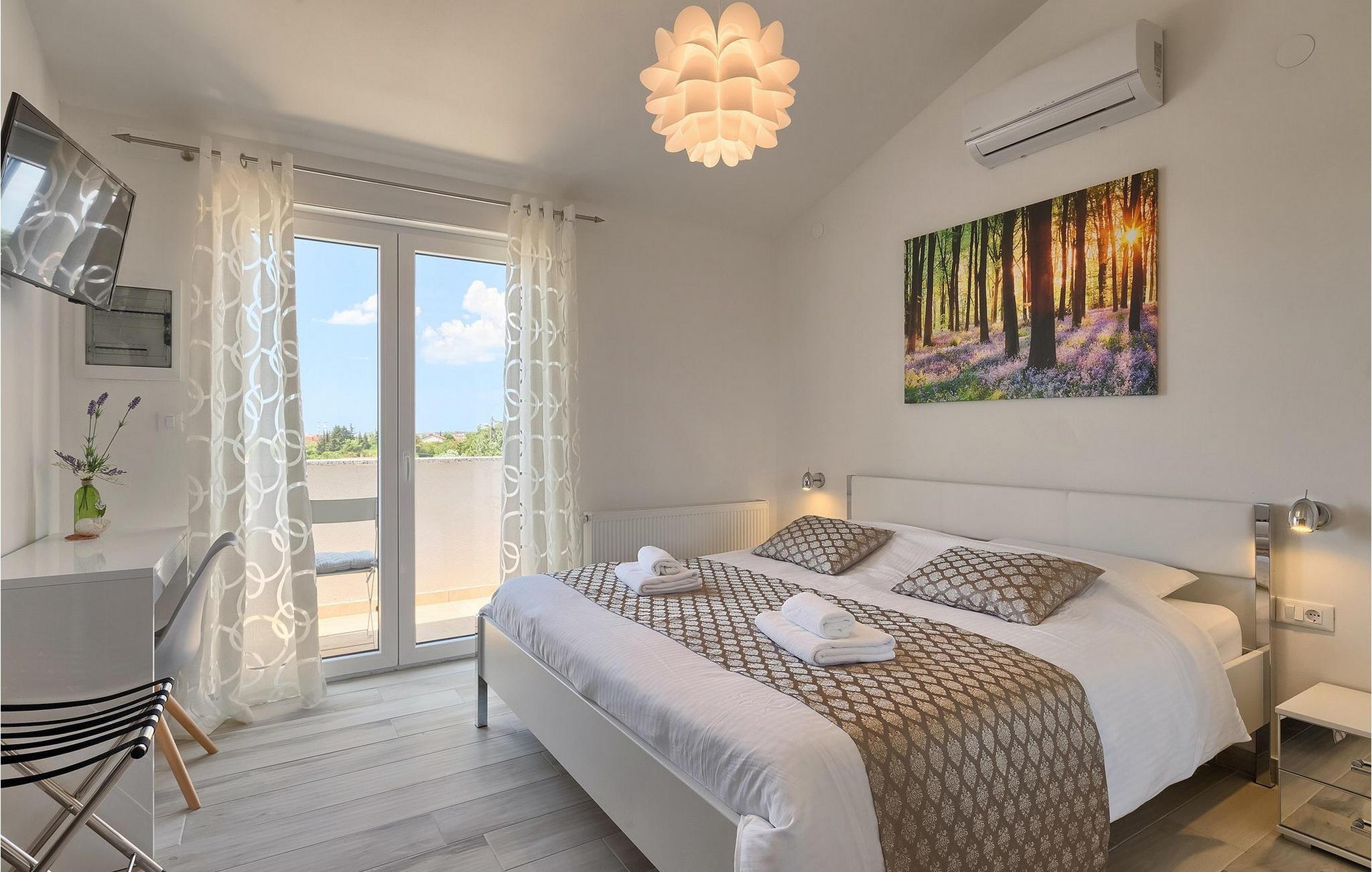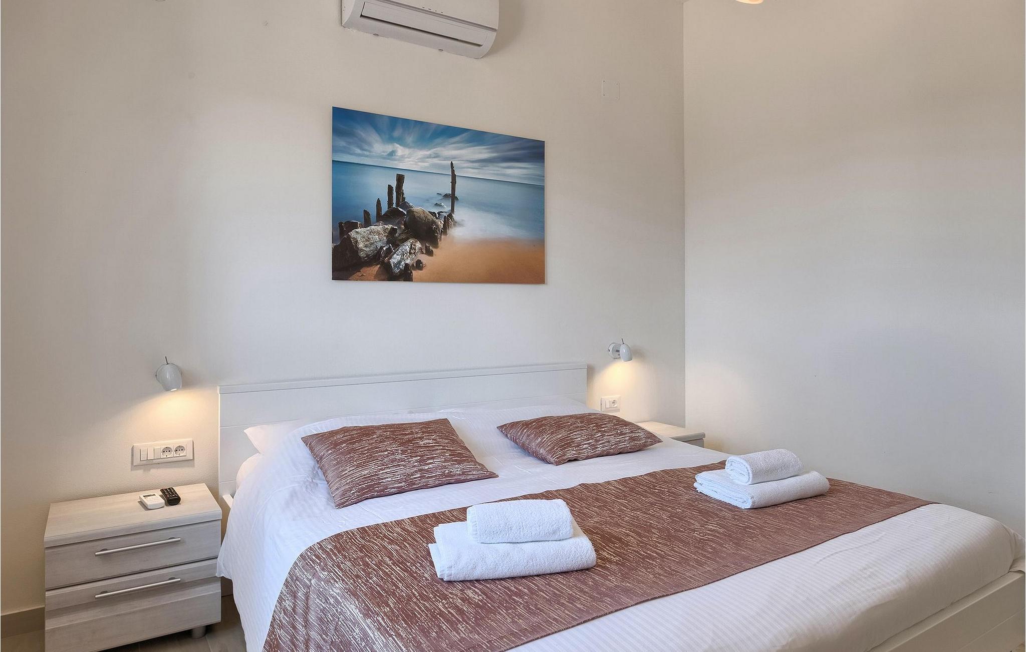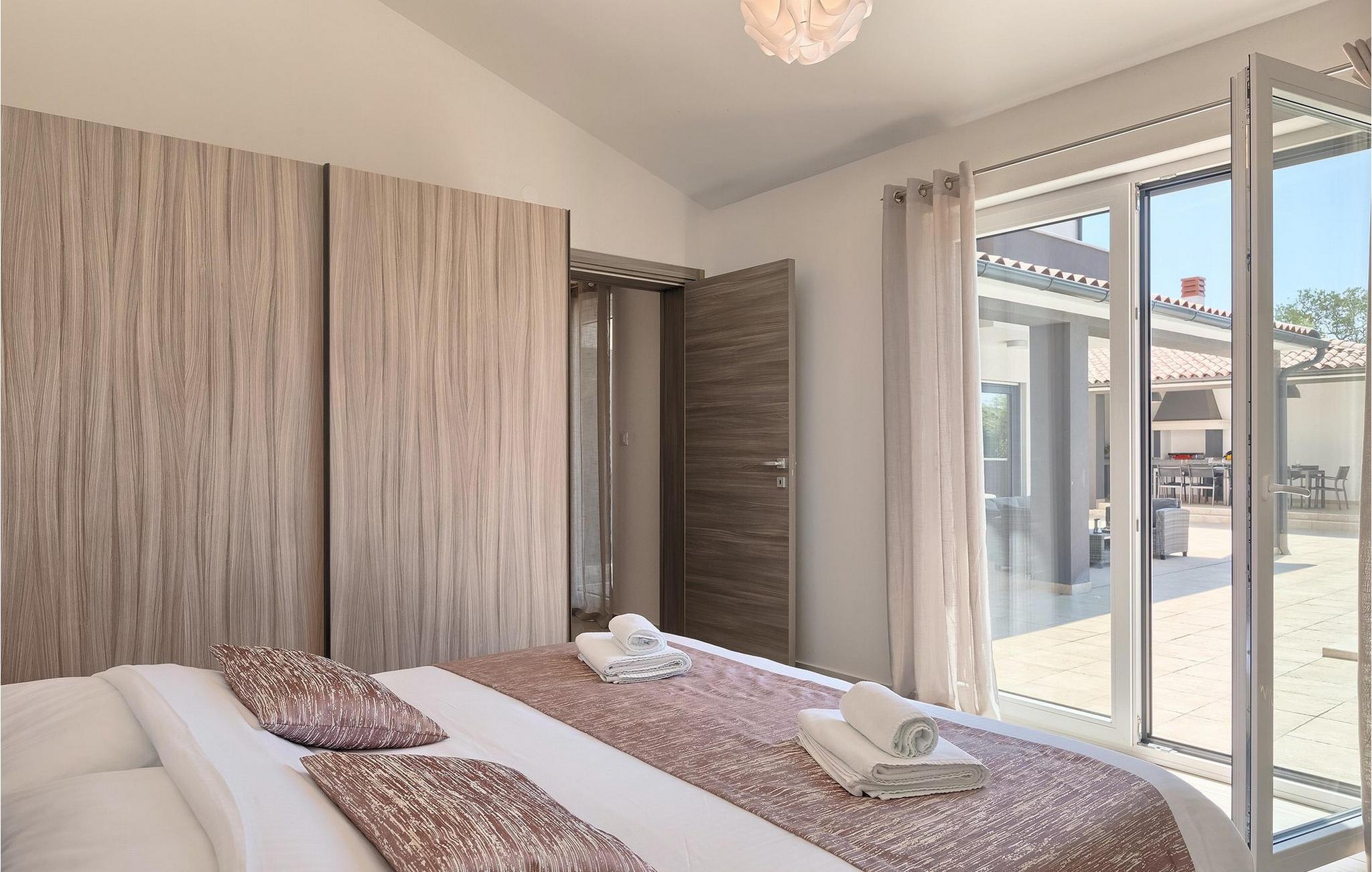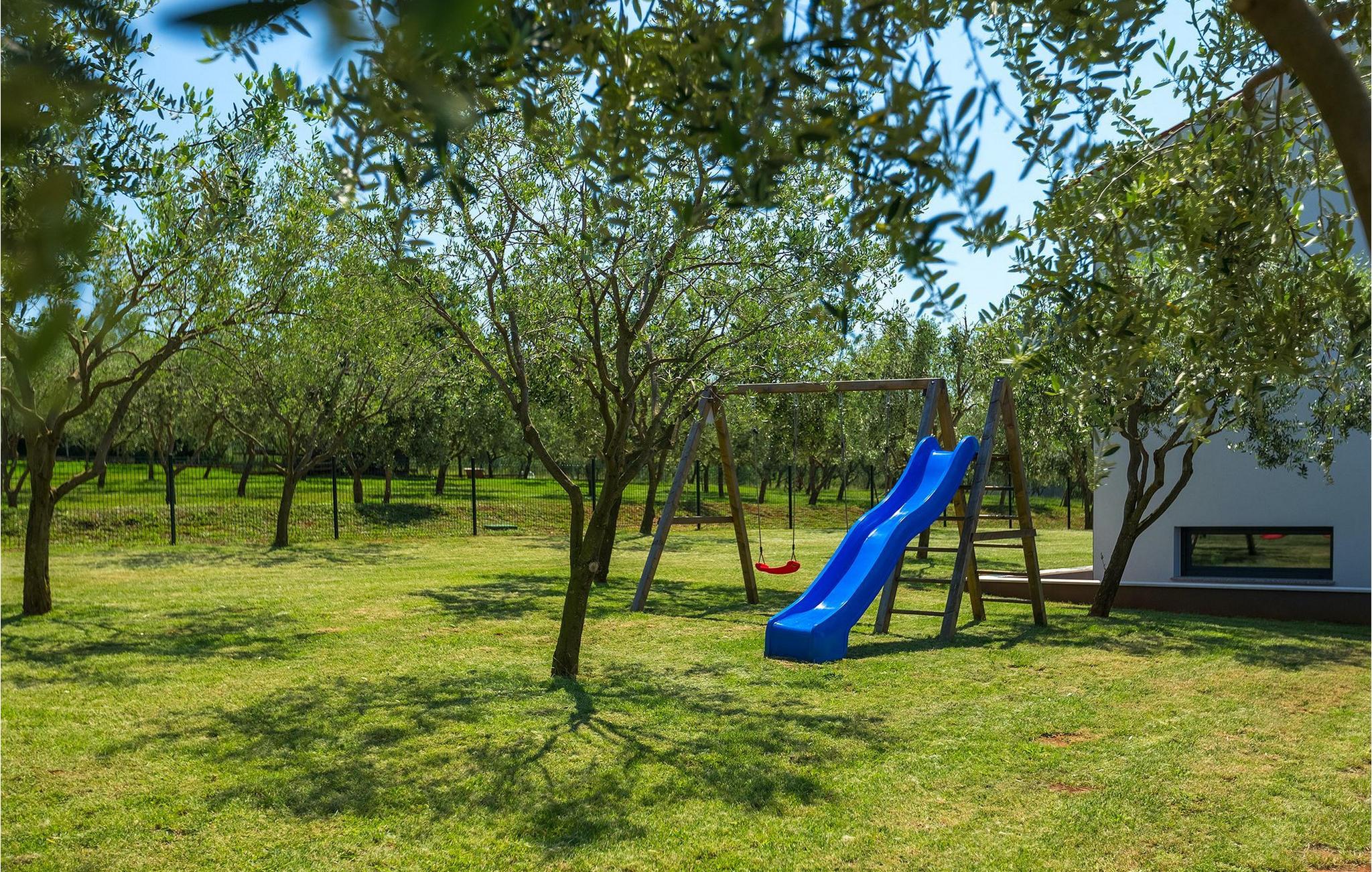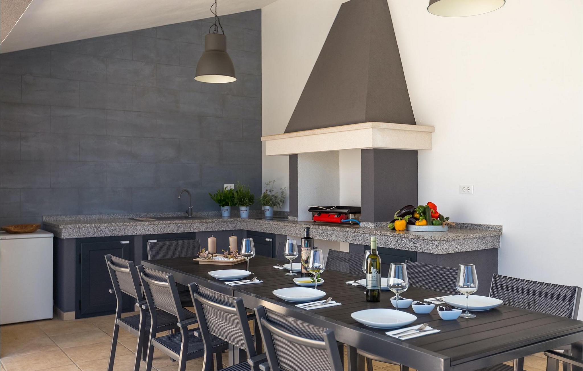 Det er beliggende på et ret rummeligt stykke jord - omkring 1600 m2, med en stor have, udendørs spiseplads, hydromassage ring og en 60m2 stor pool . Det indendørs område er stort nok til at rumme op til 10 gæster. Det har 5 soveværelser, hver med king-size senge, tv, aircondition og eget badeværelse. Der er også et sjette badeværelse. Opholdsområdet omfatter et fuldt udstyret moderne køkken, en stilfuld spiseplads og komfortabel stue. Det er her sovesofaen til to gæster er placeret. Fra opholdsområdet har du direkte adgang til poolområdet og haven, hvor du kan tilbringe uforglemmelige sommerdage - enten i poolen, mens du køler af, på børnenes legeplads, mens du tilbringer uforglemmelige stunder med dine børn, eller bare i skyggen i udekøkkenet, mens du læser din yndlingssommerroman eller spiser et lækkert måltid. Det er op til dig!