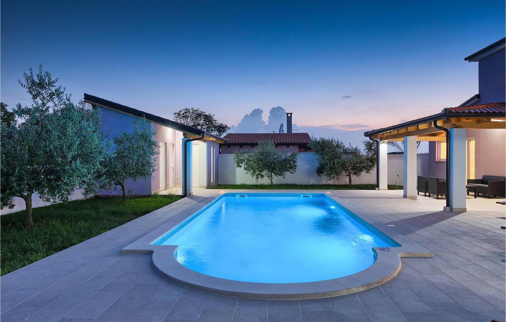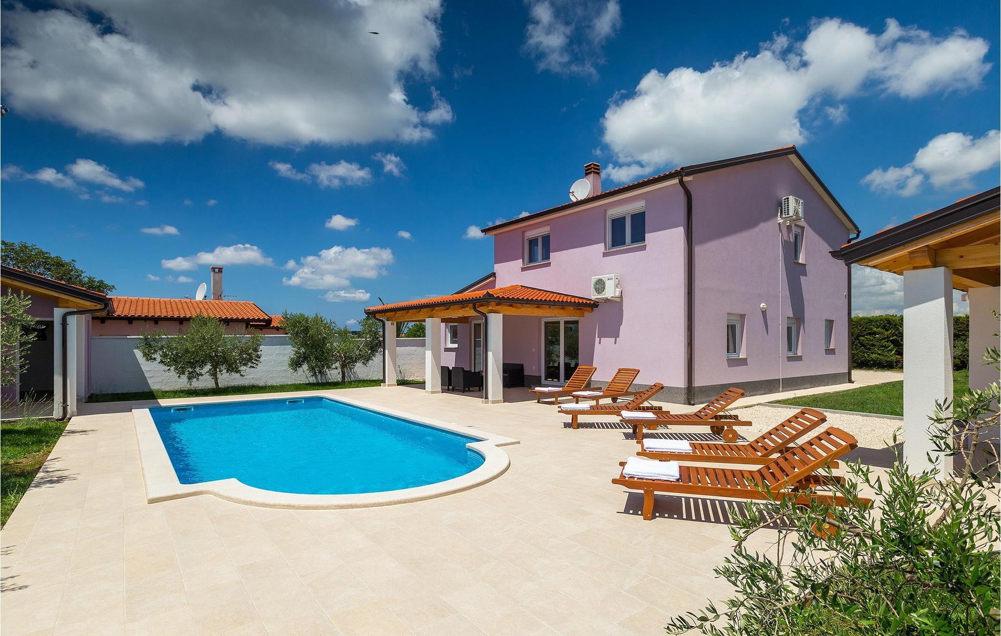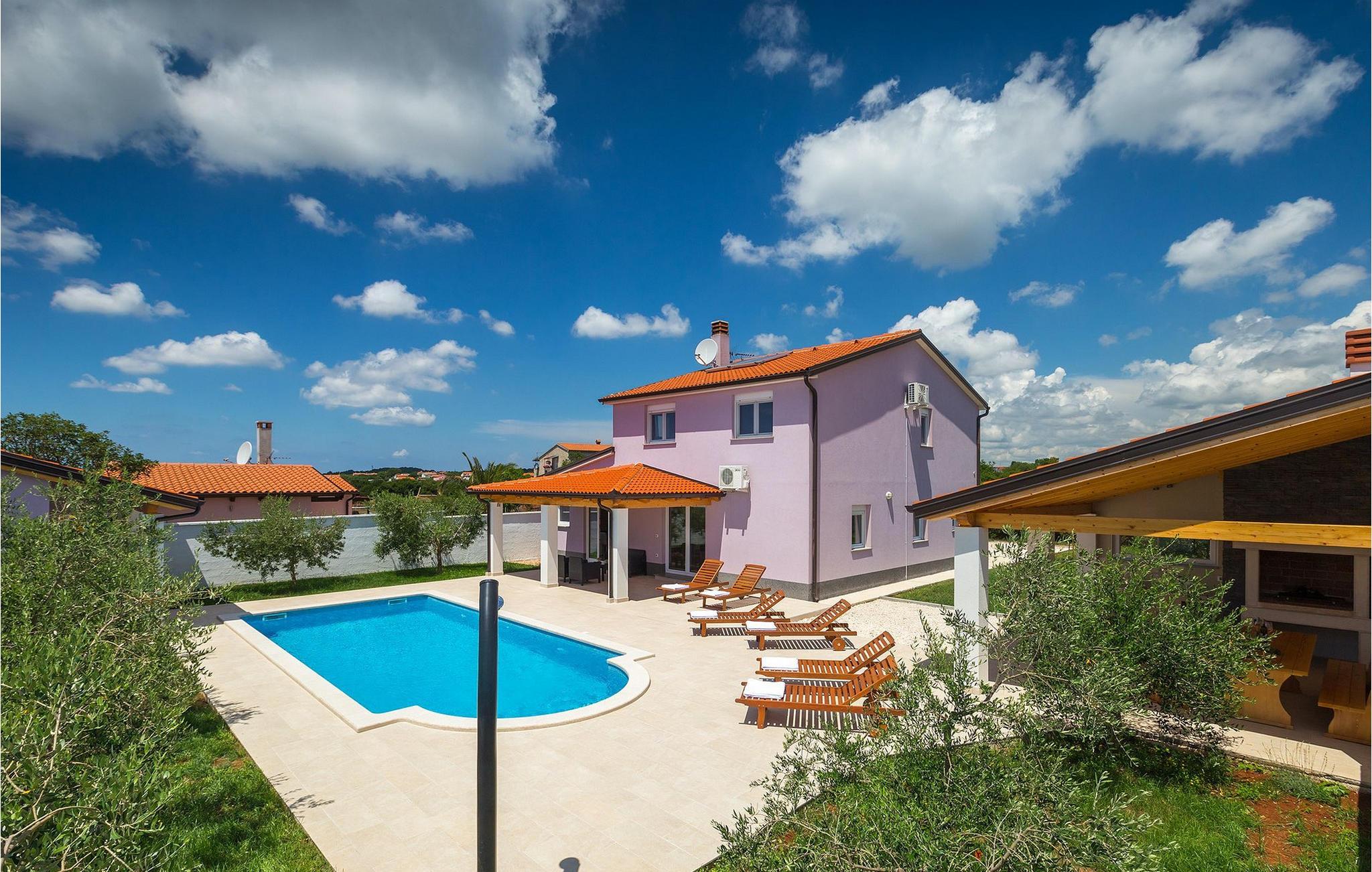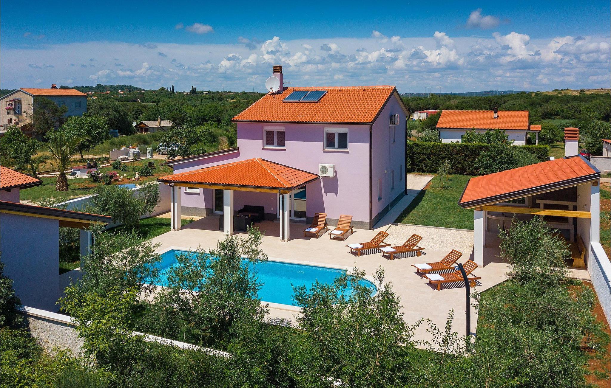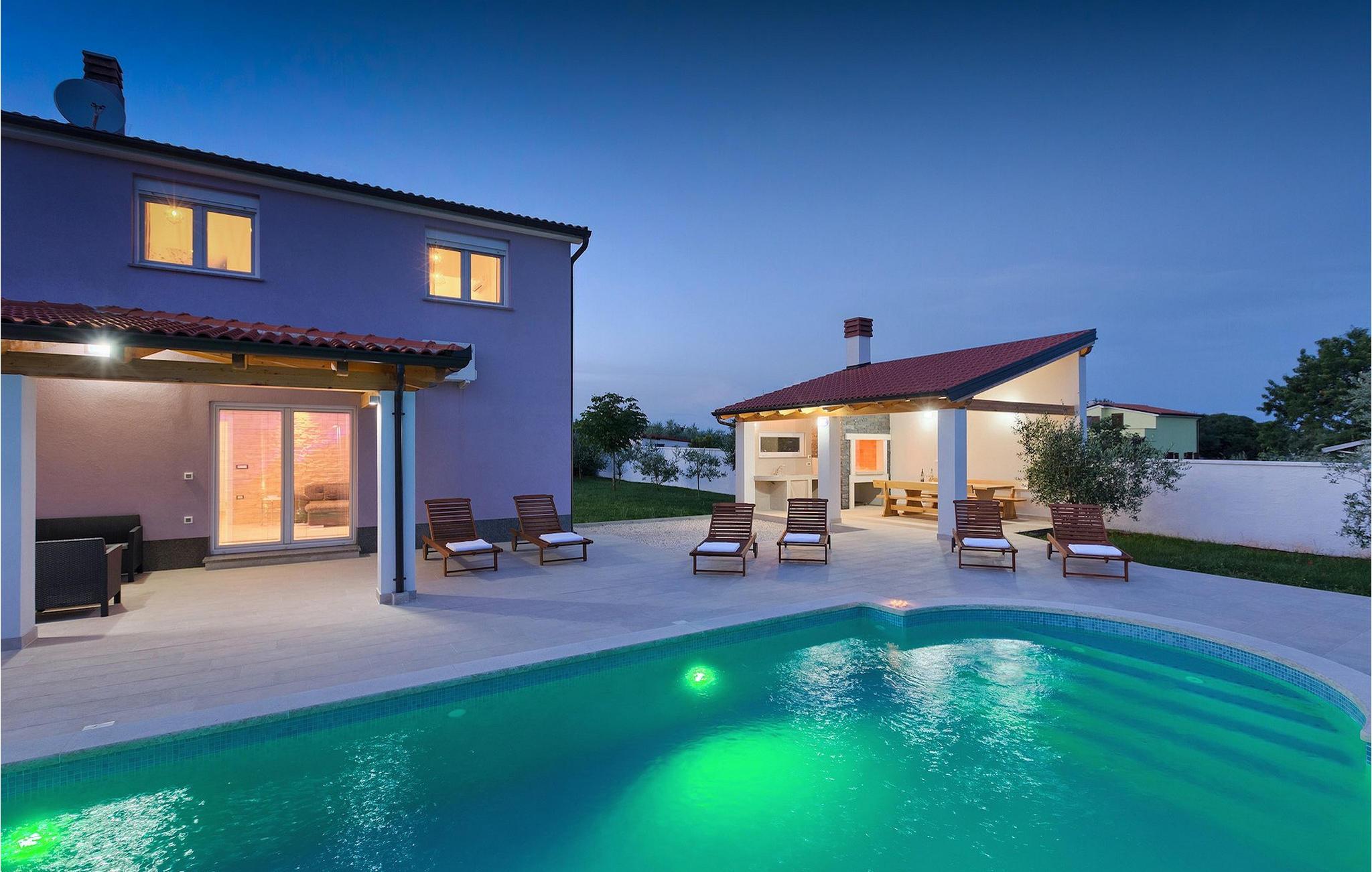 Smuk villa Zeus repræsenterer den perfekte familiebolig i Pula. Det har en dejlig have med oliventræer og er ideelt beliggende - tæt på byen og alle dens faciliteter, og tæt på havet og vidunderlige strande. Villaen består af 4 soveværelser. I stueetagen finder du stue og spisestue, et fuldt udstyret køkken, et soveværelse og et badeværelse. Den øverste etage er opdelt i tre soveværelser, hver med eget badeværelse. Tre soveværelser har en dobbeltseng, mens det ene består af en enkeltseng og en sovesofa til en person. Yderligere sovemuligheder for yderligere to gæster er på den store sovesofa i stuen og på den udtrækbare sofastol i et af værelserne. Villaen har en smuk oplyst privat pool, en overdækket terrasse med spiseplads og et udekøkken. Villaen har aircondition, har Wi-Fi, 5 private parkeringspladser og har en rigtig fordelagtig beliggenhed.