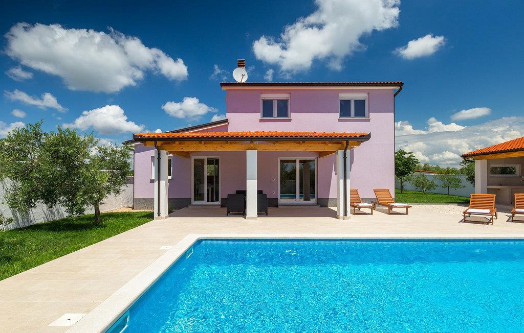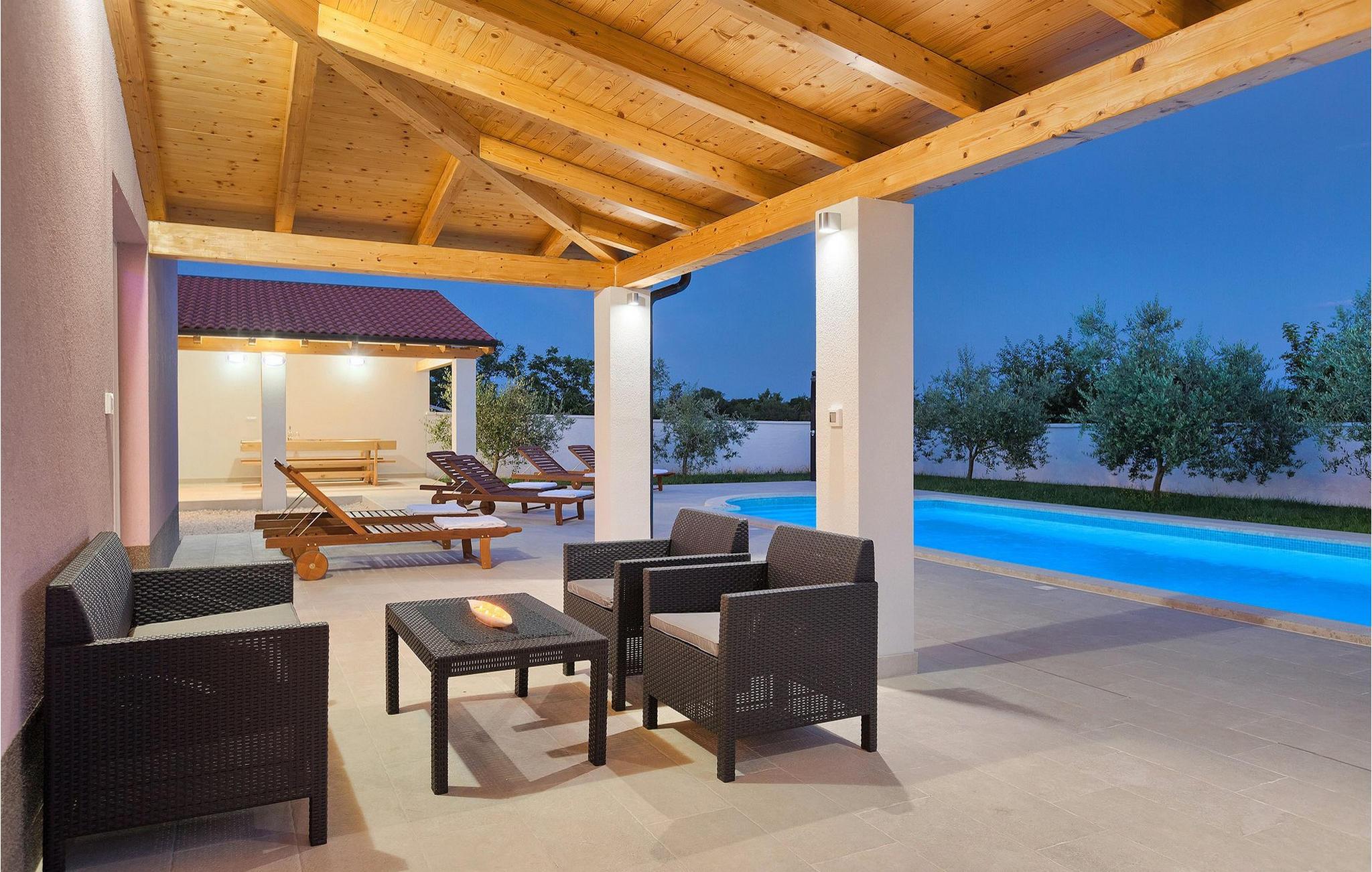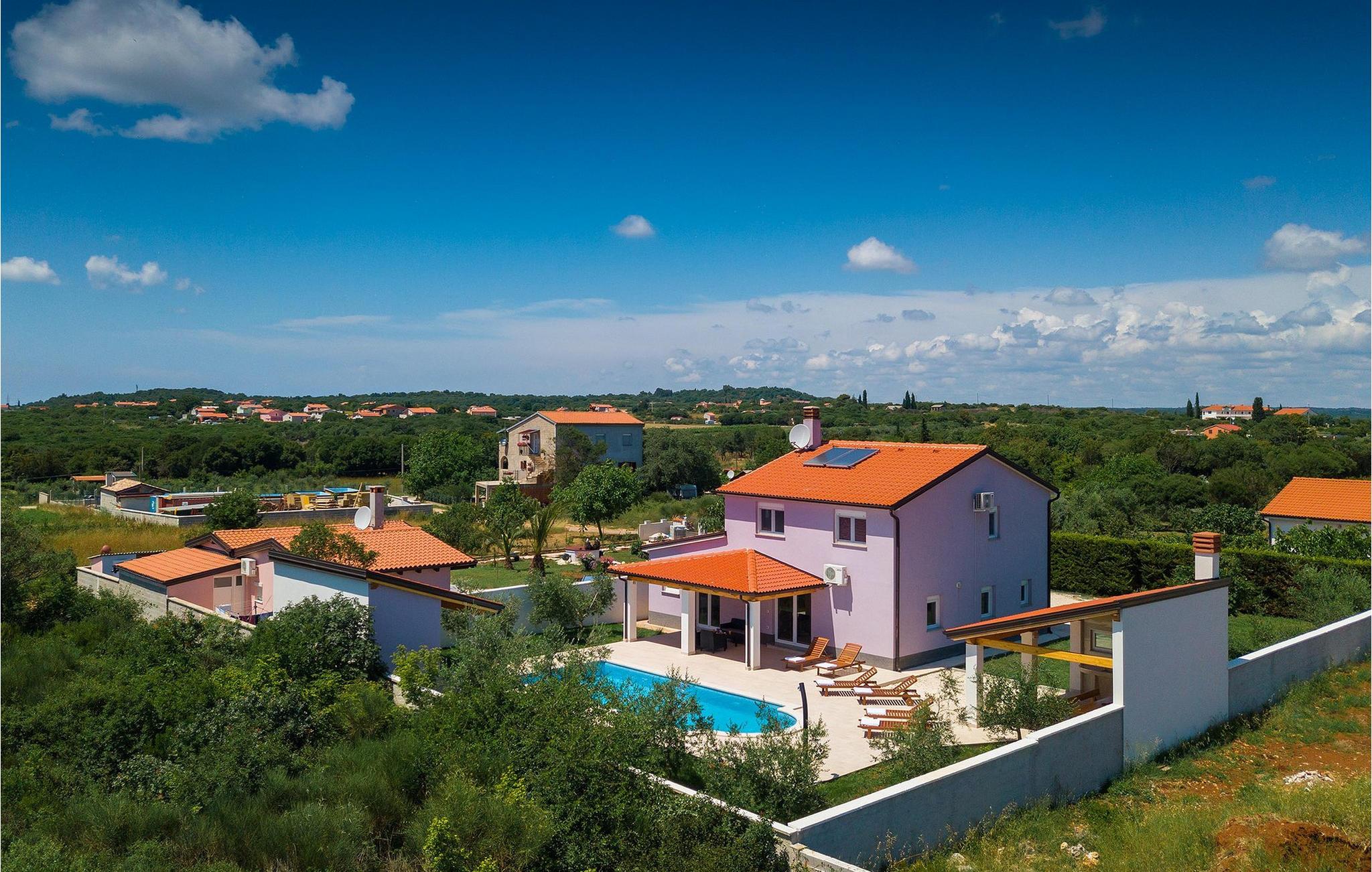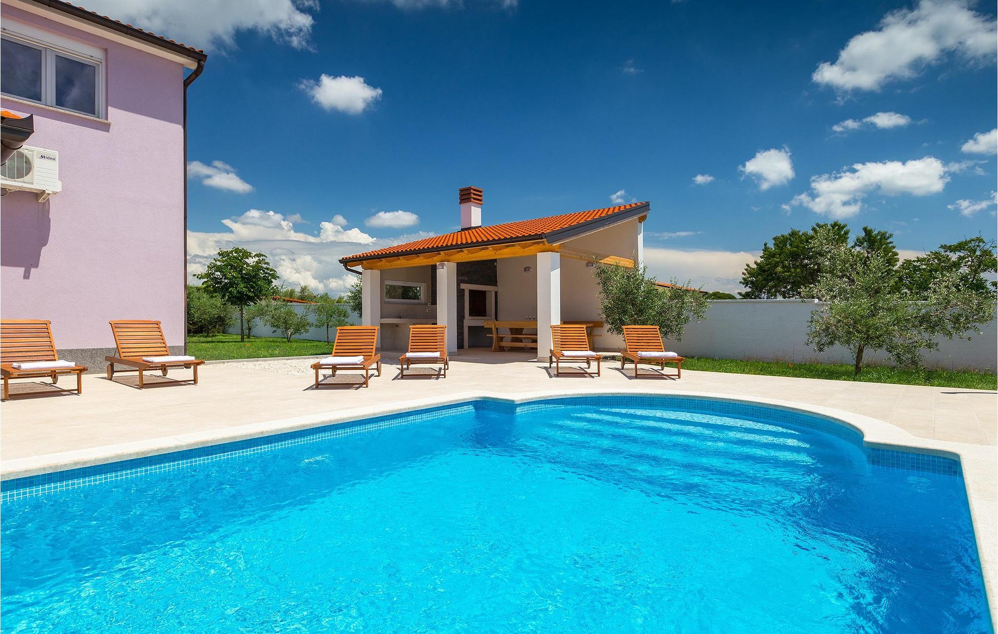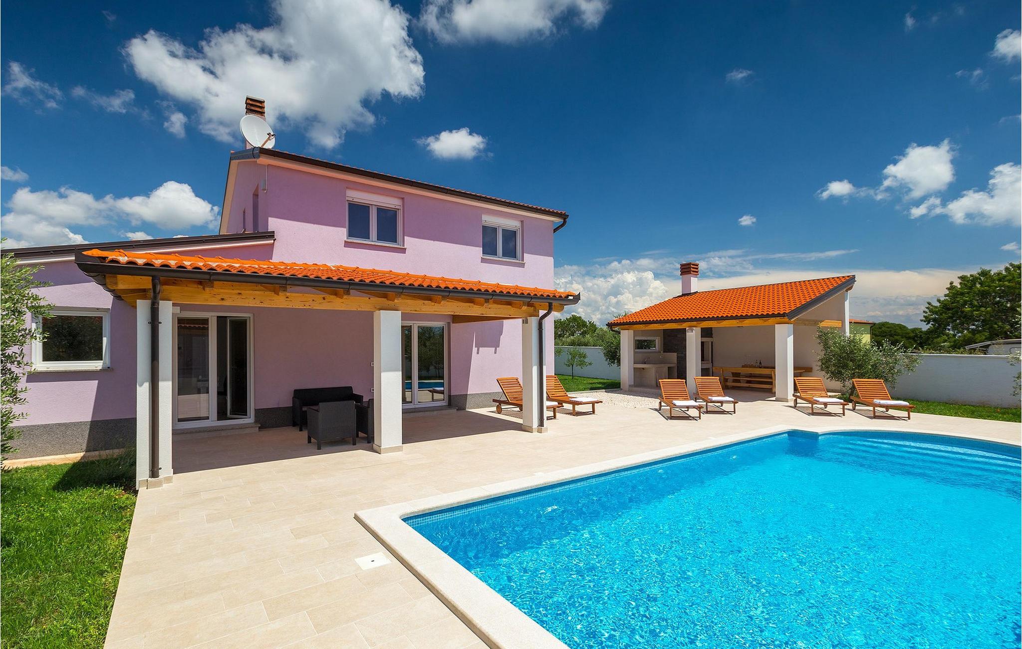 Smuk villa Zeus repræsenterer den perfekte familiebolig i Pula. Det har en dejlig have med oliventræer og er ideelt beliggende - tæt på byen og alle dens faciliteter, og tæt på havet og vidunderlige strande. Villaen består af 4 soveværelser. I stueetagen finder du stue og spisestue, et fuldt udstyret køkken, et soveværelse og et badeværelse. Den øverste etage er opdelt i tre soveværelser, hver med eget badeværelse. Tre soveværelser har en dobbeltseng, mens det ene består af en enkeltseng og en sovesofa til en person. Yderligere sovemuligheder for yderligere to gæster er på den store sovesofa i stuen og på den udtrækbare sofastol i et af værelserne. Villaen har en smuk oplyst privat pool, en overdækket terrasse med spiseplads og et udekøkken. Villaen har aircondition, har Wi-Fi, 5 private parkeringspladser og har en rigtig fordelagtig beliggenhed.