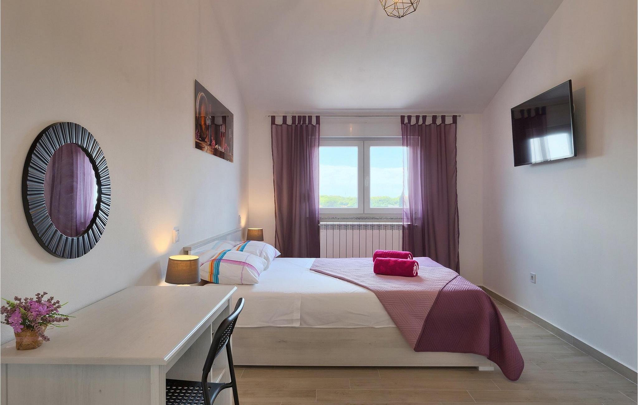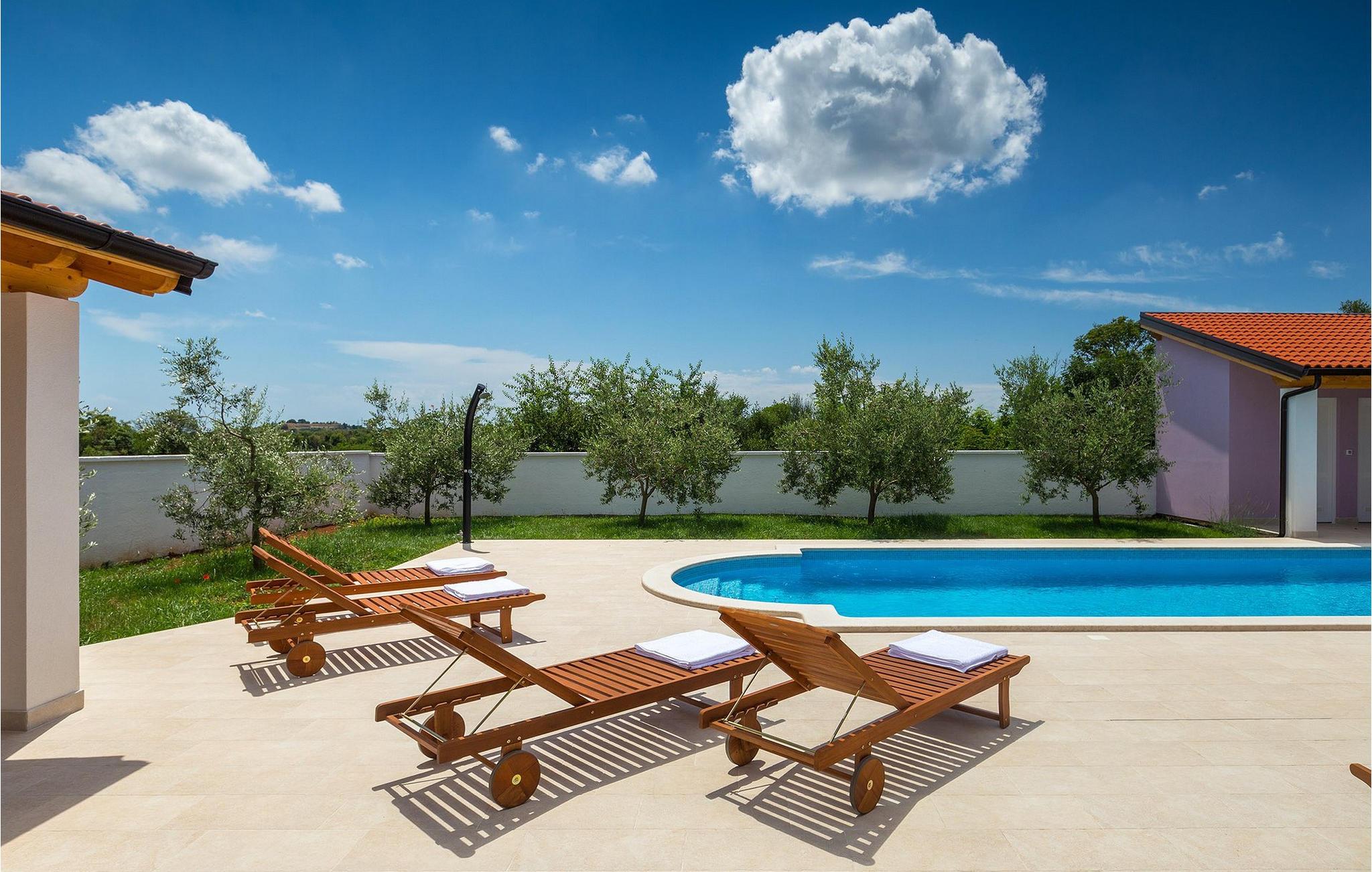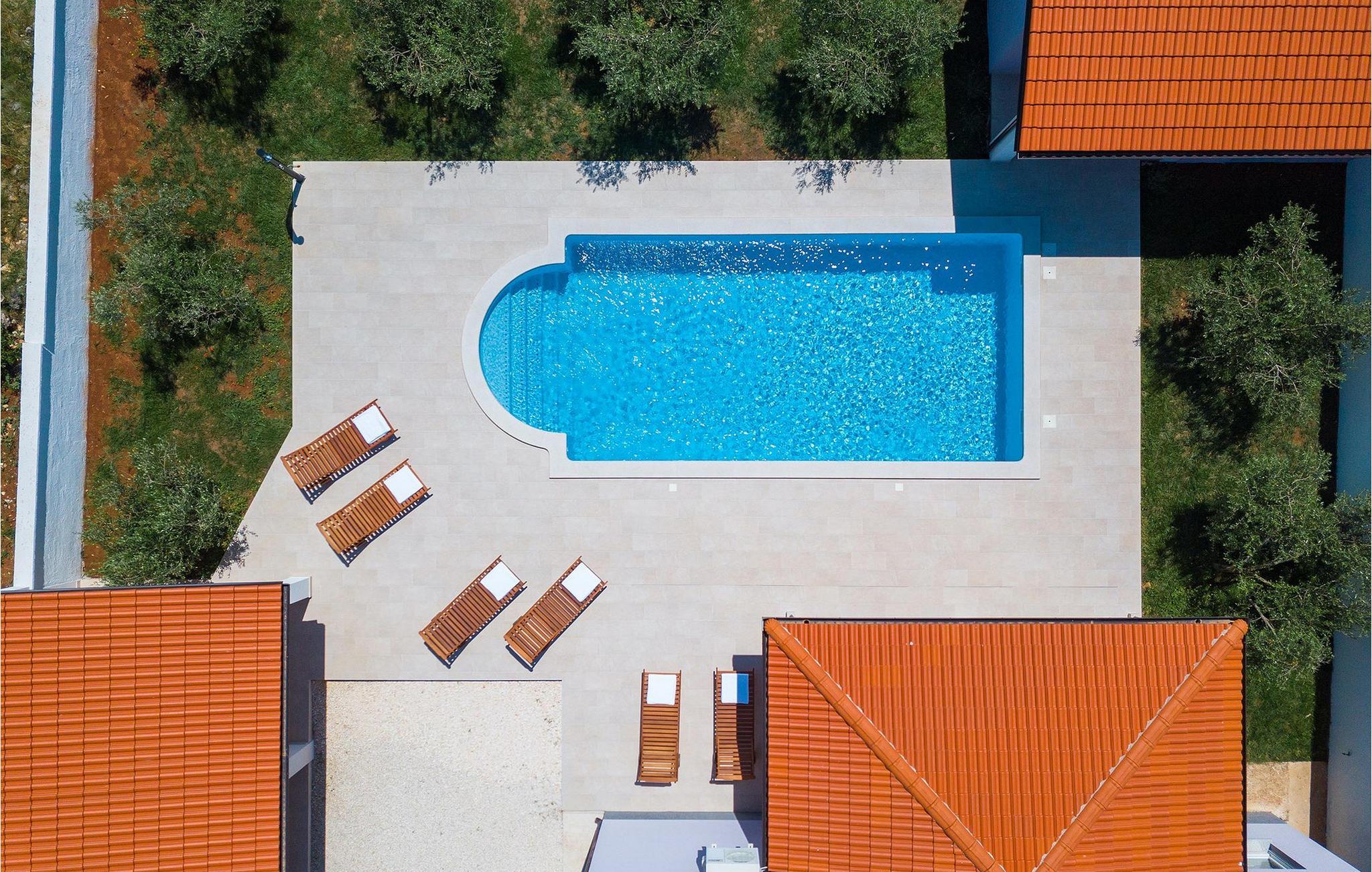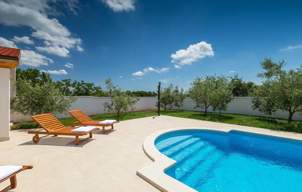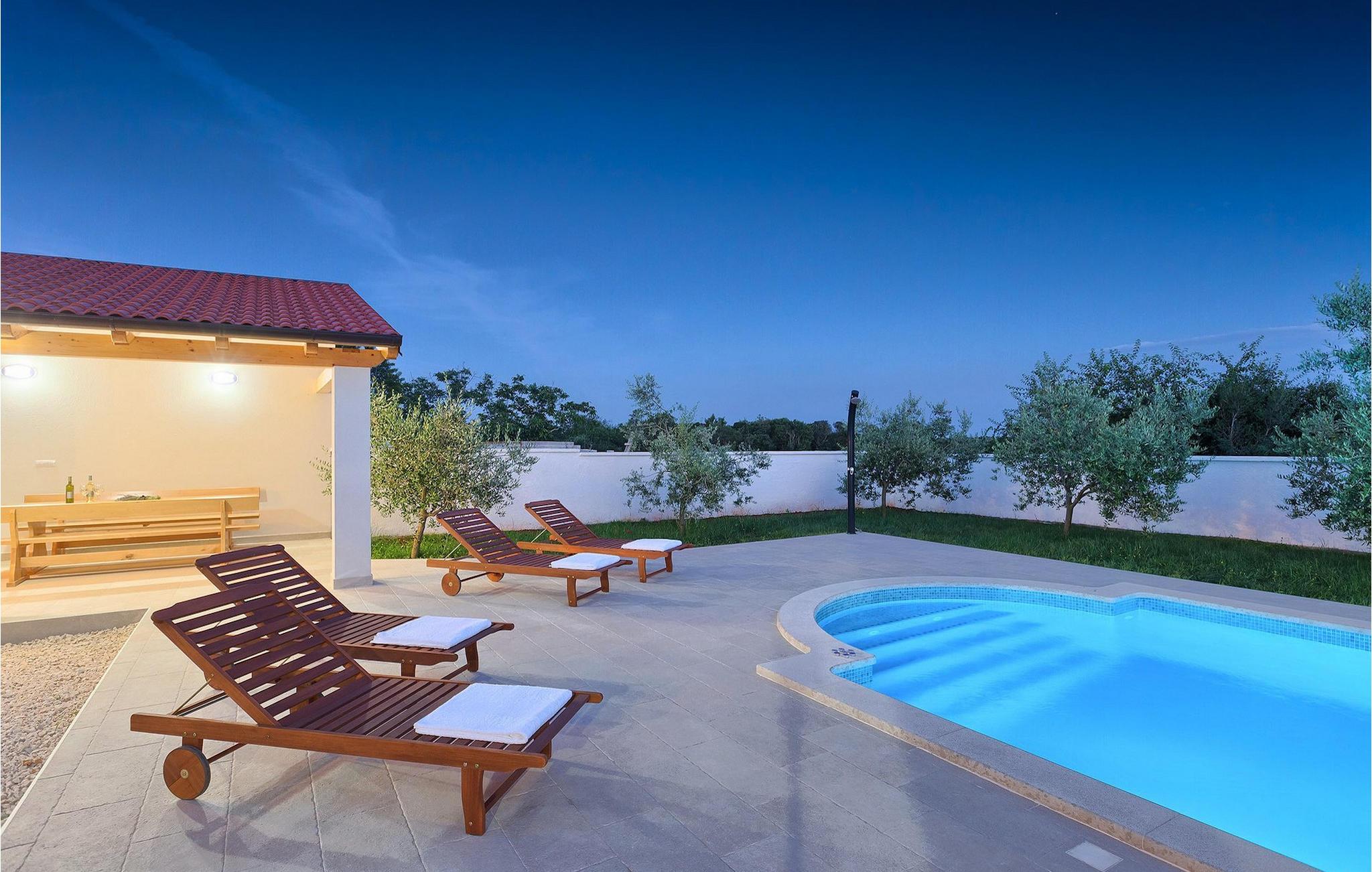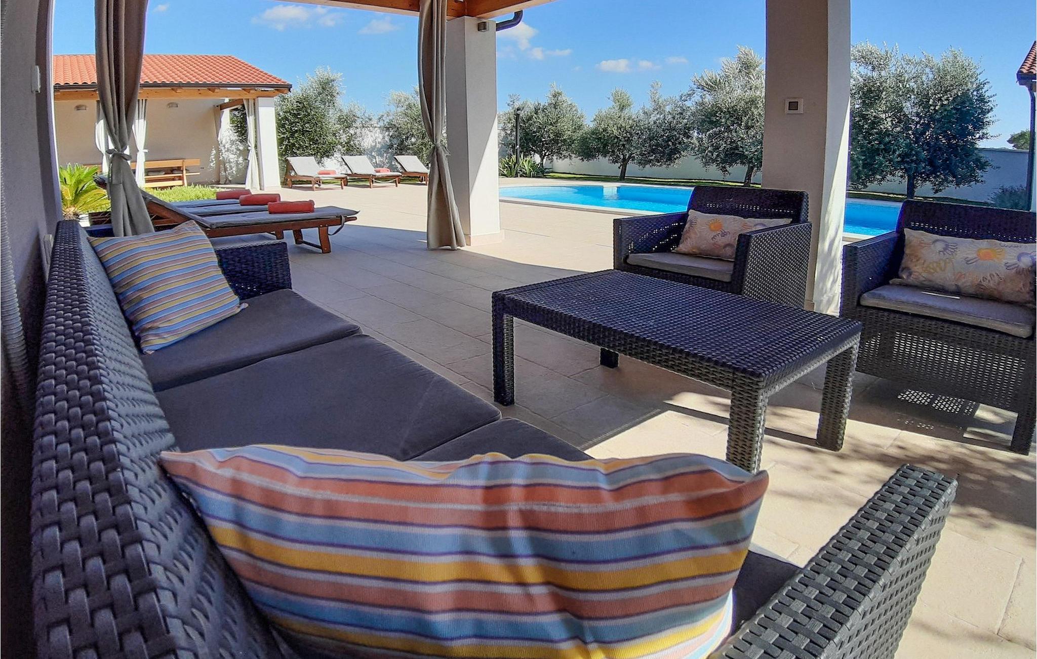 Smuk villa Zeus repræsenterer den perfekte familiebolig i Pula. Det har en dejlig have med oliventræer og er ideelt beliggende - tæt på byen og alle dens faciliteter, og tæt på havet og vidunderlige strande. Villaen består af 4 soveværelser. I stueetagen finder du stue og spisestue, et fuldt udstyret køkken, et soveværelse og et badeværelse. Den øverste etage er opdelt i tre soveværelser, hver med eget badeværelse. Tre soveværelser har en dobbeltseng, mens det ene består af en enkeltseng og en sovesofa til en person. Yderligere sovemuligheder for yderligere to gæster er på den store sovesofa i stuen og på den udtrækbare sofastol i et af værelserne. Villaen har en smuk oplyst privat pool, en overdækket terrasse med spiseplads og et udekøkken. Villaen har aircondition, har Wi-Fi, 5 private parkeringspladser og har en rigtig fordelagtig beliggenhed.