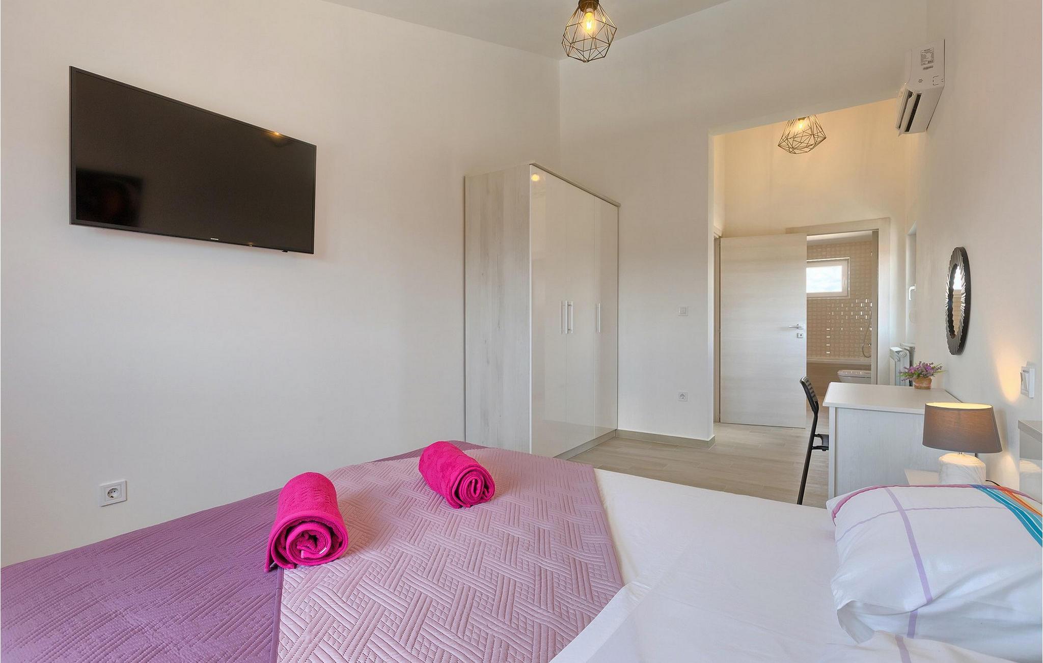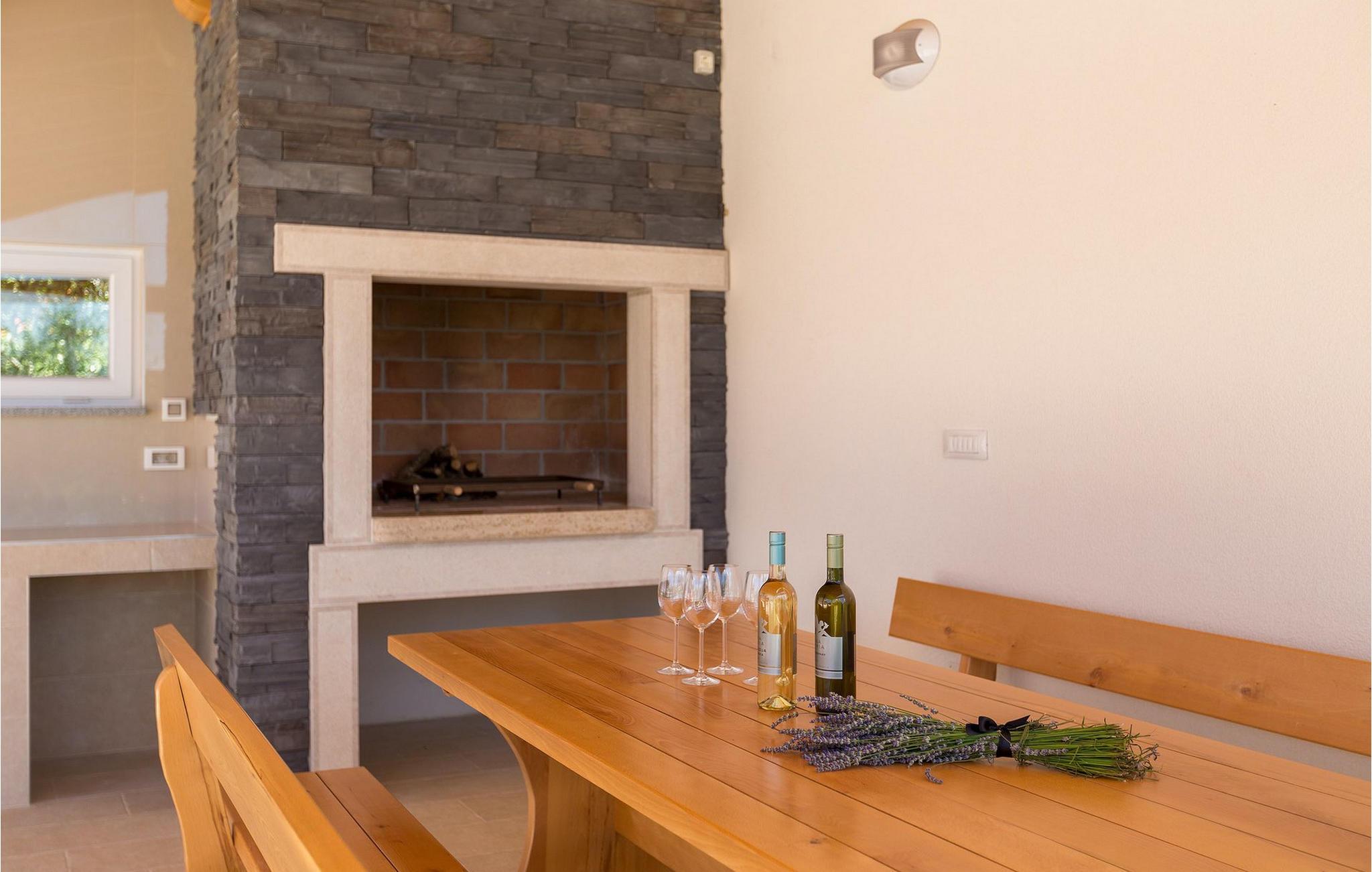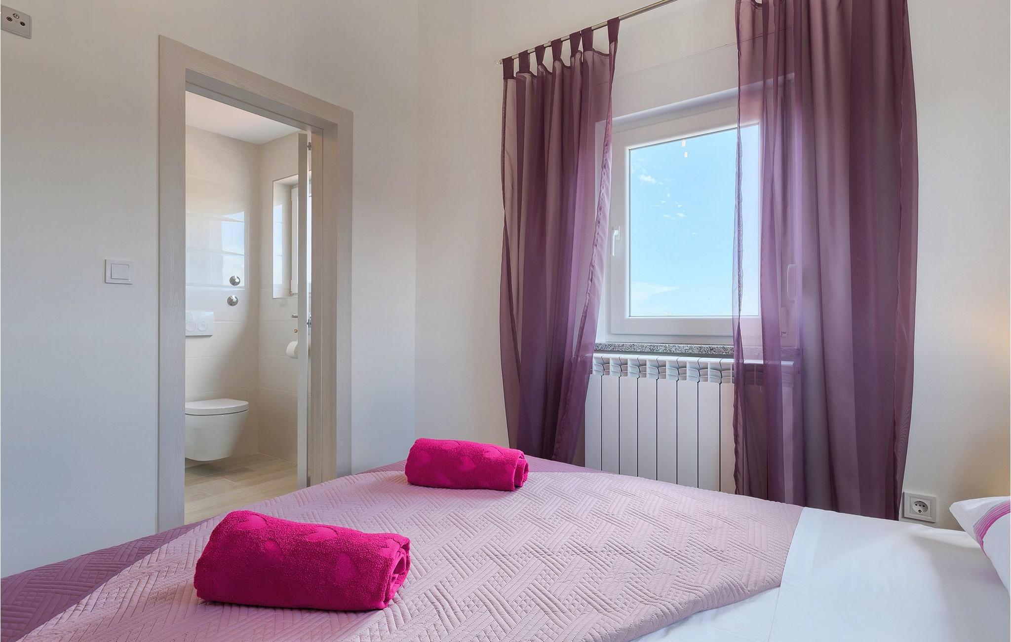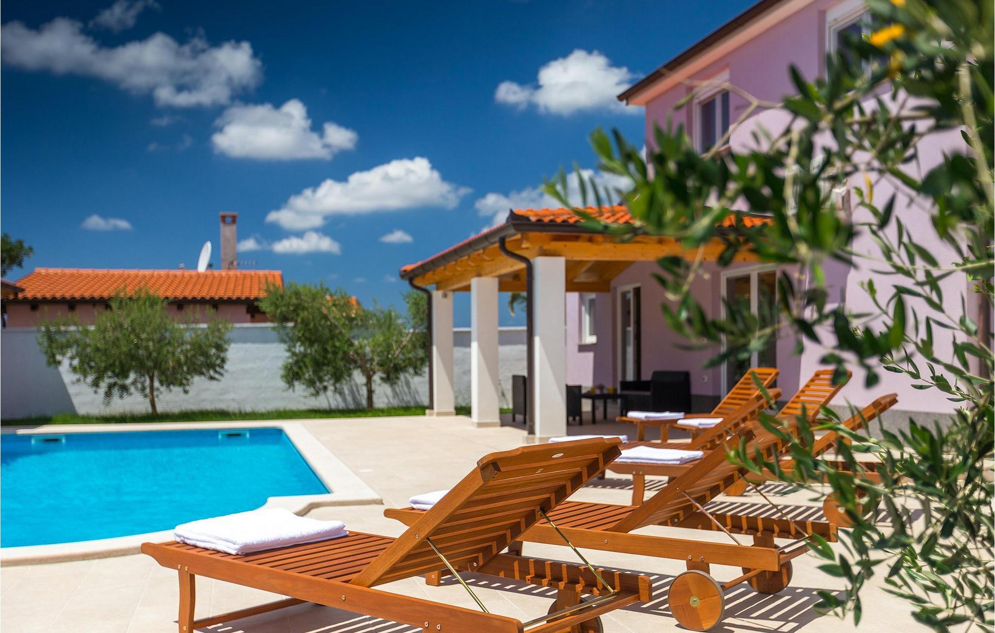 Smuk villa Zeus repræsenterer den perfekte familiebolig i Pula. Det har en dejlig have med oliventræer og er ideelt beliggende - tæt på byen og alle dens faciliteter, og tæt på havet og vidunderlige strande. Villaen består af 4 soveværelser. I stueetagen finder du stue og spisestue, et fuldt udstyret køkken, et soveværelse og et badeværelse. Den øverste etage er opdelt i tre soveværelser, hver med eget badeværelse. Tre soveværelser har en dobbeltseng, mens det ene består af en enkeltseng og en sovesofa til en person. Yderligere sovemuligheder for yderligere to gæster er på den store sovesofa i stuen og på den udtrækbare sofastol i et af værelserne. Villaen har en smuk oplyst privat pool, en overdækket terrasse med spiseplads og et udekøkken. Villaen har aircondition, har Wi-Fi, 5 private parkeringspladser og har en rigtig fordelagtig beliggenhed.