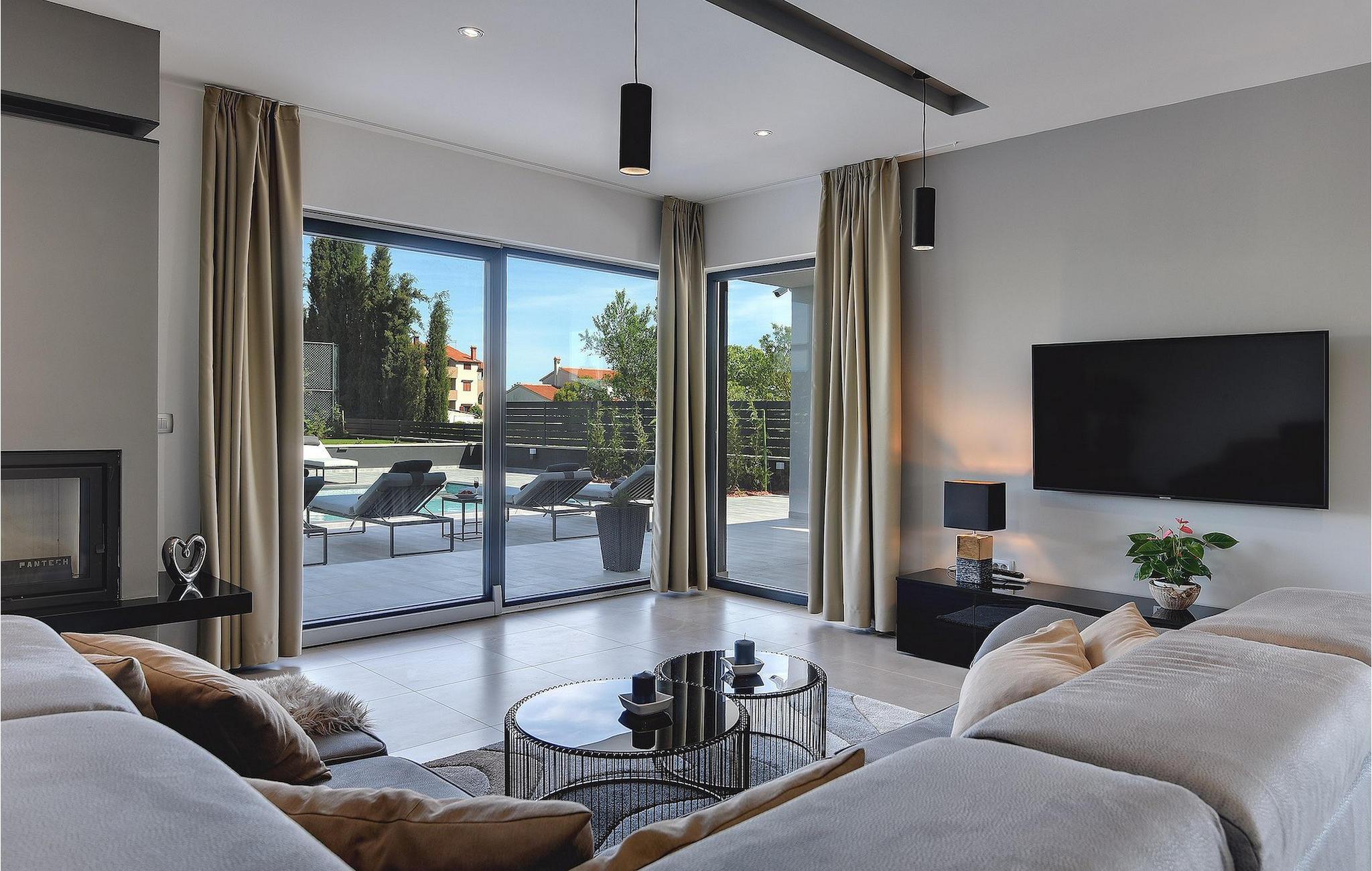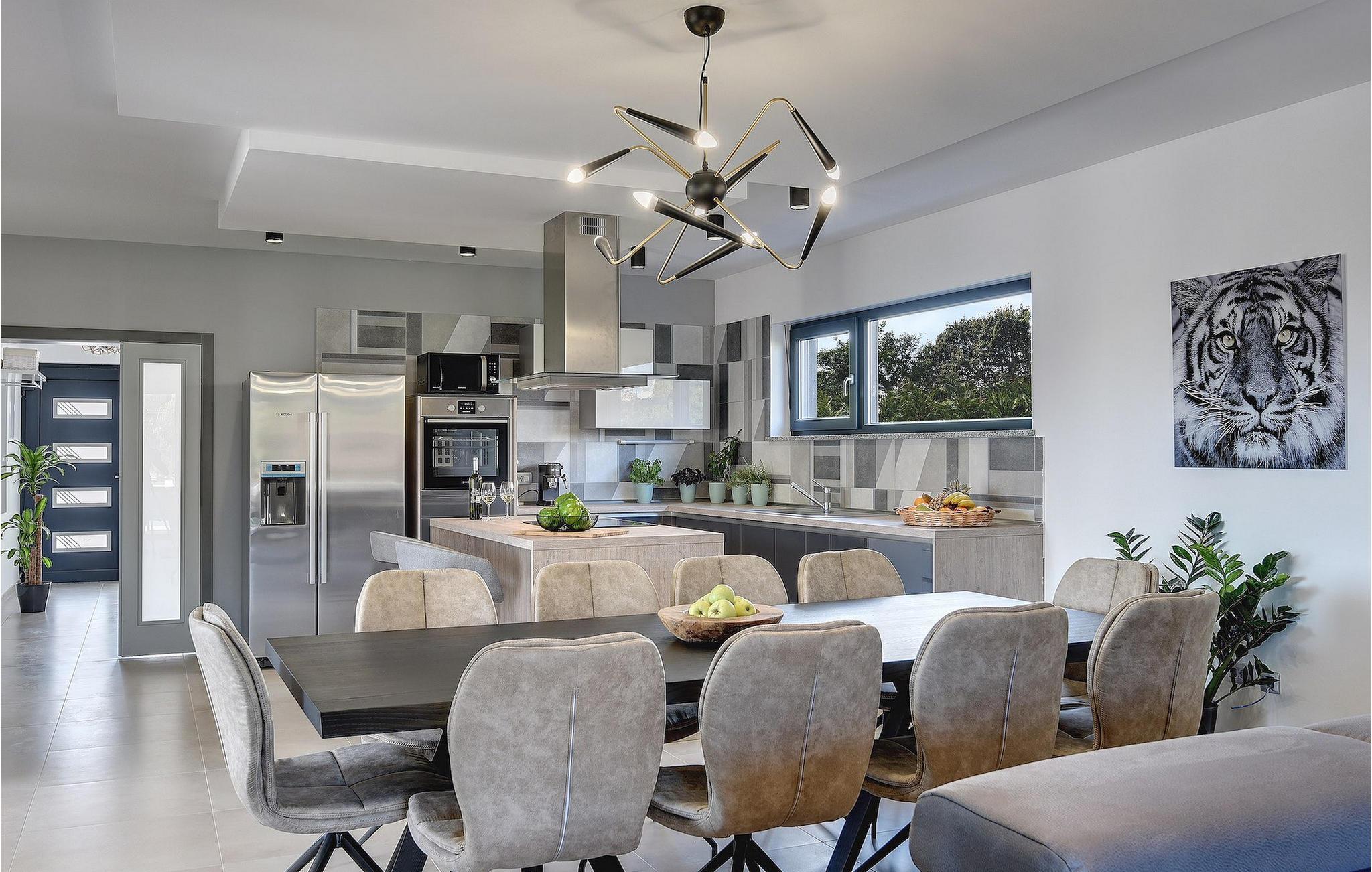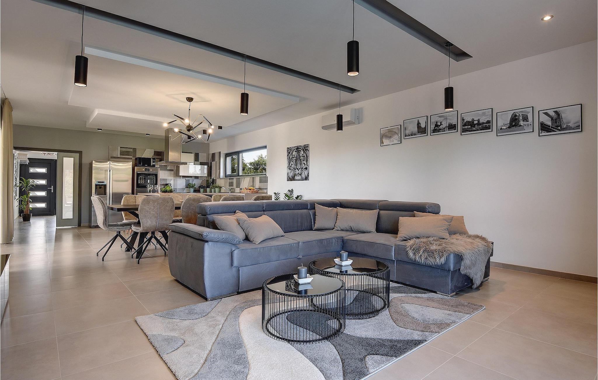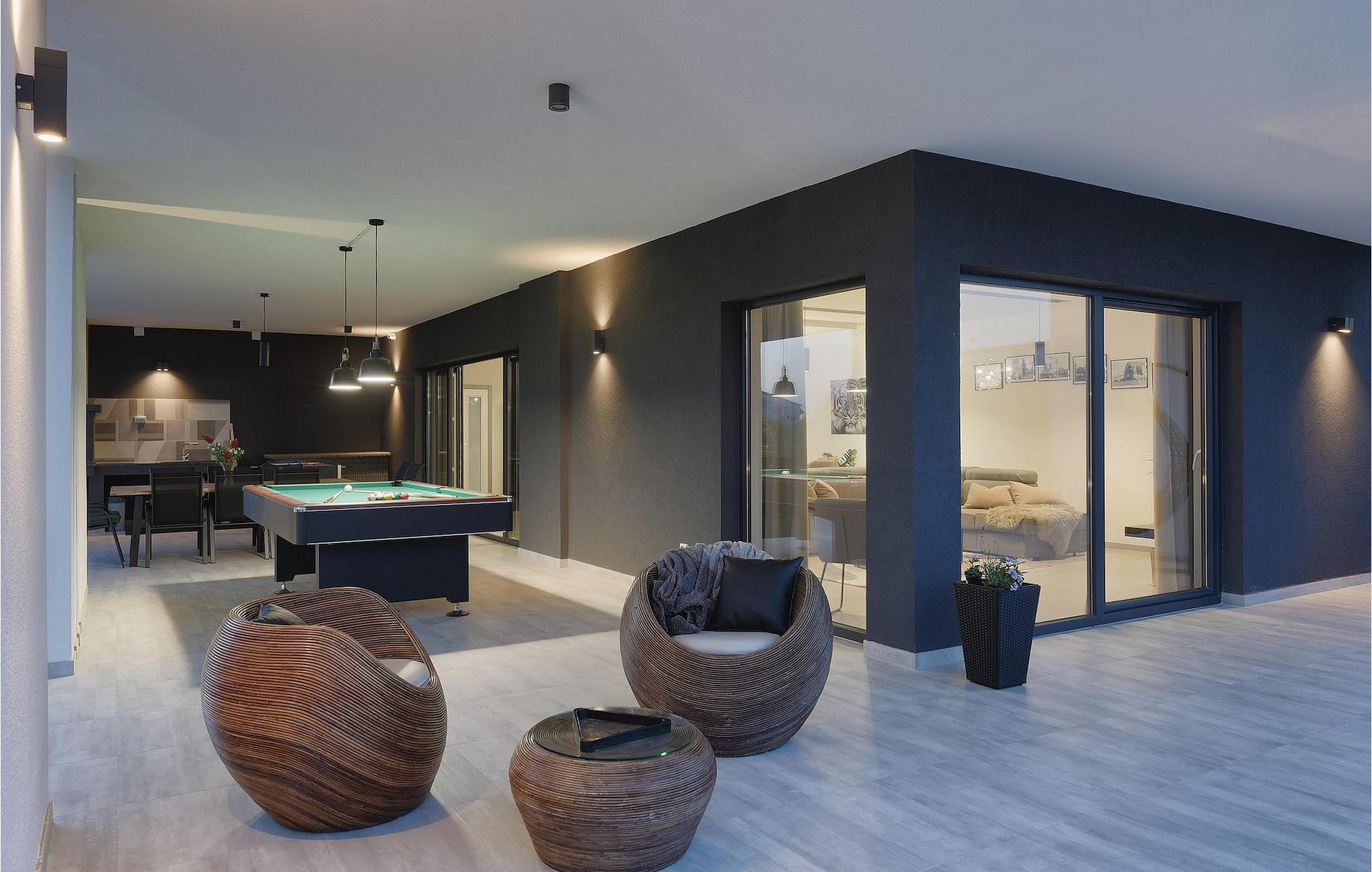 Denne luksuriøse villa vil charmere dig med sit smukke, omhyggeligt gennemtænkte design, indbydende private pool og masser af underholdningsmuligheder samt sin bekvemme beliggenhed lige uden for Pula. Denne spektakulære villa på 410 kvadratmeter giver en stilfuld og moderne ferie, der perfekt kombinerer en aktiv og afslappende ferie. Villaens smagfuldt indrettede interiør består af en elegant åben stueetage med stue/spisestue og køkken, samt et soveværelse med dobbeltseng med eget badeværelse og et gæstetoilet. Fra både opholdsstuen og soveværelset har du direkte adgang til det dejlige udendørsområde og den private pool indrammet af komfortable liggestole. Den overdækkede udendørs spiseplads giver mulighed for al fresco spisning ved siden af, hvor du finder poolbordet og bordfodbolden, komplet med et loungeområde, perfekt til at tage en pause i løbet af dagen eller aftenen.