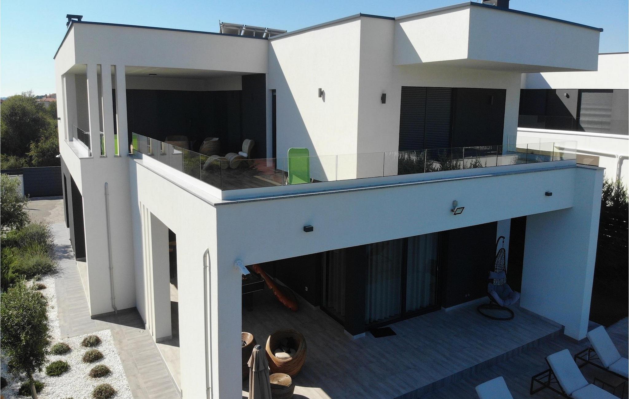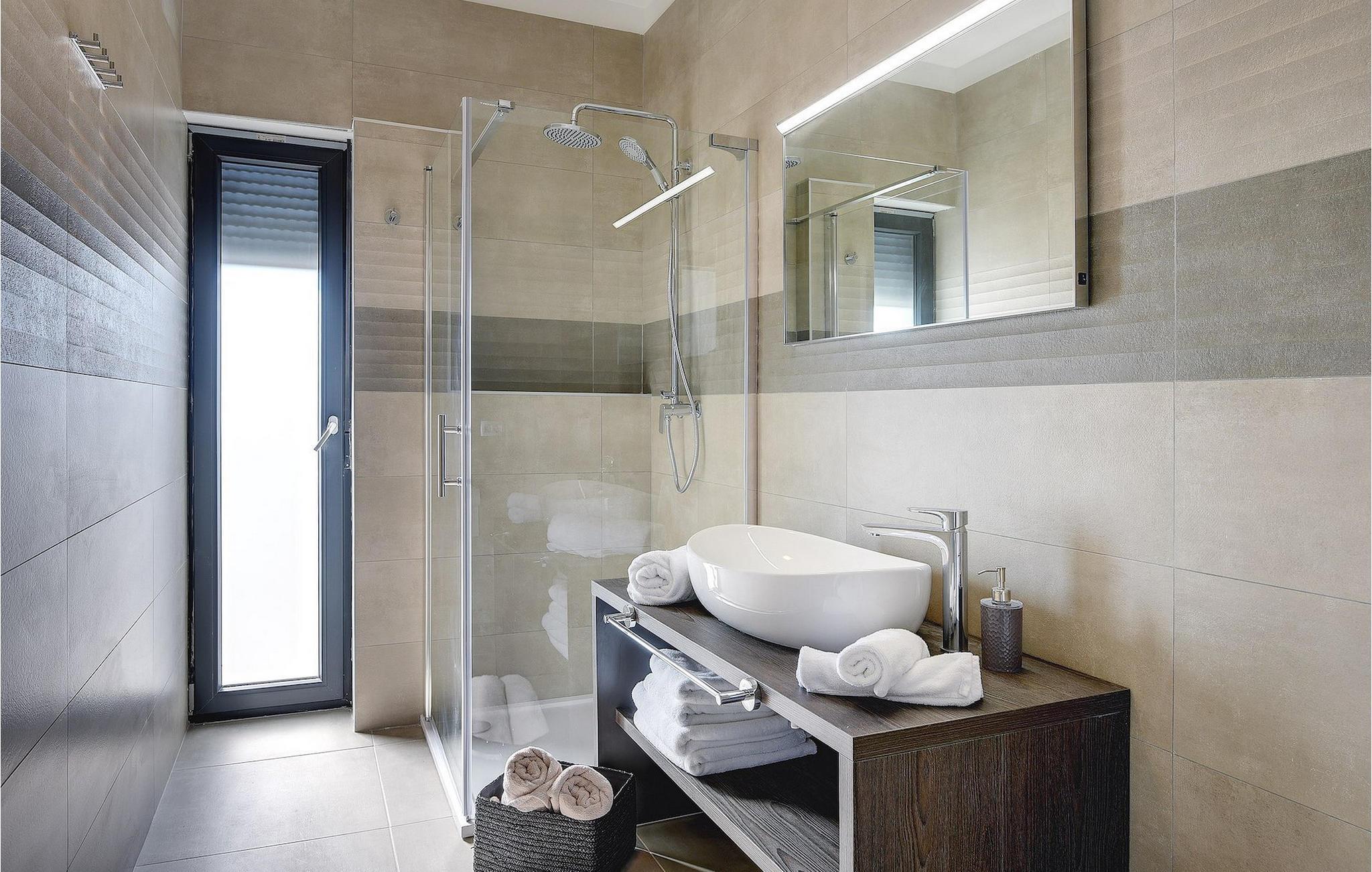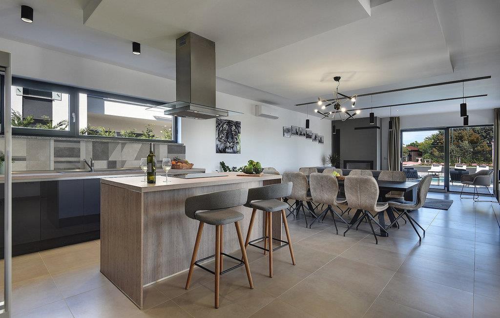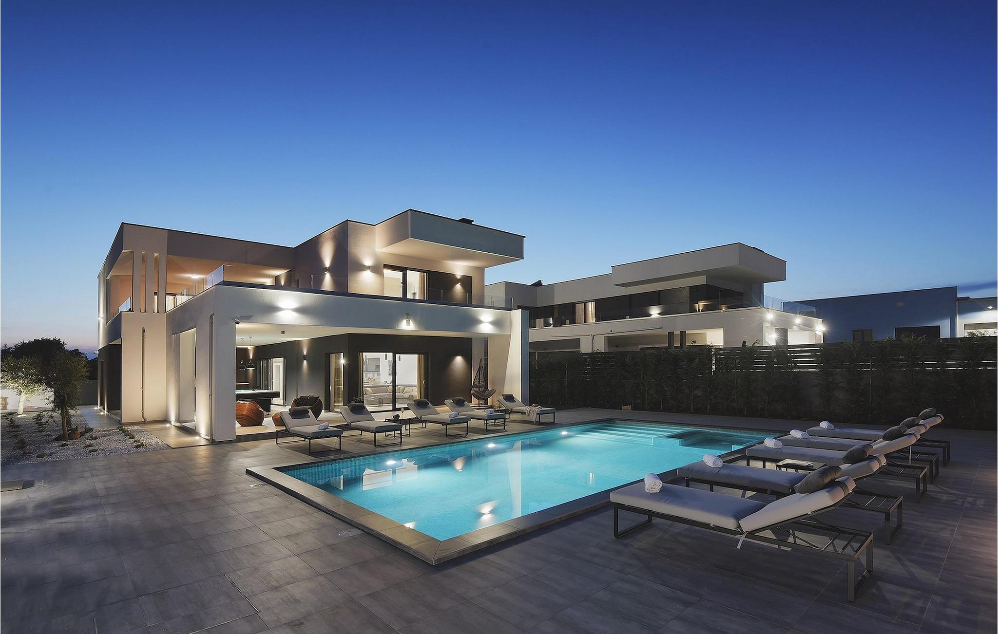 Denne luksuriøse villa vil charmere dig med sit smukke, omhyggeligt gennemtænkte design, indbydende private pool og masser af underholdningsmuligheder samt sin bekvemme beliggenhed lige uden for Pula. Denne spektakulære villa på 410 kvadratmeter giver en stilfuld og moderne ferie, der perfekt kombinerer en aktiv og afslappende ferie. Villaens smagfuldt indrettede interiør består af en elegant åben stueetage med stue/spisestue og køkken, samt et soveværelse med dobbeltseng med eget badeværelse og et gæstetoilet. Fra både opholdsstuen og soveværelset har du direkte adgang til det dejlige udendørsområde og den private pool indrammet af komfortable liggestole. Den overdækkede udendørs spiseplads giver mulighed for al fresco spisning ved siden af, hvor du finder poolbordet og bordfodbolden, komplet med et loungeområde, perfekt til at tage en pause i løbet af dagen eller aftenen.