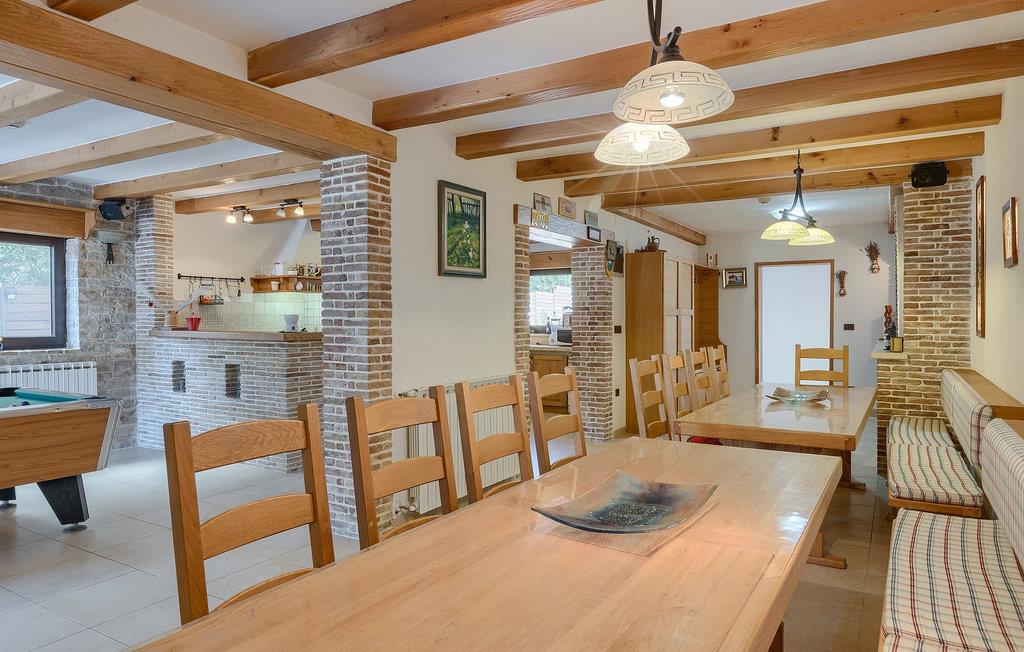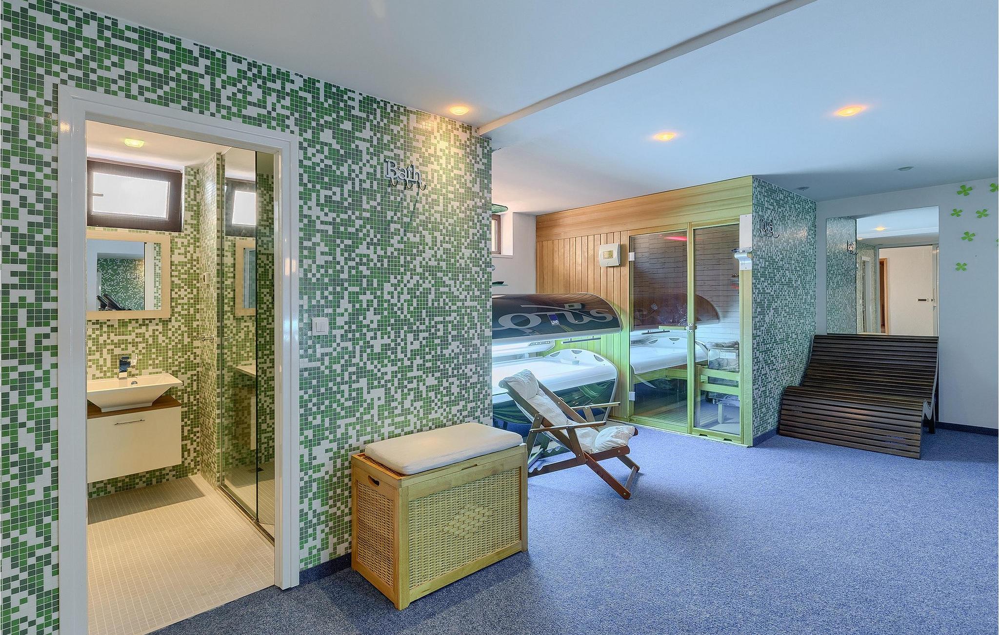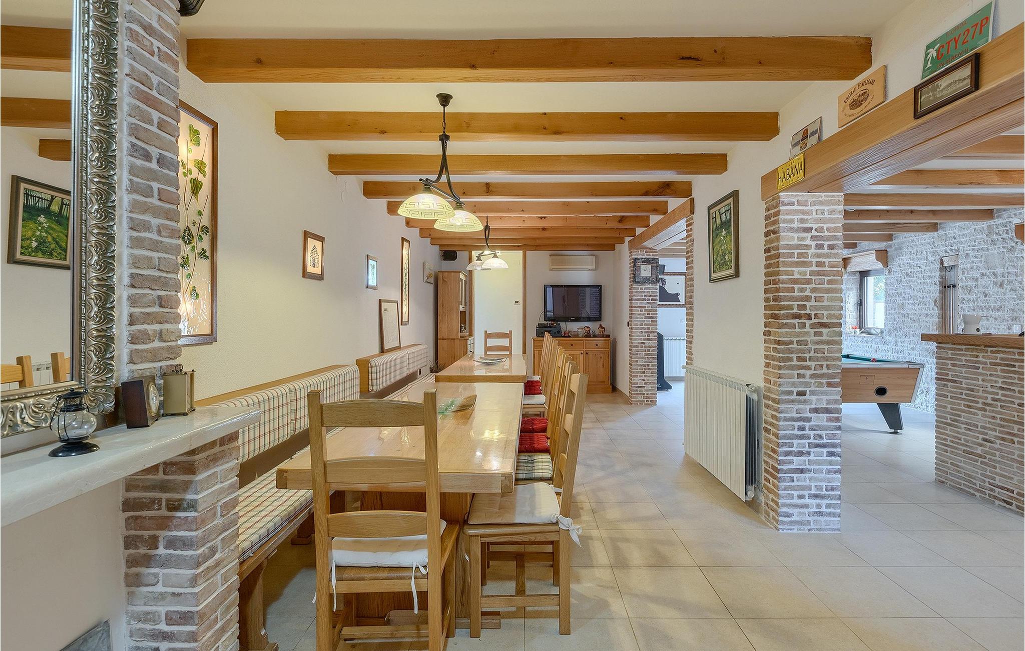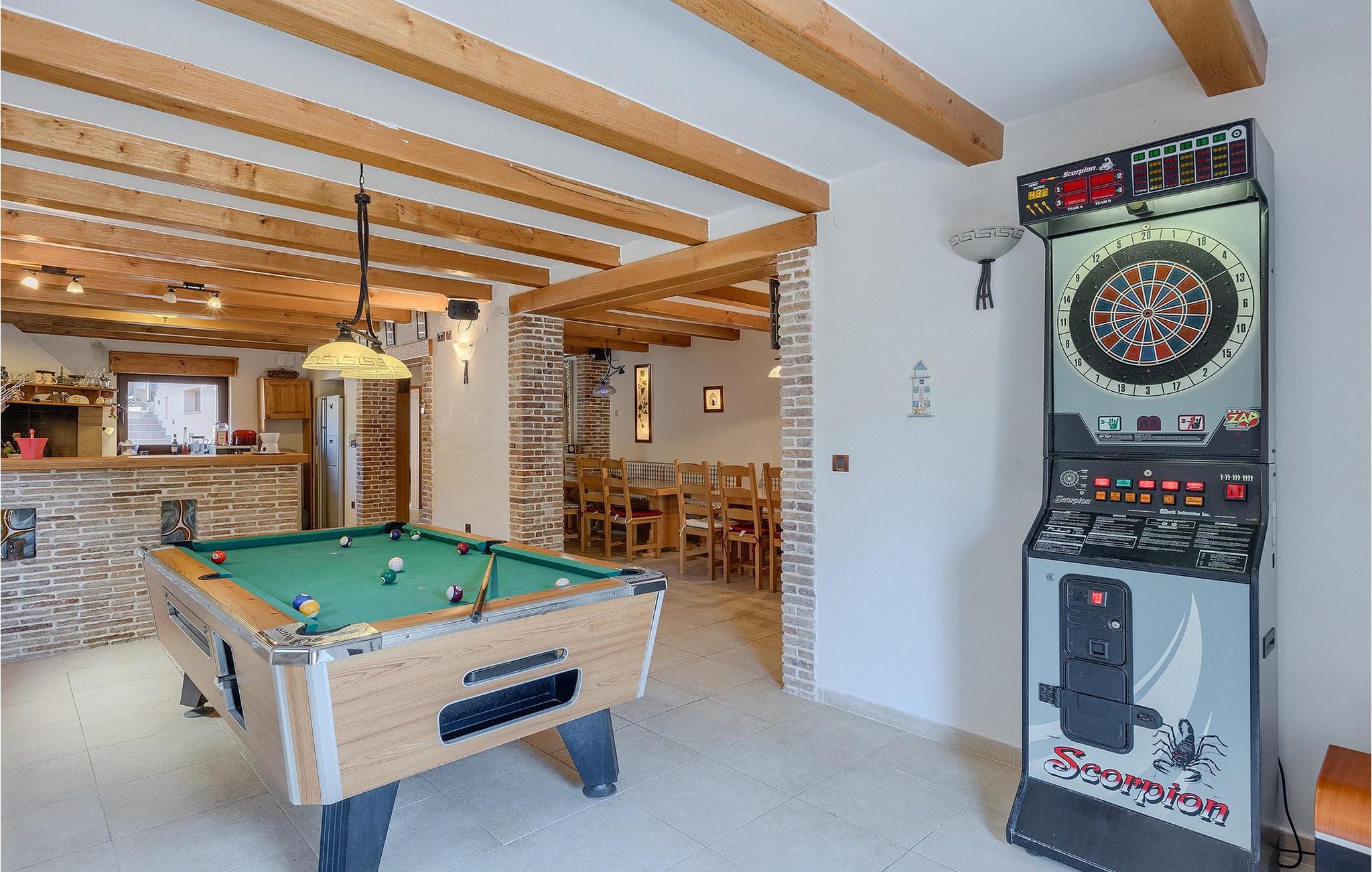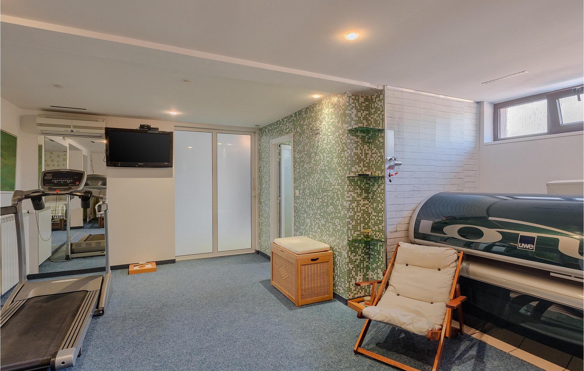 Wenn betrachtet vom Pool aus, befindet sich im Erdgeschoß auf der einen Seite ein gut ausgestatteter Fitnessbereich, damit Sie im Urlaub aktiv bleiben können, allerdings stehen Ihnen hier auch eine Sauna und ein Solarium zur Verfügung. Auf der anderen Seite des Erdgeschoßes befindet sich eine Taverne mit einer Küche, zwi großen Esstischen und einem großen Steingrill, damit Sie ein Raum haben, wo alle Mitreisende Zeit zusammen verbringen können. Es steht Ihnen auch ein Billardtisch zur Verfügung, der sowohl den kleinsten als auch den etwas älteren Gästen viel Spaß machen wird. :) Der ganze Bereich hat einen direkten Zugang zur Terrasse und zum Außenbereich.