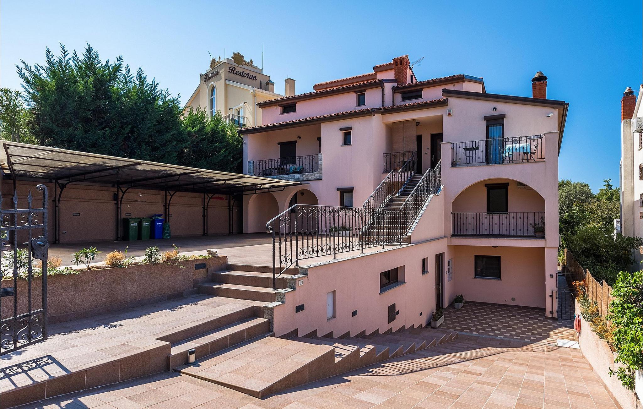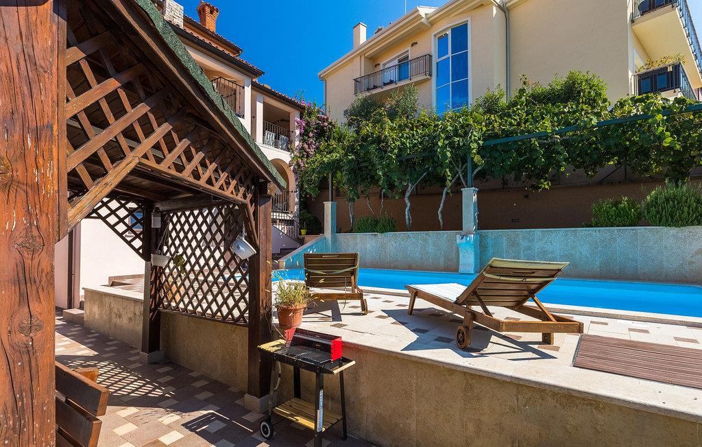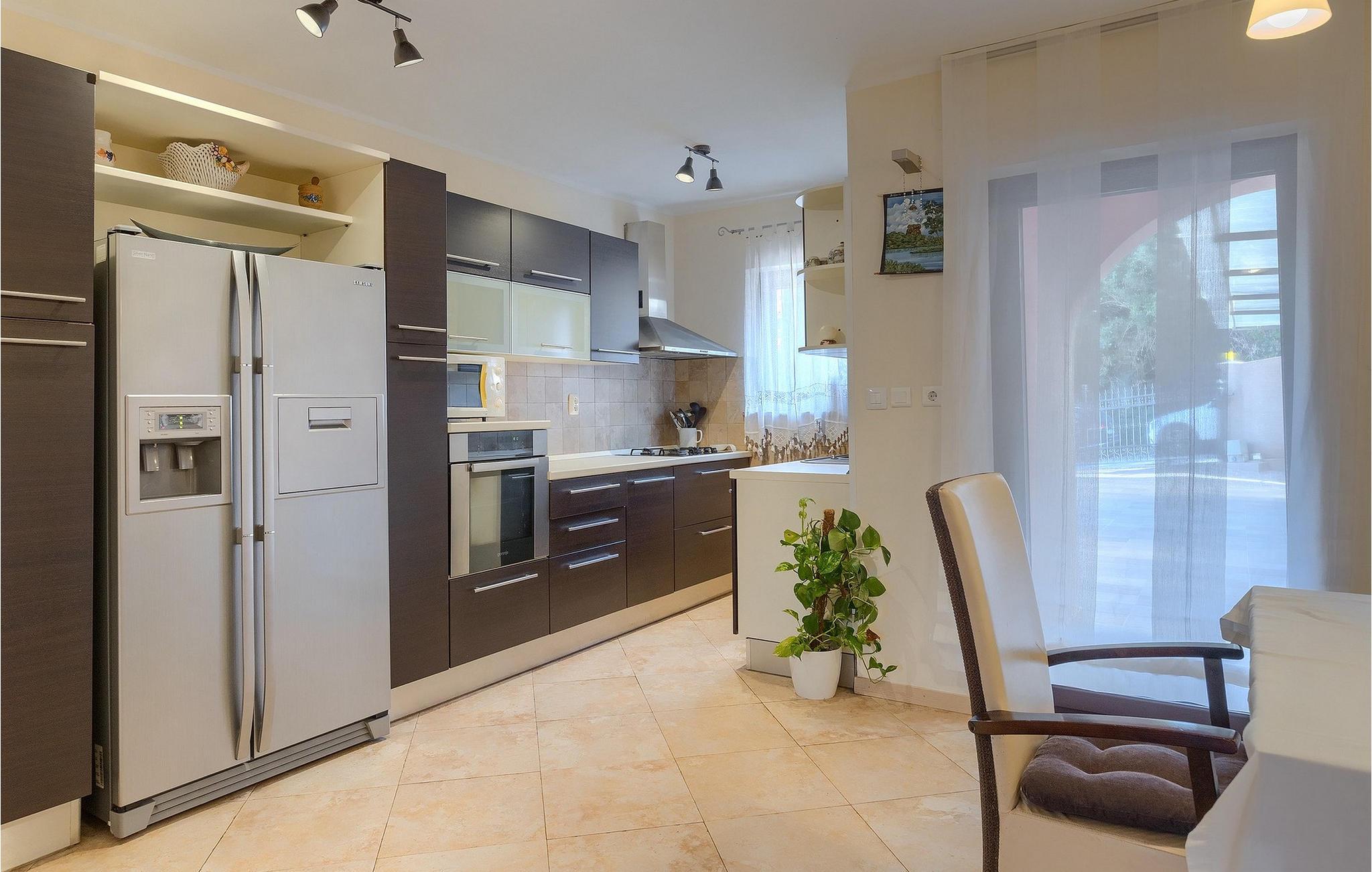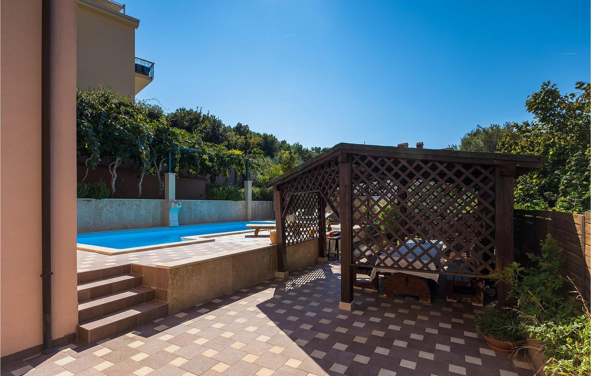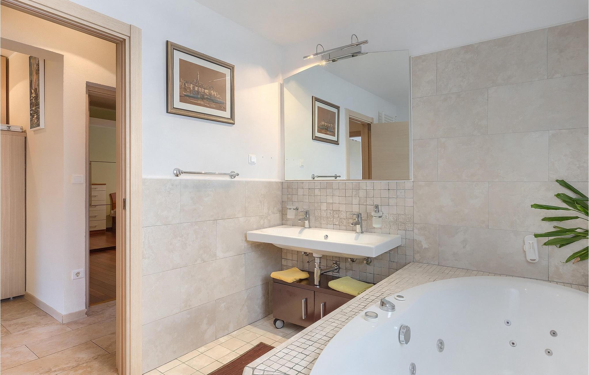 Wenn betrachtet vom Pool aus, befindet sich im Erdgeschoß auf der einen Seite ein gut ausgestatteter Fitnessbereich, damit Sie im Urlaub aktiv bleiben können, allerdings stehen Ihnen hier auch eine Sauna und ein Solarium zur Verfügung. Auf der anderen Seite des Erdgeschoßes befindet sich eine Taverne mit einer Küche, zwi großen Esstischen und einem großen Steingrill, damit Sie ein Raum haben, wo alle Mitreisende Zeit zusammen verbringen können. Es steht Ihnen auch ein Billardtisch zur Verfügung, der sowohl den kleinsten als auch den etwas älteren Gästen viel Spaß machen wird. :) Der ganze Bereich hat einen direkten Zugang zur Terrasse und zum Außenbereich.