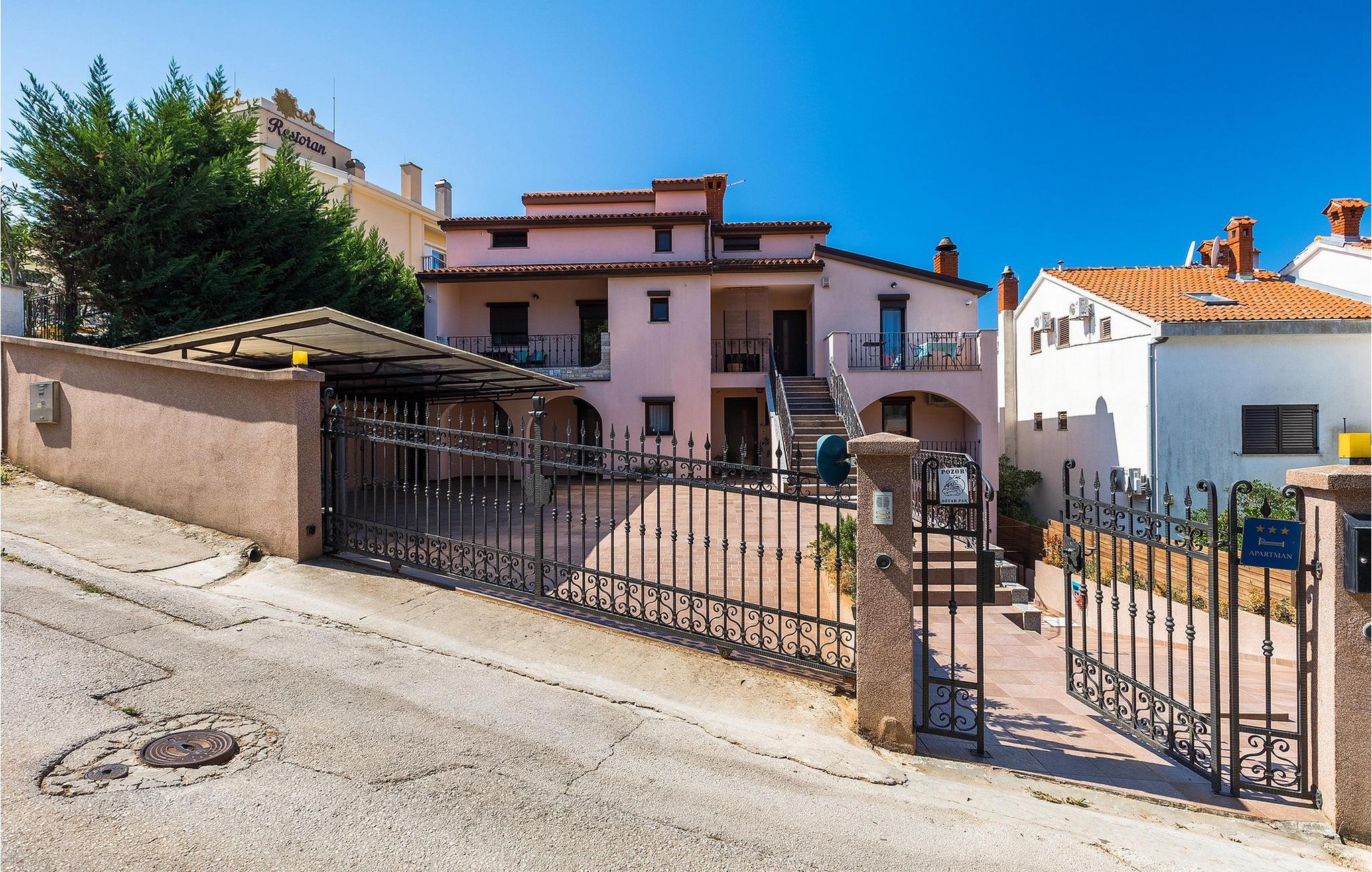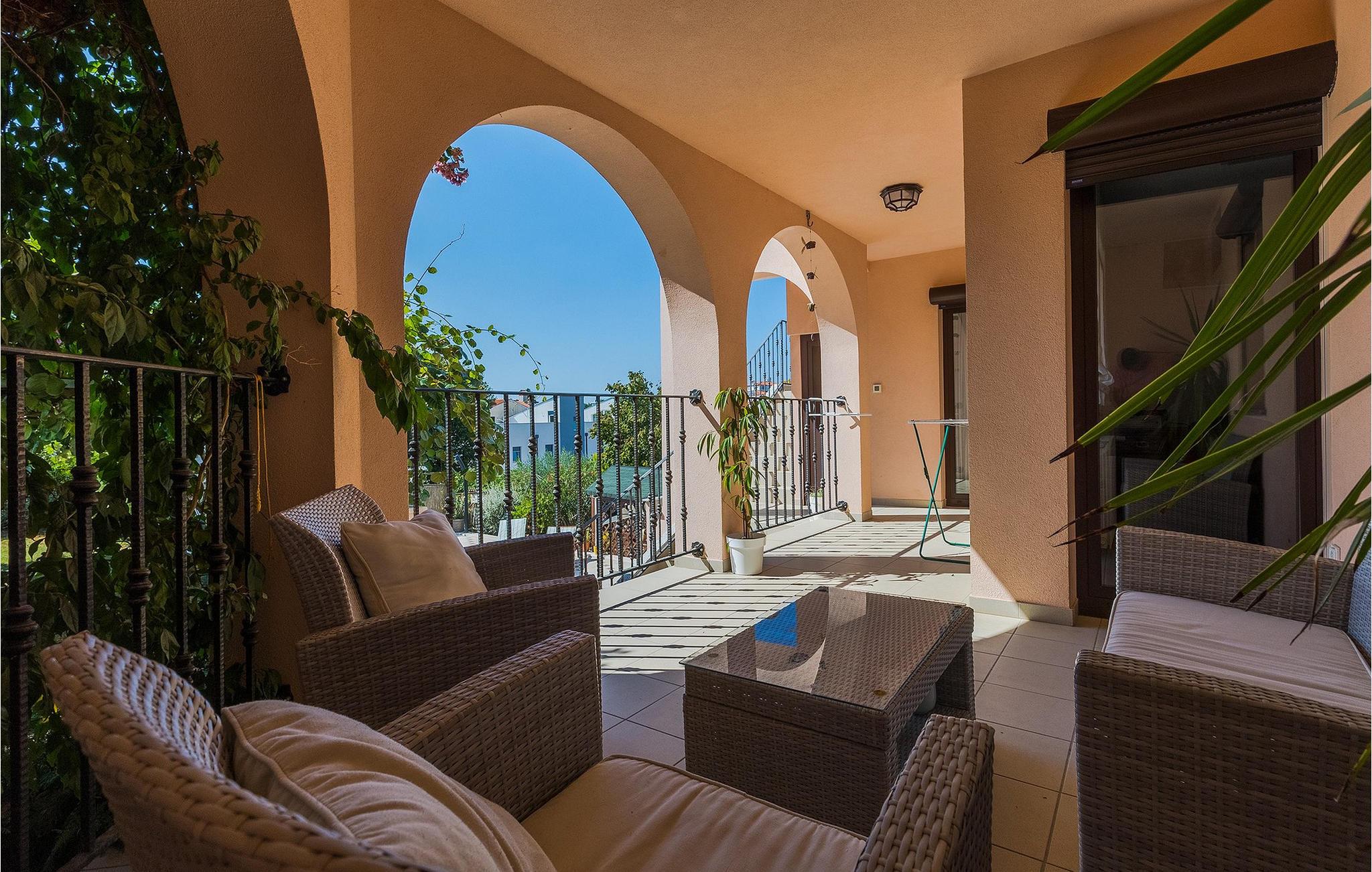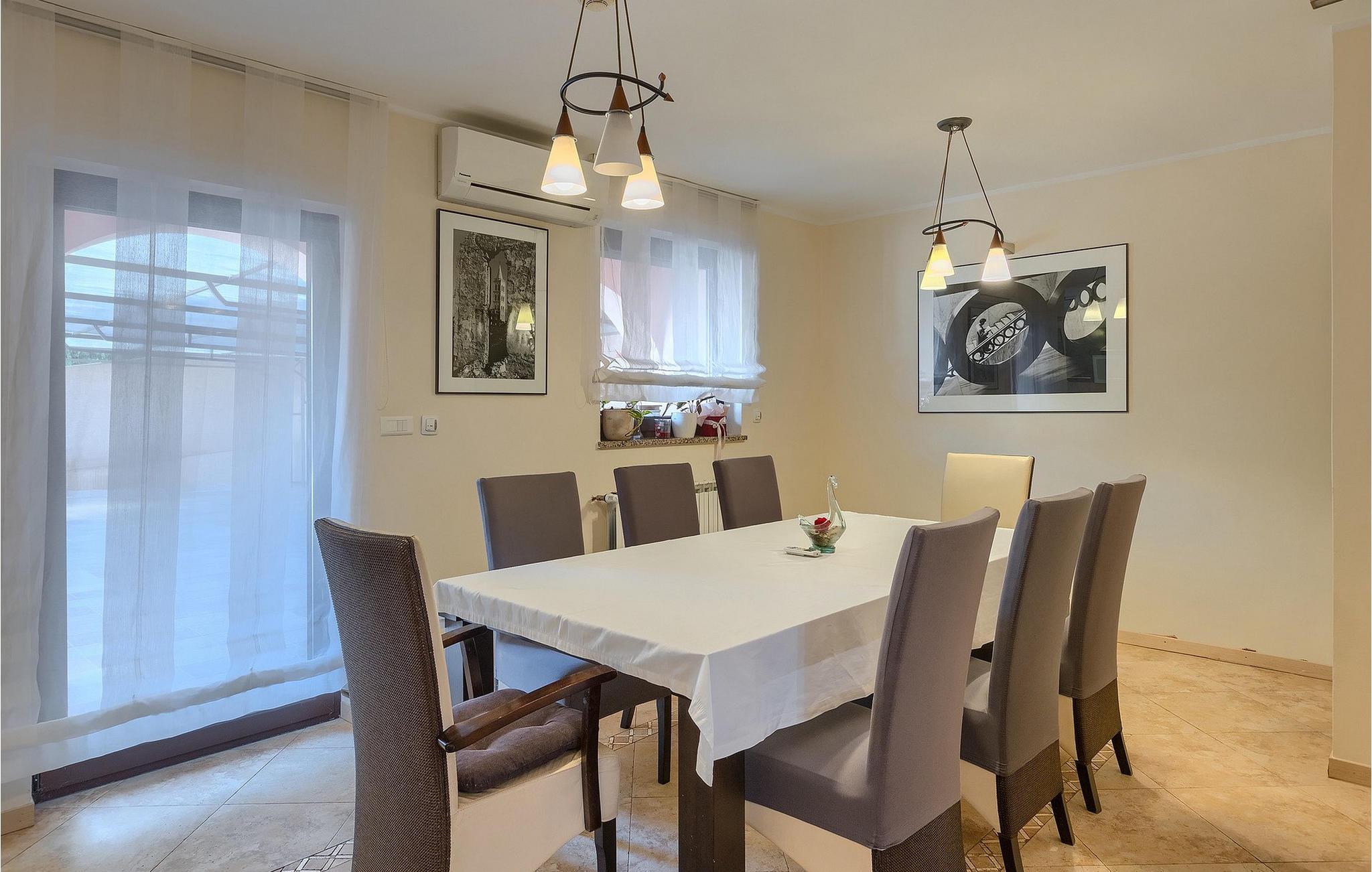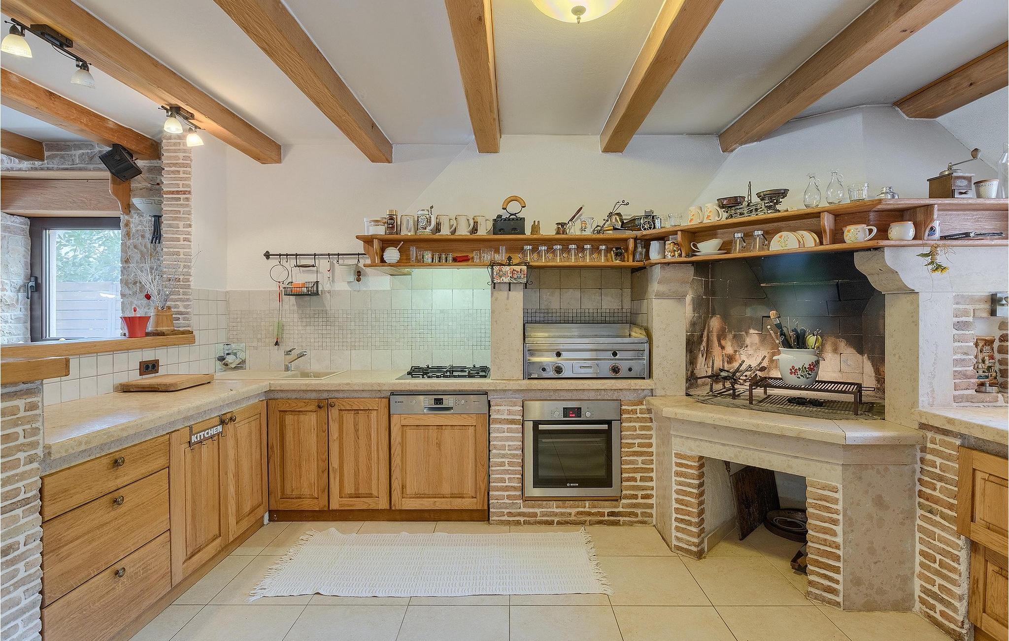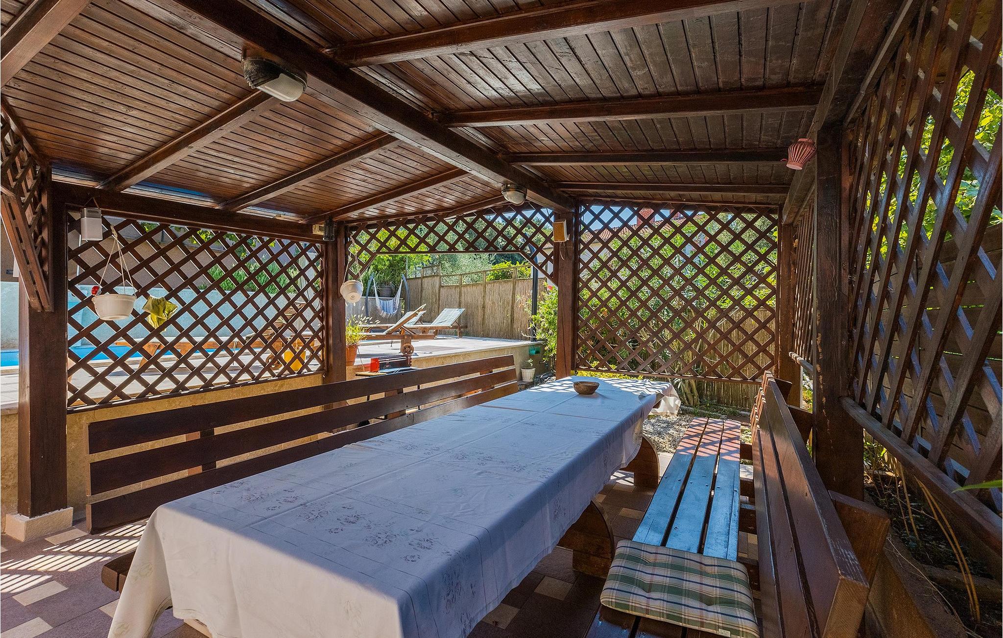 Wenn betrachtet vom Pool aus, befindet sich im Erdgeschoß auf der einen Seite ein gut ausgestatteter Fitnessbereich, damit Sie im Urlaub aktiv bleiben können, allerdings stehen Ihnen hier auch eine Sauna und ein Solarium zur Verfügung. Auf der anderen Seite des Erdgeschoßes befindet sich eine Taverne mit einer Küche, zwi großen Esstischen und einem großen Steingrill, damit Sie ein Raum haben, wo alle Mitreisende Zeit zusammen verbringen können. Es steht Ihnen auch ein Billardtisch zur Verfügung, der sowohl den kleinsten als auch den etwas älteren Gästen viel Spaß machen wird. :) Der ganze Bereich hat einen direkten Zugang zur Terrasse und zum Außenbereich.