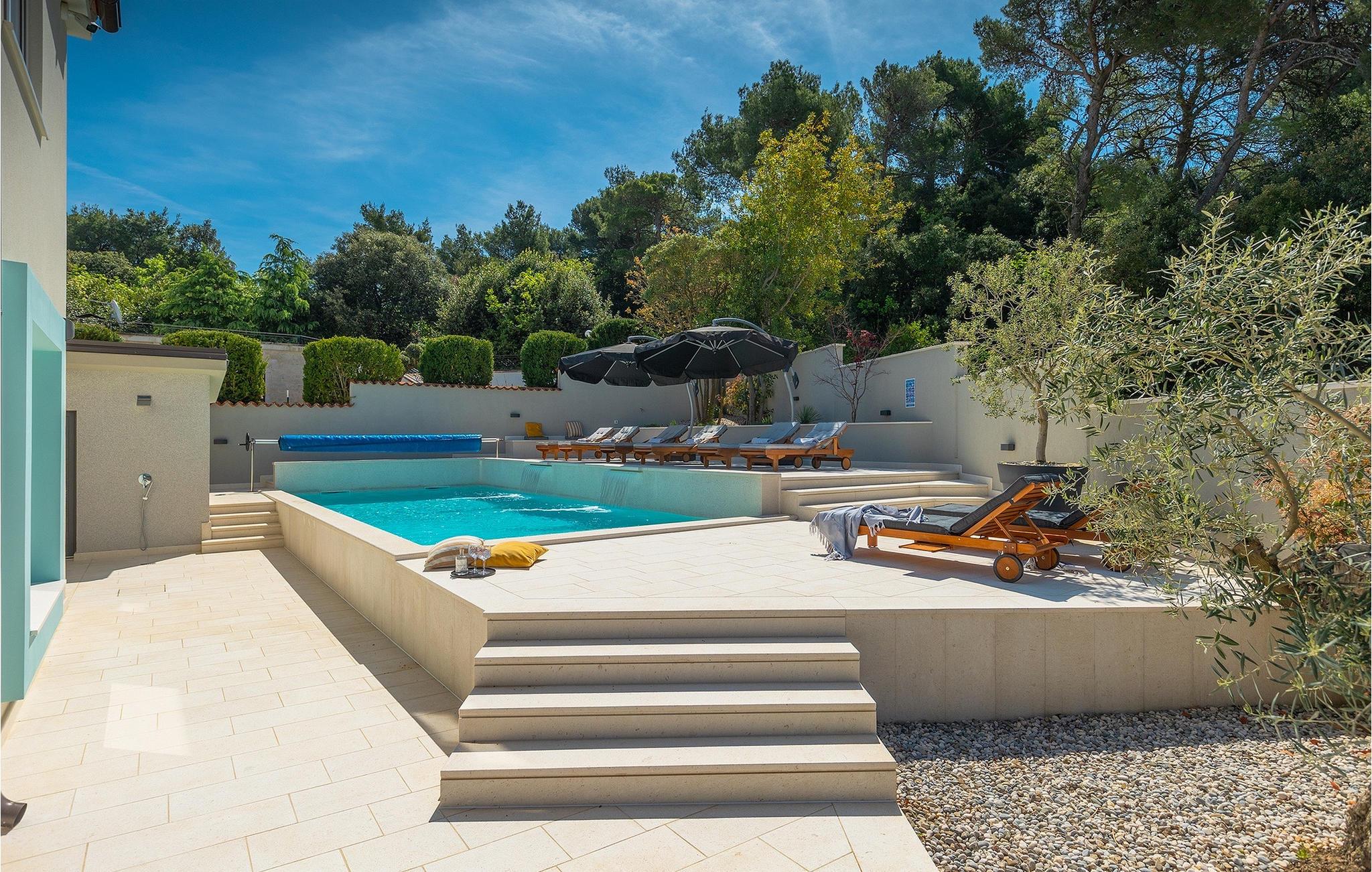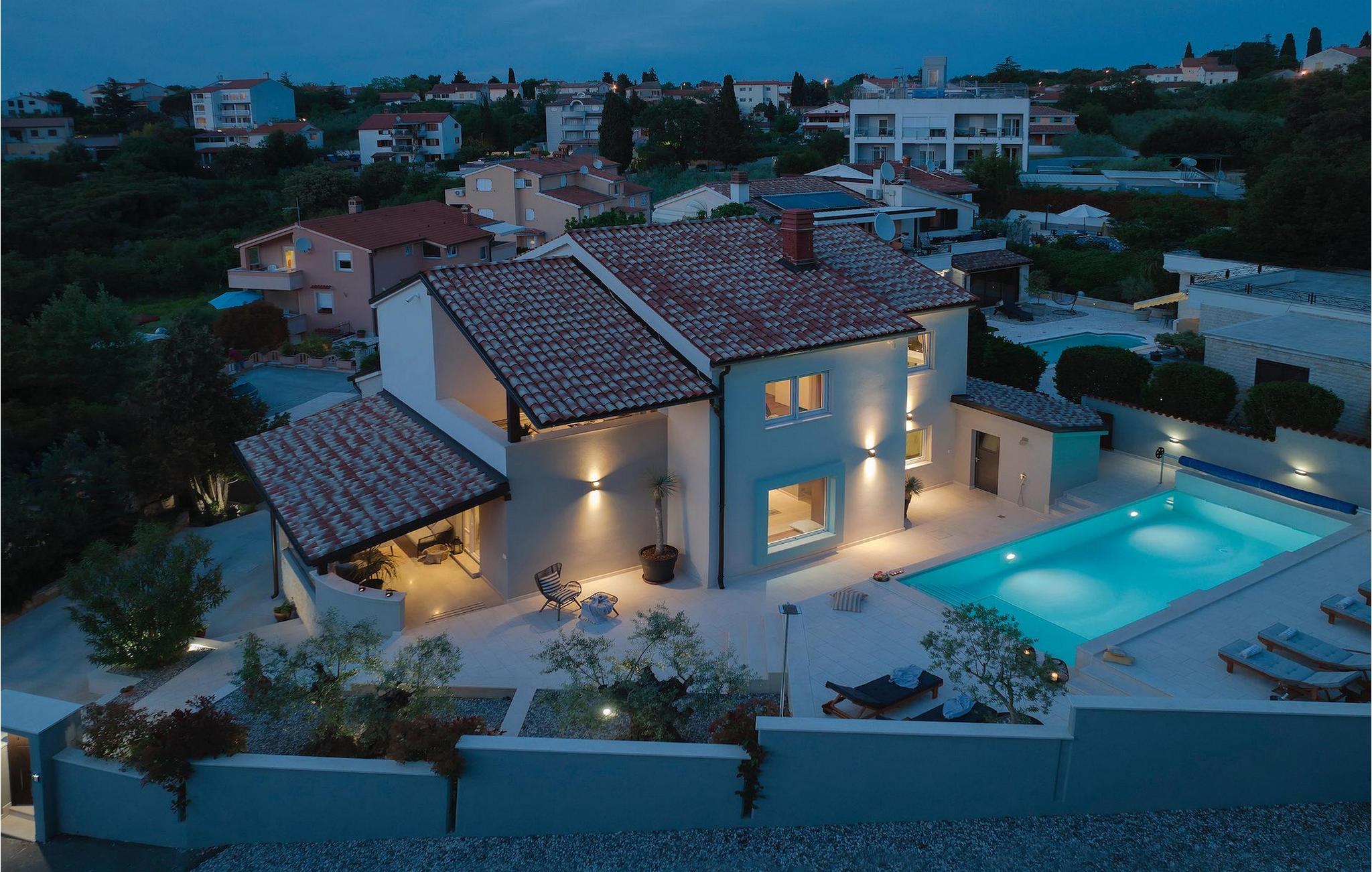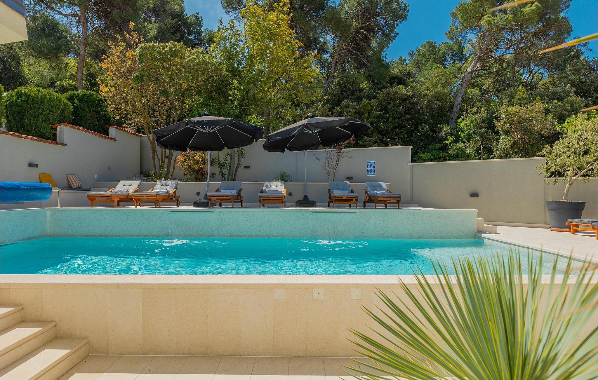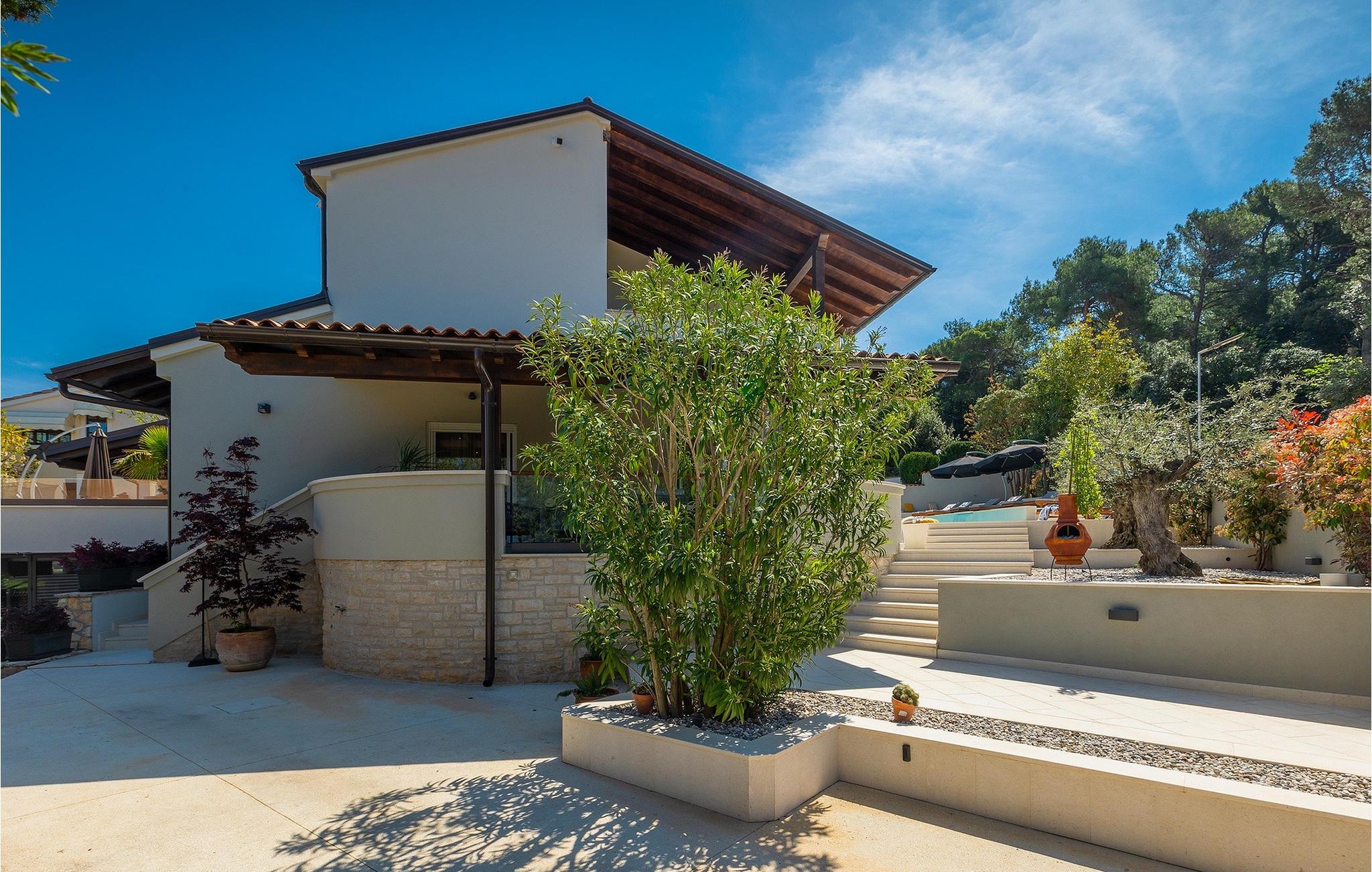 Leder du efter et sted, hvor du kan tilbringe en afslappende ferie? Så er Villa Forest Bay det ideelle valg, da det er beliggende i en smuk beliggenhed omgivet af natur og samtidig kun en kort køretur væk fra den berømte istrien by Pula. Med i alt 4 soveværelser kan den rumme op til 8 personer. Udenfor inviterer en privat pool omgivet af liggestole dig til en forfriskning på varme sommerdage. Til din rådighed er en overdækket terrasse med udekøkken, grill og spiseplads. Dette er det perfekte sted at tilbringe sommernætterne med dine kære. De små kan se frem til en legeplads. Villaen har også et fitnessrum og bordfodbold. Opholdsstuen er fordelt på 2 etager og er stilfuldt indrettet med stor opmærksomhed på detaljerne. I stueetagen er soveværelse, stue med spiseplads og direkte adgang til udearealet. I forbindelse med opholdsstuen er det fuldt udstyret køkken. Første sal består af 3 soveværelser, 2 badeværelser og 2 terrasser. Book Villa Forest Bay og tilbring en uforglemmelig ferie i Istrien!