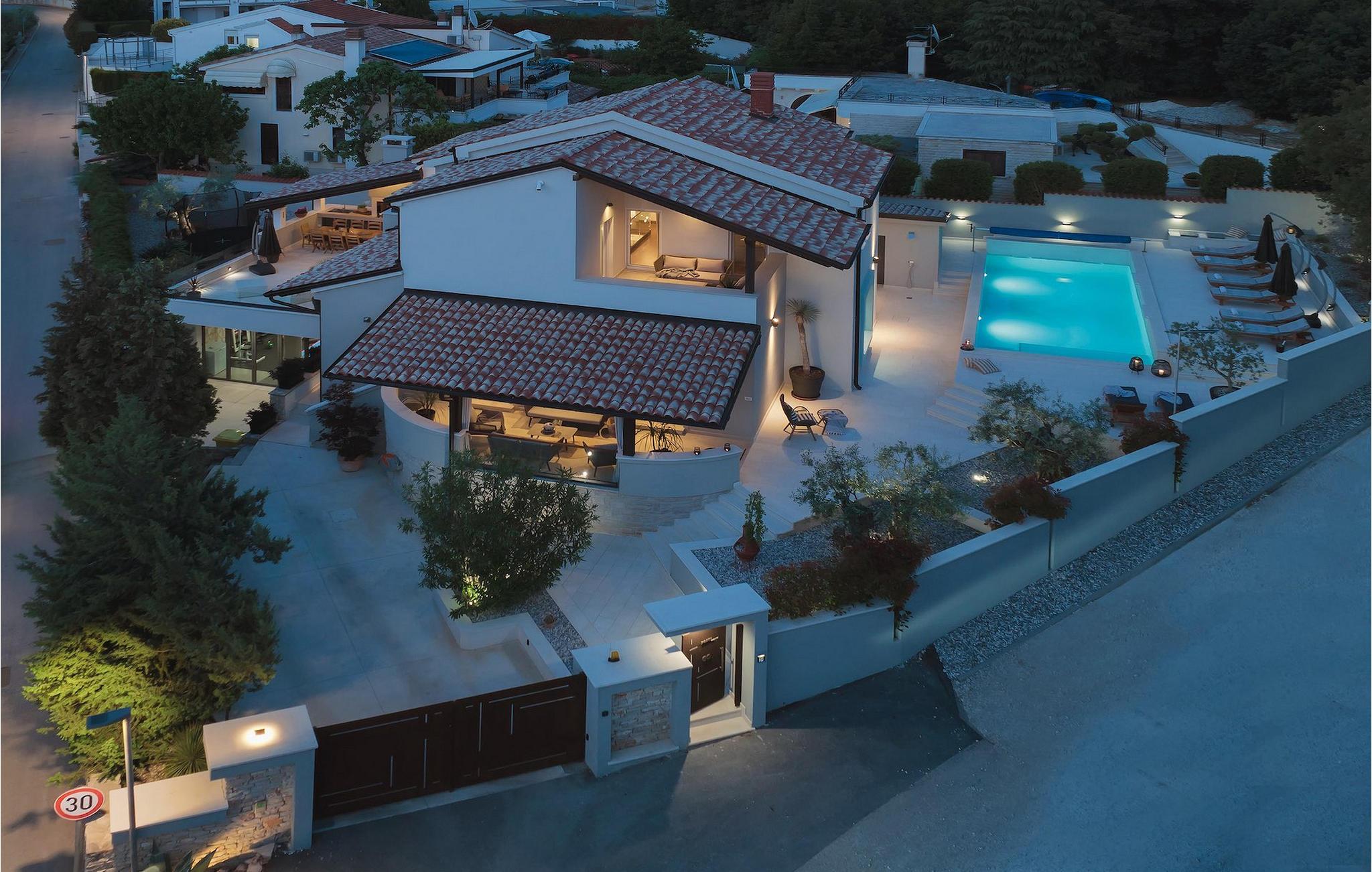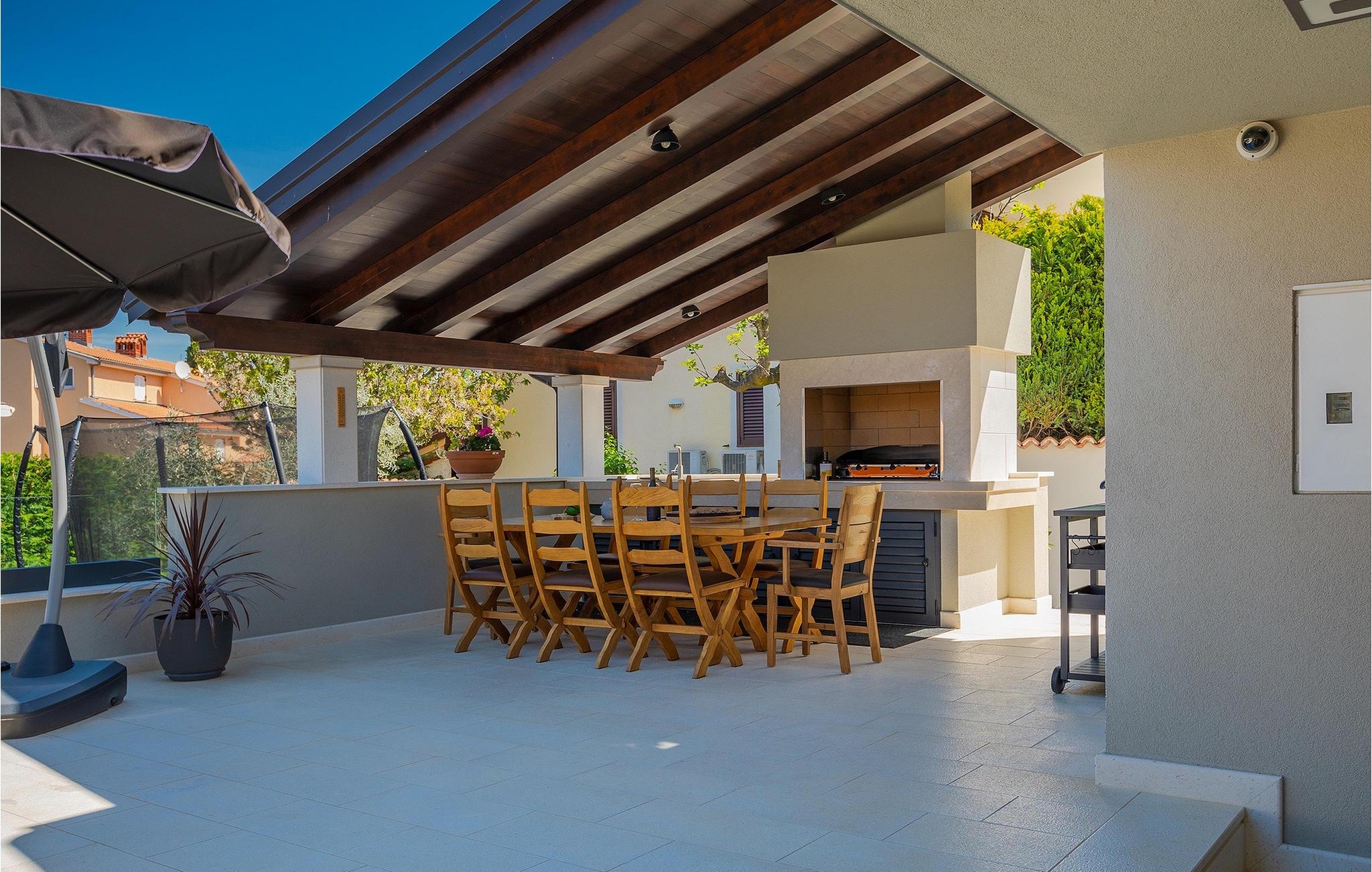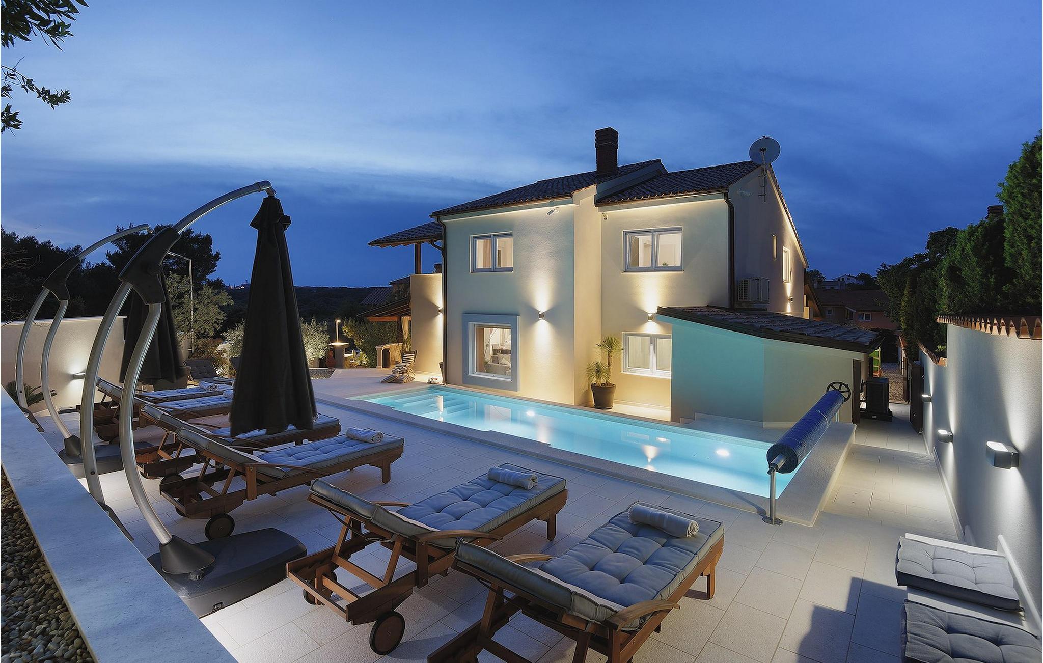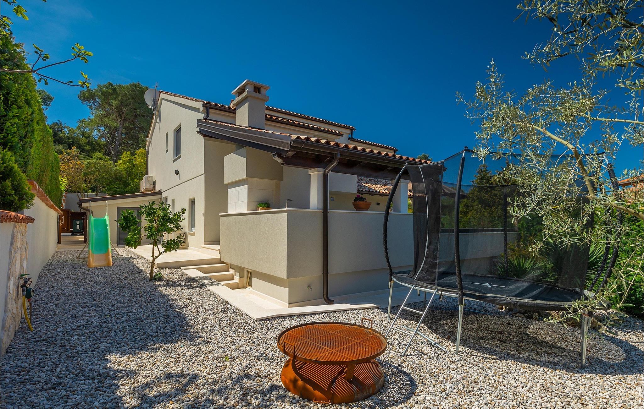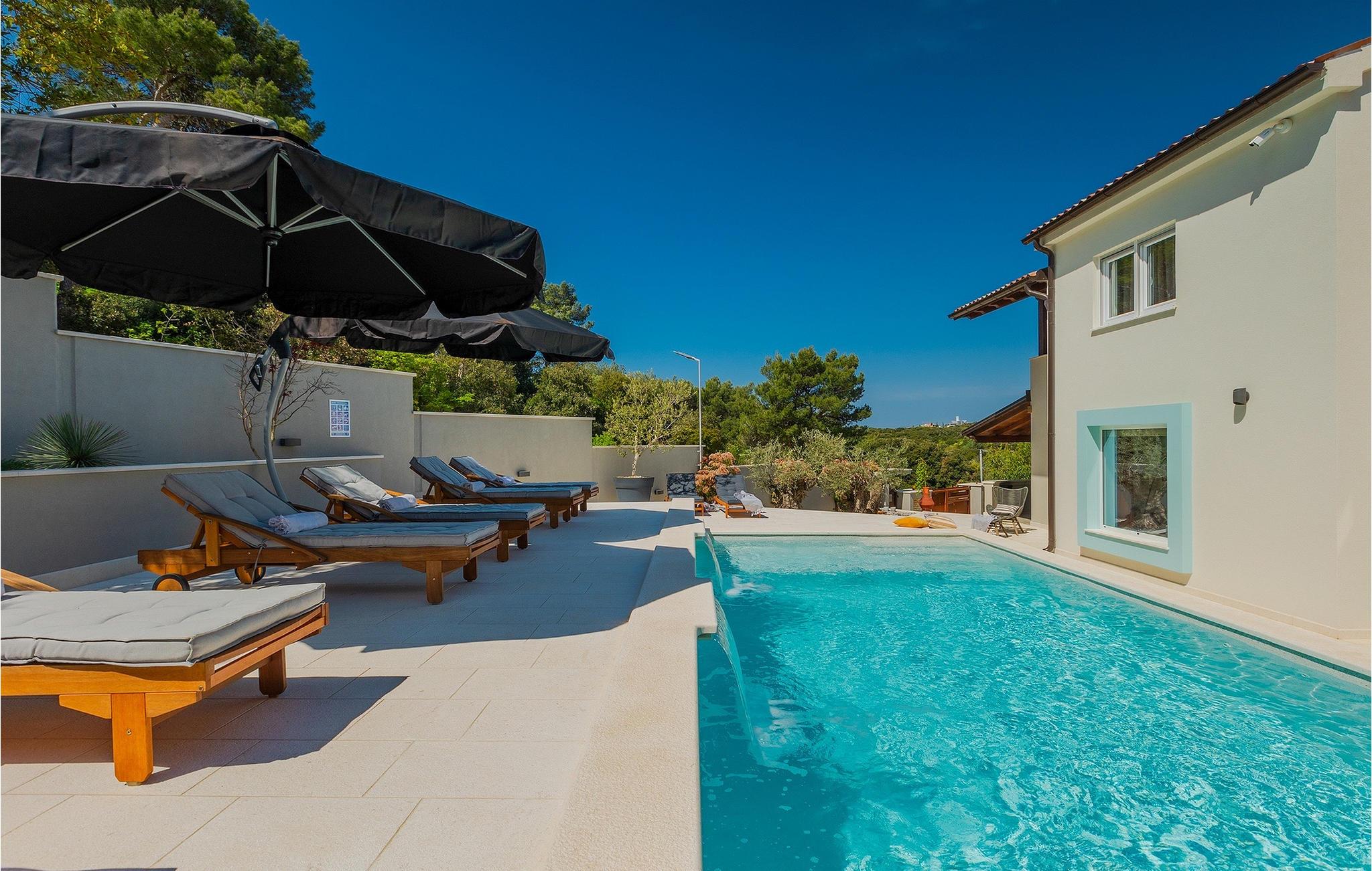 Leder du efter et sted, hvor du kan tilbringe en afslappende ferie? Så er Villa Forest Bay det ideelle valg, da det er beliggende i en smuk beliggenhed omgivet af natur og samtidig kun en kort køretur væk fra den berømte istrien by Pula. Med i alt 4 soveværelser kan den rumme op til 8 personer. Udenfor inviterer en privat pool omgivet af liggestole dig til en forfriskning på varme sommerdage. Til din rådighed er en overdækket terrasse med udekøkken, grill og spiseplads. Dette er det perfekte sted at tilbringe sommernætterne med dine kære. De små kan se frem til en legeplads. Villaen har også et fitnessrum og bordfodbold. Opholdsstuen er fordelt på 2 etager og er stilfuldt indrettet med stor opmærksomhed på detaljerne. I stueetagen er soveværelse, stue med spiseplads og direkte adgang til udearealet. I forbindelse med opholdsstuen er det fuldt udstyret køkken. Første sal består af 3 soveværelser, 2 badeværelser og 2 terrasser. Book Villa Forest Bay og tilbring en uforglemmelig ferie i Istrien!