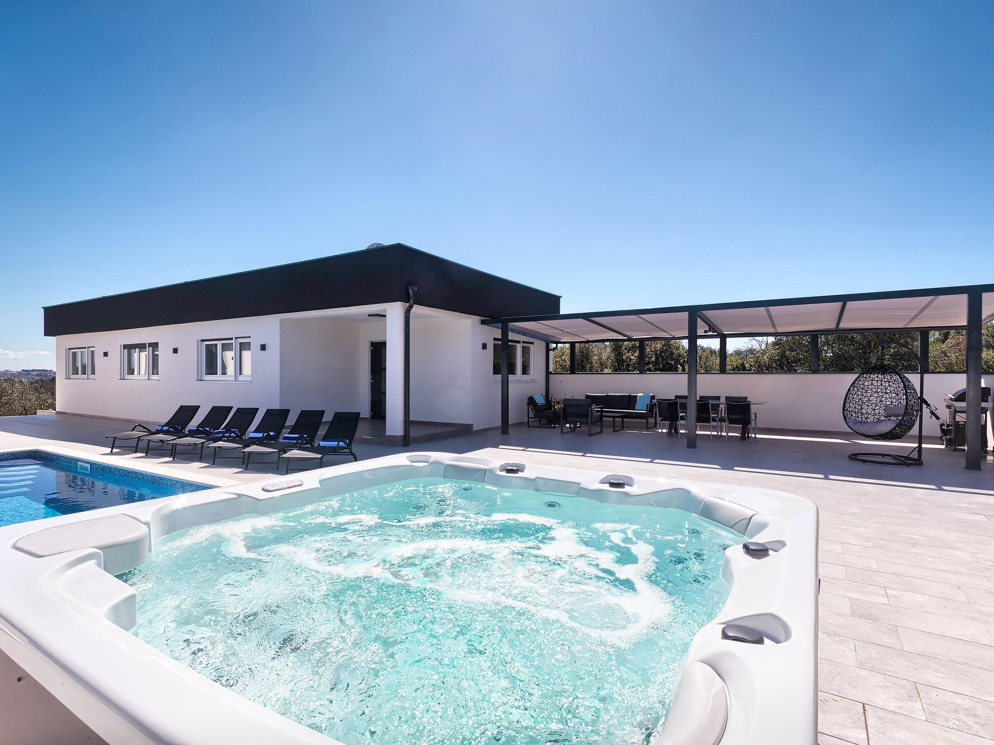 This modern villa is located in a prime location near Pula. Untouched pine forest, clear sea and proximity to all amenities allow guests a unique holiday in silence. Valelunga comes from the Italian word Valle lunga which means "long bay". Throughout the 20th century, there was a barracks on Valelungi, so this name became synonymous with the military zone between the railway and the northern side of the port of Pula. Today, after the departure of the army, Valelunga becomes an indispensable tourist part of Pula. Distance from the house to the city center and is about 10 minutes by car. The house itself consists of two bedrooms with their own bathrooms, large living room and open space kitchen. During the decoration, the owners especially appreciated the work of the designer and thus created a special atmosphere in the villa. The large courtyard is surrounded by a wall and thus ensures complete privacy. The large pool is the central location of the courtyard.