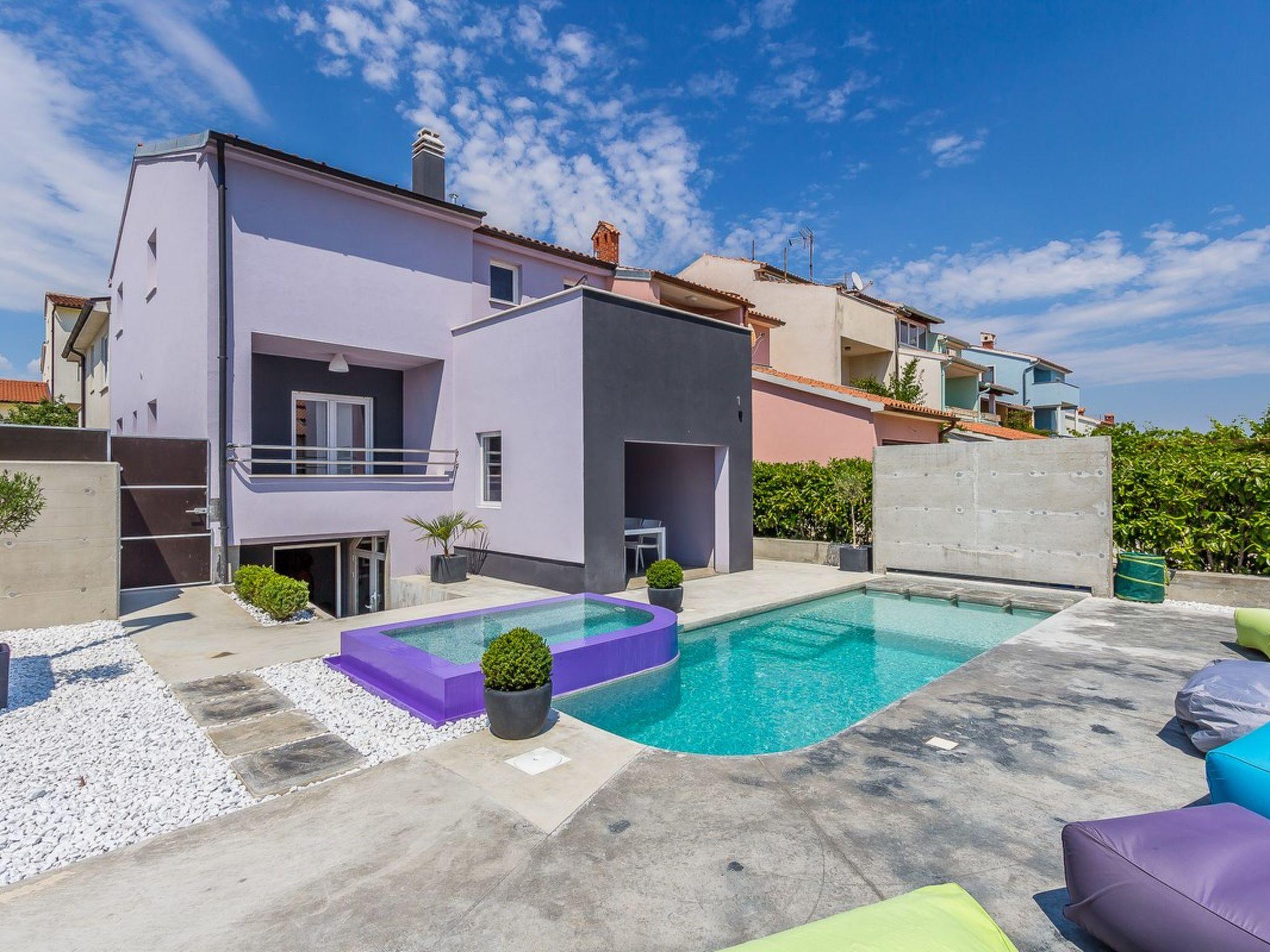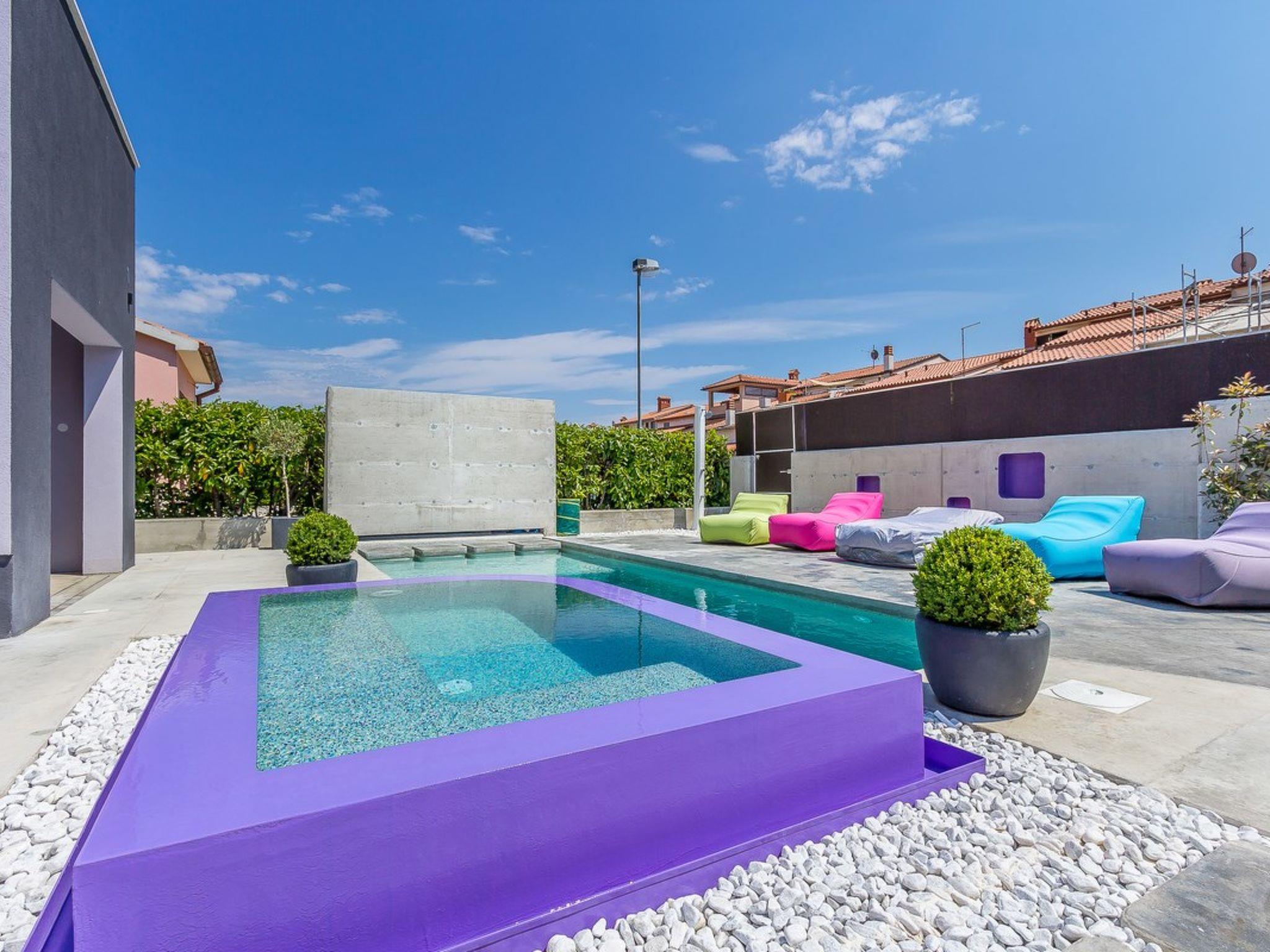 Casa Moderna in Pula is located just three kilometers from the city center. This modern house with swimming pool offers accommodation for up to four people. With a specifically shaped swimming pool, which is completely encircled by a wall in order to ensure a carefree vacation without prying eyes, guests have also access to a separate room with exercise equipment and a playroom for children. The house is decorated on the ground floor, and all rooms are tiled. This modern house in Pula stands out thanks to the bold design with straight lines and striking colorful details, such as the attractive soft sun loungers by the pool.