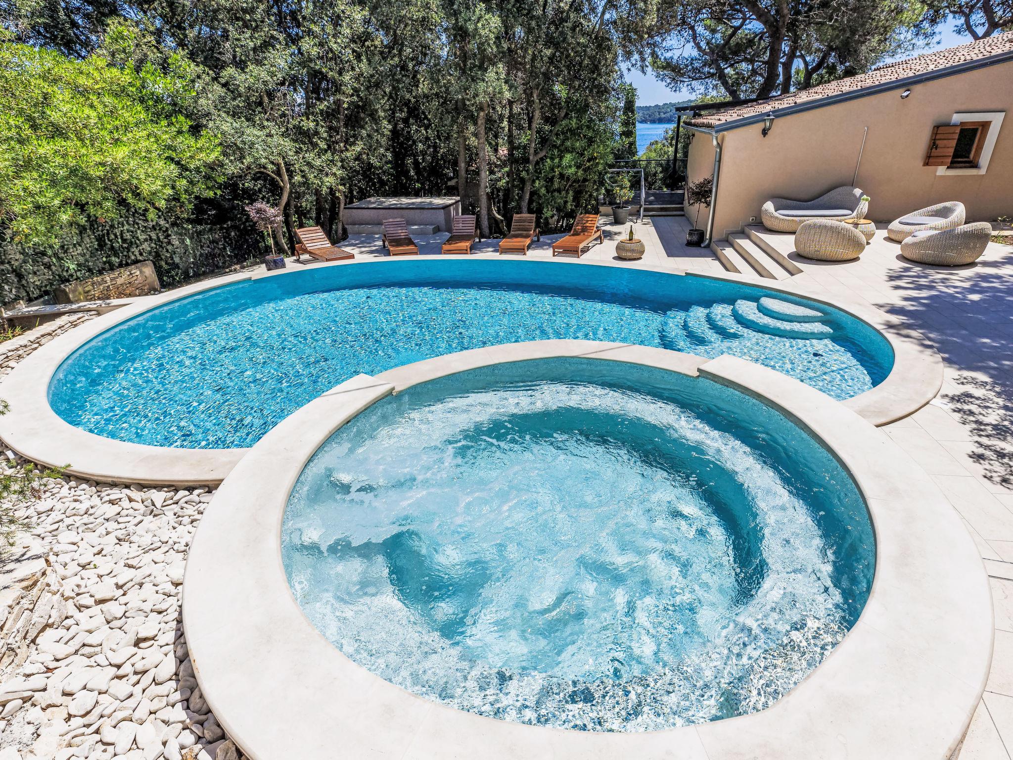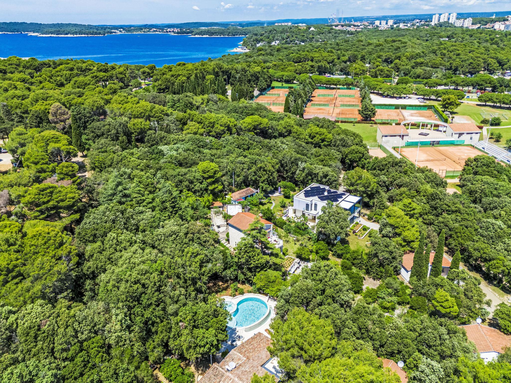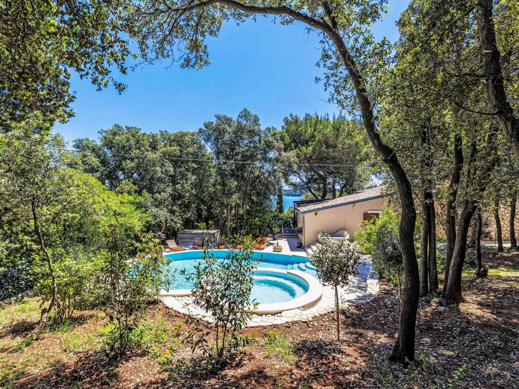 Child friendly, beautiful villa "Verudela". 4 km from the centre of Pula, in a quiet, sunny position, 50 m from the sea, 50 m from the beach. Private: property 1'800 m2 (fenced), beautiful garden with wildlife garden and trees, swimming pool (50 m2, depth 140 cm, seasonal availability: 01.Apr. - 01.Nov.). Unconventional pool shape. Pool maintenance by the owner/gardener. In the house: internet access, burglar alarm system, washing machine. Parking at the house on the premises. Shop, restaurant 200 m, bus stop 700 m, pebble beach, rocky beach 50 m. The owner does not accept any youth groups. Villa is situated inside the holiday complex "Park Plaza Verudela", at the cape Verudela. The unit consists of 3 villas rented as one unit.