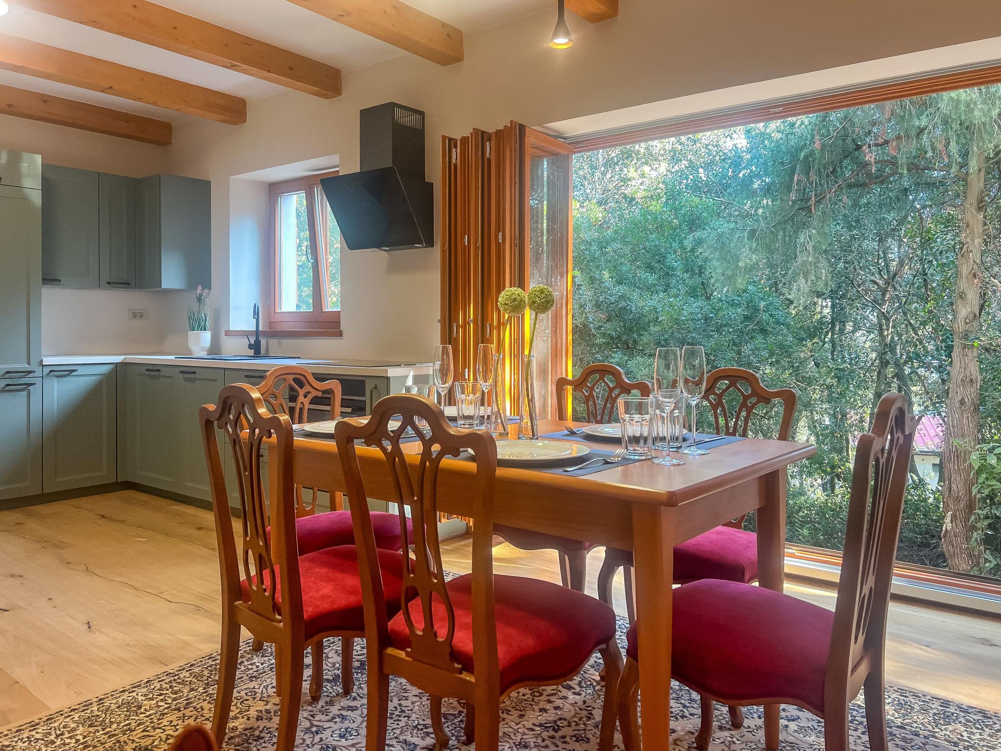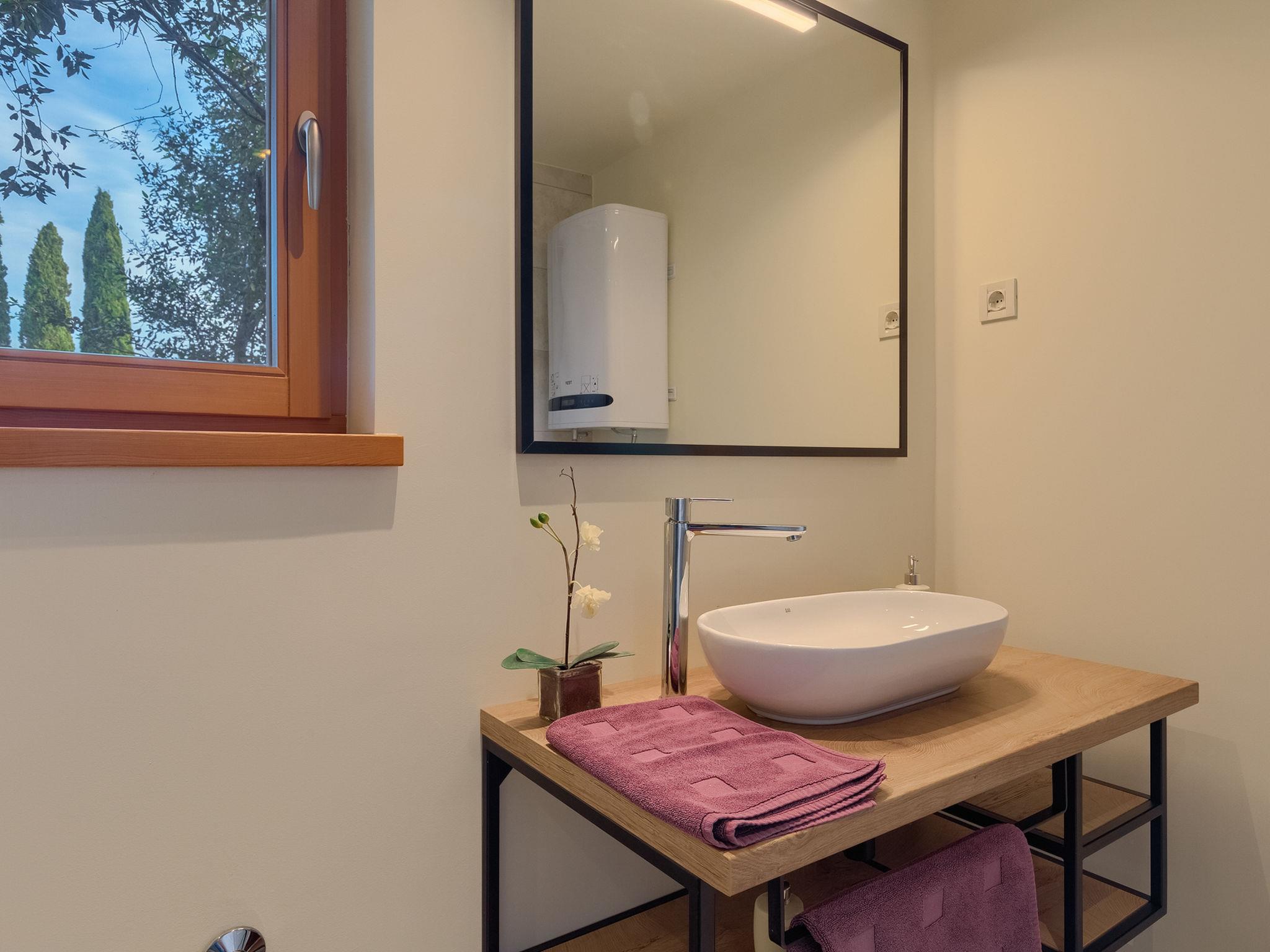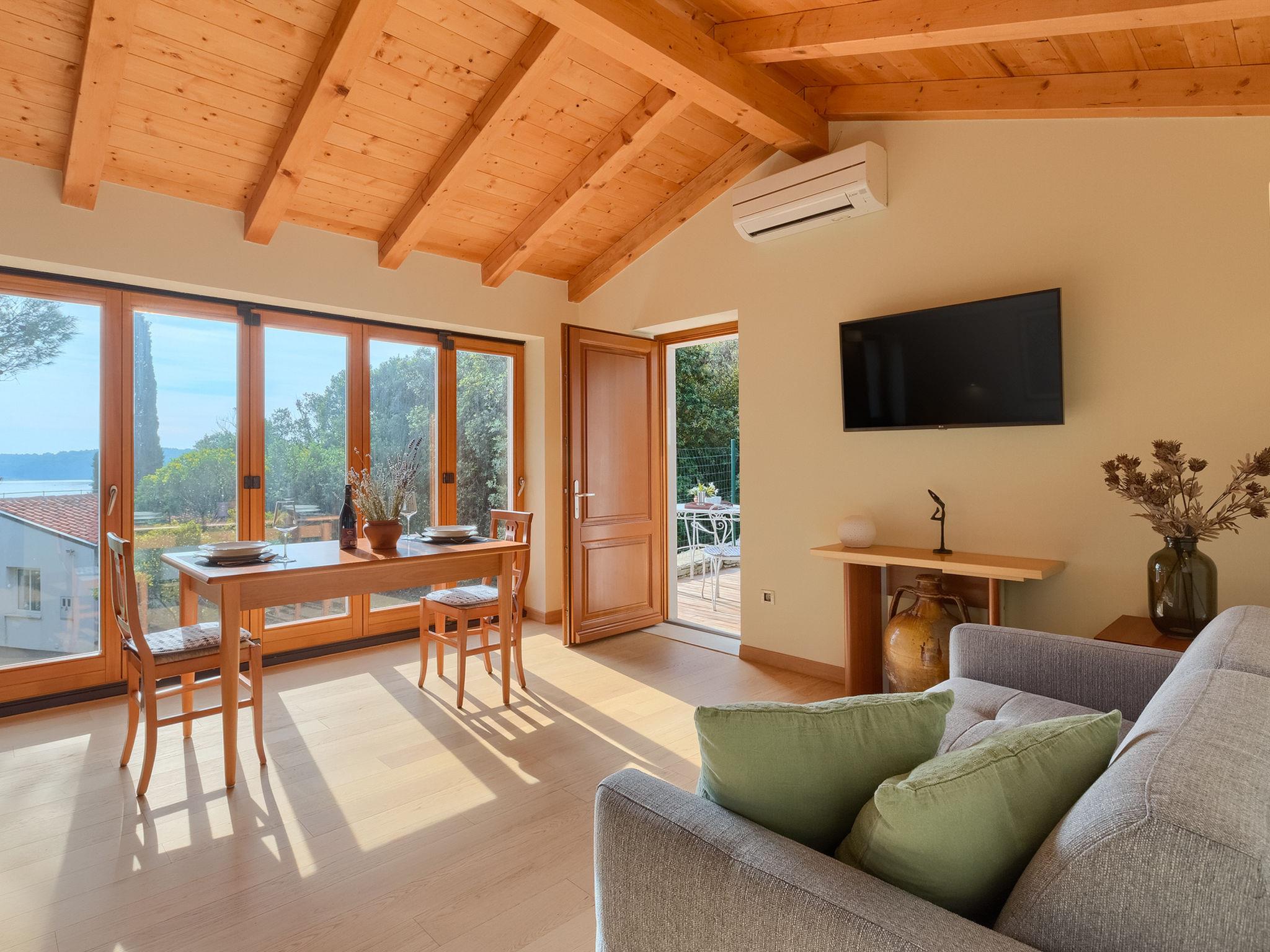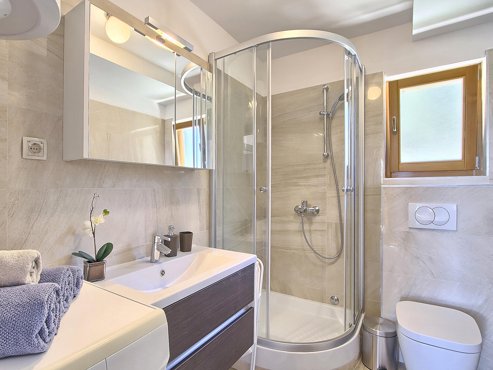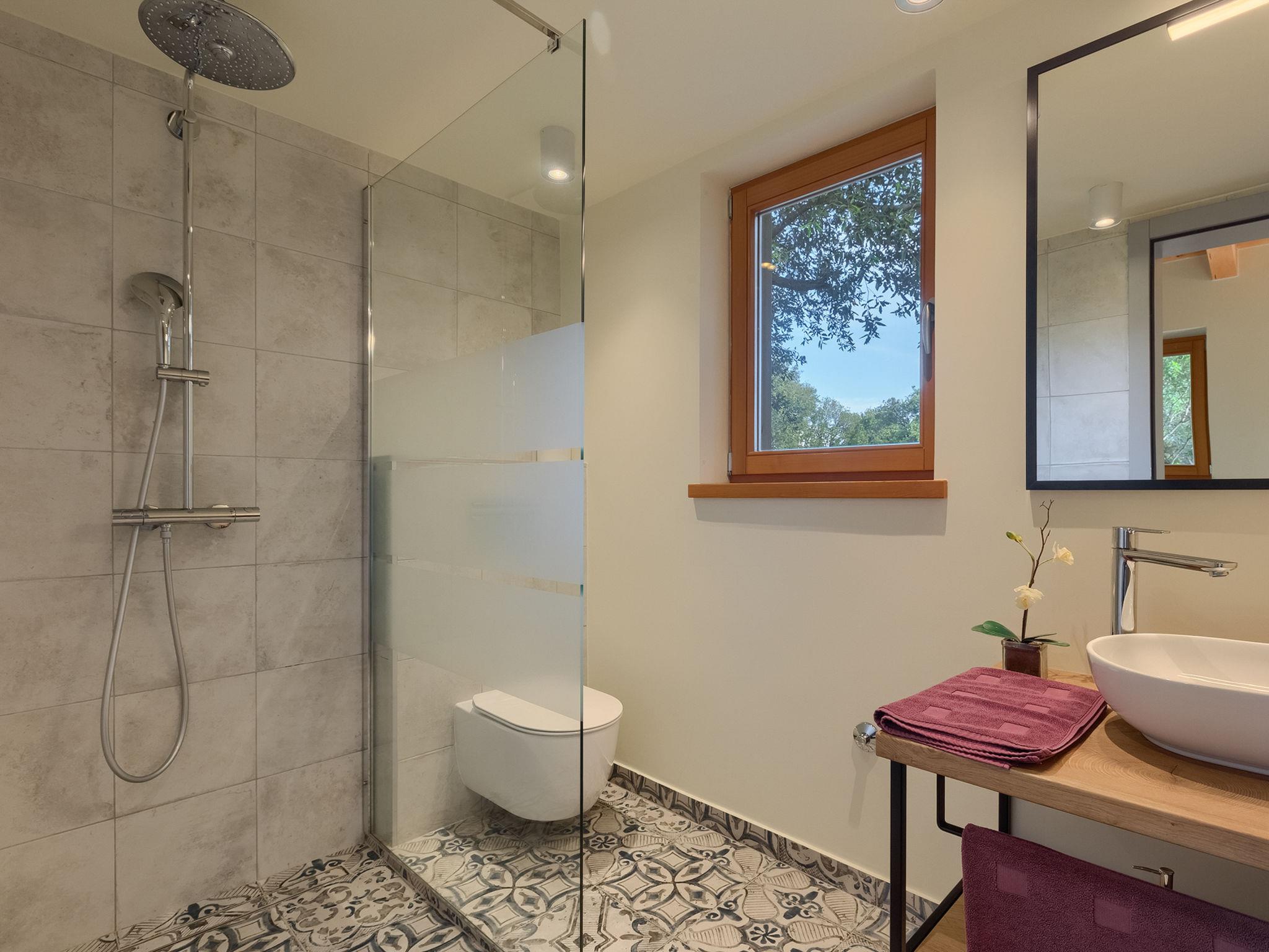 9-room villa 210 m2 on 2 levels. Living/dining room with panoramic window with kitchen corner, satellite TV and air conditioning. Exit to the terrace. 1 room with 2 beds (90 cm, length 200 cm). Living/dining room with kitchen corner, satellite TV and air conditioning. Exit to the terrace. 1 room with 1 french bed (160 cm, length 200 cm), kitchen corner, shower/WC and air conditioning. 1 room with 1 french bed (160 cm, length 200 cm), satellite TV and air conditioning. Living/dining room with open-hearth fireplace (only for decoration), satellite TV (flat screen), air conditioning. 1 room 8 m2 with 1 double sofabed (160 cm, length 200 cm). Kitchen (oven, dishwasher, 4 ceramic glass hob hotplates, microwave, freezer). 3 showers/WC. Upper floor: entrance hall with air conditioning. 1 room with 1 french bed (160 cm, length 200 cm). 1 room with 1 french bed (180 cm, length 200 cm). Shower/WC. Heating. Terrace 30 m2, 2 terraces 5 m2. Terrace furniture. View of the sea. Facilities: safe. Internet (WiFi, free). 1 small pet/ dog allowed. The first villa with living/dining room, open kitchen, 1 bedroom. The second villa with living/dining room, open kitchen, 2 bedrooms. The third villa with living/dinig room, open kitchen, 1 bedroom on the ground floor, 2 bedrooms on the first floor.