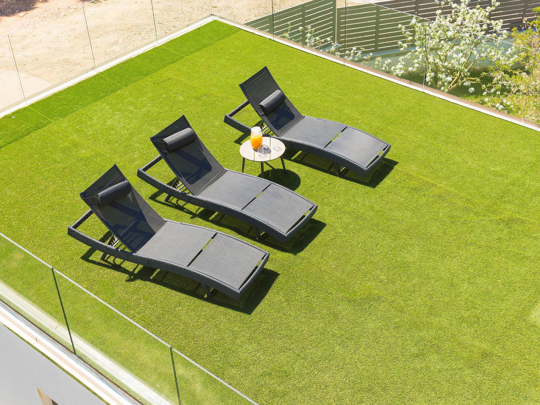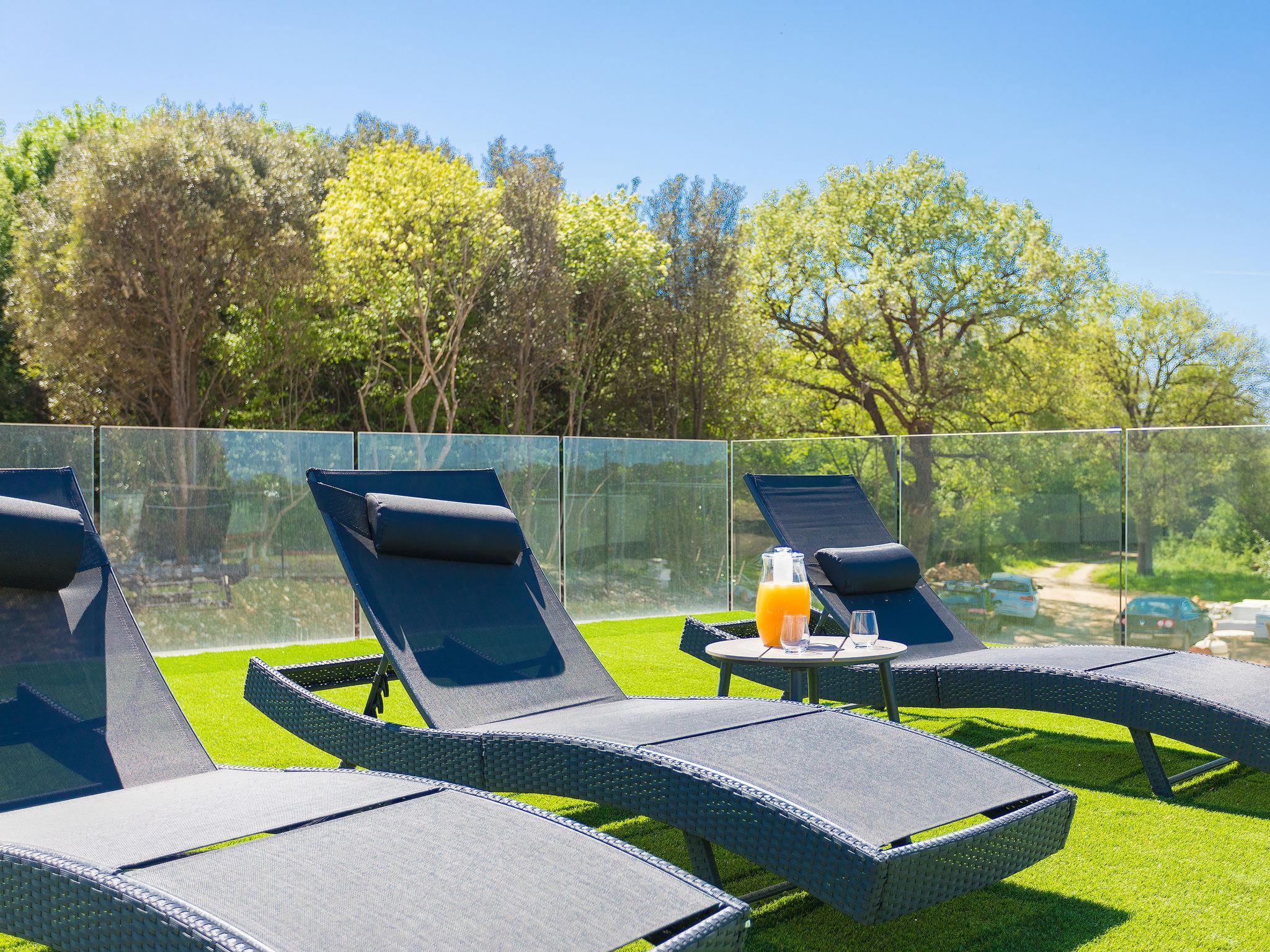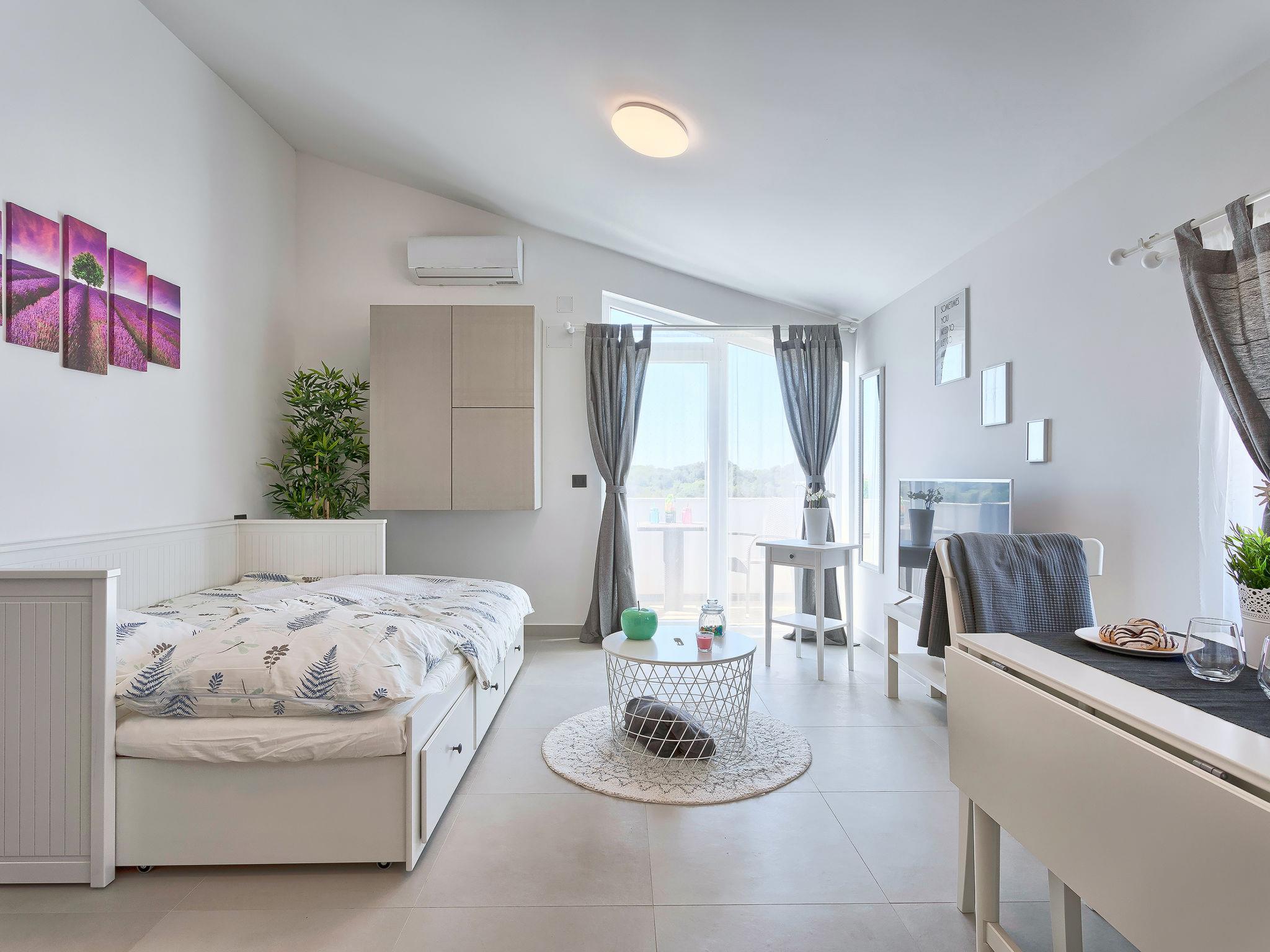 1-room apartment 35 m2 on 1st floor. Studio with 1 pull-out bed (2 pers. 2 x 80 cm, length 200 cm), satellite TV (flat screen), air conditioning. Exit to the terrace. Open kitchen (2 ceramic glass hob hotplates, microwave, electric coffee machine) with dining table. Shower/WC. Forced-air heating. Terrace 8 m2 partly roofed. Terrace furniture. Facilities: Internet (WiFi, free).
