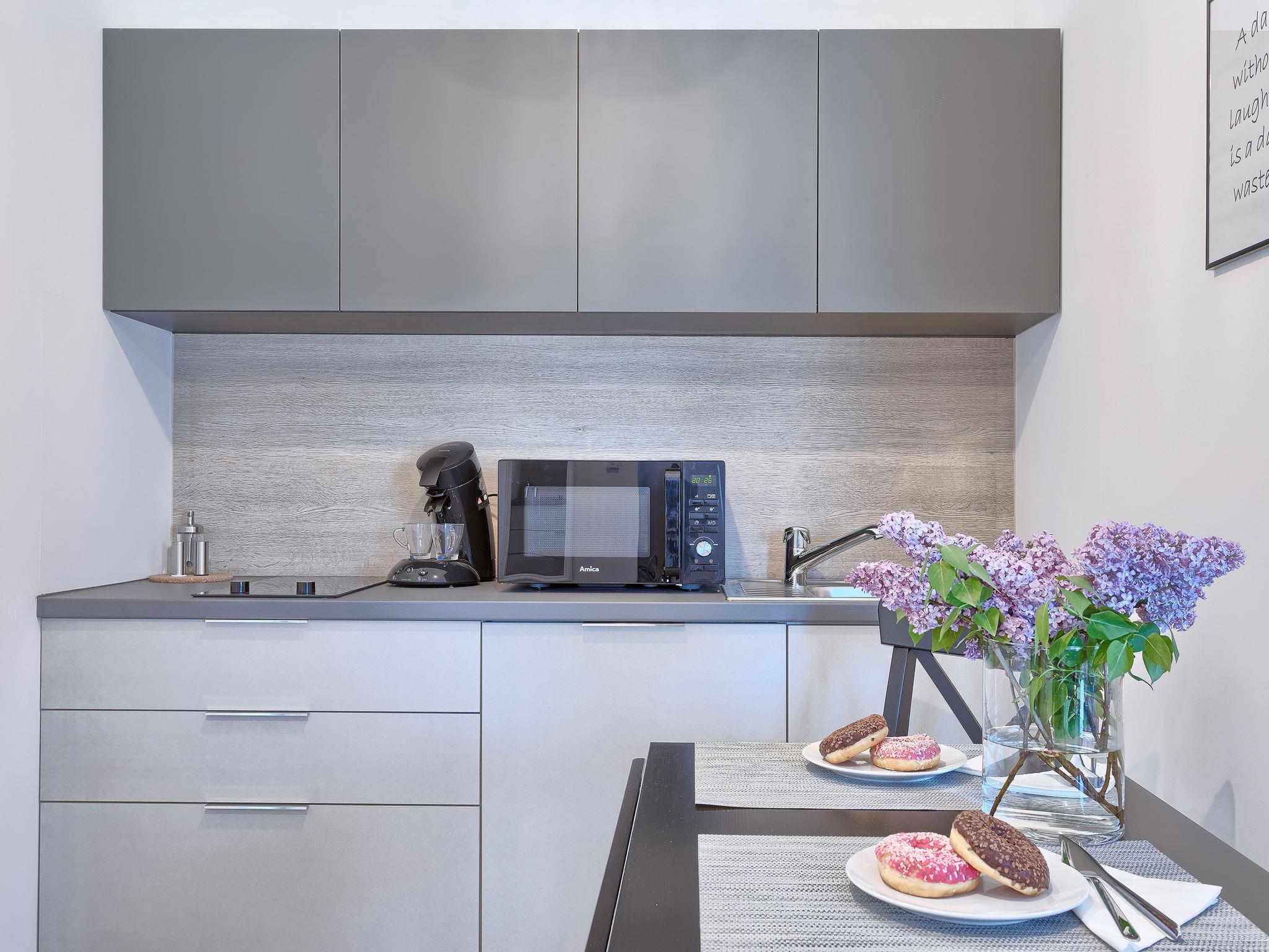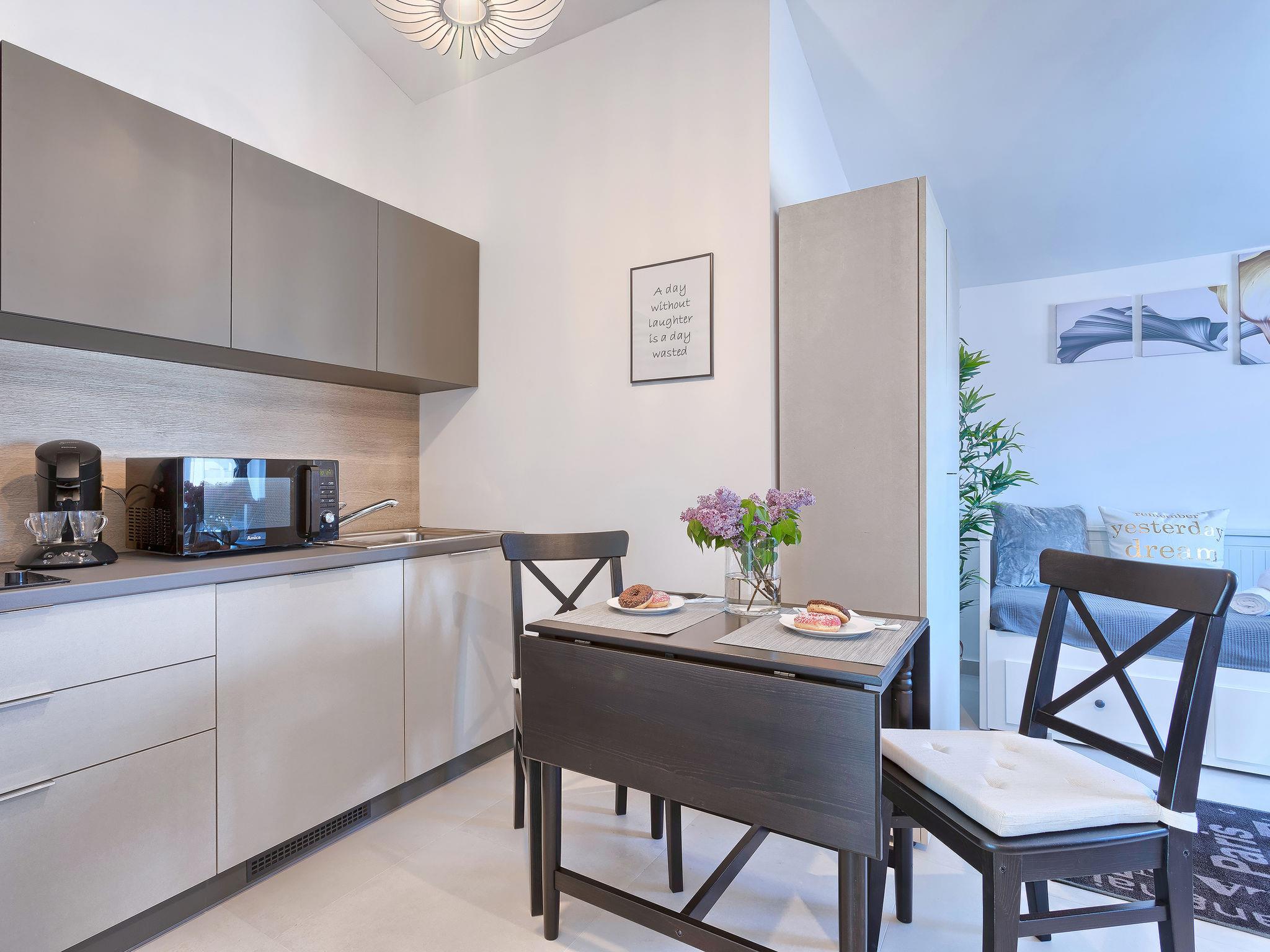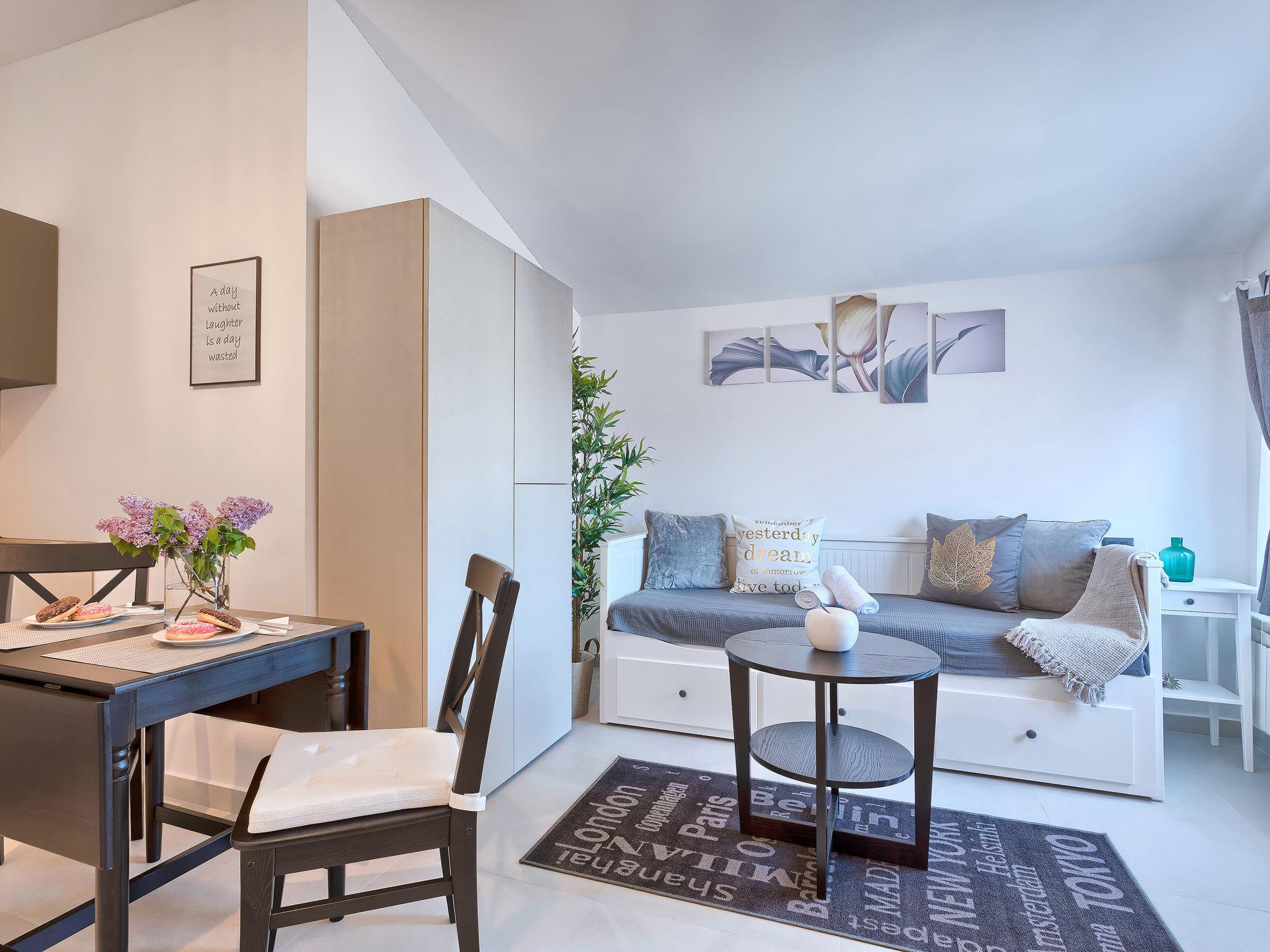 1-room apartment 35 m2 on 1st floor. Studio with 1 pull-out bed (2 pers. 2 x 80 cm, length 200 cm), satellite TV (flat screen), air conditioning. Open kitchen (2 ceramic glass hob hotplates, microwave, electric coffee machine) with dining table. Shower/WC. Forced-air heating. Facilities: Internet (WiFi, free).
