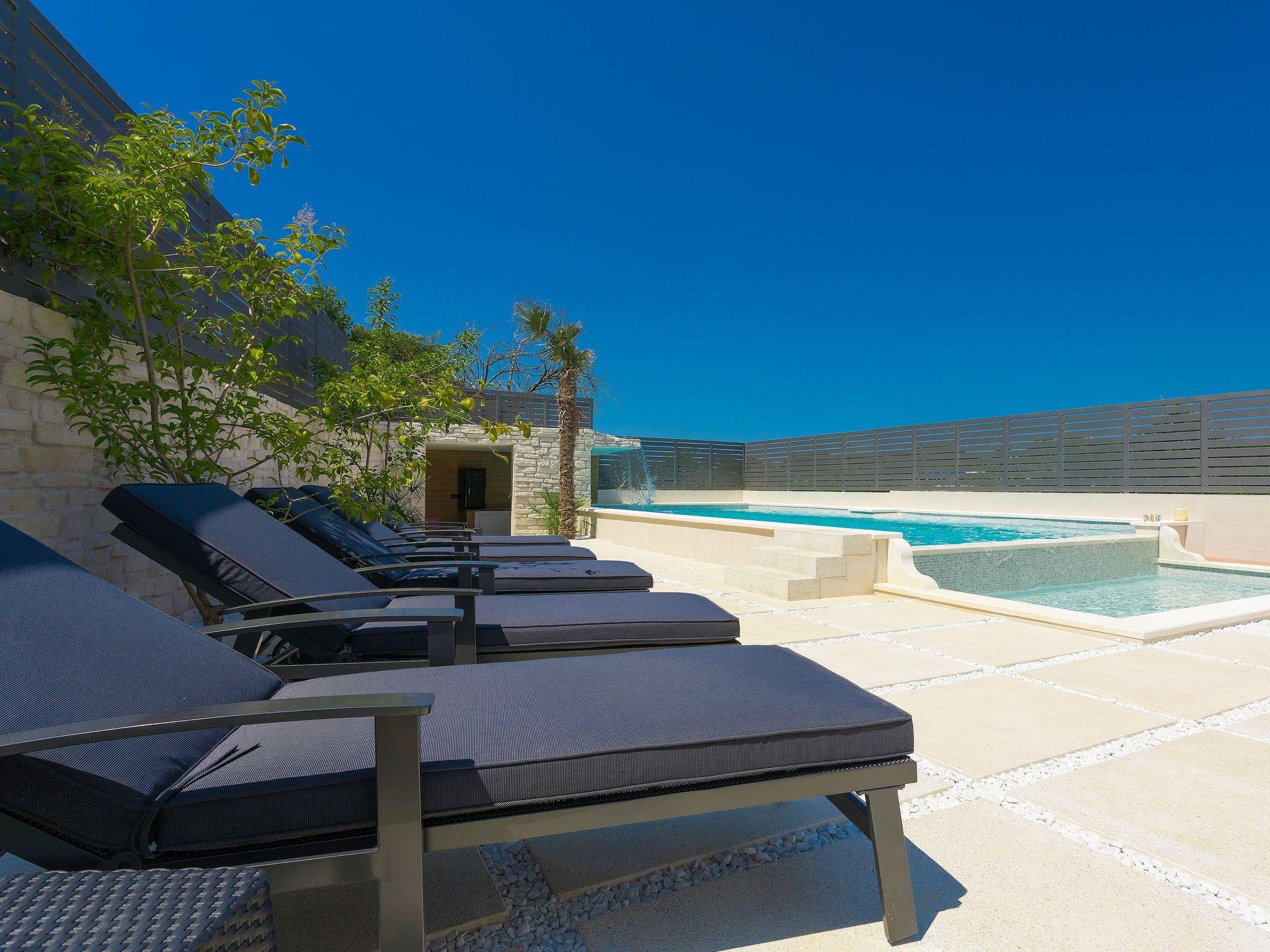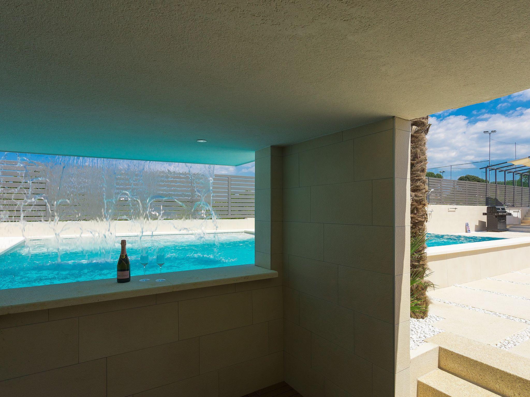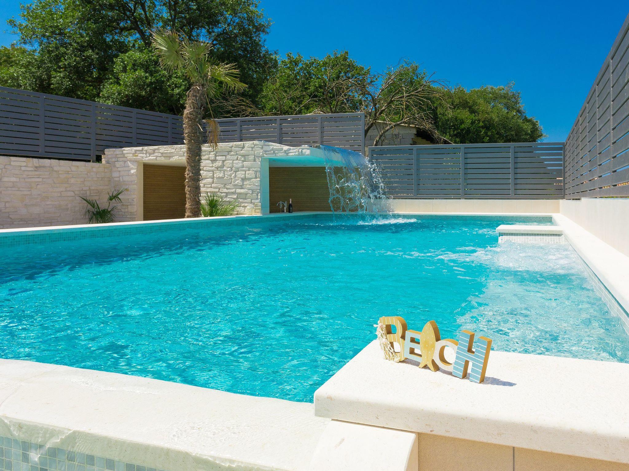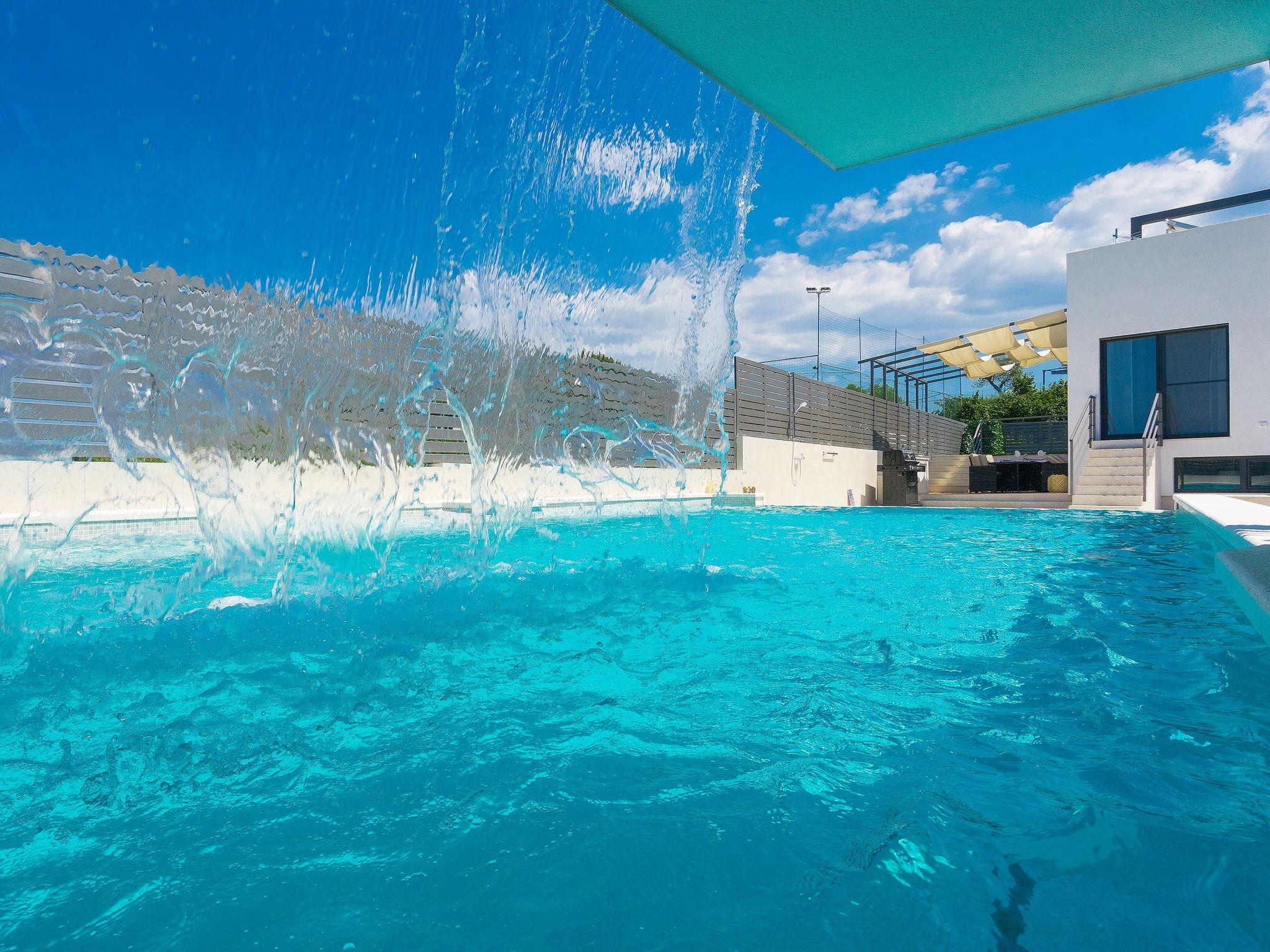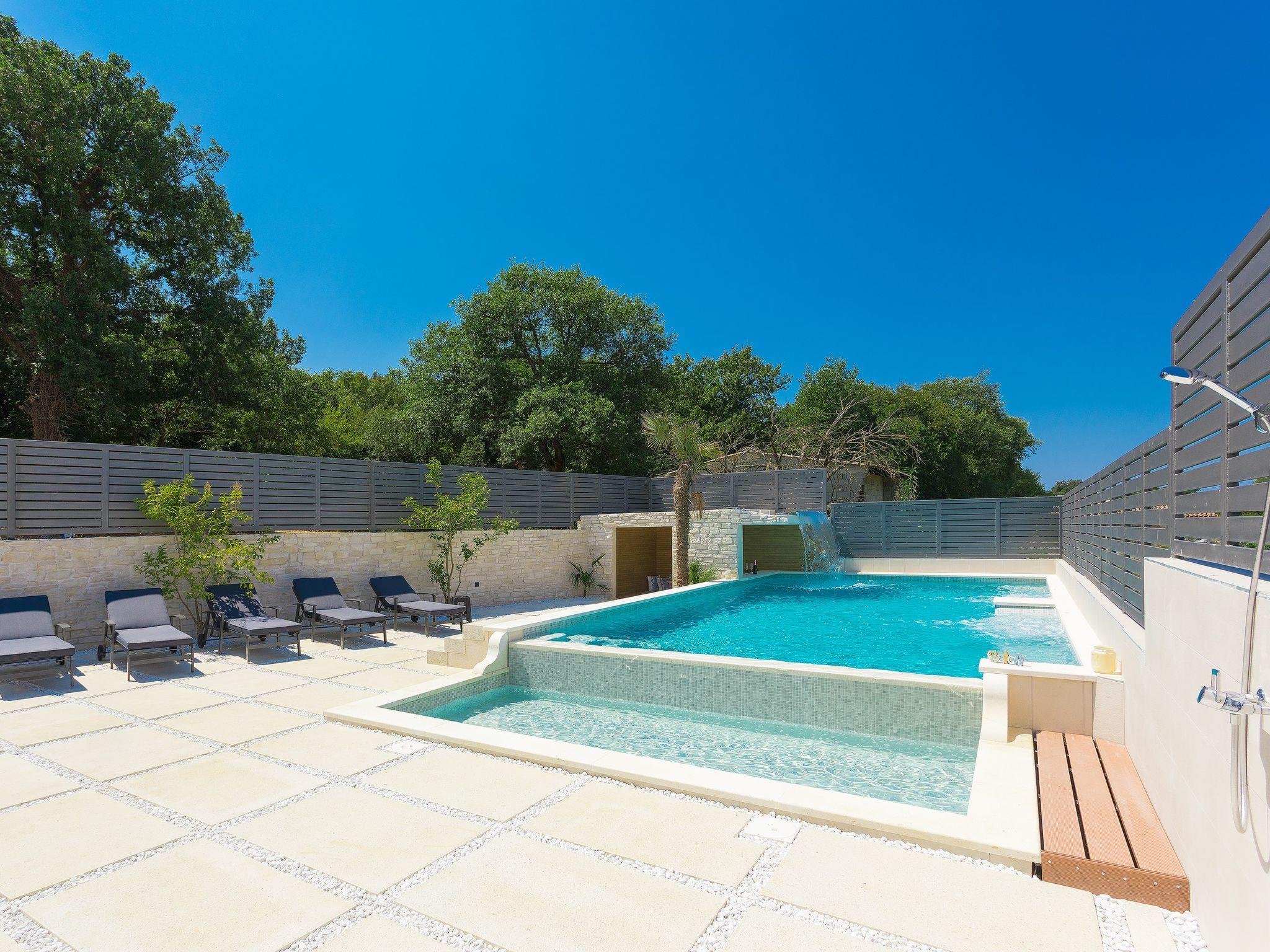 Modern villa "La Mer", 2 storeys. In the district of Veli Vrh 3 km from the centre of Pula, in a sunny position, 3 km from the sea, in a cul-de-sac. For shared use: children's playground (slide, swing). Private: property 400 m2 (fenced), garden with wildlife garden, swimming pool angular (12 x 5 m, depth 140 cm, seasonal availability: 01.Jan. - 31.Dec.) with internal staircase. Paddling pool, outdoor shower, terrace (20 m2), garden furniture. In the house: internet access, washing machine. Parking at the house on the premises. Shop 1 km, supermarket 2.5 km, restaurant 1 km, bus stop 400 m, pebble beach 4.5 km, rocky beach 4.5 km. Tennis 5 km, walking paths from the house 200 m, cycle lane 250 m. Nearby attractions: Amphitheater 3 km, NP Brijuni 6 km.