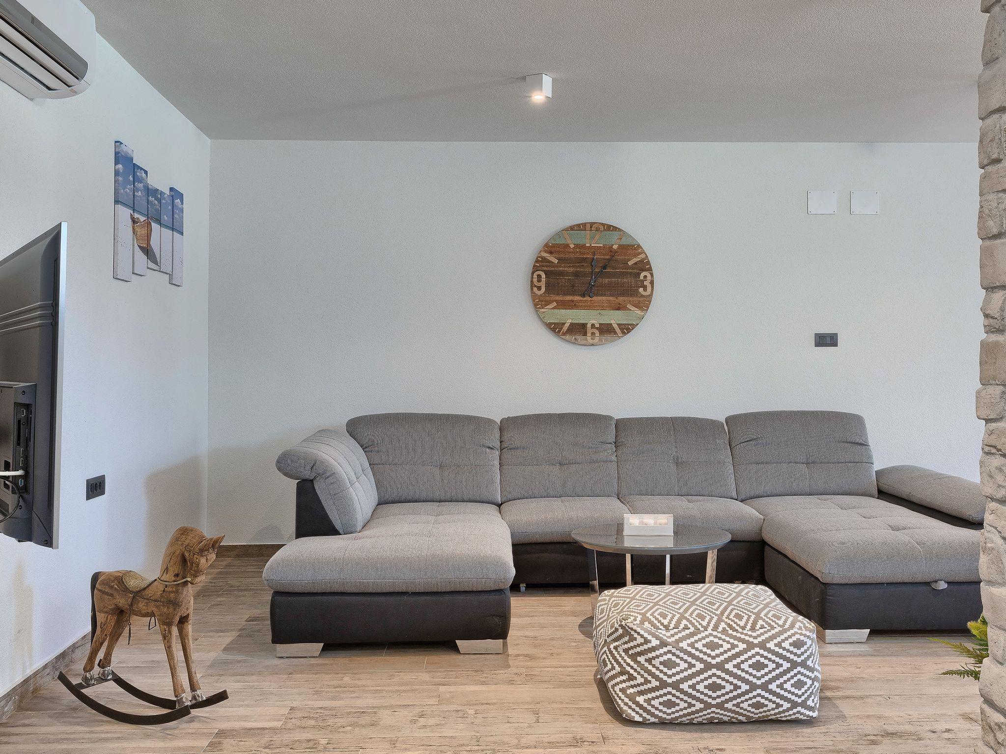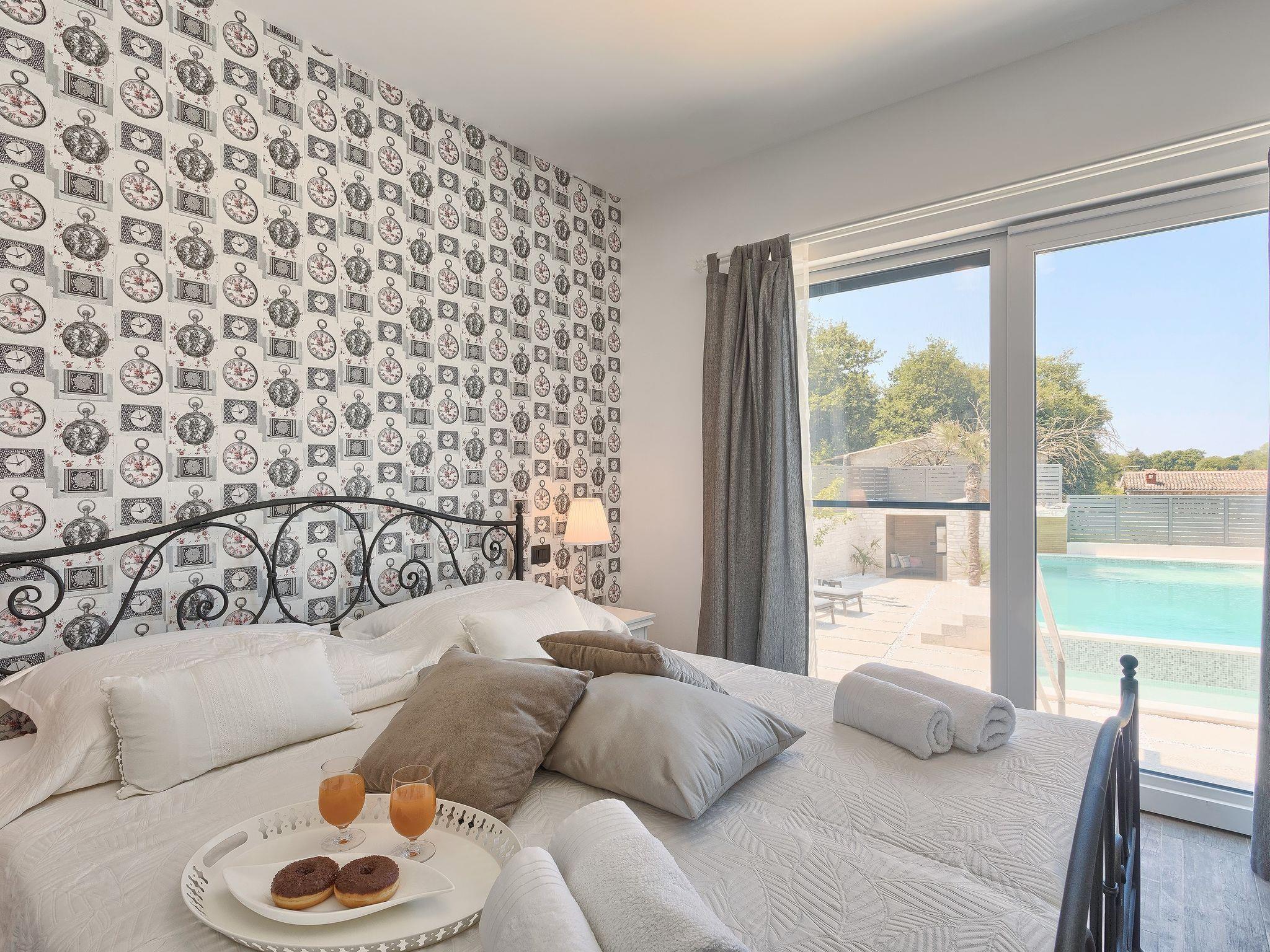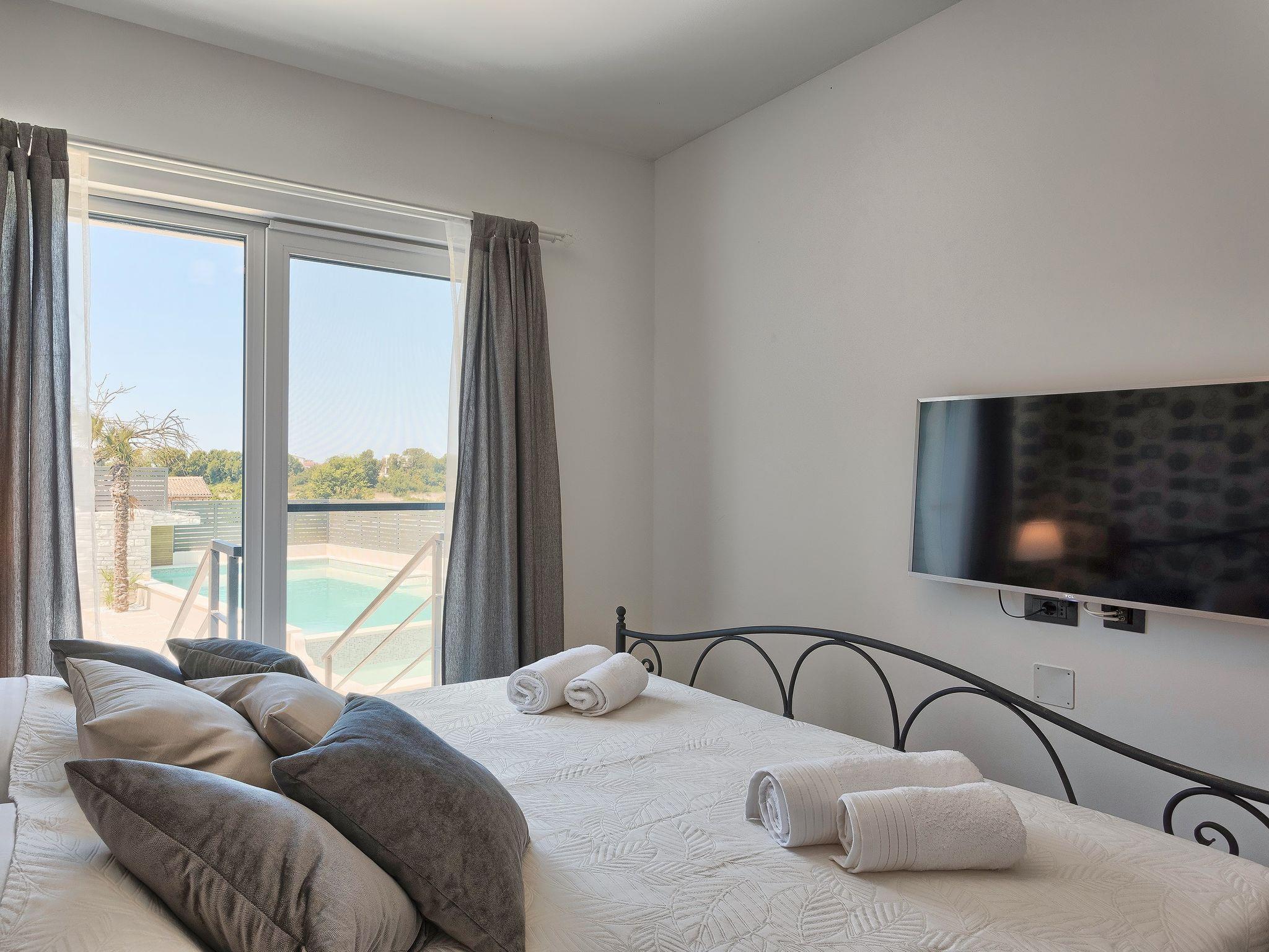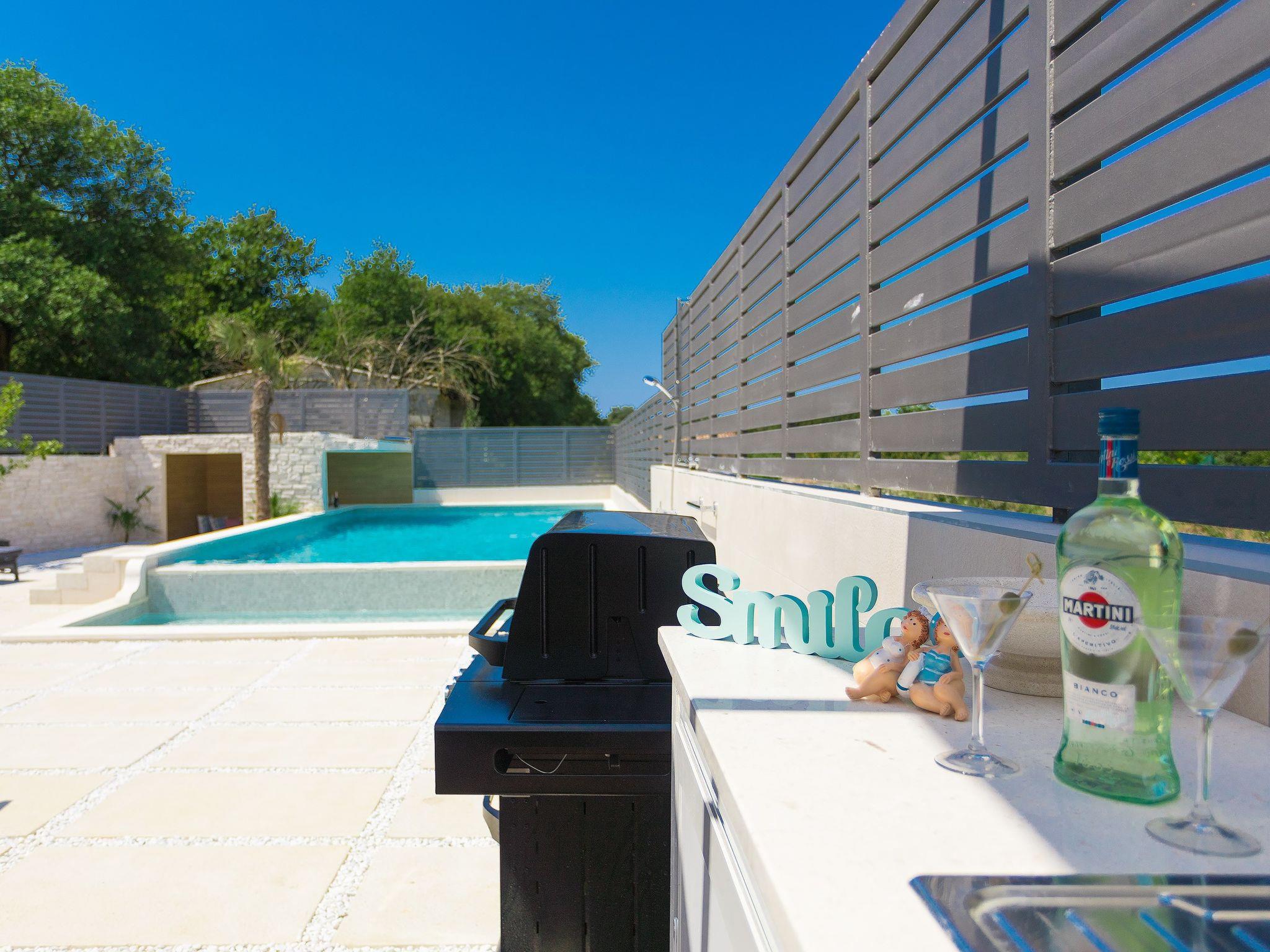 Modern villa "La Mer", 2 storeys. In the district of Veli Vrh 3 km from the centre of Pula, in a sunny position, 3 km from the sea, in a cul-de-sac. For shared use: children's playground (slide, swing). Private: property 400 m2 (fenced), garden with wildlife garden, swimming pool angular (12 x 5 m, depth 140 cm, seasonal availability: 01.Jan. - 31.Dec.) with internal staircase. Paddling pool, outdoor shower, terrace (20 m2), garden furniture. In the house: internet access, washing machine. Parking at the house on the premises. Shop 1 km, supermarket 2.5 km, restaurant 1 km, bus stop 400 m, pebble beach 4.5 km, rocky beach 4.5 km. Tennis 5 km, walking paths from the house 200 m, cycle lane 250 m. Nearby attractions: Amphitheater 3 km, NP Brijuni 6 km.