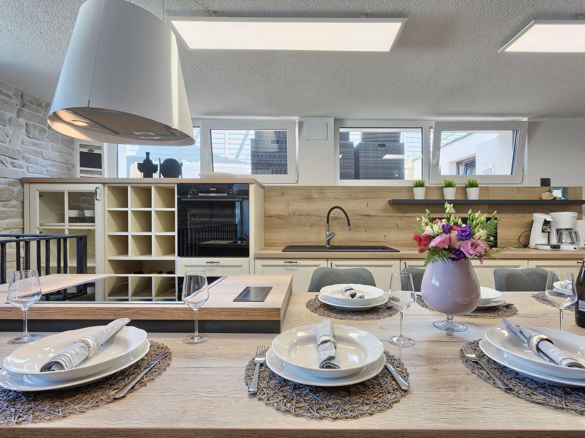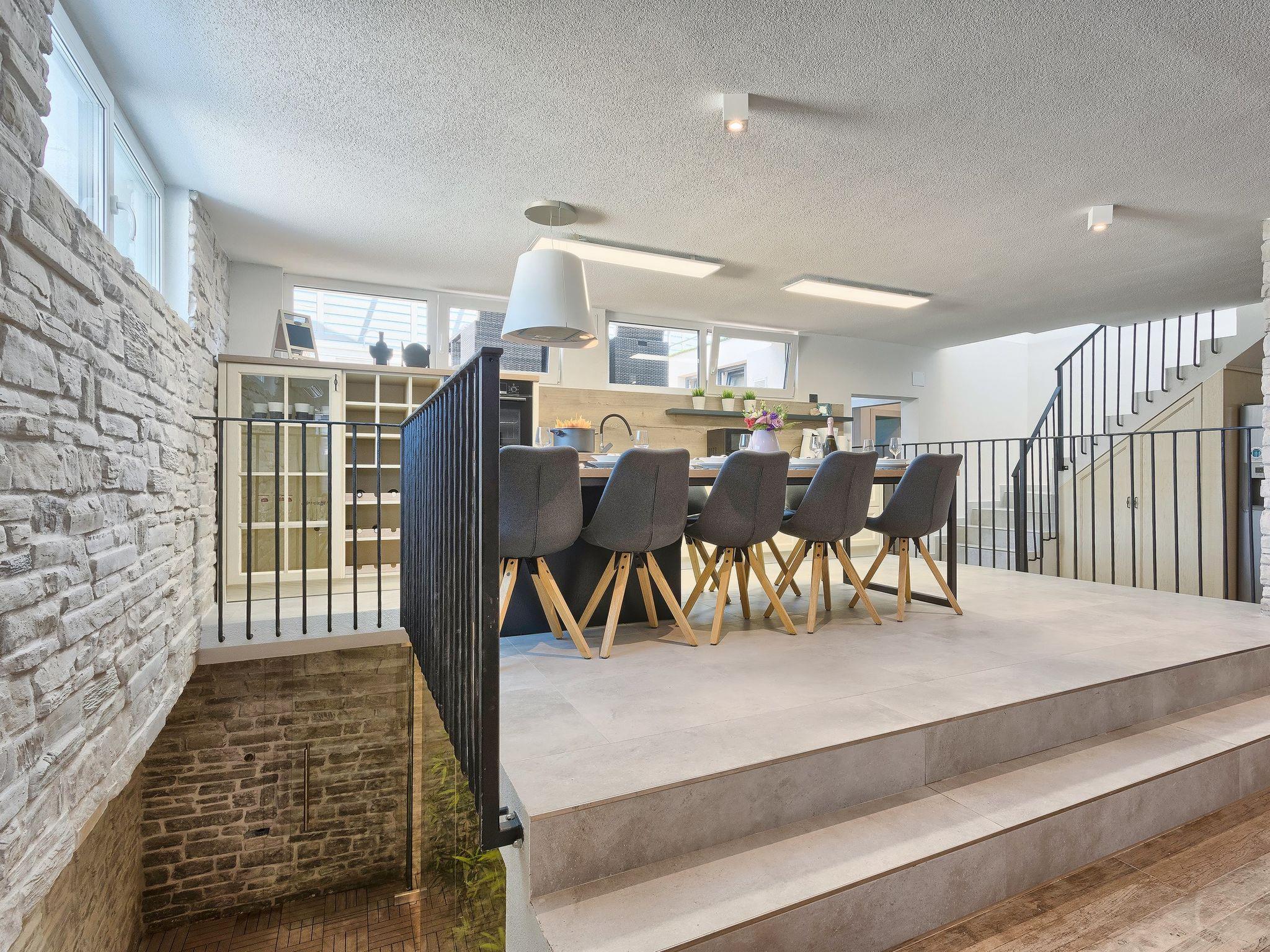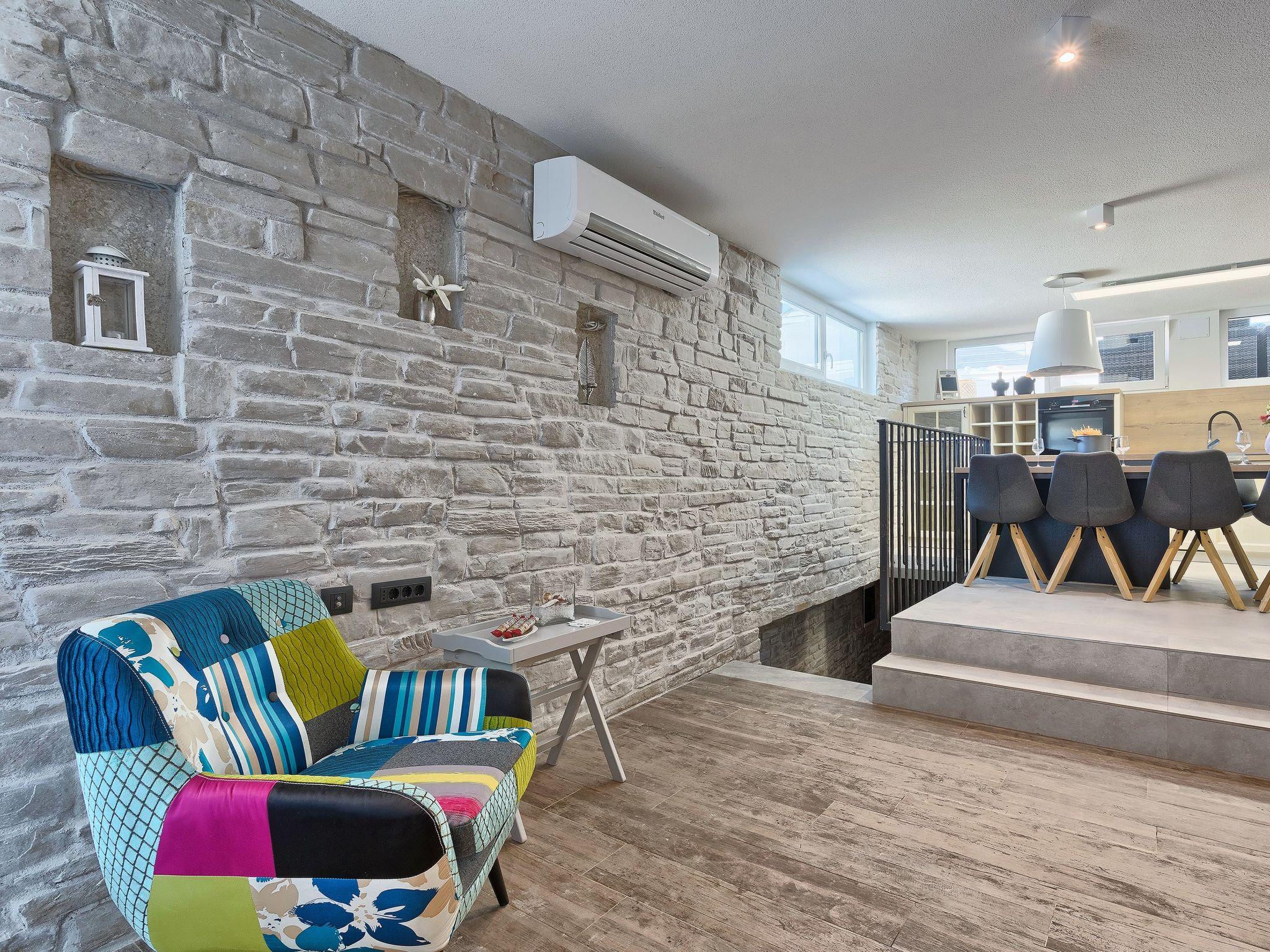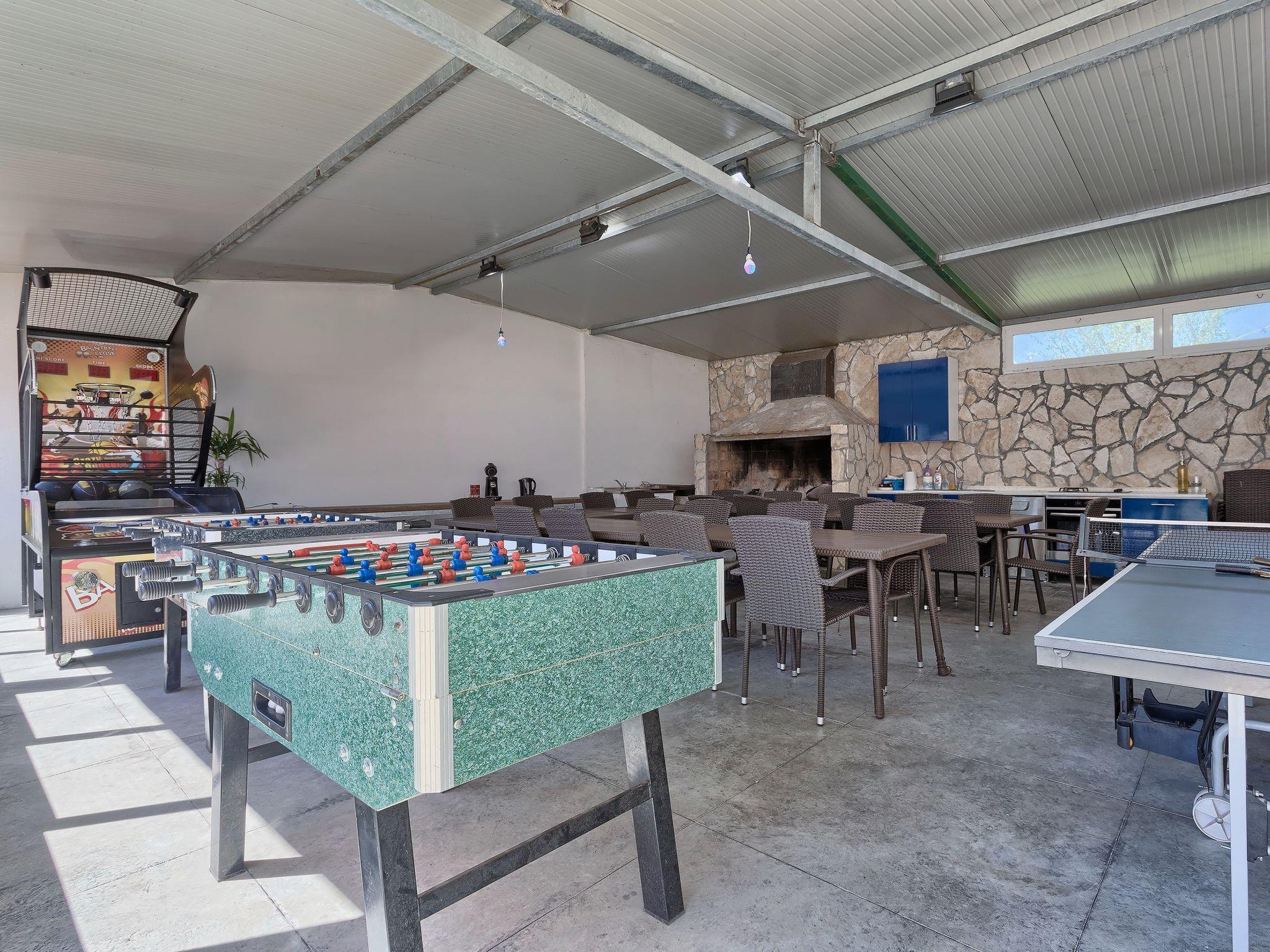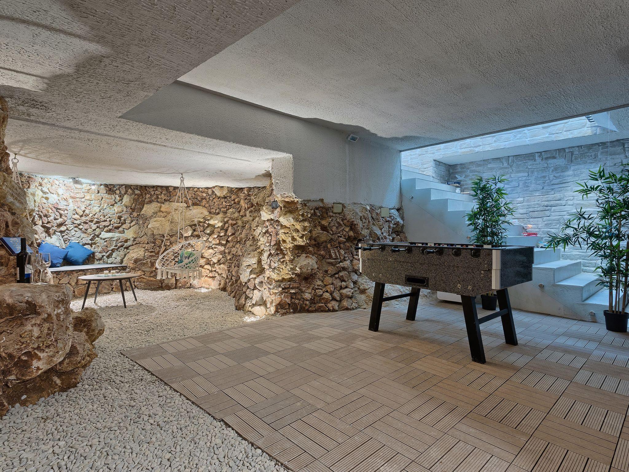 4-room villa 200 m2 on 2 levels. 2 rooms, each room with 1 french bed (180 cm, length 200 cm), shower/WC and satellite TV (flat screen), air conditioning. Exit to the swimming pool. On the lower ground floor: living/dining room with 1 double sofabed (160 cm, length 200 cm), satellite TV (flat screen), air conditioning. Exit to the garden, to the swimming pool. 1 room with 2 beds (90 cm, length 200 cm), shower/WC and satellite TV (flat screen), air conditioning. Open kitchen (oven, dishwasher, 4 ceramic glass hob hotplates, microwave, freezer, electric coffee machine). Sep. WC. Forced-air heating. Barbecue (portable), deck chairs. Facilities: safe, children's high chair, hair dryer. Internet (WiFi, free). 1 small pet/ dog allowed. Dining/living area, open kitchen and one bedroom on low ground floor. Highly placed windows in the bedroom with 2 beds. Available: cave arranged as lounge in the basement.