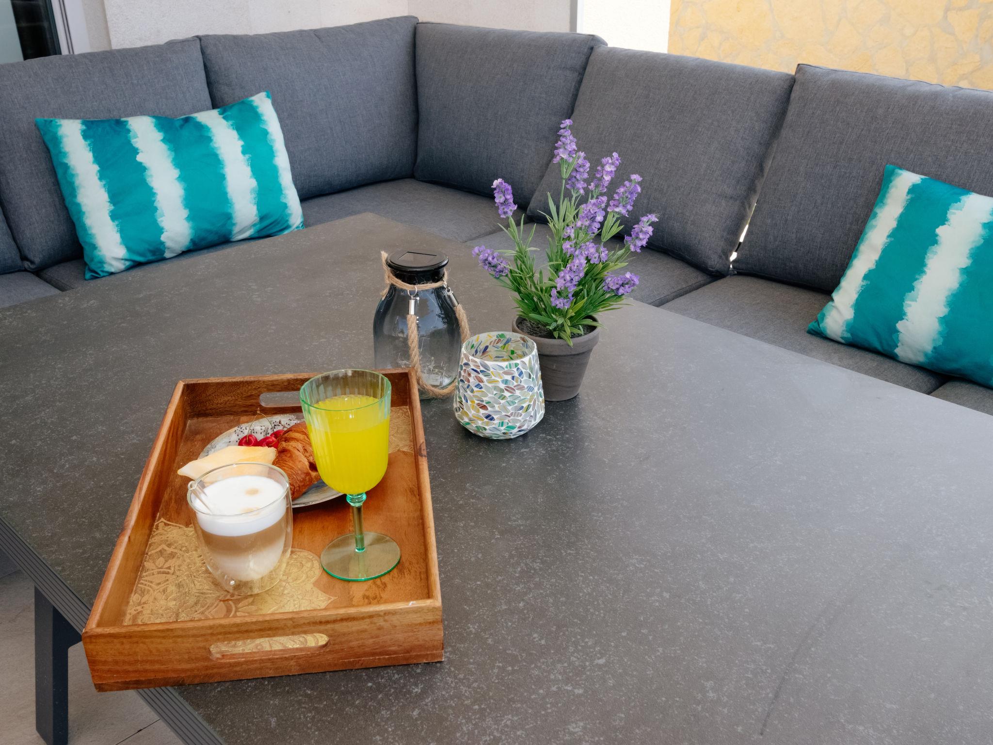 4-room villa 150 m2 on 2 levels. Living/dining room with satellite TV (flat screen), air conditioning. Exit to the terrace, to the swimming pool. 1 room with 1 french bed (180 cm, length 200 cm), satellite TV (flat screen), air conditioning. Exit to the garden, to the swimming pool. Open kitchen (oven, dishwasher, 4 induction hot plates, toaster, kettle, microwave, freezer, electric coffee machine). Shower/WC, sep. WC. Upper floor: 2 rooms, each room with 1 french bed (180 cm, length 200 cm), satellite TV (flat screen), air conditioning. Exit to the terrace. Shower/WC. No heating option. Deck chairs. Facilities: hair dryer. Internet (WiFi, free). Please note: non-smoking house. 1 pet/ dog allowed.