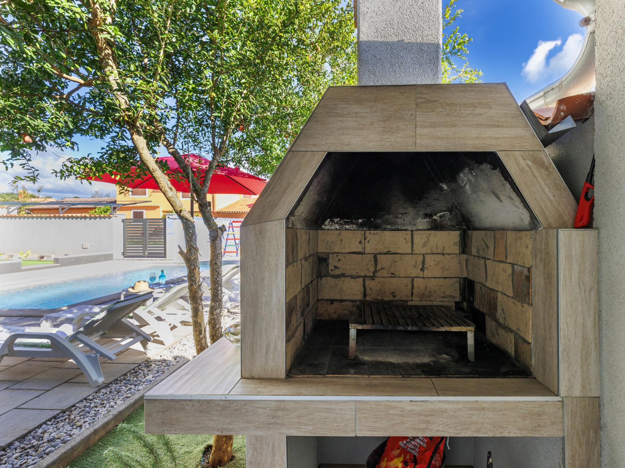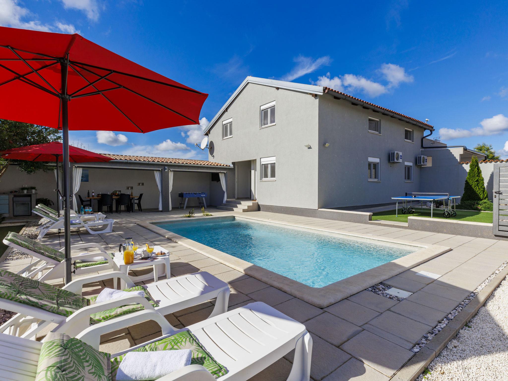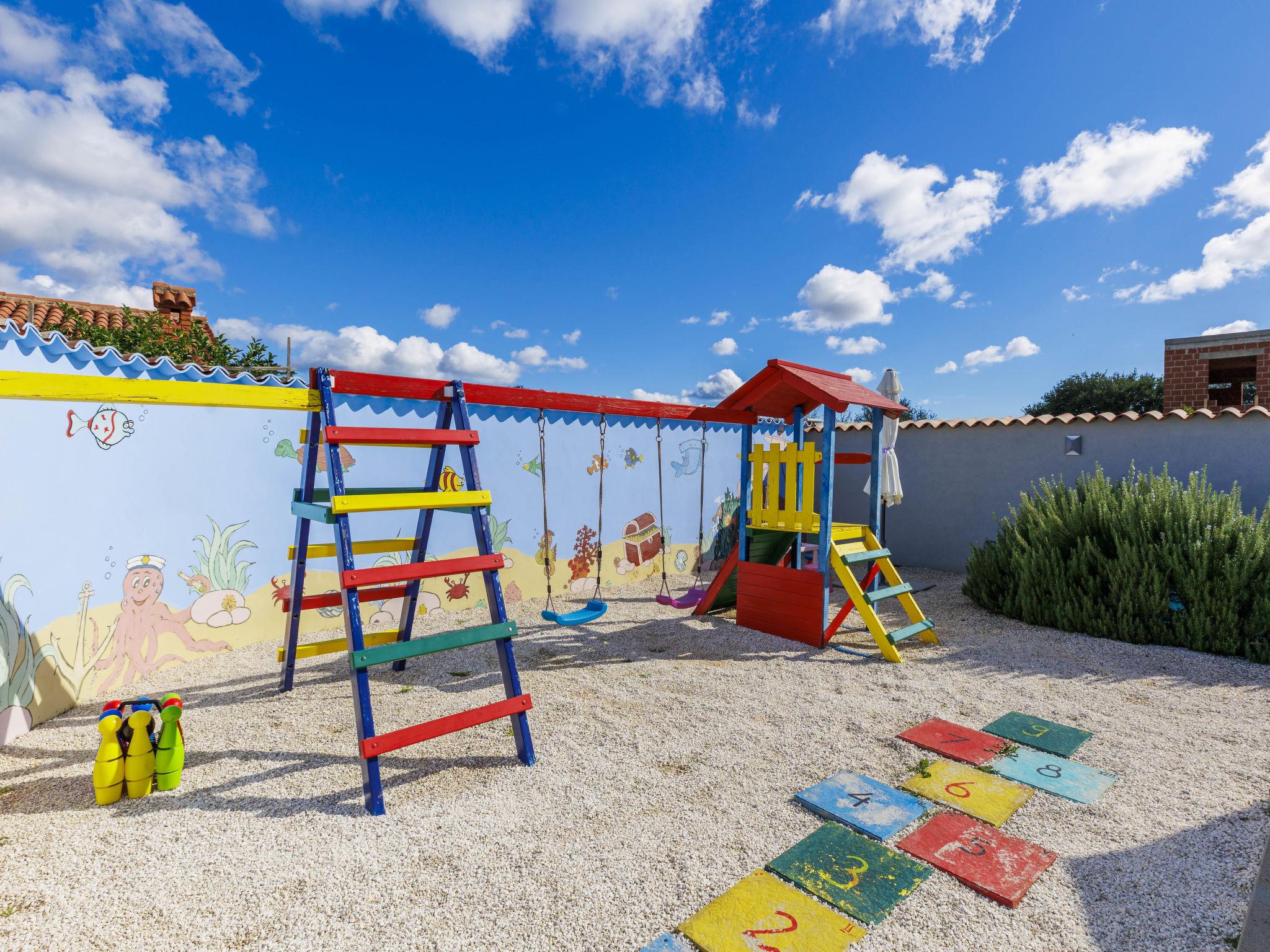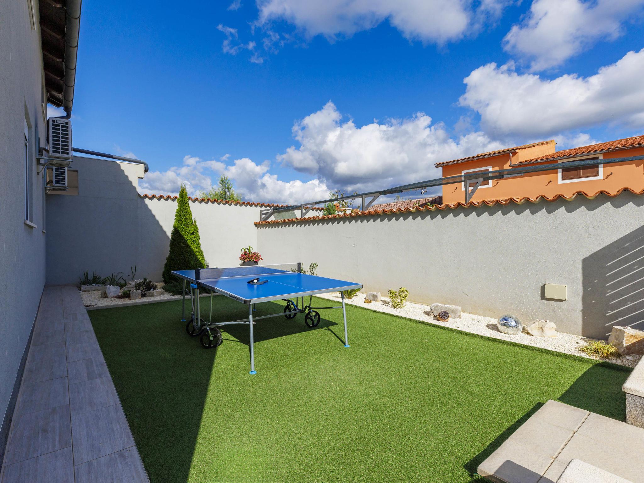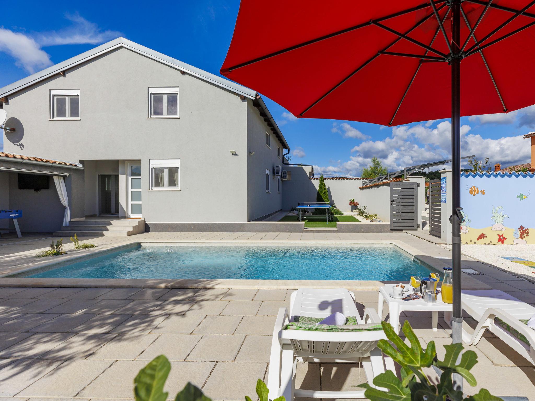 Beautiful 2-family house "David". In the hamlet Loborika 6.5 km from the centre of Pula, 6.5 km from the centre of Marcana, in a quiet, sunny position, 9 km from the sea. Private: property 250 m2 (fenced), small, beautiful garden with wildlife garden, swimming pool angular (7 x 3 m, 24 m2, depth 140 cm, seasonal availability: 27.Apr. - 28.Sep.) with internal staircase. Outdoor shower, table tennis, terrace (27 m2), barbecue, children's playground (swing). In the house: internet access. Parking at the house on the premises. Shop 1.5 km, supermarket 5 km, restaurant 1 km, café 1.5 km, bus stop 1.2 km, pebble beach 12 km. Tennis 15 km, riding stable 5 km, walking paths from the house 100 m, cycle lane 150 m. Nearby attractions: Amphitheater 8.5 km. Available: darts (included). Outdoor kitchen (2 ceramic glass hob hotplates, fridge).