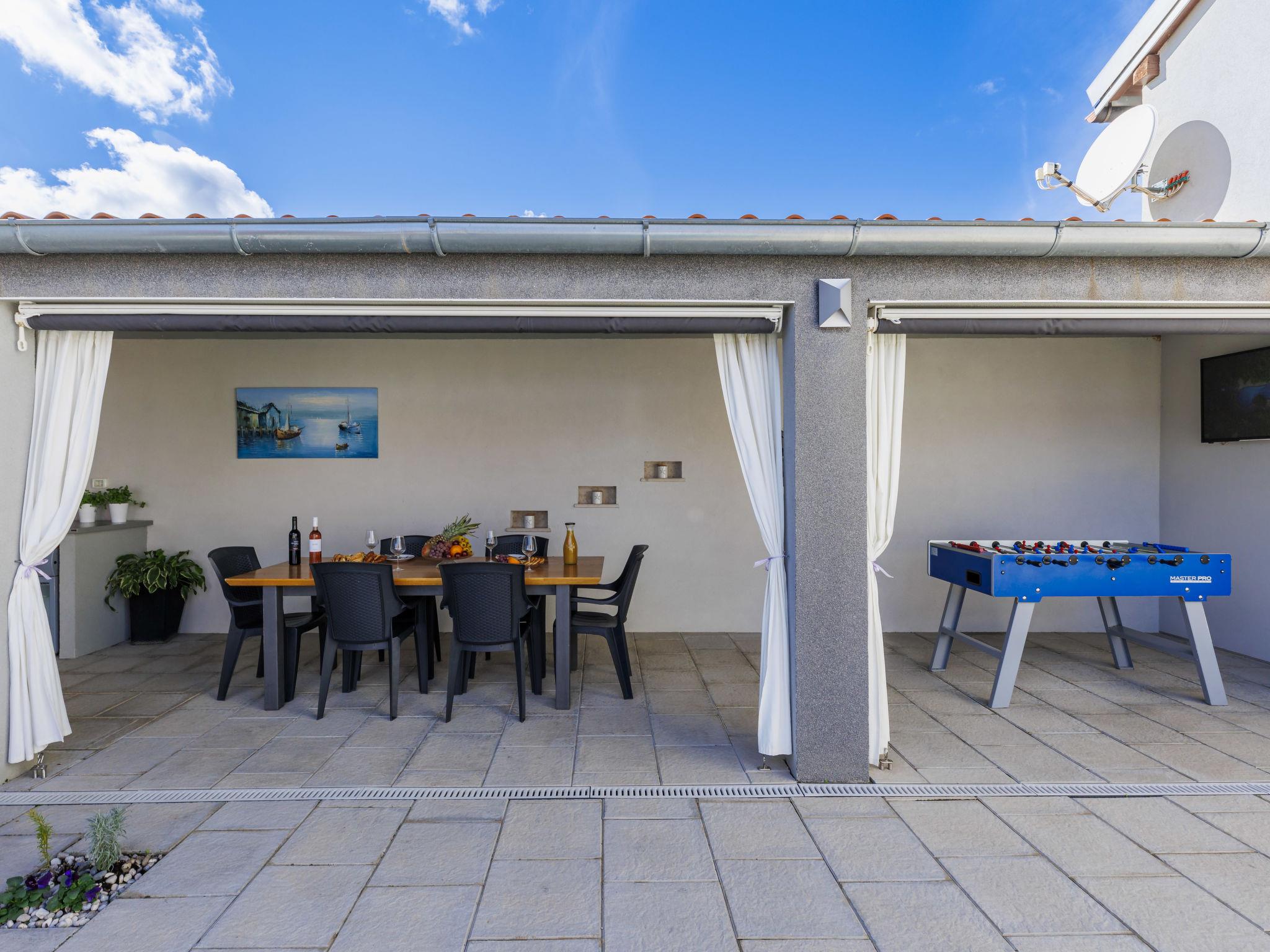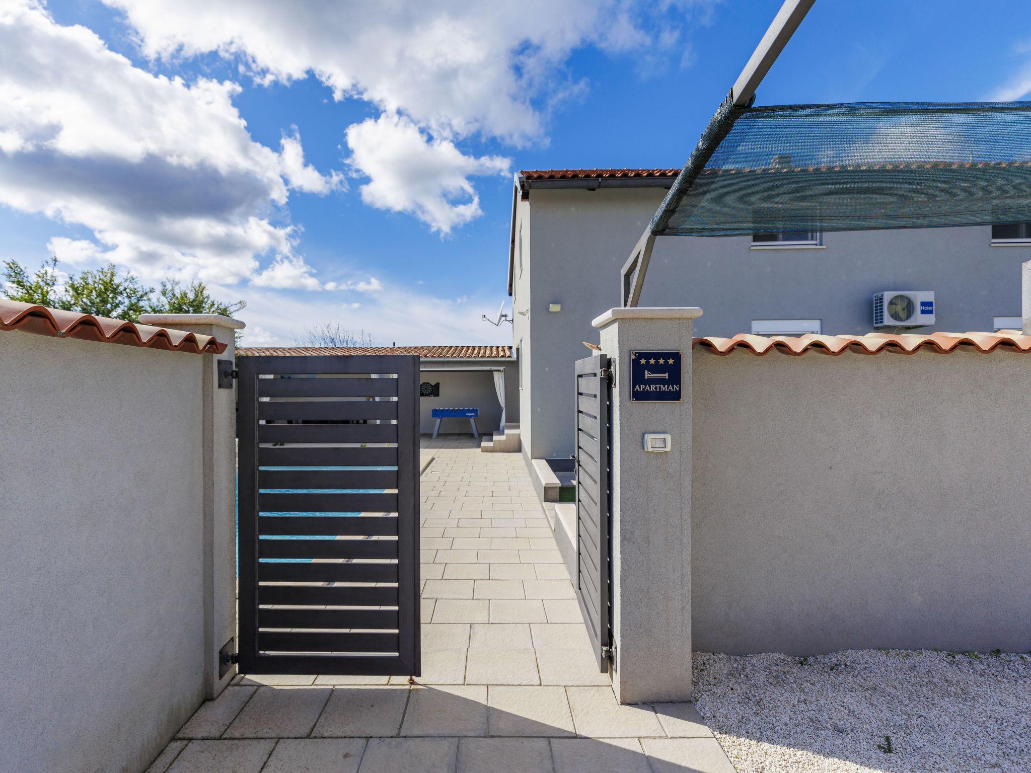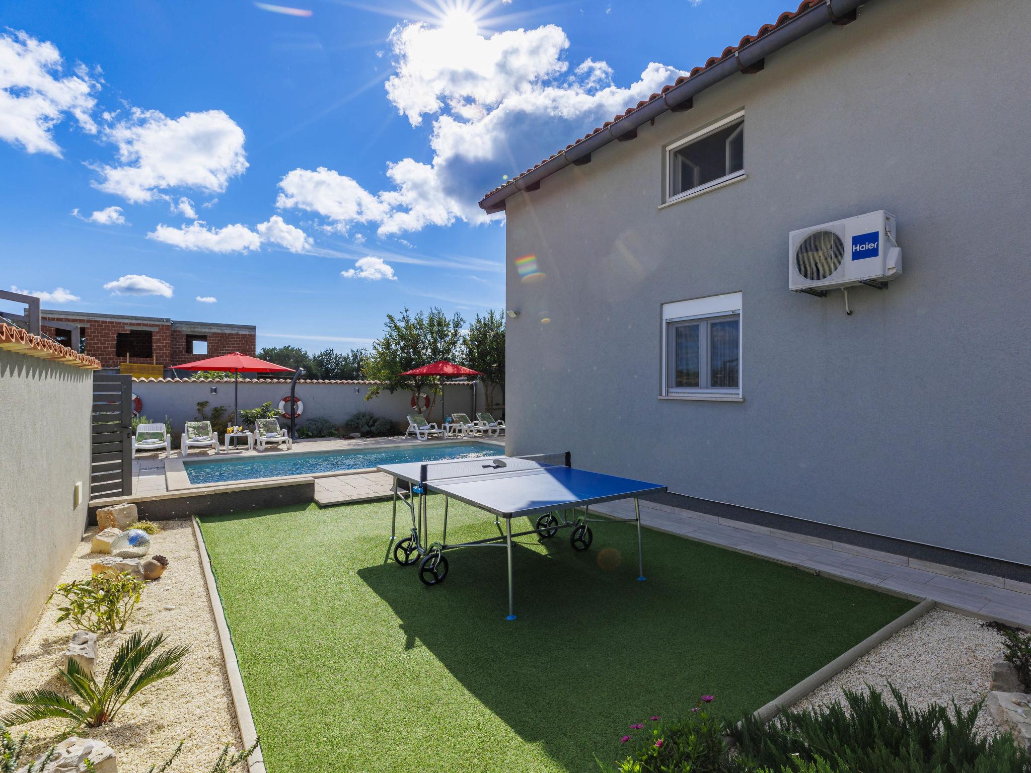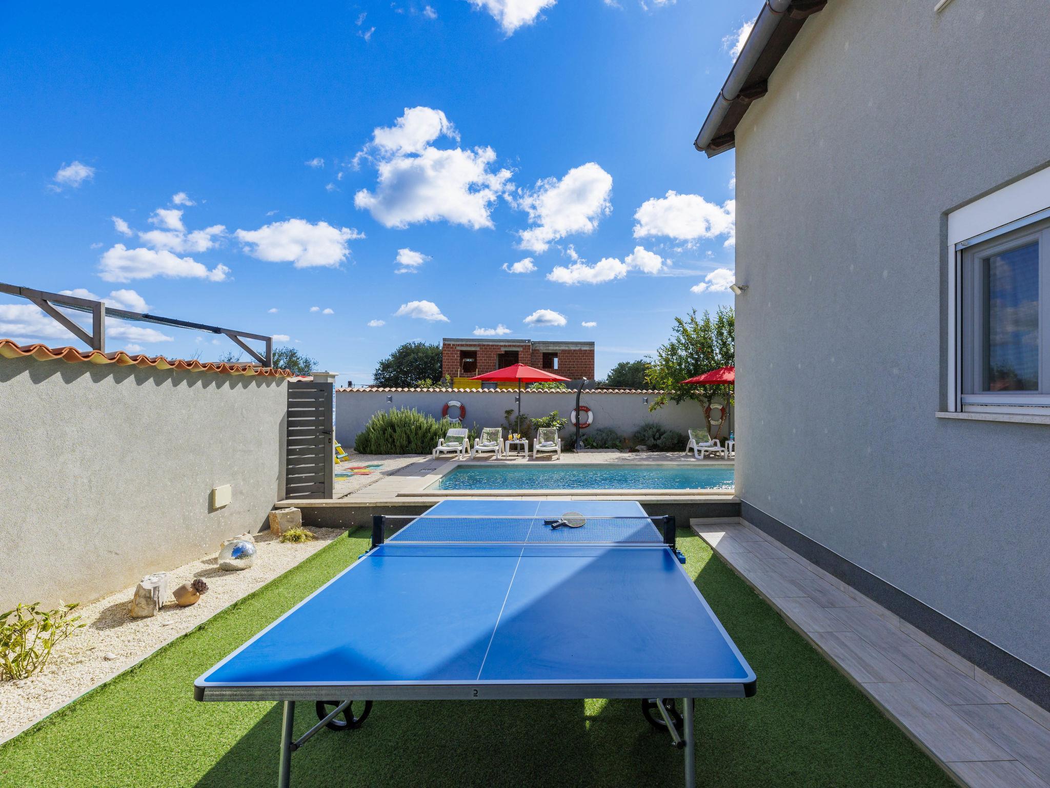 Beautiful 2-family house "David". In the hamlet Loborika 6.5 km from the centre of Pula, 6.5 km from the centre of Marcana, in a quiet, sunny position, 9 km from the sea. Private: property 250 m2 (fenced), small, beautiful garden with wildlife garden, swimming pool angular (7 x 3 m, 24 m2, depth 140 cm, seasonal availability: 27.Apr. - 28.Sep.) with internal staircase. Outdoor shower, table tennis, terrace (27 m2), barbecue, children's playground (swing). In the house: internet access. Parking at the house on the premises. Shop 1.5 km, supermarket 5 km, restaurant 1 km, café 1.5 km, bus stop 1.2 km, pebble beach 12 km. Tennis 15 km, riding stable 5 km, walking paths from the house 100 m, cycle lane 150 m. Nearby attractions: Amphitheater 8.5 km. Available: darts (included). Outdoor kitchen (2 ceramic glass hob hotplates, fridge).