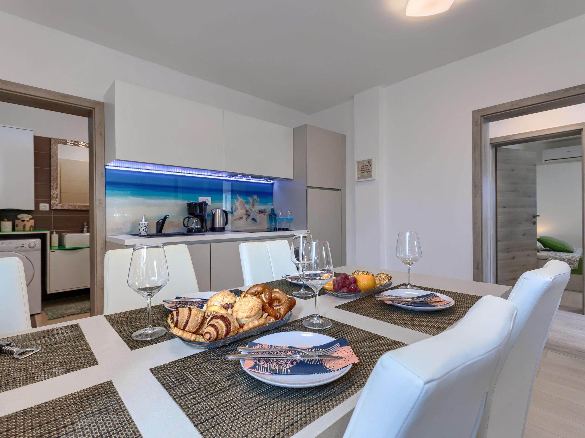 4-room apartment 95 m2, on the ground floor. Comfortable furnishings: living/dining room with 1 sofabed (160 cm, length 200 cm), satellite TV (flat screen), air conditioning. Exit to the terrace, to the swimming pool. 1 room with 1 french bed (160 cm, length 200 cm), satellite TV (flat screen), air conditioning. 1 room with 1 french bed (160 cm, length 200 cm), shower and satellite TV (flat screen), air conditioning. 1 room with 1 bed (90 cm, length 200 cm). Open kitchen (oven, dishwasher, 4 ceramic glass hob hotplates, microwave, freezer, electric coffee machine). 2 showers/WC. Terrace 5 m2, roofed. View of the swimming pool. Facilities: washing machine, dryer, baby cot. Internet (WiFi, free). Maximum 1 pet/ dog allowed.