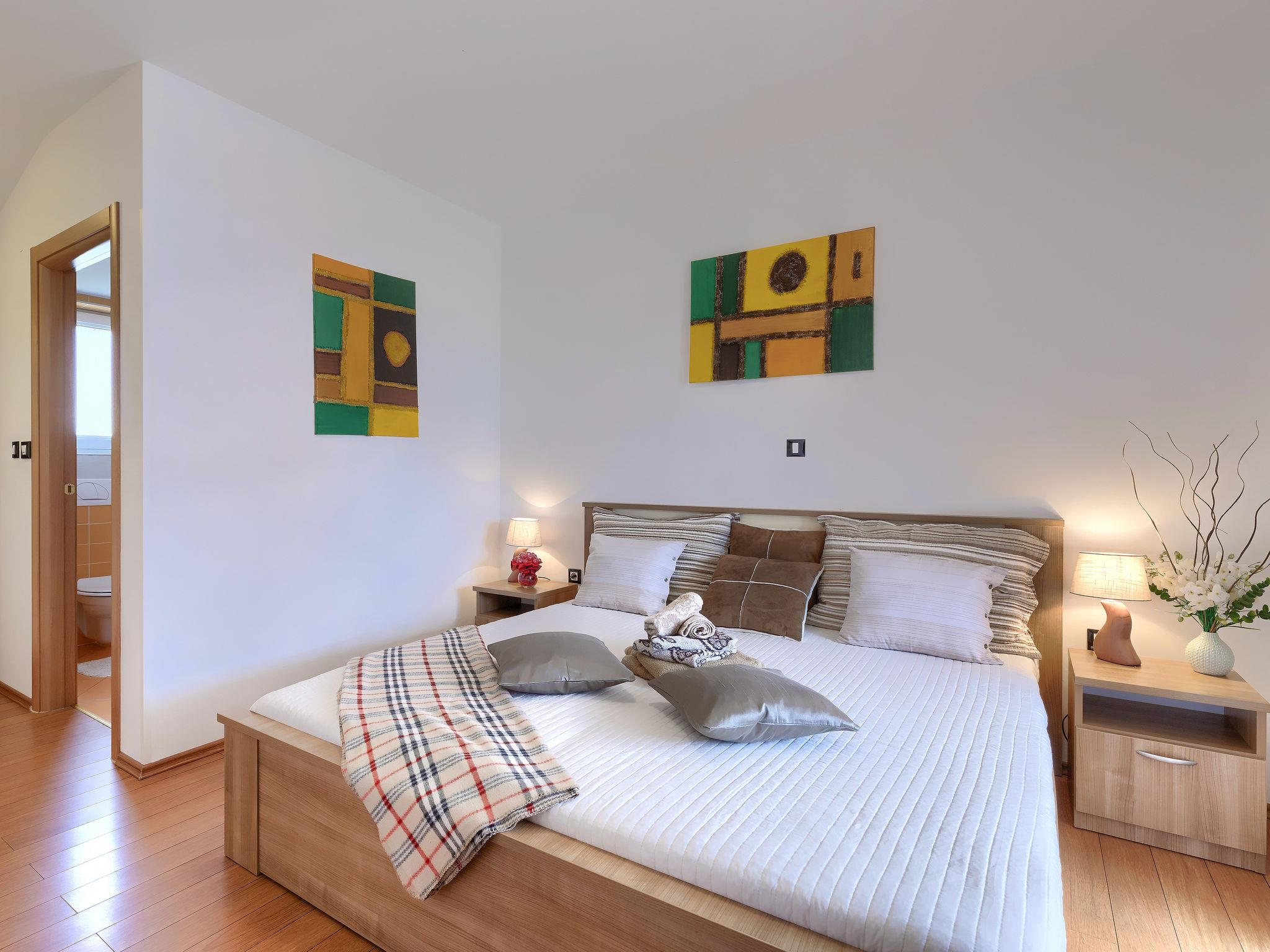 4-room house 145 m2 on 2 levels. Beautiful furnishings: living/dining room with satellite TV (flat screen), air conditioning. Exit to the terrace. Open kitchen (2 hot plates, oven, dishwasher, 2 gas rings, kettle, microwave, freezer, electric coffee machine). Sep. WC. Upper floor: entrance hall with air conditioning. 1 room with 1 double bed (2 x 90 cm, length 200 cm). 1 room with 1 double bed (2 x 90 cm, length 200 cm), air conditioning. 1 room with 1 double bed (2 x 90 cm, length 200 cm), shower/WC. Exit to the terrace. Shower/bidet/WC. No heating option. Terrace 10 m2, roofed, terrace 20 m2 partly roofed. Terrace furniture, barbecue (portable), deck chairs. View of the garden. Facilities: safe, hair dryer. Internet (WiFi, free). Maximum 2 pets/ dogs allowed.