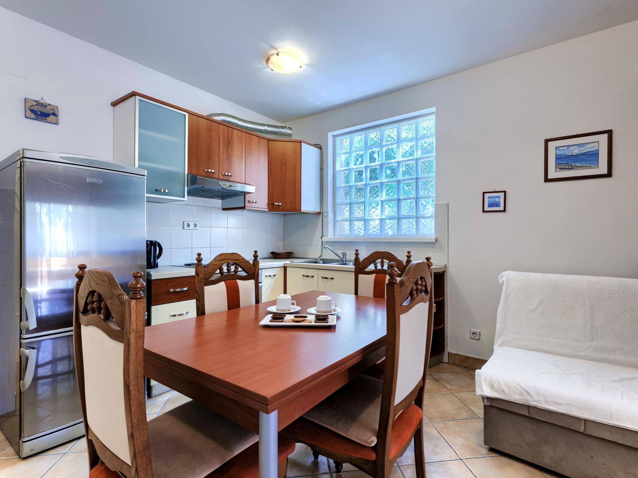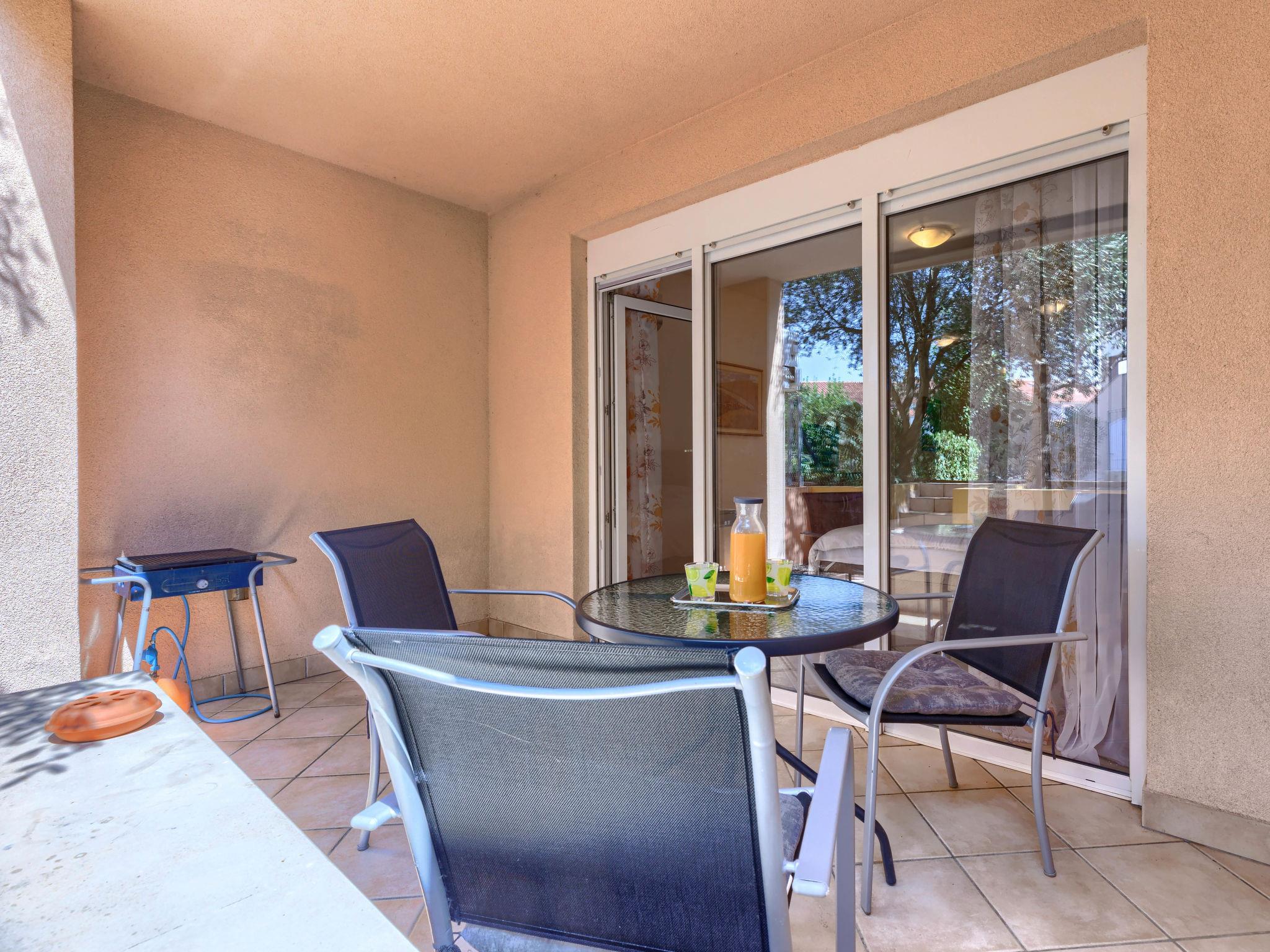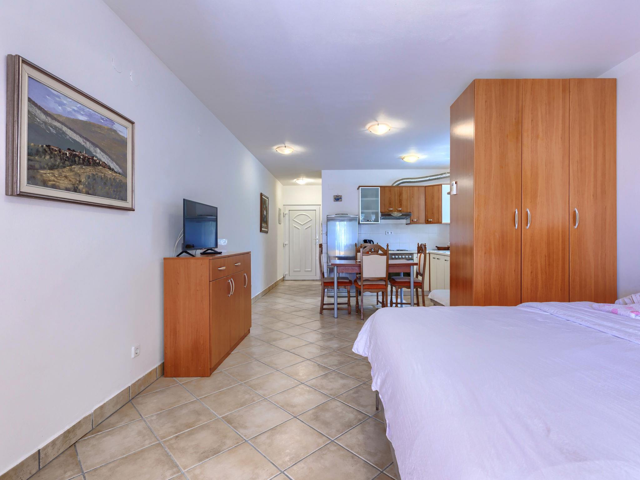 1-room apartment 39 m2, on the ground floor. Studio with 1 sofabed and 1 french bed (150 cm), satellite TV and air conditioning. Exit to the terrace. Open kitchen (4 hot plates, oven, toaster, kettle, freezer, electric coffee machine) with dining table. Shower/WC. Terrace 10 m2 partly roofed. Terrace furniture, barbecue (portable). Facilities: washing machine, iron. Internet (WiFi, free). Please note: non-smokers only.