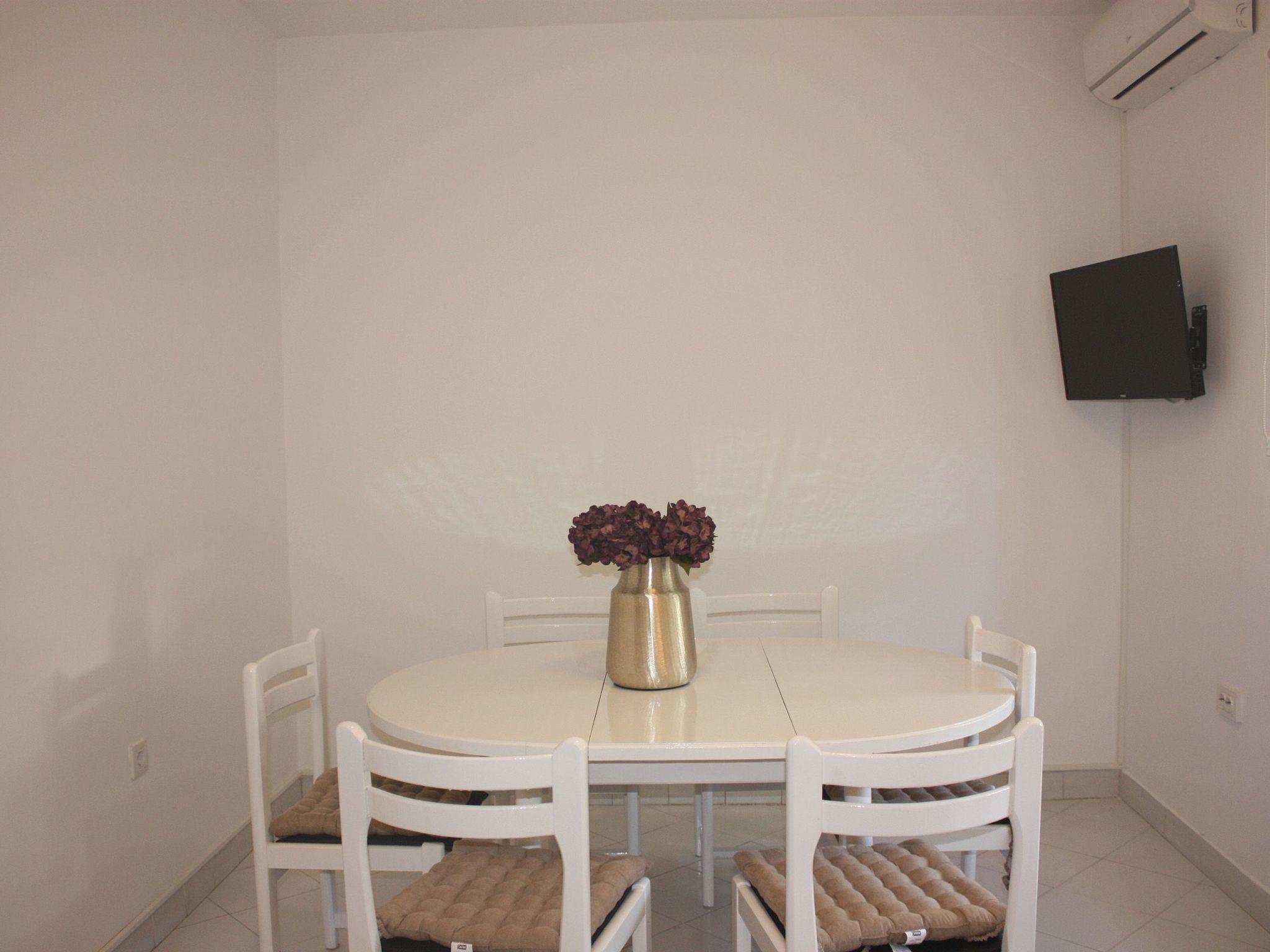 Step inside to discover a beautifully designed interior that merges functionality with style. The apartment boasts three cozy bedrooms, each featuring a double bed (160 x 200cm) to ensure restful nights, with two rooms also equipped with a folding bed (90 x 200cm) for extra guests. Fulfilling your self-catering needs, the new (renovated at 2025) kitchen comes fully equipped with a electric cooker, electric glass ceramic stove, oven, fridge with freezer compartment, coffee machine, dishwasher, and more. The living area, complete with air conditioning, offers a comfortable seating area with TV and a dining table for eight, making it a delightful space for gathering and dining.