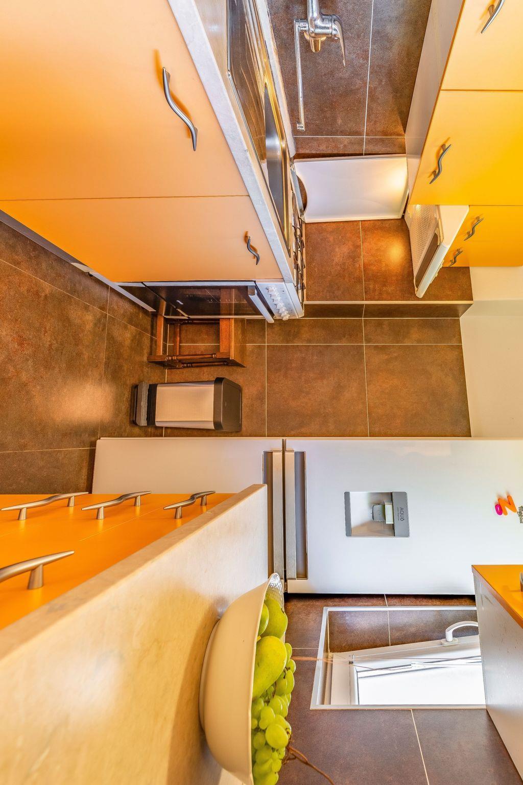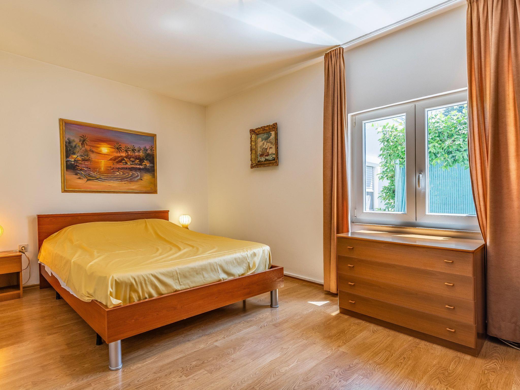 The accommodation consists of two independent flats, one on the ground floor and one on the first floor. The lower floor offers 70 square metres of space for six persons, while the upper floor is slightly larger at 90 square metres and is also suitable for six persons. Both flats consist of a kitchen, living/dining room, bathroom and two bedrooms with double beds (three of which measure 2.00 x 1.80 metres and one 2.00 x 1.60 metres). One of the upstairs bedrooms also has a single bed (80 x 190 cm). In each living room there is a sofa bed (2.00 x 2.00 m and 2.00 x 1.60 m), making a total of twelve beds. All rooms are equipped with heating and air conditioning. Internet access (Wi-Fi) is free of charge.