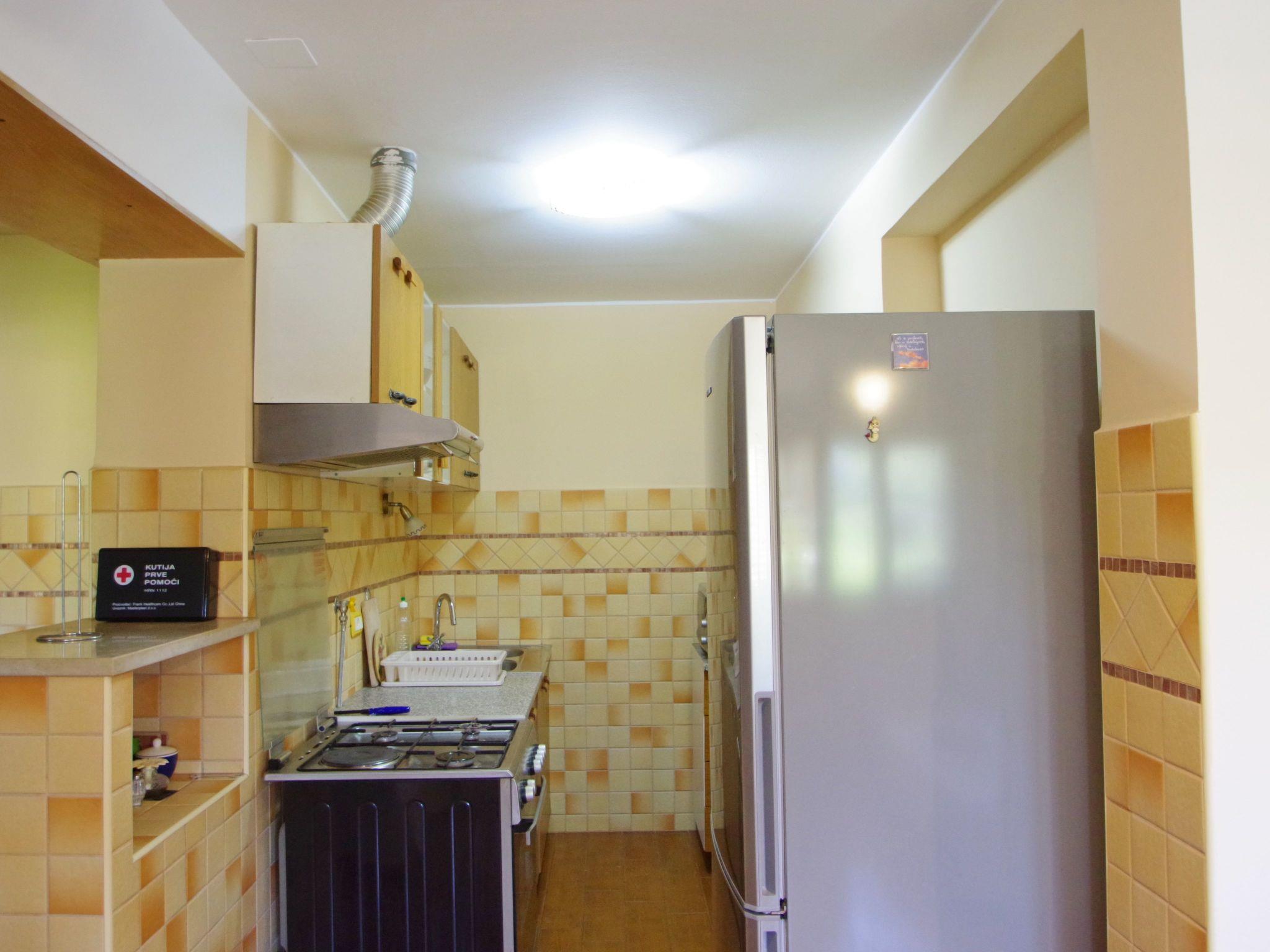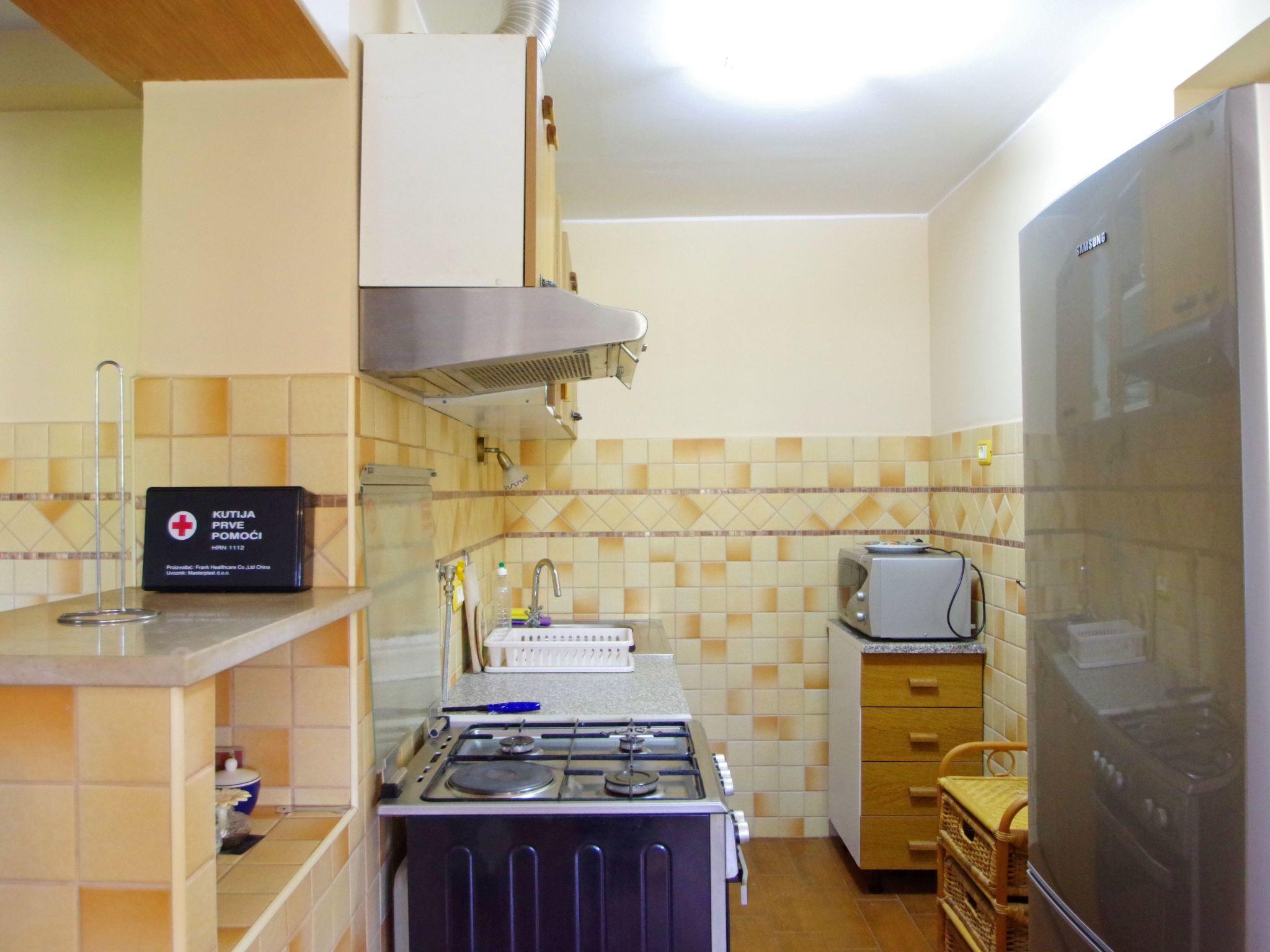 -kitchen with dining table (equipment: stove : 1 electrical + 3 gas cooking rings, coffee machine, kettle, refrigerator with freezing compartment, microwave oven, oven, cooking hood, toaster, cooking utensils)
