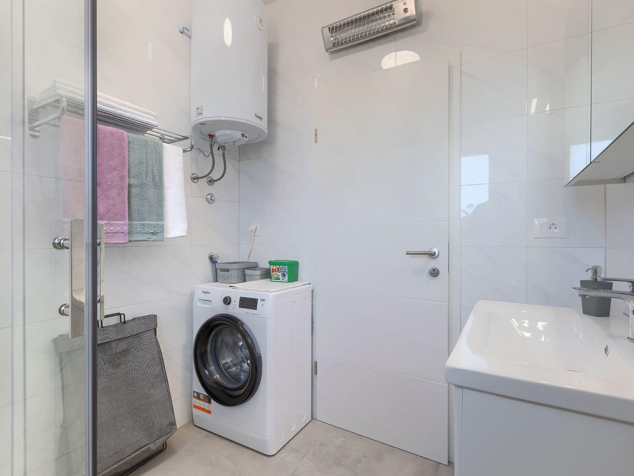 Bathroom: shower, wc, sink, hair dryer, washing machine