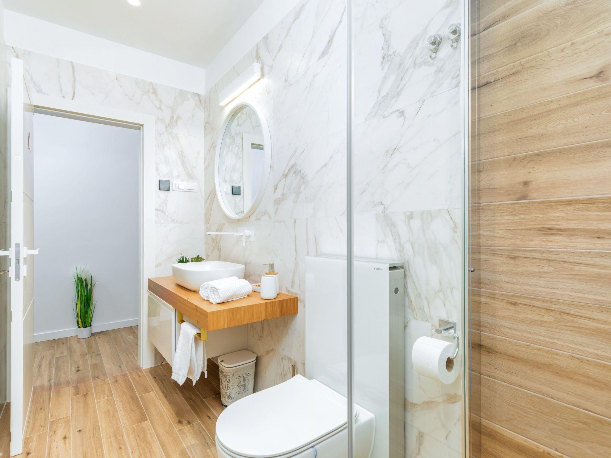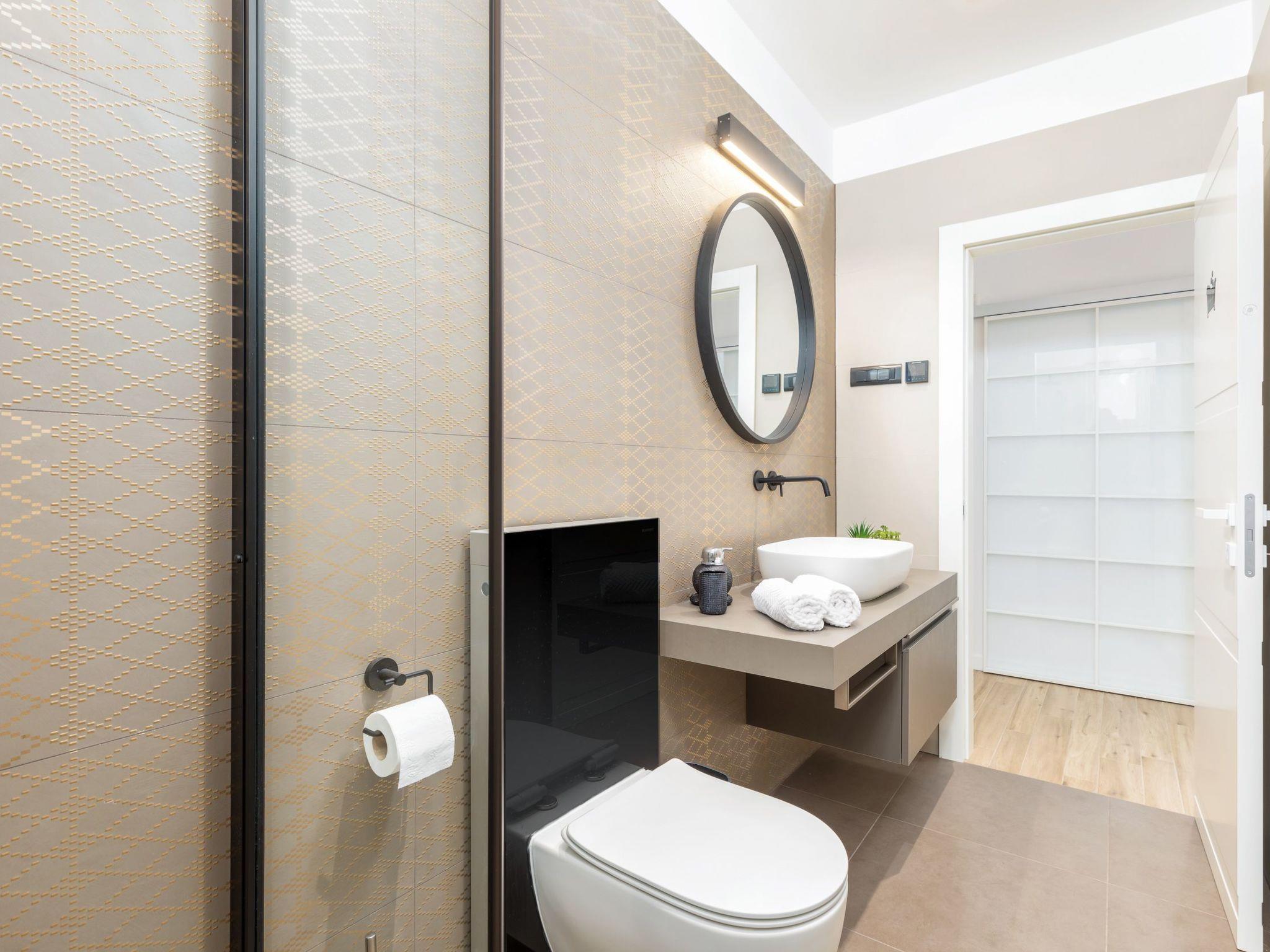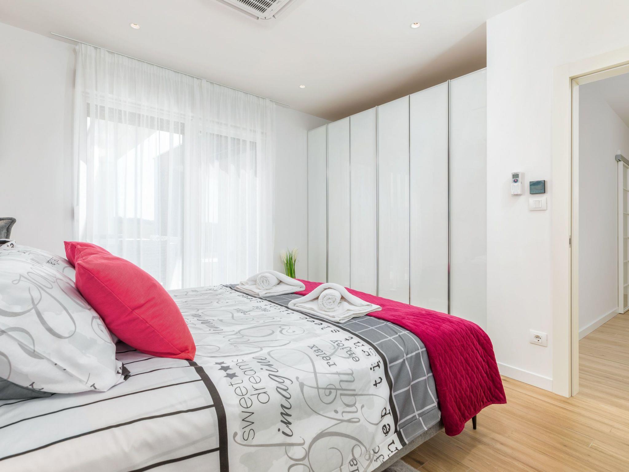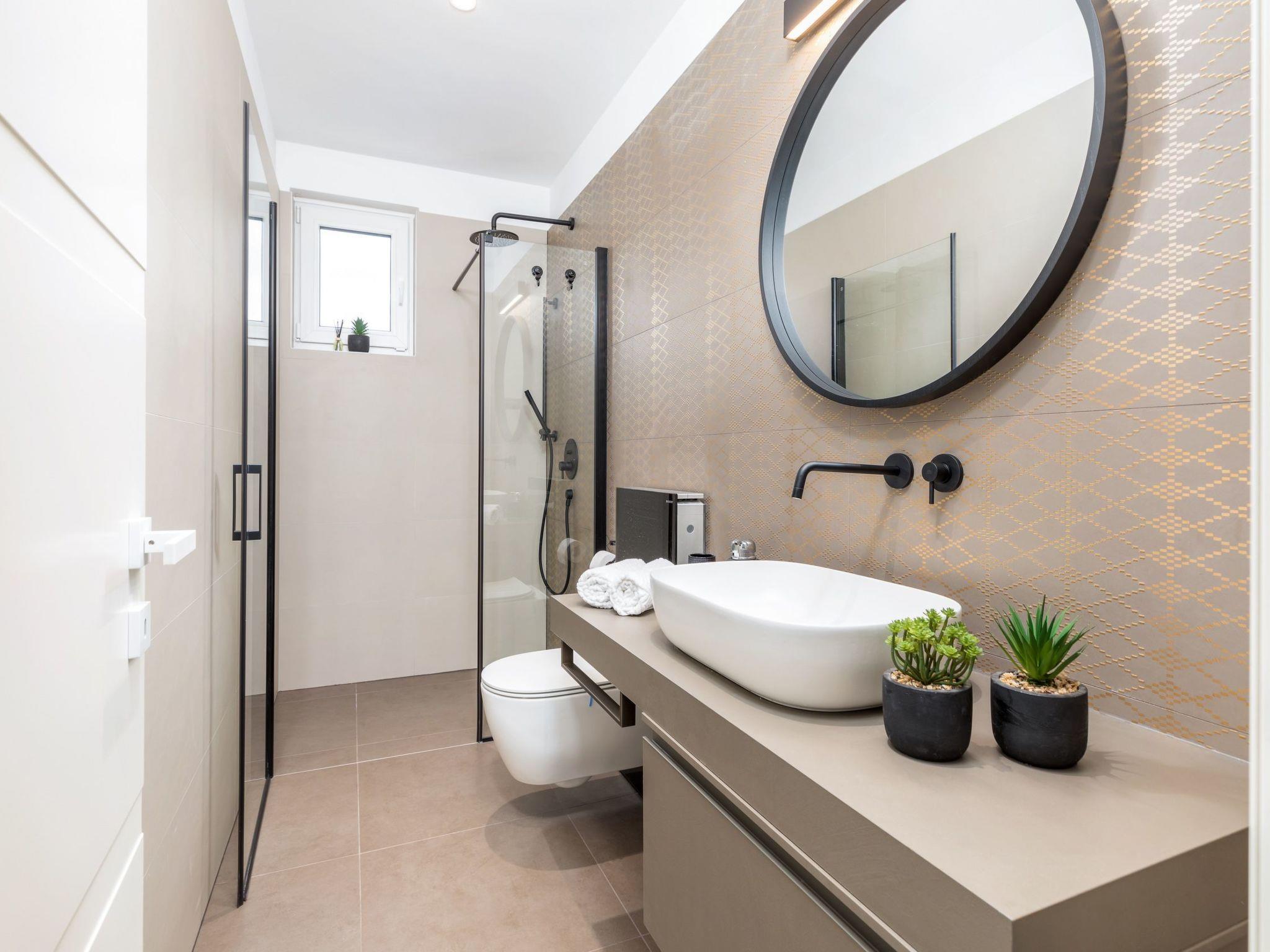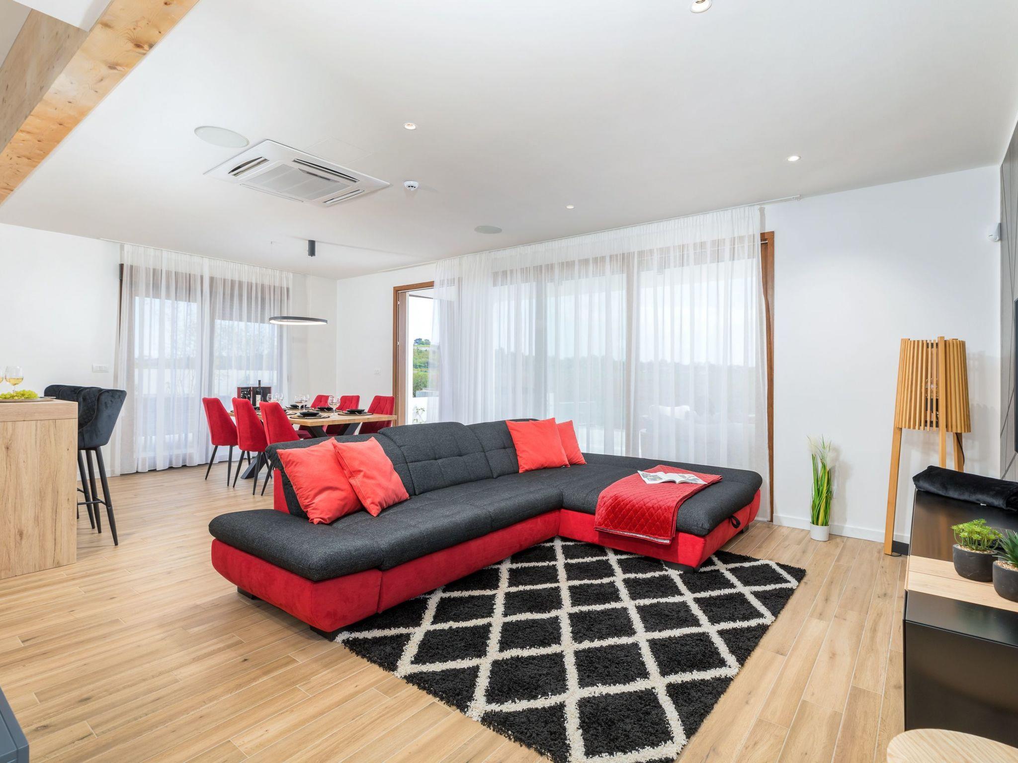 The spacious living room with a modern, fully equipped kitchen, an elegant dining table and a bar invites you to pleasant gatherings and gastronomic delights. Smart TV, a discreet sound system, underfloor heating and air conditioning create the perfect balance of comfort and entertainment throughout the year.