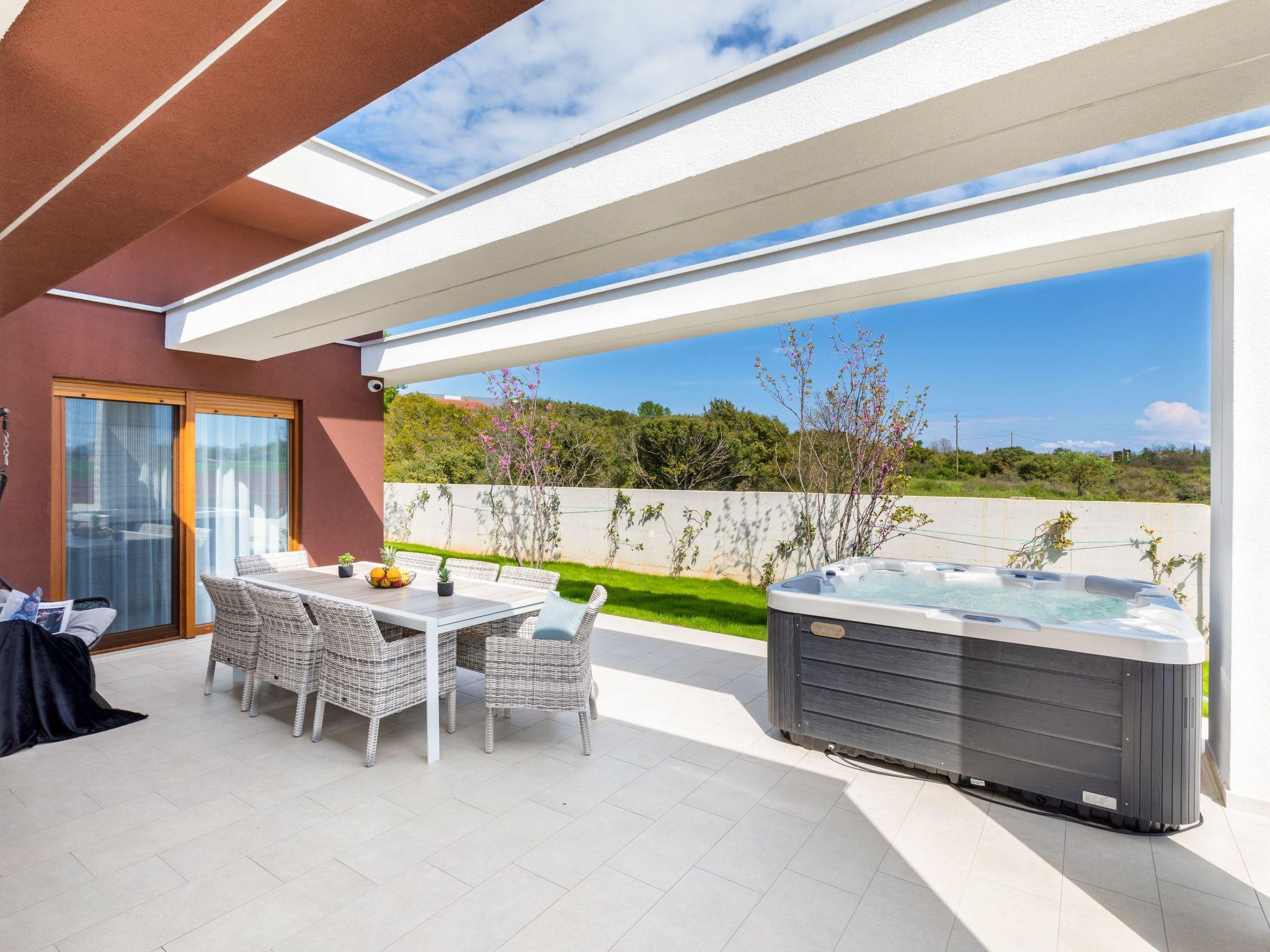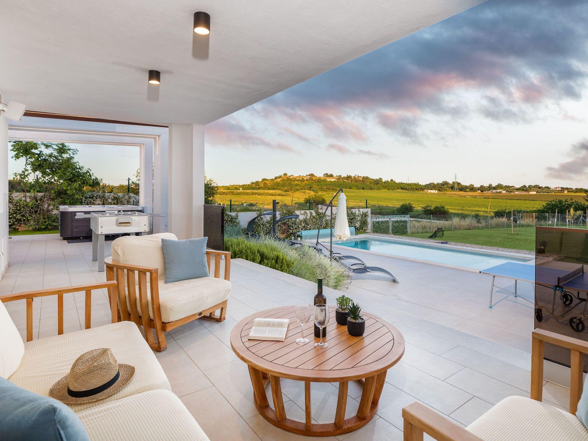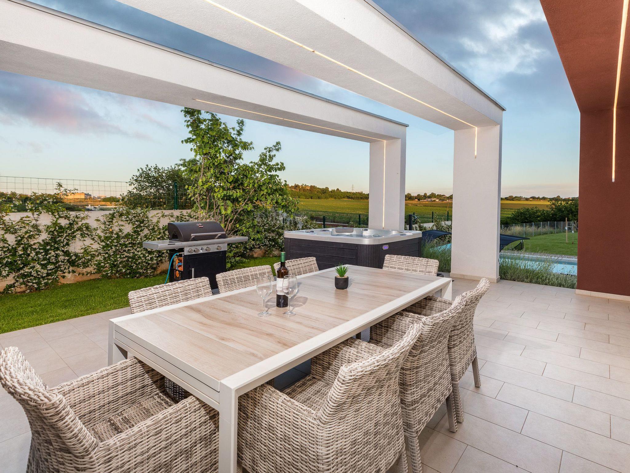 From the living room you exit to the covered terrace – the ideal place for morning coffee, relaxation in a warm jacuzzi overlooking rustling olive trees, or dinner under the stars with the sounds of nature and the smell of barbecue.