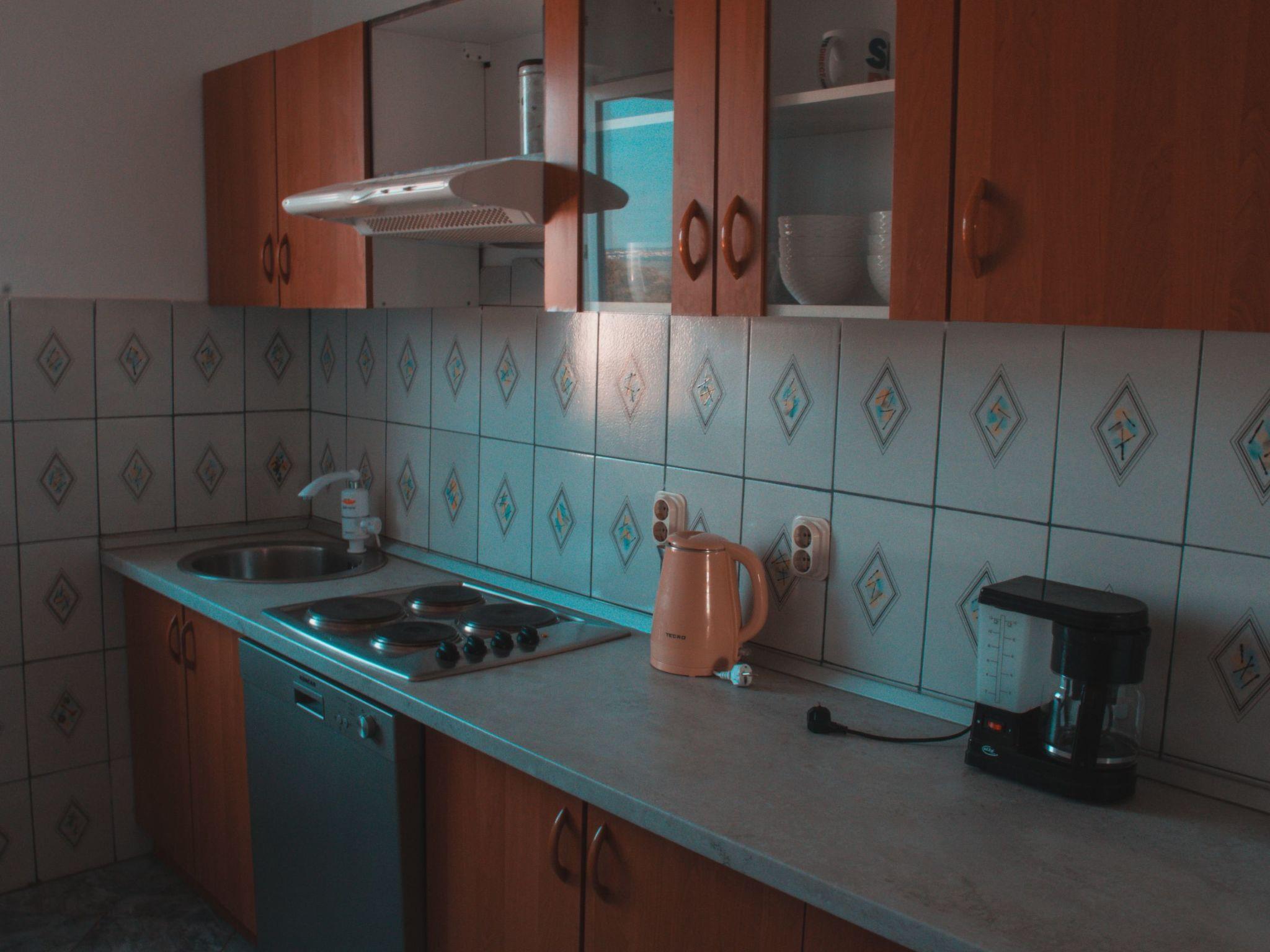 - kitchen ( electric stove with 4 cooking rings, refrigerator with freezing section, kettle, coffee machine (filter), toaster, hood and utensils for cooking and eating, microwave, dishwasher )